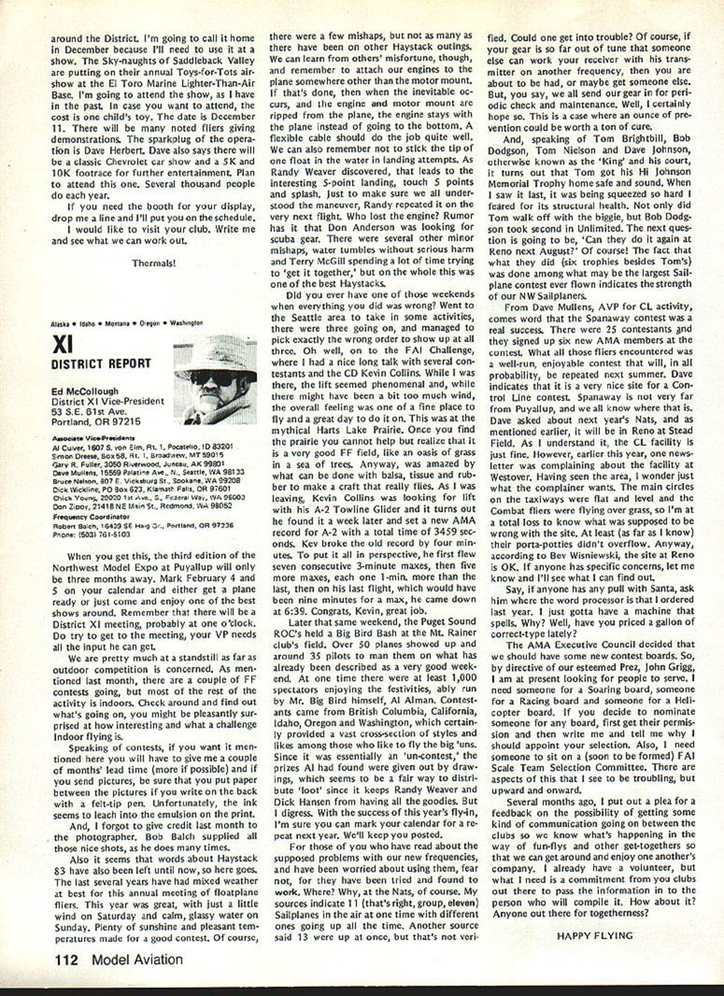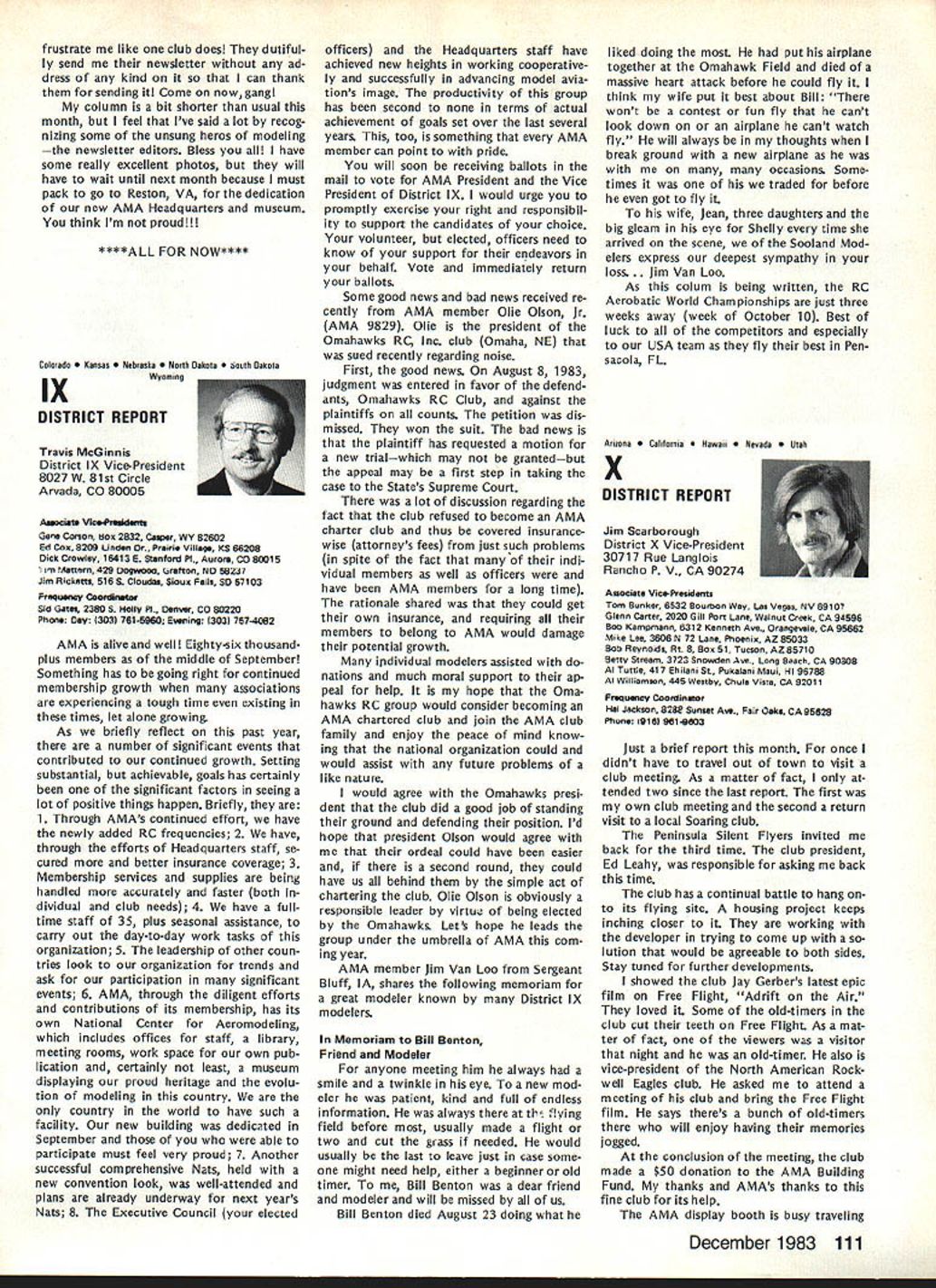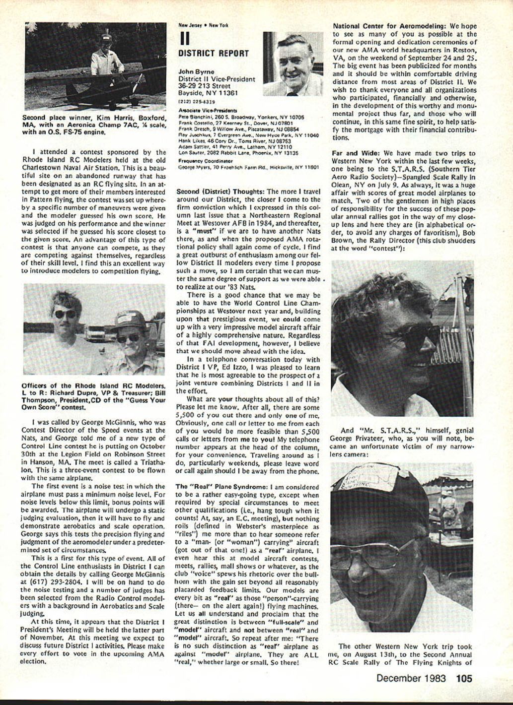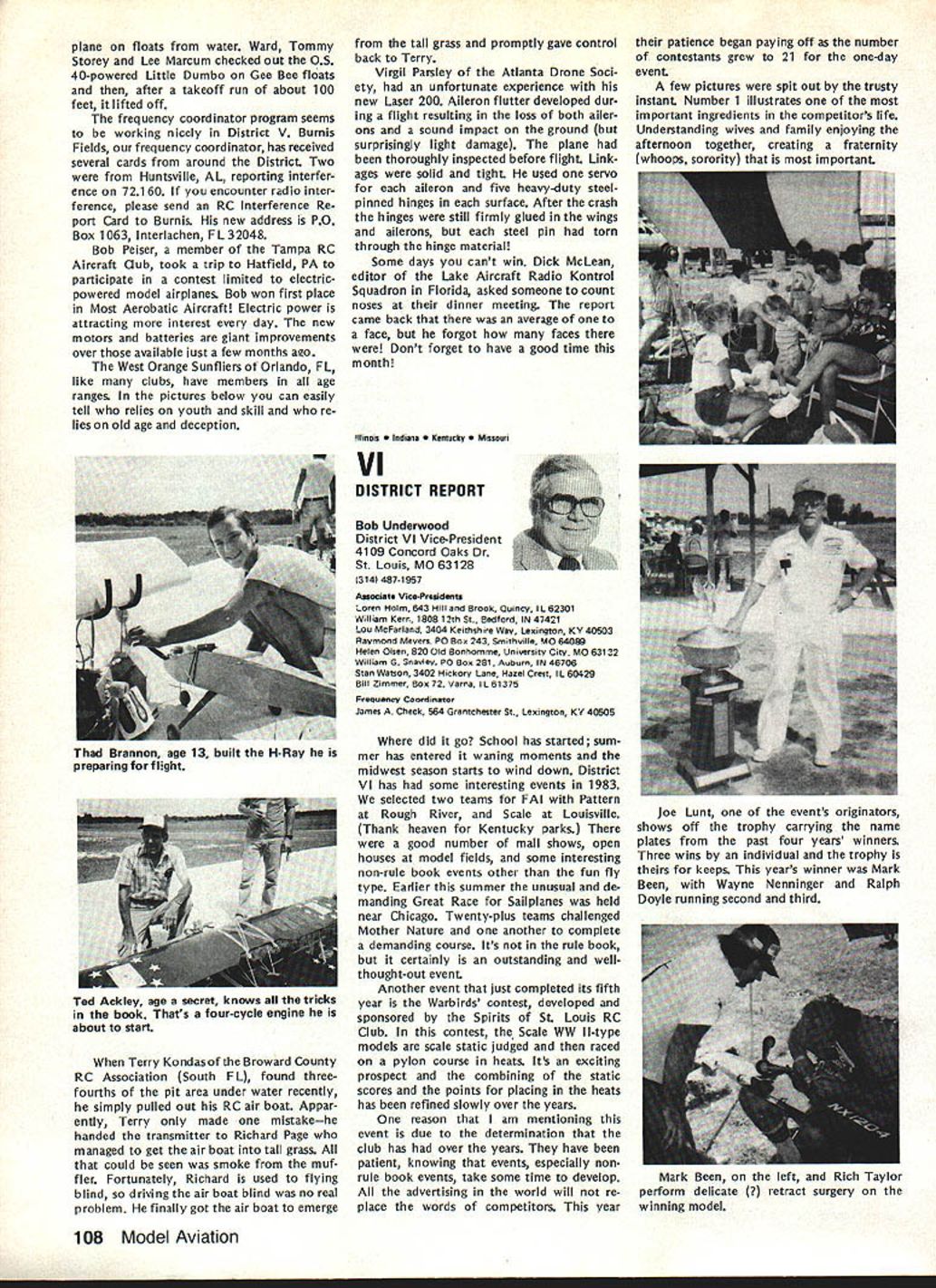 L Public Relations An As important years Academys history comes close good time look some events 1983 some plans 1984 Perhaps biggest public relations mem ory 1983 opening National Center Aeromodeling After almost 50 years life growth Academy means member have its own office building museum library visi tors center giant step forward mile stone remarkable significance can tell no fear contradiction member non-member has visited new building past several months has delighted some cases almost overwhelmed design neatness building collection models memorabilia person company made contribution project owed debt gratitude modelers have yet send contribution tax deduc tible help dump mortgage urge write check today mail 1983 Nats great success ways Perhaps lasting effect having modelers families converge Chicopee MA Westover AFB will overall publicity model aviation model aviators received sport should better known New England now perhaps ever known before Thanks efforts generated interest sport can count good public image remaining minds New Englanders long time Flying site success stories have com ing year Yes know some clubs have lost sites due noise complaints clubs have granted per mission fly public private property November issue Model Aviation story Tn-Cities RC Club Washington State got new field Conservation District property type story being repeated areas such Raleigh NC Aeromasters have just gained flying field former landfill site AMA has lot experience lot materials can assist club starts go after flying fieldjust Update contact us give us chance work services membership buys you should take advantage needed encourage building Scale models AMA introduced new national award year call National Scale Award major trade show aircraft judged Best Scale independent local judges will winner nice trophy being awarded owner plane region al winners will eligible enter Nation al Scale Award Contest National Scale Trophy will presented overall win ner Judging will done non-AMA per sonnel like have good positive public image club going after community sup port almost vital good working re lationship developed prior re quest favored treatment clubs have conducted mall shows major shopping centers result have gained new members received assistance either public private sources flying field problem developed mind pro posed Model Av/at/onSeptember 1983 National Mall Show Day developed 1984 response chartered clubs around country has very encour aging Several clubs already have plans mall show early part 1984 dates al ready fixed calendar no prob lem suggested program clubs can go ahead thing though dates may coincidethat lux ury can have volunteer arrangement Other clubs have very strong endorsement idea have sent clubs package information suggested press release can used Continued page 703 December 1983 99 AMA HQ Executive Director including reports AMA President Executive VP Vice-Presidents ACADEMY OF MODEL AERONAUTICS 1810 Samuel Morse Dr Reston VA 22090 Club Patches Emblems Needed Above shown previously donated dis play AMA Museum still amount fraction over 1700 AMA char tered clubs dont see yours photo dont know has received AMA send club can properly represented AMA HQ SERVICES STAFF S S 0 Executive Director John Worth S Assistant Executive Director Vince Mankowski S Executive Secretary Joyce Hager S Comptroller Gisele Jackson 0 Competition Services Director Micheline Madison 0 Special Services Director Carl Maroney S Membership Director Carol Merfeld 0 Public Relations Director Geoff Styles 0 Special Events Manager Douglas Pratt 0 Publications Director Carl R Wheeley 0 Administrative Coordinator Bob Voislavek 5O General Counsel Jeremiah Courtney S Asst General Counsel Jack Smith lam JOHNNYCLEMENS AMA-18 Dallas TX am presently serv ing AMA District VIII Vice President am asking vote next AMA President would like know am writing message myself thoughts come deep within qualifications deep well-doc umented AMA history president AMA eight years 1971 through 1978 greatest growth period AMA has ever enjoyed 46 years being AMA member have held AMA office expect SecretaryTreasurer Representing United States rose 1st Vice President FAI-CIAM world aeromodeling Most today cessful AMA programs originally planned president 1971 brought new era AMA Council named New Momentum again time same kind enthusiastic leadership Mo mentum need look forward toward new goals membership 100000 well within reach Weve gotta go after could own control own permanent flying site facility supporting championship events world invitationals yet beginning tap healthy field corpor ate support involvement would pro vide much needed funds positive public relations leadership model aviation can integrate nations educational systems offer todays young people excit ing education expanded goals would legacy better future country maximum membership effective ness need expand encourage fun social side AMA modeling Compe tition flying already well-established generates its own momentum have constant need upgrade flying safety rules better serve us Special Inter est Groups should encouraged guiding us AMA could provide program project guidance chartered clubs schools communities should constantly im proving dignity recognition re minding world aeromodeling truth seedbed aviation space development biggest aims should toward careful conservative spending dues money gain maximum fun value dues avoid threat dues increases 60 years active modeling have given experience phases modeling sportFree Flight Control Line Radio Control years officership have given administrative skills wisdom am older kids AMA years Continued page 104 JOHN C GRIGG Lockport NY incumbent candidate re-election office President AMA Johns past rec ord verifies strong supporter average modeler well highly competitve member credited bringing stability governing body sponsoring three-year term elected officers ap pointed Chairman very successful RC Frequency Committee crea