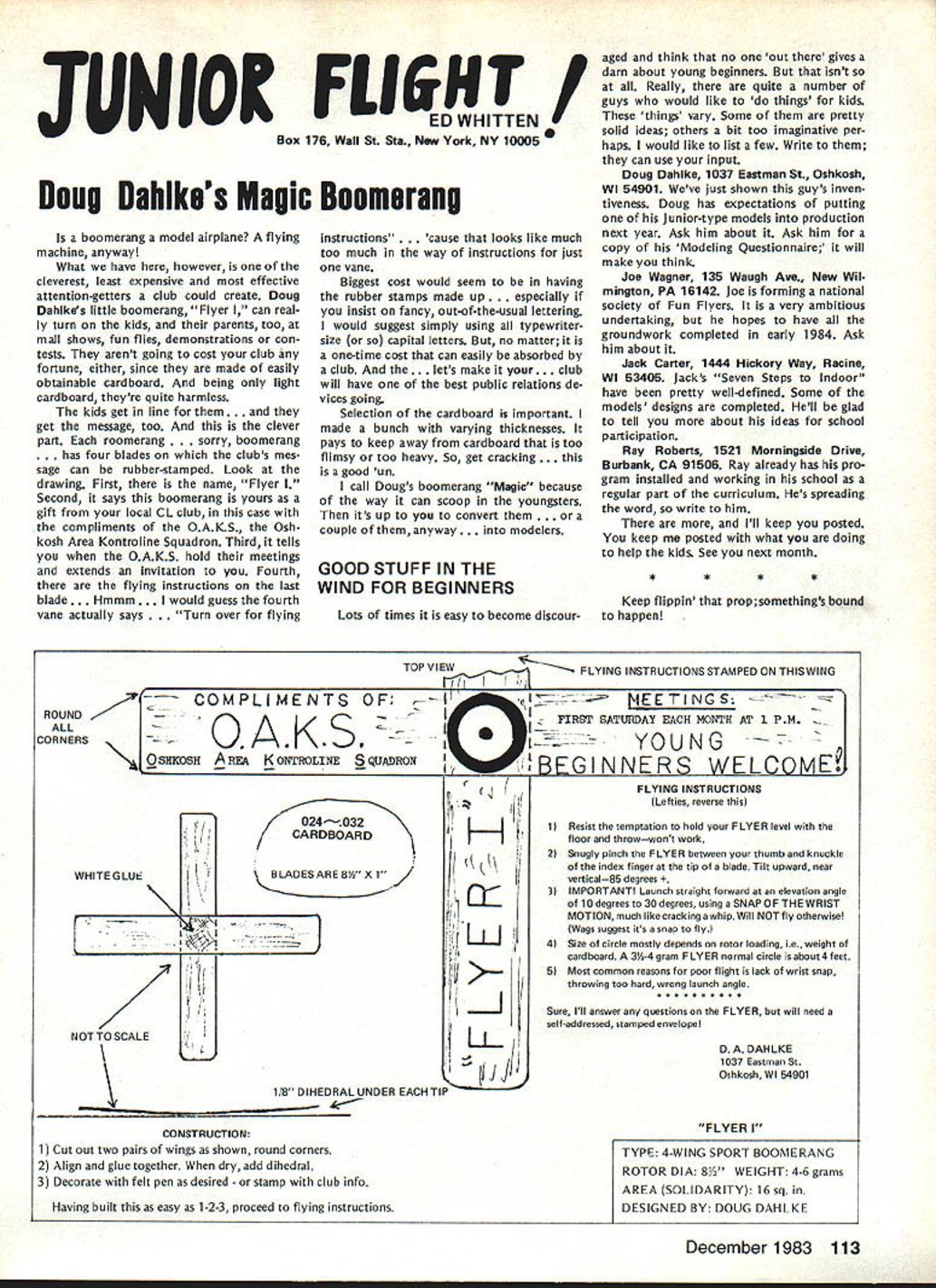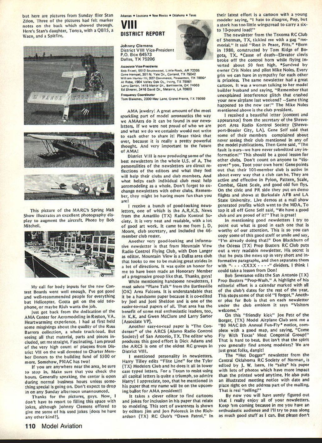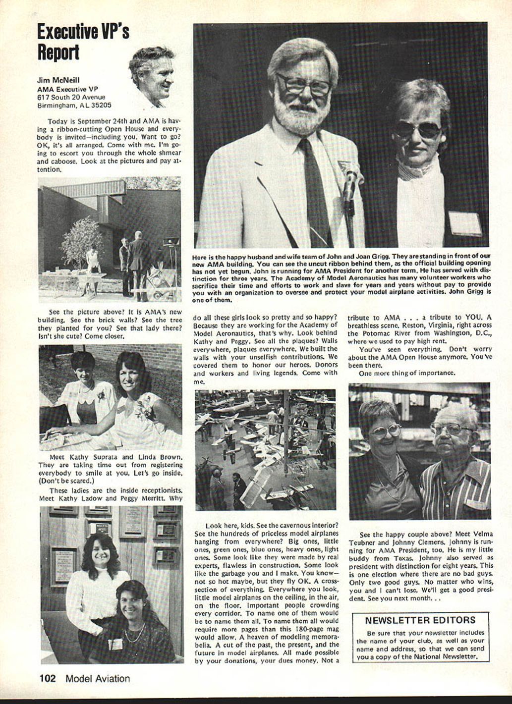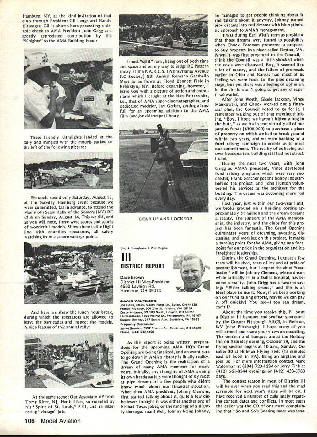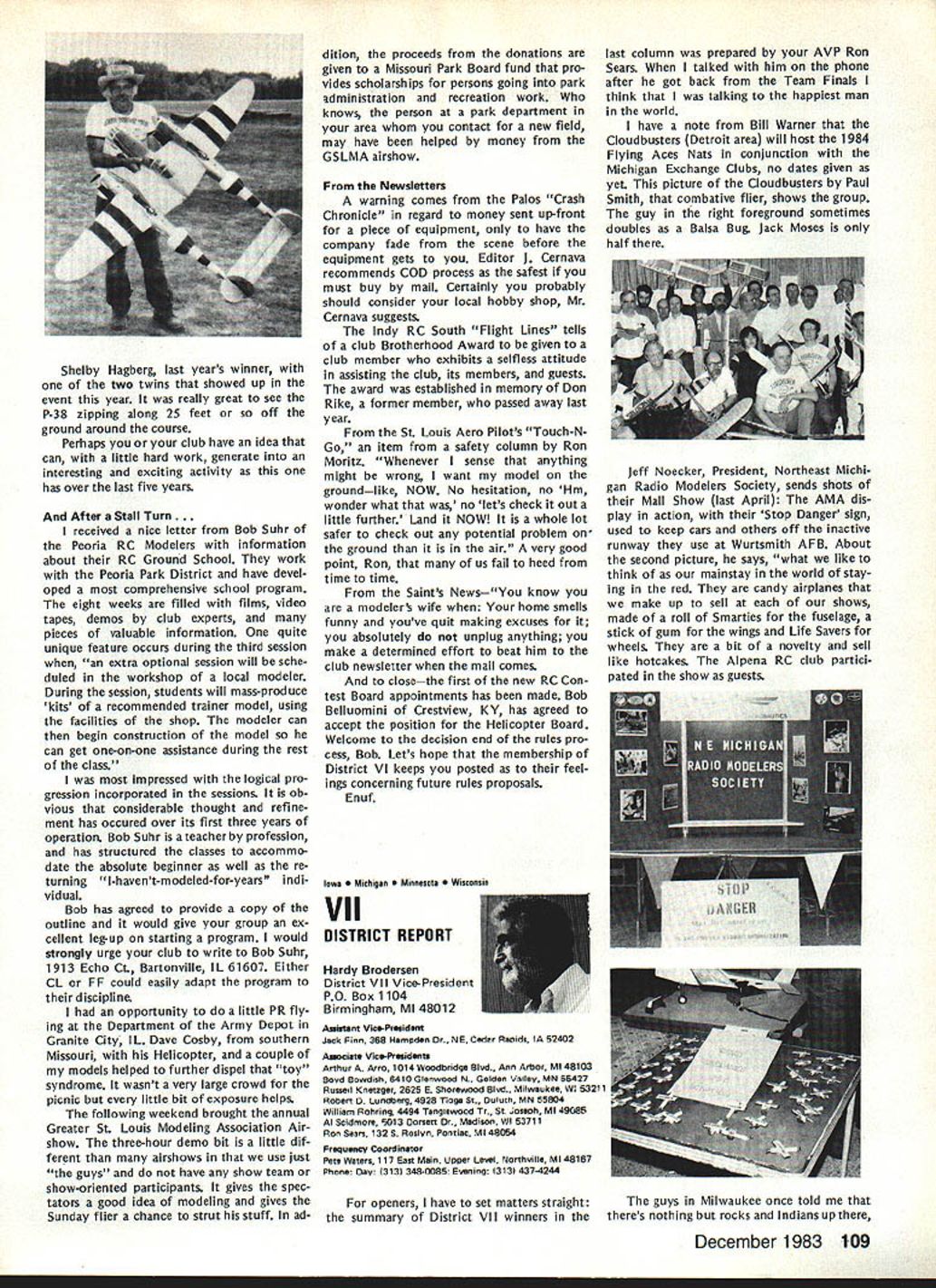 L Public Relations An As important years Academys history comes close good time look some events 1983 some plans 1984 Perhaps biggest public relations mem ory 1983 opening National Center Aeromodeling After almost 50 years life growth Academy means member have its own office building museum library visi tors center giant step forward mile stone remarkable significance can tell no fear contradiction member non-member has visited new building past several months has delighted some cases almost overwhelmed design neatness building collection models memorabilia person company made contribution project owed debt gratitude modelers have yet send contribution tax deduc tible help dump mortgage urge write check today mail 1983 Nats great success ways Perhaps lasting effect having modelers families converge Chicopee MA Westover AFB will overall publicity model aviation model aviators received sport should better known New England now perhaps ever known before Thanks efforts generated interest sport can count good public image remaining minds New Englanders long time Flying site success stories have com ing year Yes know some clubs have lost sites due noise complaints clubs have granted per mission fly public private property November issue Model Aviation story Tn-Cities RC Club Washington State got new field Conservation District property type story being repeated areas such Raleigh NC Aeromasters have just gained flying field former landfill site AMA has lot experience lot materials can assist club starts go after flying fieldjust Update contact us give us chance work services membership buys you should take advantage needed encourage building Scale models AMA introduced new national award year call National Scale Award major trade show aircraft judged Best Scale independent local judges will winner nice trophy being awarded owner plane region al winners will eligible enter Nation al Scale Award Contest National Scale Trophy will presented overall win ner Judging will done non-AMA per sonnel like have good positive public image club going after community sup port almost vital good working re lationship developed prior re quest favored treatment clubs have conducted mall shows major shopping centers result have gained new members received assistance either public private sources flying field problem developed mind pro posed Model Av/at/onSeptember 1983 National Mall Show Day developed 1984 response chartered clubs around country has very encour aging Several clubs already have plans mall show early part 1984 dates al ready fixed calendar no prob lem suggested program clubs can go ahead thing though dates may coincidethat lux ury can have volunteer arrangement Other clubs have very strong endorsement idea have sent clubs package information suggested press release can used Continued page 703 December 1983 99 AMA HQ Executive Director including reports AMA President Executive VP Vice-Presidents ACADEMY OF MODEL AERONAUTICS 1810 Samuel Morse Dr Reston VA 22090 Club Patches Emblems Needed Above shown previously donated dis play AMA Museum still amount fraction over 1700 AMA char tered clubs dont see yours photo dont know has received AMA send club can properly represented AMA HQ SERVICES STAFF S S 0 Executive Director John Worth S Assistant Executive Director Vince Mankowski S Executive Secretary Joyce Hager S Comptroller Gisele Jackson 0 Competition Services Director Micheline Madison 0 Special Services Director Carl Maroney S Membership Director Carol Merfeld 0 Public Relations Director Geoff Styles 0 Special Events Manager Douglas Pratt 0 Publications Director Carl R Wheeley 0 Administrative Coordinator Bob Voislavek 5O General Counsel Jeremiah Courtney S Asst General Counsel Jack Smith lam JOHNNYCLEMENS AMA-18 Dallas TX am presently serv ing AMA District VIII Vice President am asking vote next AMA President would like know am writing message myself thoughts come deep within qualifications deep well-doc umented AMA history president AMA eight years 1971 through 1978 greatest growth period AMA has ever enjoyed 46 years being AMA member have held AMA office expect SecretaryTreasurer Representing United States rose 1st Vice President FAI-CIAM world aeromodeling Most today cessful AMA programs originally planned president 1971 brought new era AMA Council named New Momentum again time same kind enthusiastic leadership Mo mentum need look forward toward new goals membership 100000 well within reach Weve gotta go after could own control own permanent flying site facility supporting championship events world invitationals yet beginning tap healthy field corpor ate support involvement would pro vide much needed funds positive public relations leadership model aviation can integrate nations educational systems offer todays young people excit ing education expanded goals would legacy better future country maximum membership effective ness need expand encourage fun social side AMA modeling Compe tition flying already well-established generates its own momentum have constant need upgrade flying safety rules better serve us Special Inter est Groups should encouraged guiding us AMA could provide program project guidance chartered clubs schools communities should constantly im proving dignity recognition re minding world aeromodeling truth seedbed aviation space development biggest aims should toward careful conservative spending dues money gain maximum fun value dues avoid threat dues increases 60 years active modeling have given experience phases modeling sportFree Flight Control Line Radio Control years officership have given administrative skills wisdom am older kids AMA years Continued page 104 JOHN C GRIGG Lockport NY incumbent candidate re-election office President AMA Johns past rec ord verifies strong supporter average modeler well highly competitve member credited bringing stability governing body sponsoring three-year term elected officers ap pointed Chairman very successful RC Frequency Committee crea