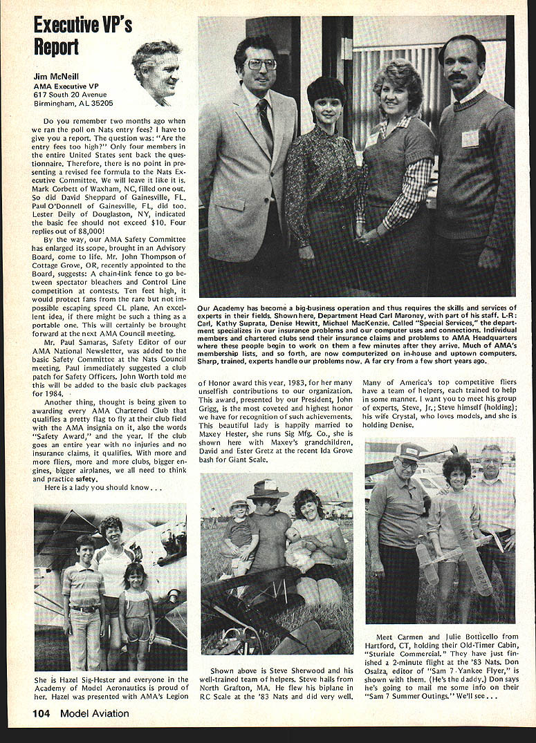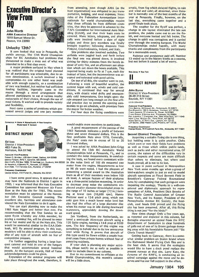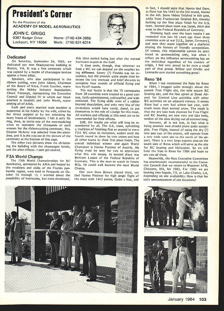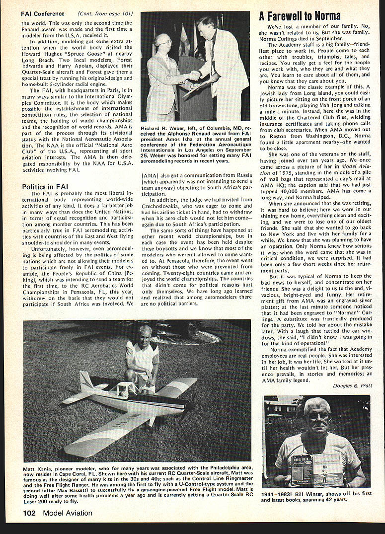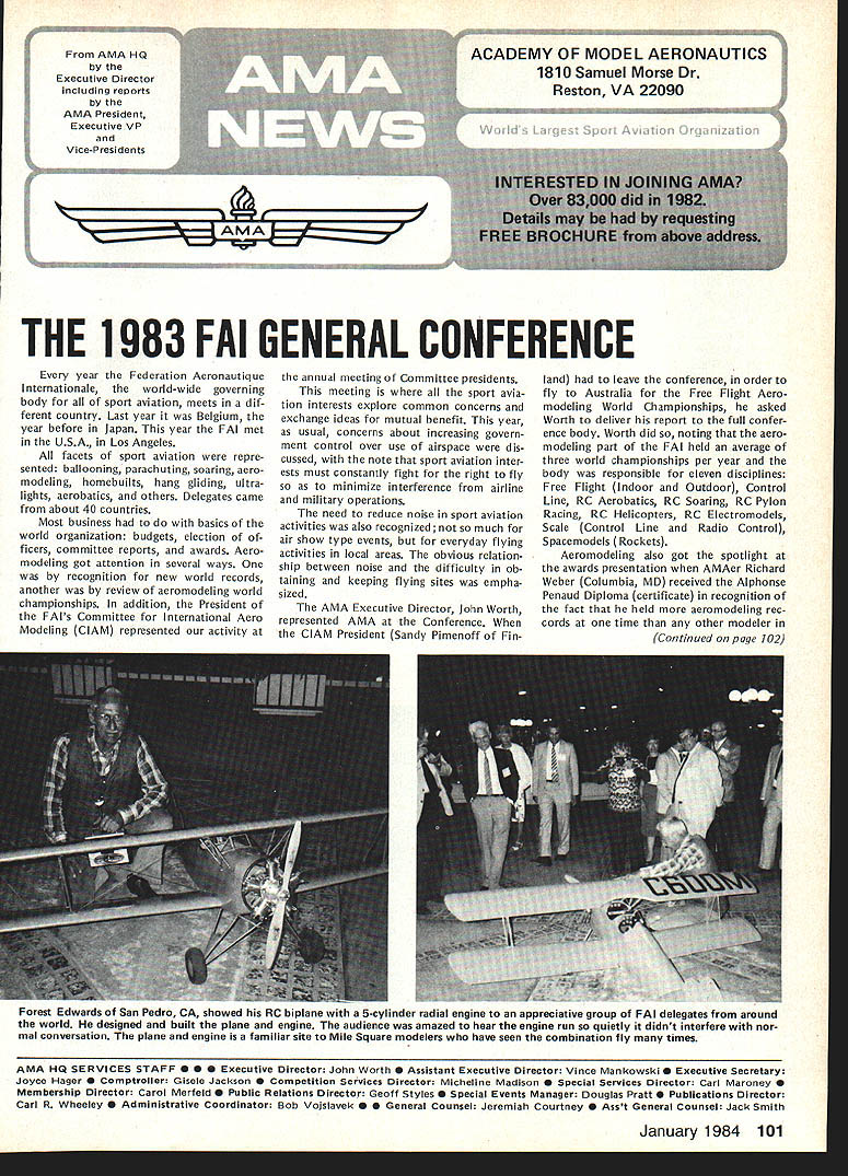 Every year Federation Aeronautique Internationale world-wide governing body sport aviation meets dif ferent country Last year Belgium year before Japan year FAI met USA Los Angeles facets sport aviation repre sented ballooning parachuting soaring aero modeling homebuilts hang gliding ultralights aerobatics others Delegates came about 40 countries Most business basics world organization budgets election of ficers committee reports awards Aero modeling got attention several ways recognition new world records another review aeromodeling world championships addition President FAIs Committee International Aero Modeling ClAM represented activity annual meeting Committee presidents meeting sport avia tion interests explore common concerns exchange ideas mutual benefit year usual concerns about increasing govern ment control over use airspace dis cussed note sport aviation inter ests must constantly fight right fly minimize interference airline military operations need reduce noise sport aviation activities also recognized much air show type events everyday flying activities local areas obvious relation ship between noise difficulty ob taining keeping flying sites empha sized AMA Executive Director John Worth represented AMA Conference ClAM President Sandy Pimenoff Finland leave conference order fly Australia Free Flight Aero modeling World Championships asked Worth deliver report full confer ence body Worth did noting aero modeling part FAI held average three world championships per year body responsible eleven disciplines Free Flight Indoor Outdoor Control Line RC Aerobatics RC Soaring RC Pylon Racing RC Helicopters RC Electromodels Scale Control Line Radio Control Spacemodels Rockets Aeromodeling also got spotlight awards presentation AMAer Richard Weber Columbia MD received Alphonse Penaud Diploma certificate recognition fact held aeromodeling rec cords time other modeler Continued page 102 Forest Edwards San Pedro CA showed RC biplane 5-cylinder radial engine appreciative group FAI delegates around world designed built plane engine audience amazed hear engine run quietly didnt interfere nor mal conversation plane engine familiar site Mile Square modelers have seen combination fly times January 1984 101 AMA HQ Executive Director including reports bY AMA President Executive VP Vice-Presidents ACADEMY OF MODEL AERONAUTICS 1810 Samuel Morse Dr ___ Reston VA 22090 THE 1983 FAI GENERAL CONFERENCE AMA HQ SERVICES STAFF S S S Executive Director John Worth S Assistant Executive Director Vince Mankowski S Executive Secretary Joyce Hager S Comptroller Gisele Jackson S Competition Services Director Micheline Madison S Special Services Director Carl Maroney S Membership Director Carol Merfeld S Public Relations Director Geoff Styles S Special Events Manager Douglas Pratt S Publications Director Carl R Wheeley S Administrative Coordinator Bob Voislavek S S General Counsel Jeremiah Courtney S Asst General Counsel Jack Smith FAB ConferenceCant page 101 world second time Penaud award made first time modeler USA received addition modeling got some extra tention world body visited Howard Hughes Spruce Goose nearby Long Beach Two local modelers Forest Edwards Harry Apoian displayed Quarter-Scale aircraft Forest gave special treat running original-design home-built 5-cylinder radial engine FA headquarters Paris ways similar International Olym pics Committee body makes possible establishment international competition rules selection national teams holding world championships recognition world records AMA part process through its divisional status National Aeronautic Associa tion NAA official National Aero Club USA representing sport aviation interests AMA dele gated responsibility NAA USA activities involving FAI Politics FAI FAI probably liberal ternational body representing world-wide activities kind does far better job ways does United Nations terms equal recognition participa tion among member countries has particularly true FAI aeromodeling activi ties countries East West flying shoulder-to-shoulder events Unfortunately however aeromodel ing being affected politics some nations allowing modelers participate freely FAI events ex ample Peoples Republic China Pe king intending send team first time RC Aerobatics World Championships Pensacola FL year withdrew basis would participate South Africa involved Richard R Weber left Columbia MD re ceived Alphonse Renaud award FAI president Amos lshai annual general conference Federation Aeronautique Internationale Los Angeles September 25 Weber honored setting FAI aeromodeling records recent years AMA also got communication Russia apparently intending send team anyway objecting South Africas par ti ci patio n addition judge invited Czechoslovakia eager come airline ticket hand withdraw aero club would let him come again due South Africas participation same sorts things have happened other recent world championships case event has held despite boycotts know modelers werent allowed come want ed Pensacola therefore event went prevented coming Twenty-eight countries came en joyed world championships countries didnt come political reasons hurt themselves have long ago learned realized among aeromodelers no political barriers Matt Kania pioneer modeler years associated Philadelphia area now resides Cape Coral FL Shown current RC Quarter-Scale aircraft Matt famous designer kits 30s 40s such Control Line Ringmaster Free Flight Ranger among first fly U-Control-type system second after Max Bassett successfully fly gas-engine-powered Free Flight model Matt doing well after some health problems year ago currently getting Quarter-Scale RC Laser 200 ready fly Farewell Norma Weve lost member family No wasnt related us family Norma Curlings died September Academy staff big familyfriend liest place work People come other troubles triumphs tales recipes really get feel people work what learn care about know care about Norma classic example Jewish lady Long Island could easi ly picture si