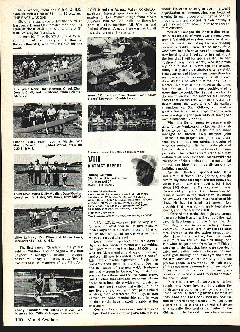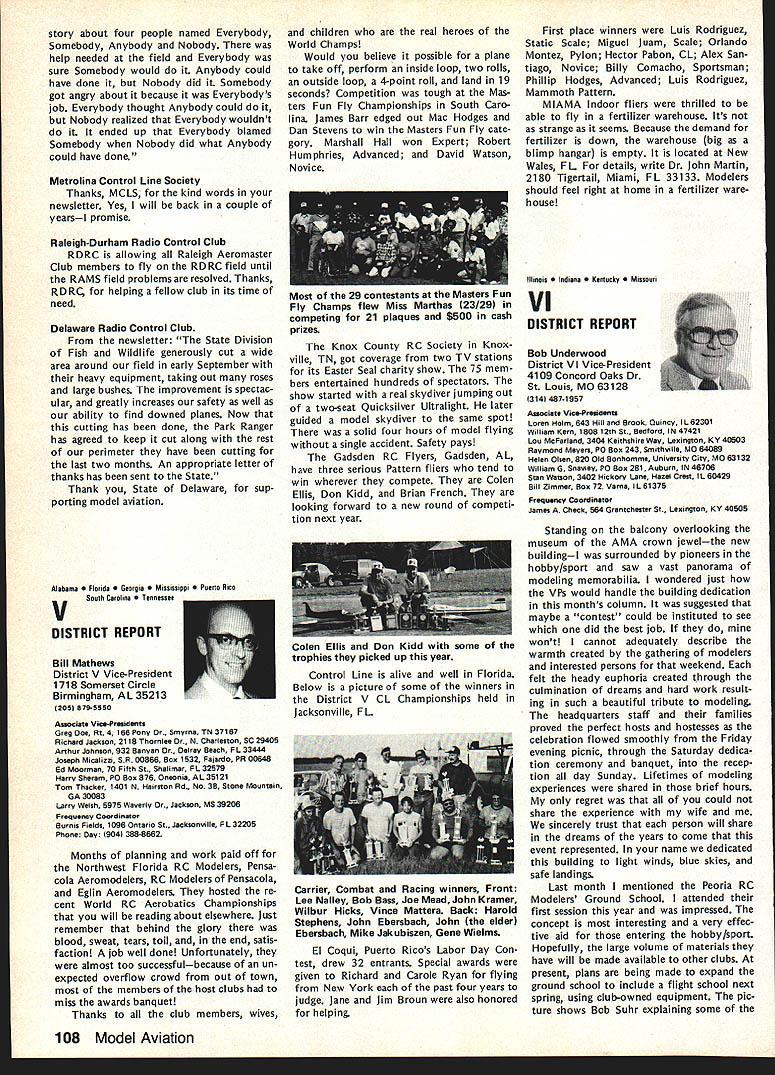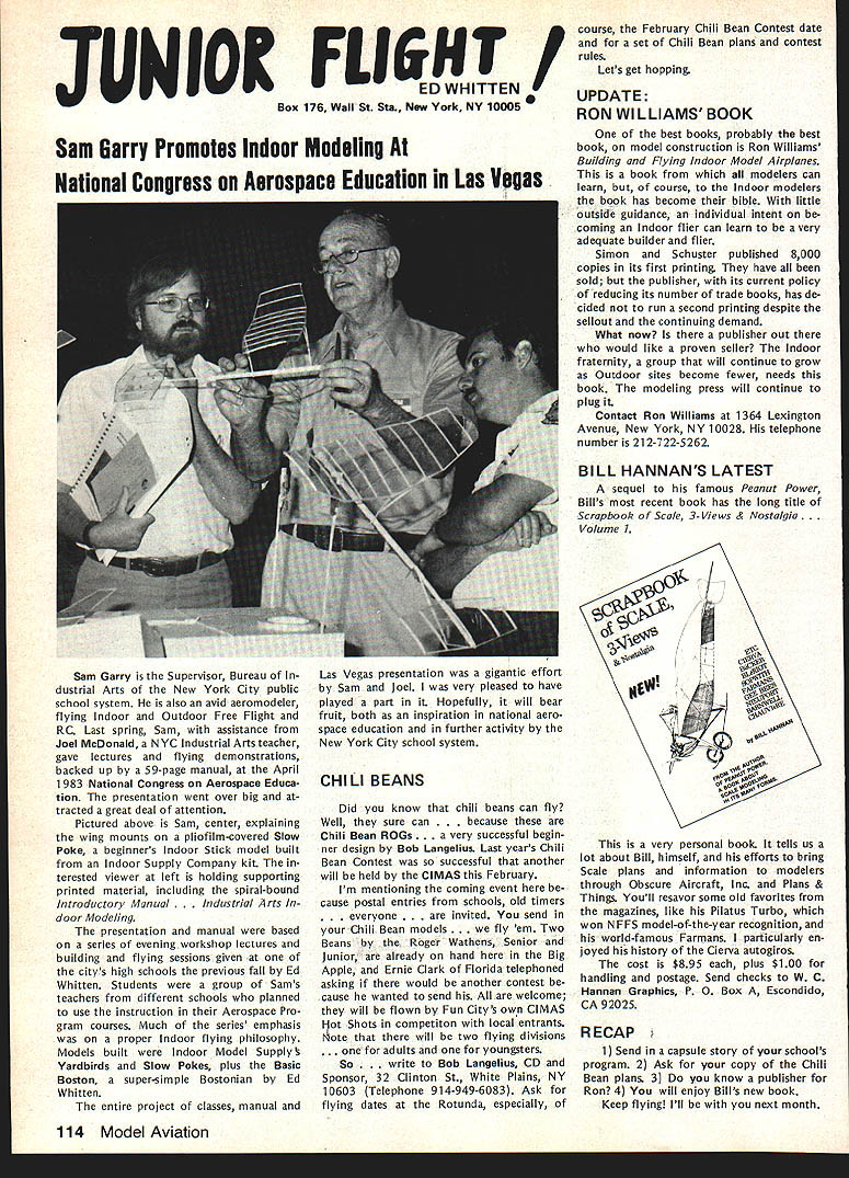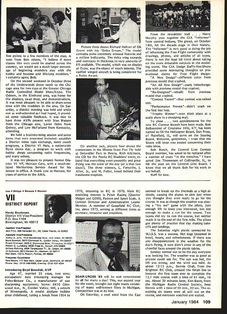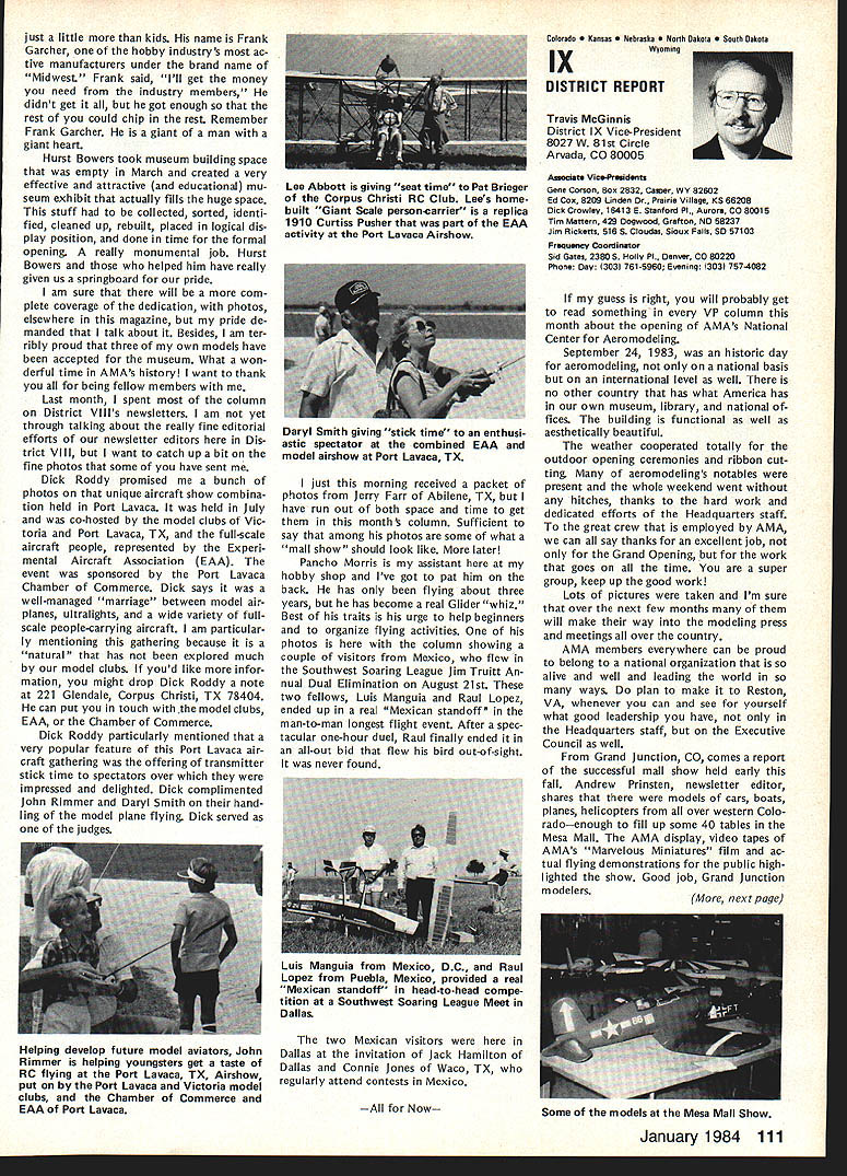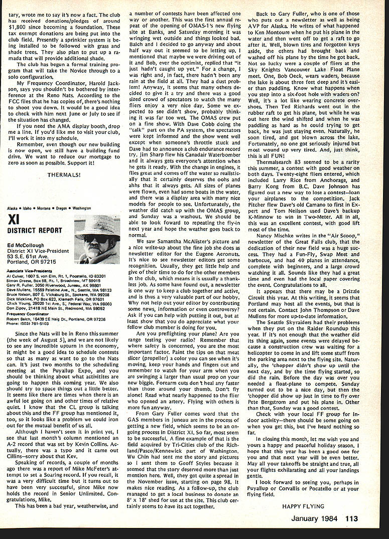 Every year Federation Aeronautique Internationale world-wide governing body sport aviation meets dif ferent country Last year Belgium year before Japan year FAI met USA Los Angeles facets sport aviation repre sented ballooning parachuting soaring aero modeling homebuilts hang gliding ultralights aerobatics others Delegates came about 40 countries Most business basics world organization budgets election of ficers committee reports awards Aero modeling got attention several ways recognition new world records another review aeromodeling world championships addition President FAIs Committee International Aero Modeling ClAM represented activity annual meeting Committee presidents meeting sport avia tion interests explore common concerns exchange ideas mutual benefit year usual concerns about increasing govern ment control over use airspace dis cussed note sport aviation inter ests must constantly fight right fly minimize interference airline military operations need reduce noise sport aviation activities also recognized much air show type events everyday flying activities local areas obvious relation ship between noise difficulty ob taining keeping flying sites empha sized AMA Executive Director John Worth represented AMA Conference ClAM President Sandy Pimenoff Finland leave conference order fly Australia Free Flight Aero modeling World Championships asked Worth deliver report full confer ence body Worth did noting aero modeling part FAI held average three world championships per year body responsible eleven disciplines Free Flight Indoor Outdoor Control Line RC Aerobatics RC Soaring RC Pylon Racing RC Helicopters RC Electromodels Scale Control Line Radio Control Spacemodels Rockets Aeromodeling also got spotlight awards presentation AMAer Richard Weber Columbia MD received Alphonse Penaud Diploma certificate recognition fact held aeromodeling rec cords time other modeler Continued page 102 Forest Edwards San Pedro CA showed RC biplane 5-cylinder radial engine appreciative group FAI delegates around world designed built plane engine audience amazed hear engine run quietly didnt interfere nor mal conversation plane engine familiar site Mile Square modelers have seen combination fly times January 1984 101 AMA HQ Executive Director including reports bY AMA President Executive VP Vice-Presidents ACADEMY OF MODEL AERONAUTICS 1810 Samuel Morse Dr ___ Reston VA 22090 THE 1983 FAI GENERAL CONFERENCE AMA HQ SERVICES STAFF S S S Executive Director John Worth S Assistant Executive Director Vince Mankowski S Executive Secretary Joyce Hager S Comptroller Gisele Jackson S Competition Services Director Micheline Madison S Special Services Director Carl Maroney S Membership Director Carol Merfeld S Public Relations Director Geoff Styles S Special Events Manager Douglas Pratt S Publications Director Carl R Wheeley S Administrative Coordinator Bob Voislavek S S General Counsel Jeremiah Courtney S Asst General Counsel Jack Smith FAB ConferenceCant page 101 world second time Penaud award made first time modeler USA received addition modeling got some extra tention world body visited Howard Hughes Spruce Goose nearby Long Beach Two local modelers Forest Edwards Harry Apoian displayed Quarter-Scale aircraft Forest gave special treat running original-design home-built 5-cylinder radial engine FA headquarters Paris ways similar International Olym pics Committee body makes possible establishment international competition rules selection national teams holding world championships recognition world records AMA part process through its divisional status National Aeronautic Associa tion NAA official National Aero Club USA representing sport aviation interests AMA dele gated responsibility NAA USA activities involving FAI Politics FAI FAI probably liberal ternational body representing world-wide activities kind does far better job ways does United Nations terms equal recognition participa tion among member countries has particularly true FAI aeromodeling activi ties countries East West flying shoulder-to-shoulder events Unfortunately however aeromodel ing being affected politics some nations allowing modelers participate freely FAI events ex ample Peoples Republic China Pe king intending send team first time RC Aerobatics World Championships Pensacola FL year withdrew basis would participate South Africa involved Richard R Weber left Columbia MD re ceived Alphonse Renaud award FAI president Amos lshai annual general conference Federation Aeronautique Internationale Los Angeles September 25 Weber honored setting FAI aeromodeling records recent years AMA also got communication Russia apparently intending send team anyway objecting South Africas par ti ci patio n addition judge invited Czechoslovakia eager come airline ticket hand withdraw aero club would let him come again due South Africas participation same sorts things have happened other recent world championships case event has held despite boycotts know modelers werent allowed come want ed Pensacola therefore event went prevented coming Twenty-eight countries came en joyed world championships countries didnt come political reasons hurt themselves have long ago learned realized among aeromodelers no political barriers Matt Kania pioneer modeler years associated Philadelphia area now resides Cape Coral FL Shown current RC Quarter-Scale aircraft Matt famous designer kits 30s 40s such Control Line Ringmaster Free Flight Ranger among first fly U-Control-type system second after Max Bassett successfully fly gas-engine-powered Free Flight model Matt doing well after some health problems year ago currently getting Quarter-Scale RC Laser 200 ready fly Farewell Norma Weve lost member family No wasnt related us family Norma Curlings died September Academy staff big familyfriend liest place work People come other troubles triumphs tales recipes really get feel people work what learn care about know care about Norma classic example Jewish lady Long Island could easi ly picture si
