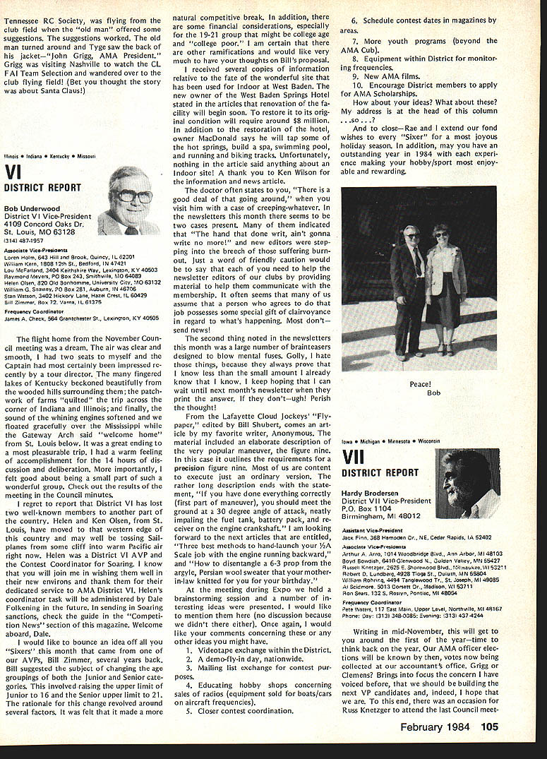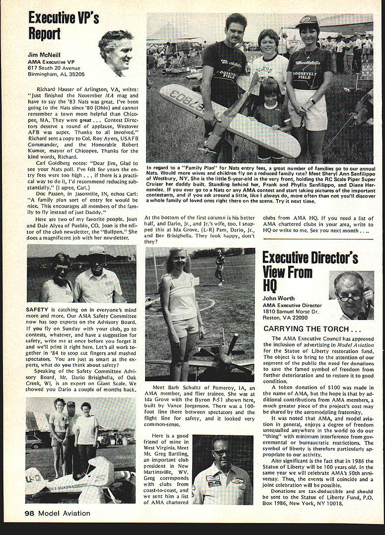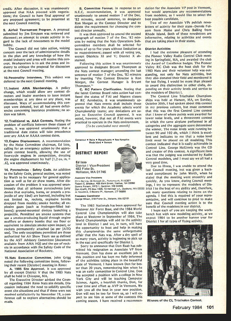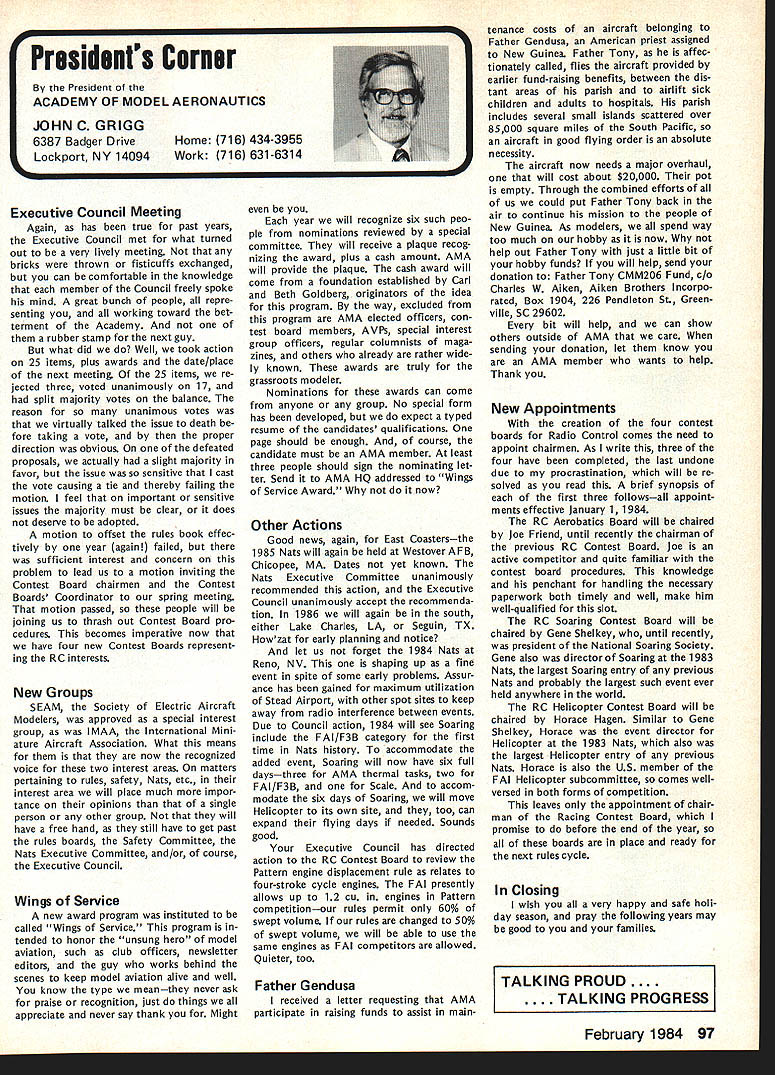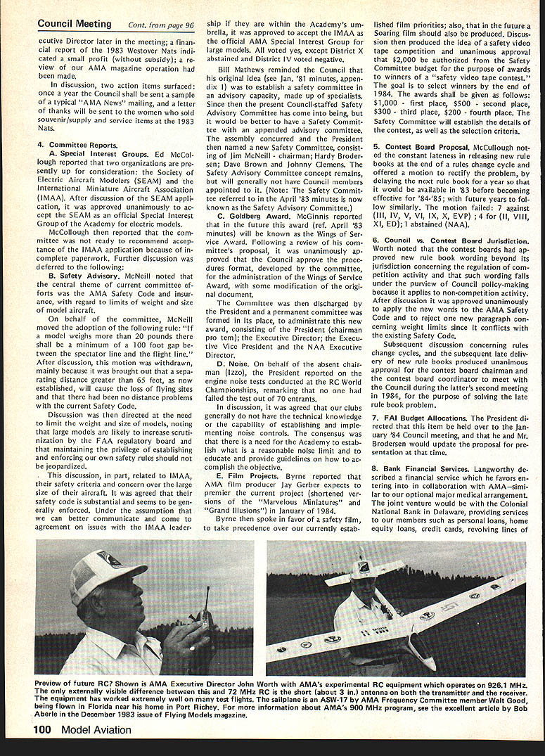 r Synopsis Executive Council Meeting November 5 1983 following summarizes actions AMA Executive Council meeting Reston VA copy official minutes may obtained upon request AMA HQ avail able approximately February 15 minutes will become official after Council review next Council meeting January should noted 13 Council members attendance attendance President John Grigg Lockport NY Executive Vice-Presi dent Jim McNeill Birmingham AL Executive Director John Worth Fairfax VA VicePresident District II John Byrne Bayside NY VP-Ill Dave Brown Hamilton OH VP-IV Chuck Foreman Mechanicsville VA VP-V Bill Mathews Birmingham AL VP-VI Bob Underwood St Louis MO AVP Russell Knetzger proxy District VII VP-VIII John Clemens Dallas TX VP-IX Travis McGinnis Arvada CO VP-X Jim Scarbor ough Rancho Palos Verdes CA VP-XI Ed McCollough Portland OR National Aero nautic Association Executive Director Ev Langworthy Present HQ executive staff Vince Mankowski Assistant Executive Director Gisele Jackson Comptroller Micheline Mad ison Competitions Department Director Guests District IV AVPs Howard Crispin Charles Spear meeting brought order 900 am President chaired meet ng 1 Introductory Remarks President asked moment silence tribute lost lives recent Beirut incident noted agenda item concern ing Presidents visit German club withdrawn advised protests cartoon illustrations depicted insurance advertising appearing Model Aviation noted result offending material has removed subsequent ads noted John Worth Homer Smith will visit Reno November 19 resolve Nats site problems emphasized need submittal agenda items proper forms 2 The minutes August 1 1983 Execu HELP 1986 Statue Liberty will 100 years old same year Academy Model Aeronautics will 50 years old joint celebration will therefore possible respond need restoring national symbol freedom sad fact Statue Liberty desparate need repair restoration Fortunately national campaign underway work time celebration campaign needs everyones support order get job done aeromodelers campaign especi ally noteworthy United States model fliers enjoy degree freedom unequalled anywhere else world can fly minimum shackles government regulation activity basically limited dictates safety neighbors rights peace privacy same time enjoy participation rest world activity send teams World Championships have freedom establish national world records participate equal partners Federation Aeronautique Internationale headquartered Parishomeland nation gave us Statue Liberty Aeromodelers USA among fortunate world will fore appropriate 1986 celebrate both growth AMA rebirth Statue Liberty YOU can help make possible donation AMA member gives dollar total now would over $80000 1986 could over $1 00000 cant afford wait money needed now stop decay begin re pairs day dollar counts Donations should made directly following address Statue Liberty Fund P0 Box 1986 New York NY 10018 budget initial financial statement 1983 world championships held Pensacola FL very close break-even projection costs 1984 CL World Chain pionshi PS held Reno NV Chicopee MA would updated report Ex Con tin ued page 100 96 Model Aviation AMA HQ Executive Director including reports bY AMA President Executive VP Vice-Presidents ACADEMY OF MODEL AERONAUTIC 1810 Samuel Morse Dr sj Reston VA 22090 tive Council meeting approved amend ed previous written Council input 3 Executive VP Report following sub jects noted Jim McNeill Grand Opening preliminary financial report indicat ed total expenses date well within Chains unsnackleo fler teet Statue Liberty holds aloft torch has lit way millions immigrants begin new lives After almost 100 years huge statue now need major preservation work prepare 1986 Centennial Photo Na tional Park Service Statue Liberty National Monument AMA l-IQ SERVICES STAFF 0e 6 Executive Director John Worth S Assistant Executive Director Vince Mankowski S Executive Secretary Joyce Hager S Comptroller Gisele Jackson S Competition Services Director Micheline Madison S Special Services Director Carl Maroney S Membership Director Carol Merfeld 0 Public Relations Director Geoff Styles S Special Events Manager Douglas Pratt S Publications Director Carl R Wheeley 0 Administrative Coordinator Bob Voislavek S S General Counsel Jeremiah Courtney S Asst General Counsel Jack Smith Presidents Corner President ACADEMY OF MODEL AERONAUTICS JOHN C GRIGG 6387 Badger DriveHome 716 434-3955 Lockport NY 14094Work 716 631-6314 Executive Council Meeting Again has true past years Executive Council met what turned out very lively meeting bricks thrown fisticuffs exchanged can comfortable knowledge member Council freely spoke mind great bunch people repre senting working toward bet terment Academy rubber stamp next guy what did Well took action 25 items plus awards date/place next meeting 25 items re jected three voted unanimously 17 split majority votes balance reason unanimous votes virtually talked issue death fore taking vote proper direction obvious defeated proposals actually slight majority favor issue sensitive cast vote causing tie thereby failing motion feel important sensitive issues majority must clear does deserve adopted motion offset rules book effec tively year againl failed sufficient interest concern problem lead us motion inviting Contest Board chairmen Contest Boards Coordinator spring meeting motion passed people will joining us thrash out Contest Board pro cedures becomes imperative now have four new Contest Boards represent ing RC interests New Groups SEAM Society Electric Aircraft Modelers approved special interest group IMAA International Mini ature Aircraft Association What means now recognized voice two interest areas matters pertaining rules safety Nats etc interest area will place much impor tance opinions single person other group will have free hand still have get past rules boards Safety Committee Nats Executive Committee and/or course Executive Council Wings Service new award program instituted called Wings Service prog