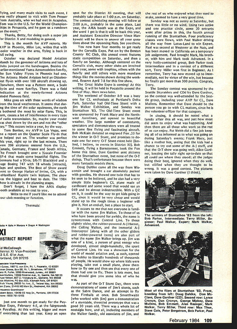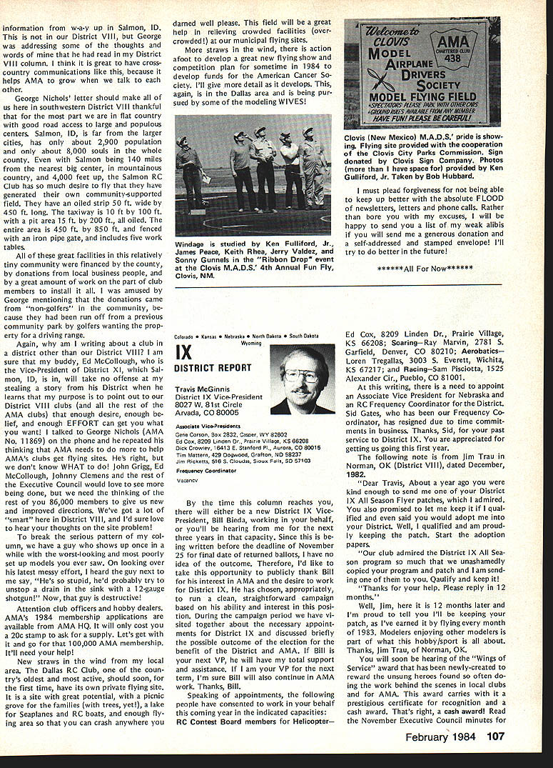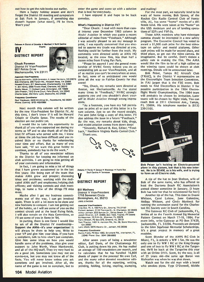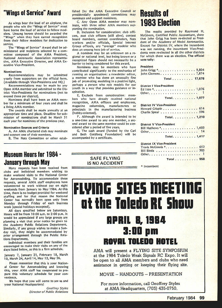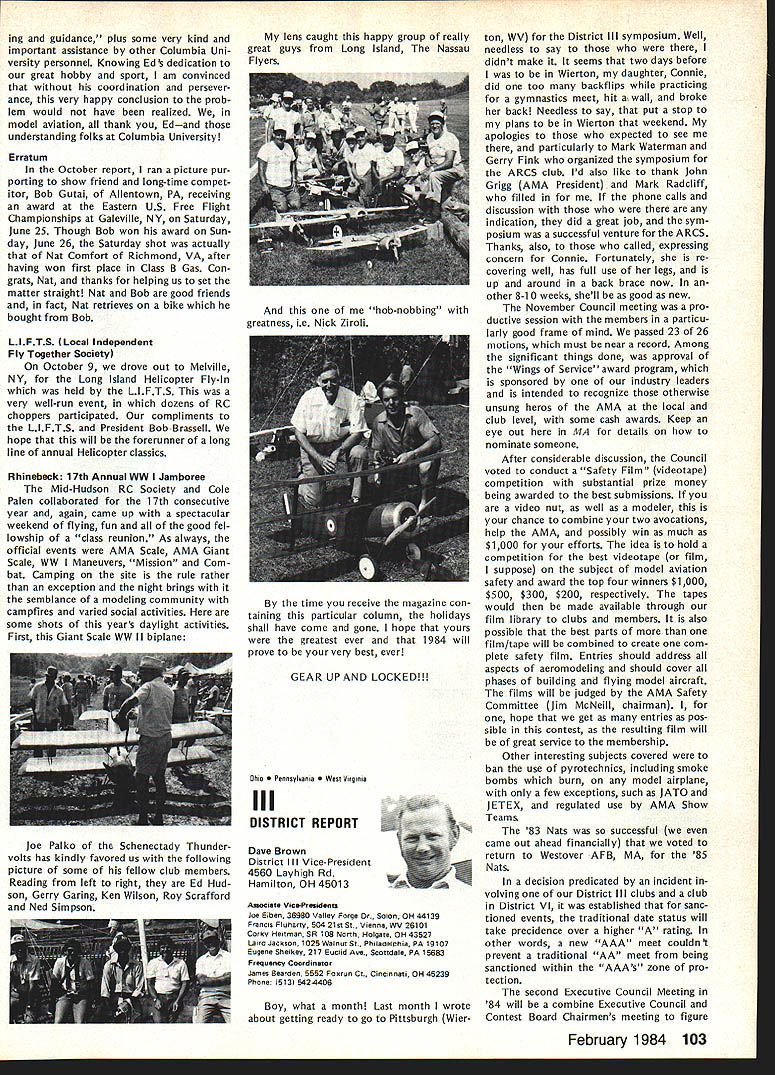 r Synopsis Executive Council Meeting November 5 1983 following summarizes actions AMA Executive Council meeting Reston VA copy official minutes may obtained upon request AMA HQ avail able approximately February 15 minutes will become official after Council review next Council meeting January should noted 13 Council members attendance attendance President John Grigg Lockport NY Executive Vice-Presi dent Jim McNeill Birmingham AL Executive Director John Worth Fairfax VA VicePresident District II John Byrne Bayside NY VP-Ill Dave Brown Hamilton OH VP-IV Chuck Foreman Mechanicsville VA VP-V Bill Mathews Birmingham AL VP-VI Bob Underwood St Louis MO AVP Russell Knetzger proxy District VII VP-VIII John Clemens Dallas TX VP-IX Travis McGinnis Arvada CO VP-X Jim Scarbor ough Rancho Palos Verdes CA VP-XI Ed McCollough Portland OR National Aero nautic Association Executive Director Ev Langworthy Present HQ executive staff Vince Mankowski Assistant Executive Director Gisele Jackson Comptroller Micheline Mad ison Competitions Department Director Guests District IV AVPs Howard Crispin Charles Spear meeting brought order 900 am President chaired meet ng 1 Introductory Remarks President asked moment silence tribute lost lives recent Beirut incident noted agenda item concern ing Presidents visit German club withdrawn advised protests cartoon illustrations depicted insurance advertising appearing Model Aviation noted result offending material has removed subsequent ads noted John Worth Homer Smith will visit Reno November 19 resolve Nats site problems emphasized need submittal agenda items proper forms 2 The minutes August 1 1983 Execu HELP 1986 Statue Liberty will 100 years old same year Academy Model Aeronautics will 50 years old joint celebration will therefore possible respond need restoring national symbol freedom sad fact Statue Liberty desparate need repair restoration Fortunately national campaign underway work time celebration campaign needs everyones support order get job done aeromodelers campaign especi ally noteworthy United States model fliers enjoy degree freedom unequalled anywhere else world can fly minimum shackles government regulation activity basically limited dictates safety neighbors rights peace privacy same time enjoy participation rest world activity send teams World Championships have freedom establish national world records participate equal partners Federation Aeronautique Internationale headquartered Parishomeland nation gave us Statue Liberty Aeromodelers USA among fortunate world will fore appropriate 1986 celebrate both growth AMA rebirth Statue Liberty YOU can help make possible donation AMA member gives dollar total now would over $80000 1986 could over $1 00000 cant afford wait money needed now stop decay begin re pairs day dollar counts Donations should made directly following address Statue Liberty Fund P0 Box 1986 New York NY 10018 budget initial financial statement 1983 world championships held Pensacola FL very close break-even projection costs 1984 CL World Chain pionshi PS held Reno NV Chicopee MA would updated report Ex Con tin ued page 100 96 Model Aviation AMA HQ Executive Director including reports bY AMA President Executive VP Vice-Presidents ACADEMY OF MODEL AERONAUTIC 1810 Samuel Morse Dr sj Reston VA 22090 tive Council meeting approved amend ed previous written Council input 3 Executive VP Report following sub jects noted Jim McNeill Grand Opening preliminary financial report indicat ed total expenses date well within Chains unsnackleo fler teet Statue Liberty holds aloft torch has lit way millions immigrants begin new lives After almost 100 years huge statue now need major preservation work prepare 1986 Centennial Photo Na tional Park Service Statue Liberty National Monument AMA l-IQ SERVICES STAFF 0e 6 Executive Director John Worth S Assistant Executive Director Vince Mankowski S Executive Secretary Joyce Hager S Comptroller Gisele Jackson S Competition Services Director Micheline Madison S Special Services Director Carl Maroney S Membership Director Carol Merfeld 0 Public Relations Director Geoff Styles S Special Events Manager Douglas Pratt S Publications Director Carl R Wheeley 0 Administrative Coordinator Bob Voislavek S S General Counsel Jeremiah Courtney S Asst General Counsel Jack Smith Presidents Corner President ACADEMY OF MODEL AERONAUTICS JOHN C GRIGG 6387 Badger DriveHome 716 434-3955 Lockport NY 14094Work 716 631-6314 Executive Council Meeting Again has true past years Executive Council met what turned out very lively meeting bricks thrown fisticuffs exchanged can comfortable knowledge member Council freely spoke mind great bunch people repre senting working toward bet terment Academy rubber stamp next guy what did Well took action 25 items plus awards date/place next meeting 25 items re jected three voted unanimously 17 split majority votes balance reason unanimous votes virtually talked issue death fore taking vote proper direction obvious defeated proposals actually slight majority favor issue sensitive cast vote causing tie thereby failing motion feel important sensitive issues majority must clear does deserve adopted motion offset rules book effec tively year againl failed sufficient interest concern problem lead us motion inviting Contest Board chairmen Contest Boards Coordinator spring meeting motion passed people will joining us thrash out Contest Board pro cedures becomes imperative now have four new Contest Boards represent ing RC interests New Groups SEAM Society Electric Aircraft Modelers approved special interest group IMAA International Mini ature Aircraft Association What means now recognized voice two interest areas matters pertaining rules safety Nats etc interest area will place much impor tance opinions single person other group will have free hand still have get past rules boards Safety Committee Nats Executive Committee and/or course Executive Council Wings Service new award program instituted called Wings Service prog