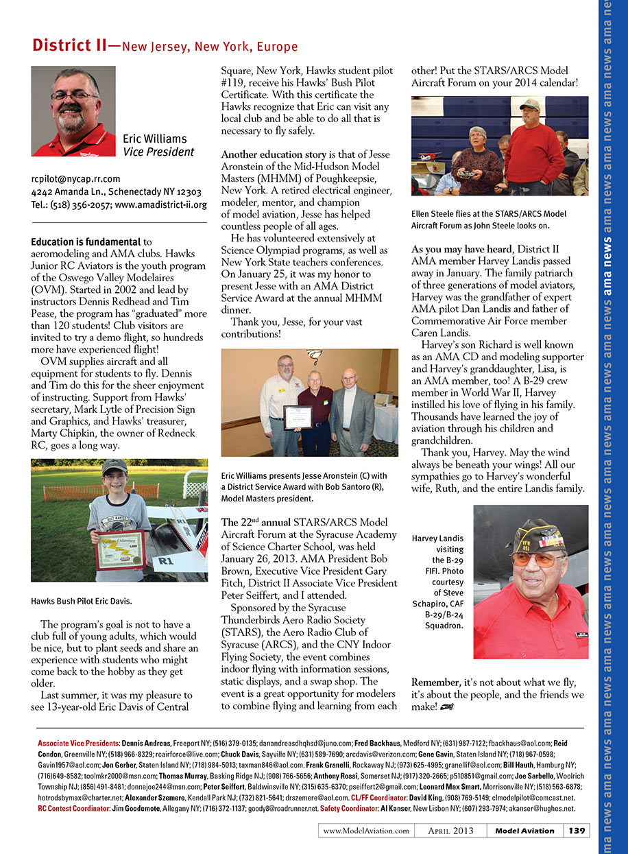 Another education story is that of Jesse Aronstein of the Mid-Hudson Model Masters (MHMM) of Poughkeepsie, New York. A retired electrical engineer, modeler, mentor, and champion of model aviation, Jesse has helped countless people of all ages.