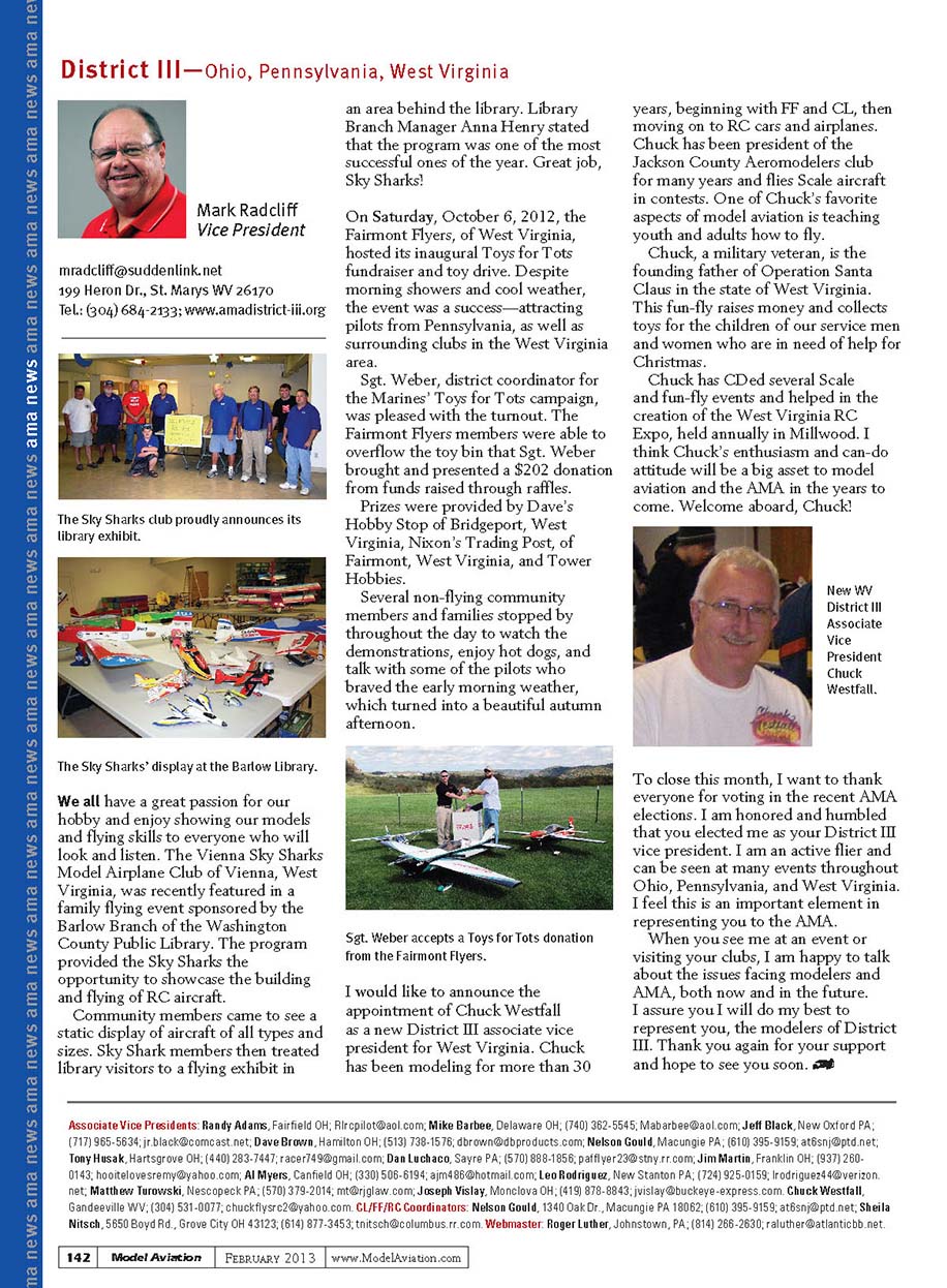 comThe Sky Sharks club proudly announces its library exhibit.The Sky Sharks’ display at the Barlow Library.We all have a great passion for our hobby and enjoy showing our models and flying skills to everyone who will look and listen. The Vienna Sky Sharks Model Airplane Club of Vienna, West Virginia, was recently featured in a family flying event sponsored by the Barlow Branch of the Washington County Public Library. The program provided the Sky Sharks the opportunity to showcase the building and flying of RC aircraft. Community members came to see a static display of aircraft of all types and sizes. Sky Shark members then treated library visitors to a flying exhibit in an area behind the library. Library Branch Manager Anna Henry stated that the program was one of the most successful ones of the year. Great job, Sky Sharks!On Saturday, October 6, 2012, the Fairmont Flyers, of West Virginia, hosted its inaugural Toys for Tots fundraiser and toy drive. Despite morning showers and cool weather, the event was a success—attracting pilots from Pennsylvania, as well as surrounding clubs in the West Virginia area.Sgt. Weber, district coordinator for the Marines’ Toys for Tots campaign, was pleased with the turnout. The Fairmont Flyers members were able to overflow the toy bin that Sgt. Weber brought and presented a $202 donation from funds raised through raffles. Prizes were provided by Dave’s Hobby Stop of Bridgeport, West Virginia, Nixon’s Trading Post, of Fairmont, West Virginia, and Tower Hobbies. Several non-flying community members and families stopped by throughout the day to watch the demonstrations, enjoy hot dogs, and talk with some of the pilots who braved the early morning weather, which turned into a beautiful autumn afternoon.Sgt. Weber accepts a Toys for Tots donation from the Fairmont Flyers.I would like to announce the appointment of Chuck Westfall as a new District III associate vice president for West Virginia. Chuck has been modeling for more than 30 years, beginning with FF and CL, then moving on to RC cars and airplanes. Chuck has been president of the Jackson County Aeromodelers club for many years and flies Scale aircraft in contests. One of Chuck’s favorite aspects of model aviation is teaching youth and adults how to fly. Chuck, a military veteran, is the founding father of Operation Santa Claus in the state of West Virginia. This fun-fly raises money and collects toys for the children of our service men and women who are in need of help for Christmas. Chuck has CDed several Scale and fun-fly events and helped in the creation of the West Virginia RC Expo, held annually in Millwood. I think Chuck’s enthusiasm and can-do attitude will be a big asset to model aviation and the AMA in the years to come. Welcome aboard, Chuck!New WV District III Associate Vice President Chuck Westfall.To close this month, I want to thank everyone for voting in the recent AMA elections. I am honored and humbled that you elected me as your District III vice president. I am an active flier and can be seen at many events throughout Ohio, Pennsylvania, and West Virginia. I feel this is an important element in representing you to the AMA. When you see me at an event or visiting your clubs, I am happy to talk about the issues facing modelers and AMA, both now and in the future. I assure you I will do my best to represent you, the modelers of District III. Thank you again for your support and hope to see you soon.