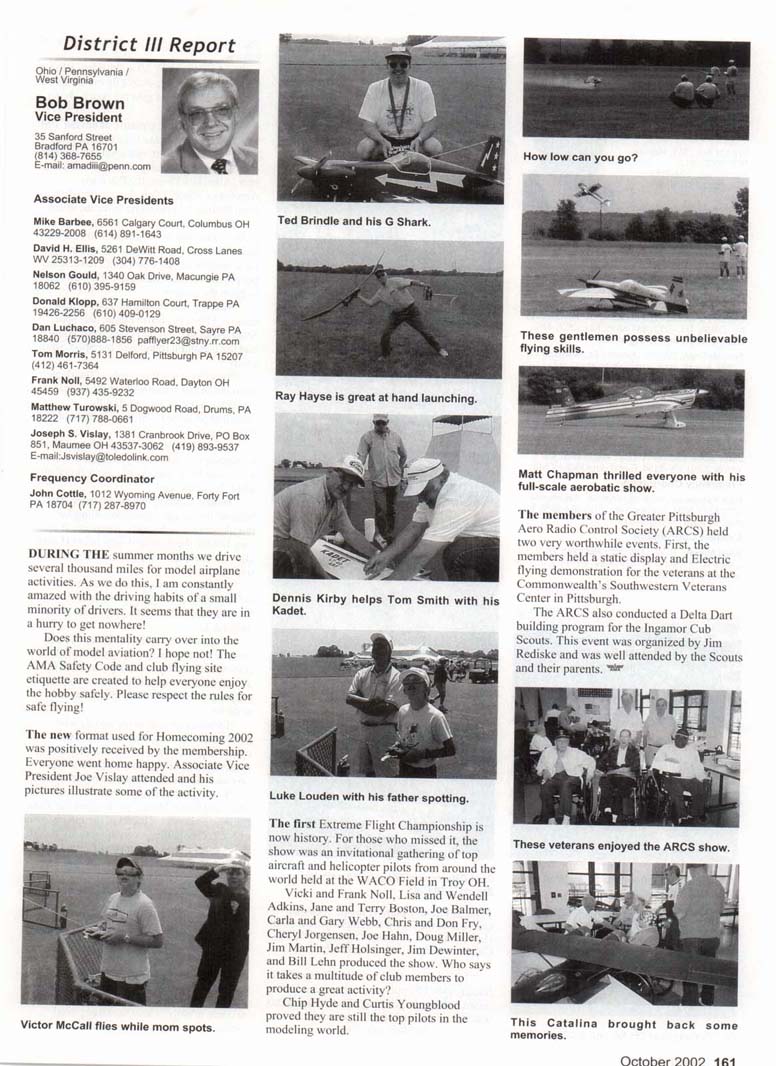 Bob Brown Vice President 35 Sanford Street Bradford PA 16701 (814) 368-7655 I E-mail: amadiii@penn.com apj^ Associate Vice Presidents Mike Barbee, 6561 Calgary Court, Columbus OH 43229-2008 (614)891-1643 David H. Ellis, 5261 DeWitt Road, Cross Lanes WV 25313-1209 (304) 776-1408 Nelson Gould, 1340 Oak Drive, Macungie PA 18062 (610) 395-9159 Donald Klopp, 637 Hamilton Court, Trappe PA 19426-2256 (610)409-0129 Dan Luchaco, 605 Stevenson Street, Sayre PA 18840 (570)888-1856 pafflyer23@stny.rr.com Tom Morris, 5131 Delford, Pittsburgh PA 15207 (412)461-7364 Frank Noll, 5492 Waterloo Road, Dayton OH 45459 (937)435-9232 Matthew Turowski, 5 Dogwood Road, Drums, PA 18222 (717)788-0661 Joseph S. Vislay, 1381 Cranbrook Drive, PO Box 851, Maumee OH 43537-3062 (419) 893-9537 E-mail:Jsvislay@toledolink.com Frequency Coordinator John Cottle, 1012 Wyoming Avenue, Forty Fort PA 18704 (717)287-8970 DURING THE summer months we drive several thousand miles for model airplane activities. As we do this, I am constantly amazed with the driving habits of a small minority of drivers. It seems that they are in a hurry to get nowhere! Does this mentality carry over into the world of model aviation? I hope not! The AMA Safety Code and club flying site etiquette are created to help everyone enjoy the hobby safely. Please respect the rules for safe flying! The new format used for Homecoming 2002 was positively received by the membership. Everyone went home happy. Associate Vice President Joe Vislay attended and his pictures illustrate some of the activity. Ted Brindle and his G Shark. U These gentlemen possess unbelievable flying skills. Ray Hayse is great at hand launching. t-***. f Dennis Kirby helps Tom Smith with his Kadet. Victor McCall flies while mom spots. Luke Louden with his father spotting. The first Extreme Flight Championship is now history. For those who missed it, the show was an invitational gathering of top aircraft and helicopter pilots from around the world held at the WACO Field in Troy OH. Vicki and Frank Noll. Lisa and Wendell Adkins, Jane and Terry Boston, Joe Balmer, Carla and Gary Webb, Chris and Don Fry, Cheryl Jorgensen, Joe Hahn, Doug Miller, Jim Martin. Jeff Holsinger, Jim Dewinter. and Bill Lehn produced the show. Who says it takes a multitude of club members to produce a great activity? Chip Hyde and Curtis Youngblood proved they are still the top pilots in the modeling world. Matt Chapman thrilled everyone with his full-scale aerobatic show. The members of the Greater Pittsburgh Aero Radio Control Society (ARCS) held , two very worthwhile events. First, the members held a static display and Electric flying demonstration for the veterans at the Commonwealth's Southwestern Veterans Center in Pittsburgh. The ARCS also conducted a Delta Dart building program for the Ingamor Cub Scouts. This event was organized by Jim Rediske and was well attended by the Scouts and their parents.