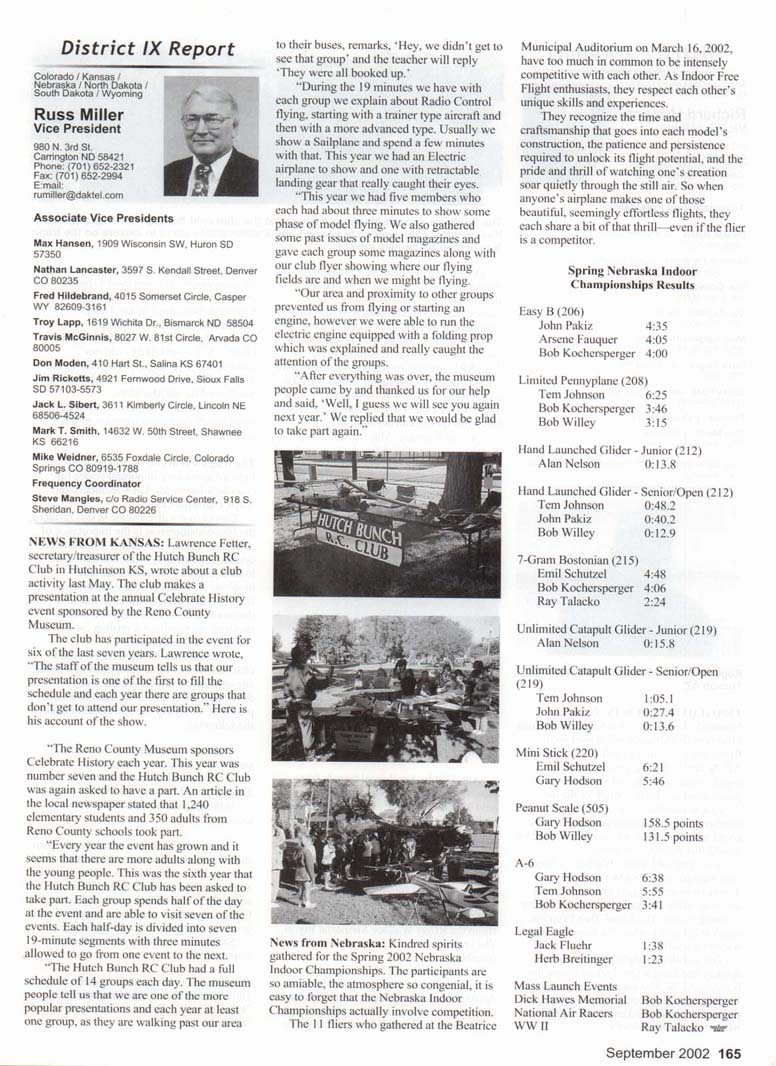Russ Miller Vice President 980 N. 3rd St. Carrington ND 58421 Phone: (701)652-2321 Fax:(701)652-2994 E:mail: rumiller@daktel.com Associate Vice Presidents Max Hansen, 1909 Wisconsin SW. Huron SD 57350 Nathan Lancaster, 3597 S. Kendall Street, Denver CO 80235 Fred Hildebrand, 4015 Somerset Circle, Casper WY 82609-3161 Troy Lapp, 1619 Wichita Dr., Bismarck ND 58504 Travis McGinnis, 8027 W. 81st Circle, Arvada CO 80005 Don Moden, 410 Hart St., Salina KS 67401 Jim Ricketts, 4921 Fernwood Drive, Sioux Falls SD 57103-5573 Jack L. Sibert, 3611 Kimberly Circle, Lincoln NE 68506-4524 Mark T. Smith, 14632 W. 50th Street, Shawnee KS 66216 Mike Weidner, 6535 Foxdale Circle, Colorado Springs CO 80919-1788 Frequency Coordinator Steve Mangles, c/o Radio Service Center, 918 S. Sheridan. Denver CO 80226 NEWS FROM KANSAS: Lawrence Fetter, secretary/treasurer of the Hutch Bunch RC Club in Hutchinson KS, wrote about a club activity last May. The club makes a presentation at the annual Celebrate History event sponsored by the Reno County Museum. The club has participated in the event tor six of the last seven years. Lawrence wrote, "The staff of the museum tells us that our presentation is one of the first to fill the schedule and each year there arc groups that don't get to attend our presentation.' Here is his account of the show. ; <.">i:<jt "The Reno County Museum sponsors Celebrate History each year. This year was number seven and the Hutch Bunch RC Club was again asked to have a part. An article in the local newspaper stated that 1,240 elementary students and 350 adults from Reno County schools took part. "Every year the event has grown and it seems that there are more adults along with the young people. This was the sixth year that the Hutch Bunch RC Club has been asked to take part. Each group spends half of the day at the event and arc able to visit seven of the events. Each half-day is divided into seven 19-minute segments with three minutes allowed to go from one event to the next. "The Hutch Bunch RC Club had a full schedule of 14 groups each day. The museum people tell us that we are one of the more popular presentations and each year at least one group, as they are walking past our area to their buses, remarks, 'Hey, we didn't get to see that group' and the teacher will reply They were all booked up.' "During the 19 minutes we have with each group we explain about Radio Control flying, starting with a trainer type aircraft and then with a more advanced type. Usually we show a Sailplane and spend a few minutes with that. This year we had an Electric airplane to show and one with retractable landing gear that really caught their eyes. "This year we had five members who each had about three minutes to show some phase of model flying. We also gathered some past issues of model magazines and gave each group some magazines along with our club flyer showing where our flying fields are and when we might be flying. "Our area and proximity to other groups prevented us from flying or starting an engine, however we were able to run the electric engine equipped with a folding prop which was explained and really caught the attention of the groups. "After everything was over, the museum people came by and thanked us for our help and said, 'Well, I guess we will see you again next year.' We replied that we would be glad to take part again." News from Nebraska: Kindred spirits gathered for the Spring 2002 Nebraska Indoor Championships. The participants are so amiable, the atmosphere so congenial, it is easy to forget that the Nebraska Indoor Championships actually involve competition. The 11 fliers who gathered at the Beatrice Municipal Auditorium on March 16, 2002, have too much in common to be intensely competitive with each other. As Indoor Free Flight enthusiasts, they respect each other's unique skills and experiences. They recognize the time and craftsmanship that goes into each model's "' construction, the patience and persistence required to unlock its flight potential, and the pride and thrill of watching one's creation soar quietly through the still air. So when anyone's airplane makes one of those beautiful, seemingly effortless flights, they each share a bit of that thrill—even if the flier is a competitor. Spring Nebraska Indoor Championships Results :,: , Easy B (206) :..•:..-.. .-. John Pakiz 4:35 ' Arsene Fauquer 4:05 ••;.• v;-.,;.-. •, j:.' Bob Kochersperger 4:00 Limited Pennyplane (208) Tern Johnson 6:25 . '"•':'.' ''.''; Bob Kochersperger 3:46 Bob Willey 3:15 ; r Hand Launched Glider - Junior (212) Alan Nelson 0:13.8 Hand Launched Glider - Senior/Open (212) Tern Johnson 0:48.2 John Pakiz 0:40.2 Bob Willey 0:12.9 7-Gram Bostonian (215) Emil Schutzel 4:48 Bob Kochersperger 4:06 Ray Talacko 2:24 Unlimited Catapult Glider - Junior (219) Alan Nelson 0:15.8 Unlimited Catapult Glider - Senior/Open « (219) • Tern Johnson 1:05.1 John Pakiz 0:27.4 >•,! h v :-' '•' Bob Willey 0:13.6 >• ; ;i Mini Stick (220) Emil Schutzel Gary Hodson Peanut Scale (505) Gary Hodson Bob Willey A-6 Gary Hodson Tern Johnson Bob Kochersperger Legal Eagle Jack Fluchr Herb Breitinger Mass Launch Events Dick Hawes Memorial National Air Racers WWII 6:21 5:46 158.5 points 131.5 points 6:38 5:55 3:41 1:38 1:23 Bob Kochersperger Bob Kochersperger Ray Talacko