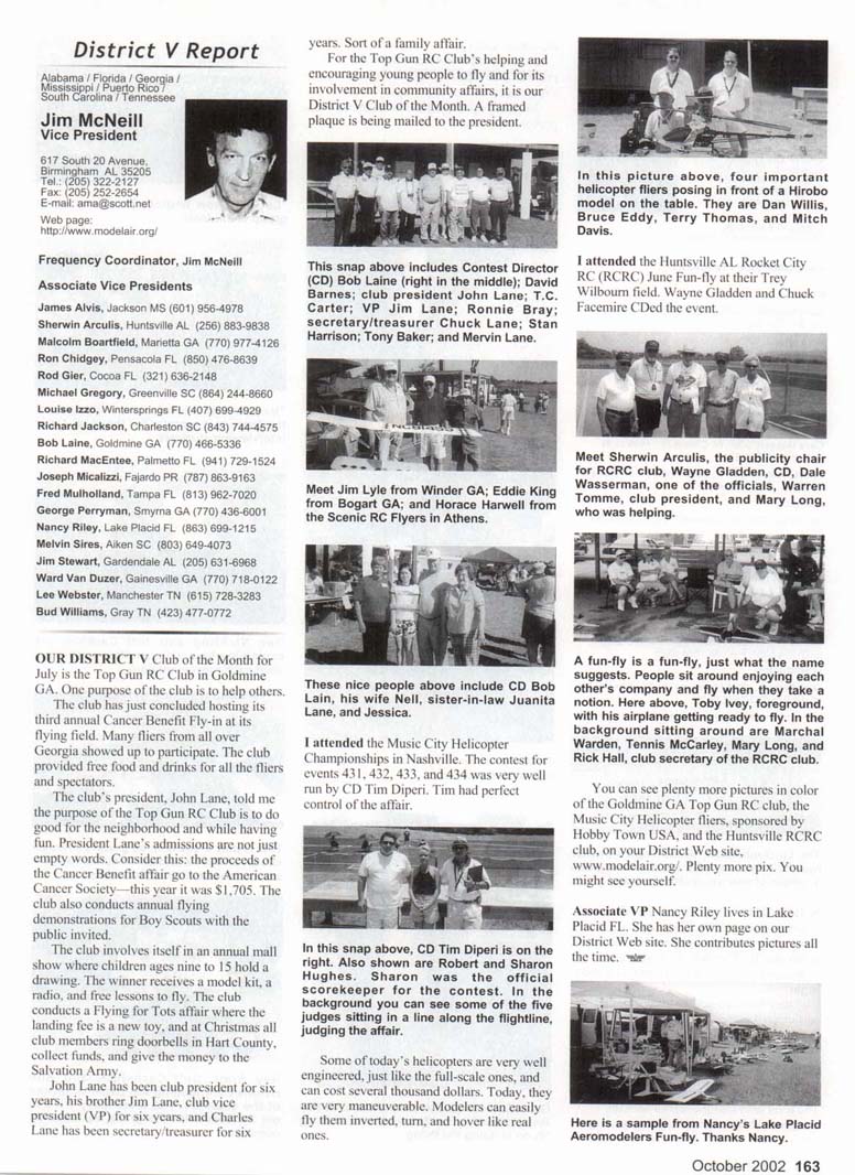 OUR DISTRICT V Club of Ihc Month for July is the Top Gun RC Club in Goldmine GA. One puipose of the elub is to help others. The club has just concluded hosting its third annual Cancer Benefit Fly-in at its flying field. Many fliers from all over Georgia showed up to participate. The club provided free food and drinks for all the fliers and spectators. The club's president, John Lane, told me the puipose of the Top Gun RC Club is to do good for the neighborhood and while having fun. President Lane's admissions arc not just empty words. Consider this: the proceeds of the Cancer Benefit affair go to the American Cancer Society—this year it was $1,705. The club also conducts annual flying demonstrations for Boy Scouts with the public invited. The club involves itself in an annual mall show where children ages nine to 15 hold a drawing. The winner receives a model kit, a radio, and free lessons to fly. The elub conducts a Flying for Tots affair where the landing fee is a new toy, and at Christmas all club members ring doorbells in Hart County, collect funds, and give the money to the Salvation Army. John Lane has been club president for six years, his brother Jim Lane, club vice president (VP) for six years, and Charles Lane has been secretary/treasurer for six years. Sort of a family affair. , : For the Top Gun RC Club's helping and encouraging young people to fly and for its involvement in community affairs, it is our District V Club of the Month. A framed plaque is being mailed to the president. This snap above includes Contest Director (CD) Bob Laine (right in the middle); David Barnes; club president John Lane; T.C. Carter; VP Jim Lane; Ronnie Bray; secretary/treasurer Chuck Lane; Stan Harrison; Tony Baker; and Mervin Lane. In this picture above, four important helicopter fliers posing in front of a Hirobo model on the table. They are Dan Willis, Bruce Eddy, Terry Thomas, and Mitch Davis. I attended the Huntsville AL Rocket City RC (RCRC) June Fun-fly at their Trey Wilbourn field. Wayne Gladden and Chuck Facemire CDed the event. Meet Jim Lyle from Winder GA; Eddie King from Bogart GA; and Horace Harwell from the Scenic RC Flyers in Athens. Meet Sherwin Arculis, the publicity chair for RCRC club, Wayne Gladden, CD, Dale Wasserman, one of the officials, Warren Tomme, club president, and Mary Long, who was helping. These nice people above include CD Bob Lain, his wife Neil, sister-in-law Juanita Lane, and Jessica. I attended the Music City Helicopter Championships in Nashville. The contest for events 431, 432, 433. and 434 was very well run by CD Tim Diperi. Tim had perfect control of the affair. In this snap above, CD Tim Diperi is on the right. Also shown are Robert and Sharon Hughes. Sharon was the official scorekeeper for the contest. In the background you can see some of the five judges sitting in a line along the flightline, judging the affair. Some of today's helicopters are very well engineered, just like the full-scale ones, and can cost several thousand dollars. Today, they are very maneuverable. Modelers can easily fly them inverted, turn, and hover like real ones. A fun-fly is a fun-fly, just what the name suggests. People sit around enjoying each other's company and fly when they take a notion. Here above, Toby Ivey, foreground, with his airplane getting ready to fly. In the background sitting around are Marchal Warden, Tennis McCarley, Mary Long, and Rick Hall, club secretary of the RCRC club. You can see plenty more pictures in color of the Goldmine GA Top Gun RC club, the Music City Helicopter fliers, sponsored by Hobby Town USA, and the Huntsville RCRC club, on your District Web site. www.modelair.org/. Plenty more pix. You might see yourself. ... .. ., ....-- Associate VP Nancy Riley lives in Lake Placid FL. She has her own page on our District Web site. She contributes pictures all the time.
