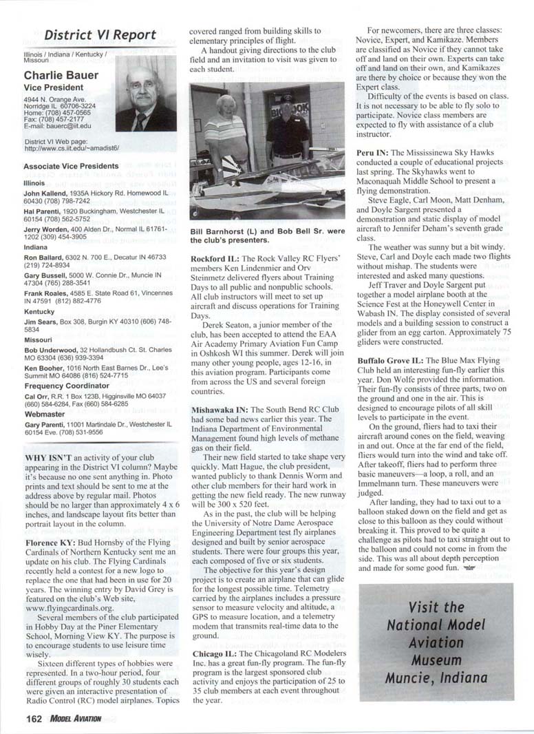 Charlie Bauer Vice President 4944 N. Orange Ave. Norridge IL 60706-3224 Home: (708) 457-0565 Fax: (708) 457-2177 E-mail: bauerc@iit.edu District VI Web page: http://www.cs.iit.edu/-amadist6/ Associate Vice Presidents Illinois John Kallend, 1935A Hickory Rd. Homewood IL 60430 (708) 798-7242 Hal Parenti, 1920 Buckingham, Westchester IL 60154(708)562-5752 Jerry Worden, 400 Alden Dr., Normal IL 61761-1202(309)454-3905 Indiana Ron Ballard, 6302 N. 700 E., Decatur IN 46733 (219)724-8934 Gary Bussell, 5000 W. Connie Dr., Muncie IN 47304 (765) 288-3541 Frank Roales, 4585 E. State Road 61, Vincennes IN 47591 (812)882-4776 Kentucky Jim Sears, Box 308, Burgin KY 40310 (606) 748-5834 Missouri Bob Underwood, 32 Hollandbush Ct. St. Charles MO 63304 (636) 939-3394 Ken Booher, 1016 North East Barnes Dr., Lee's Summit MO 64086 (816) 524-7715 Frequency Coordinator Cal Orr, R.R. 1 Box 123B, Higginsville MO 64037 (660) 584-6284, Fax (660) 584-6285 Webmaster " ' Gary Parenti, 11001 Martindale Dr., Westchester IL 60154 Eve. (708)531-9556 WHY ISN'T an activity of your club appearing in the District VI column? Maybe it's because no one sent anything in. Photo prints and text should be sent to me at the address above by regular mail. Photos should be no larger than approximately 4x6 inches, and landscape layout fits better than portrait layout in the column. Florence KY: Bud Hornsby of the Flying Cardinals of Northern Kentucky sent me an update on his club. The Flying Cardinals recently held a contest for a new logo to replace the one that had been in use for 20 years. The winning entry by David Grey is featured on the club's Web site, www.flyingcardinals.org. Several members of the club participated in Hobby Day at the Piner Elementary School, Morning View KY. The purpose is to encourage students to use leisure time wisely. Sixteen different types of hobbies were represented. In a two-hour period, four different groups of roughly 30 students each were given an interactive presentation of Radio Control (RC) model airplanes. Topics covered ranged from building skills to elementary principles of flight. A handout giving directions to the club field and an invitation to visit was given to each student. Bill Barnhorst (L) and Bob Bell Sr. were the club's presenters. Rockford IL: The Rock Valley RC Flyers' members Ken Lindenmier and Orv Steinmetz delivered flyers about Training Days to all public and nonpublic schools. All club instructors will meet to set up aircraft and discuss operations for Training Days. Derek Seaton, a junior member of the club, has been accepted to attend the EAA Air Academy Primary Aviation Fun Camp in Oshkosh WI this summer. Derek will join many other young people, ages 12-16, in this aviation program. Participants come from across the US and several foreign countries. Mishawaka IN: The South Bend RC Club had some bad news earlier this year. The Indiana Department of Environmental Management found high levels of methane gas on their field. Their new field started to take shape very quickly. Matt Hague, the club president, wanted publicly to thank Dennis Worm and other club members for their hard work in getting the new field ready. The new runway will be 300 x 520 feet. As in the past, the club will be helping the University of Notre Dame Aerospace Engineering Department test fly airplanes designed and built by senior aerospace students. There were four groups this year, each composed of five or six students. The objective for this year's design project is to create an airplane that can glide for the longest possible time. Telemetry carried by the airplanes includes a pressure sensor to measure velocity and altitude, a GPS to measure location, and a telemetry modem that transmits real-time data to the ground. Chicago IL: The Chicagoland RC Modelers Inc. has a great fun-fly program. The fun-fly program is the largest sponsored club activity and enjoys the participation of 25 to 35 club members at each event throughout the year. For newcomers, there are three classes: Novice, Expert, and Kamikaze. Members are classified as Novice if they cannot take off and land on their own. Experts can take off and land on their own, and Kamikazes are there by choice or because they won the Expert class. Difficulty of the events is based on class. It is not necessary to be able to fly solo to participate. Novice class members are expected to fly with assistance of a club instructor. Peru IN: The Mississinewa Sky Hawks conducted a couple of educational projects last spring. The Skyhawks went to Maconaquah Middle School to present a flying demonstration. Steve Eagle, Carl Moon, Matt Denham, and Doyle Sargent presented a demonstration and static display of model aircraft to Jennifer Deham's seventh grade class. The weather was sunny but a bit windy. Steve, Carl and Doyle each made two flights without mishap. The students were interested and asked many questions. Jeff Traver and Doyle Sargent put together a model airplane booth at the Science Fest at the Honeywell Center in Wabash IN. The display consisted of several models and a building session to construct a glider from an egg carton. Approximately 75 gliders were constructed. Buffalo Grove IL: The Blue Max Flying Club held an interesting fun-fly earlier this year. Don Wolfe provided the information. Their fun-fly consists of three parts, two on the ground and one in the air. This is designed to encourage pilots of all skill levels to participate in the event. On the ground, fliers had to taxi their aircraft around cones on the field, weaving in and out. Once at the far end of the field, fliers would turn into the wind and take off. After takeoff, fliers had to perform three basic maneuvers—a loop, a roll, and an Immelmann turn. These maneuvers were judged. After landing, they had to taxi out to a balloon staked down on the field and get as close to this balloon as they could without breaking it. This proved to be quite a challenge as pilots had to taxi str
