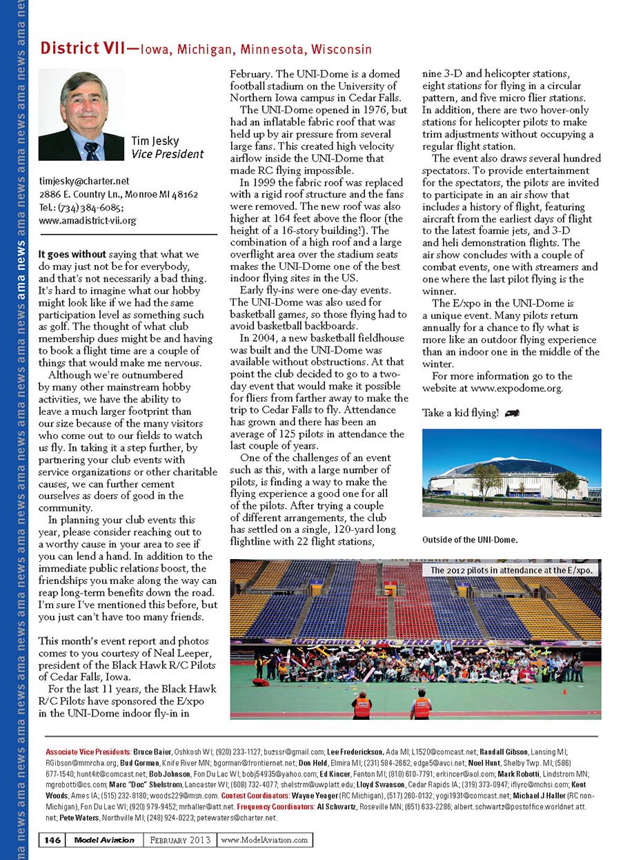 comIt goes without saying that what we do may just not be for everybody, and that’s not necessarily a bad thing. It’s hard to imagine what our hobby might look like if we had the same participation level as something such as golf. The thought of what club membership dues might be and having to book a flight time are a couple of things that would make me nervous. Although we’re outnumbered by many other mainstream hobby activities, we have the ability to leave a much larger footprint than our size because of the many visitors who come out to our fields to watch us fly. In taking it a step further, by partnering your club events with service organizations or other charitable causes, we can further cement ourselves as doers of good in the community. In planning your club events this year, please consider reaching out to a worthy cause in your area to see if you can lend a hand. In addition to the immediate public relations boost, the friendships you make along the way can reap long-term benefits down the road. I’m sure I’ve mentioned this before, but you just can’t have too many friends.This month’s event report and photos comes to you courtesy of Neal Leeper, president of the Black Hawk R/C Pilots of Cedar Falls, Iowa. For the last 11 years, the Black Hawk R/C Pilots have sponsored the E/xpo in the UNI-Dome indoor fly-in in February. The UNI-Dome is a domed football stadium on the University of Northern Iowa campus in Cedar Falls. The UNI-Dome opened in 1976, but had an inflatable fabric roof that was held up by air pressure from several large fans. This created high velocity airflow inside the UNI-Dome that made RC flying impossible. In 1999 the fabric roof was replaced with a rigid roof structure and the fans were removed. The new roof was also higher at 164 feet above the floor (the height of a 16-story building!). The combination of a high roof and a large overflight area over the stadium seats makes the UNI-Dome one of the best indoor flying sites in the US.Early fly-ins were one-day events. The UNI-Dome was also used for basketball games, so those flying had to avoid basketball backboards. In 2004, a new basketball fieldhouse was built and the UNI-Dome was available without obstructions. At that point the club decided to go to a two-day event that would make it possible for fliers from farther away to make the trip to Cedar Falls to fly. Attendance has grown and there has been an average of 125 pilots in attendance the last couple of years.One of the challenges of an event such as this, with a large number of pilots, is finding a way to make the flying experience a good one for all of the pilots. After trying a couple of different arrangements, the club has settled on a single, 120-yard long flightline with 22 flight stations, nine 3-D and helicopter stations, eight stations for flying in a circular pattern, and five micro flier stations. In addition, there are two hover-only stations for helicopter pilots to make trim adjustments without occupying a regular flight station.The event also draws several hundred spectators. To provide entertainment for the spectators, the pilots are invited to participate in an air show that includes a history of flight, featuring aircraft from the earliest days of flight to the latest foamie jets, and 3-D and heli demonstration flights. The air show concludes with a couple of combat events, one with streamers and one where the last pilot flying is the winner.The E/xpo in the UNI-Dome is a unique event. Many pilots return annually for a chance to fly what is more like an outdoor flying experience than an indoor one in the middle of the winter. For more information go to the website at www.expodome.org.Take a kid flying!