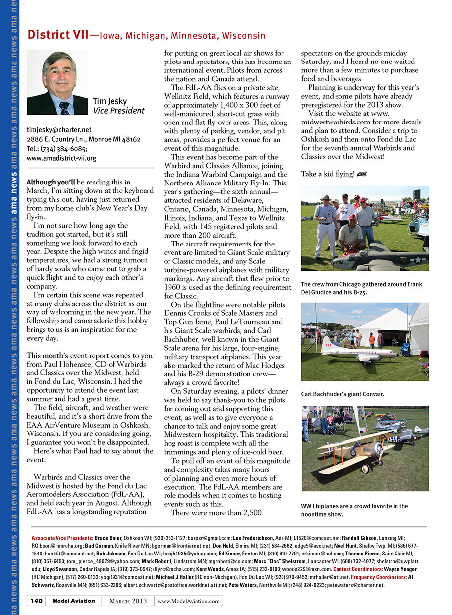 Warbirds and Classics over the Midwest is hosted by the Fond du Lac Aeromodelers Association (FdL-AA), and held each year in August. Although FdL-AA has a longstanding reputation for putting on great local air shows for pilots and spectators, this has become an international event. Pilots from across the nation and Canada attend.