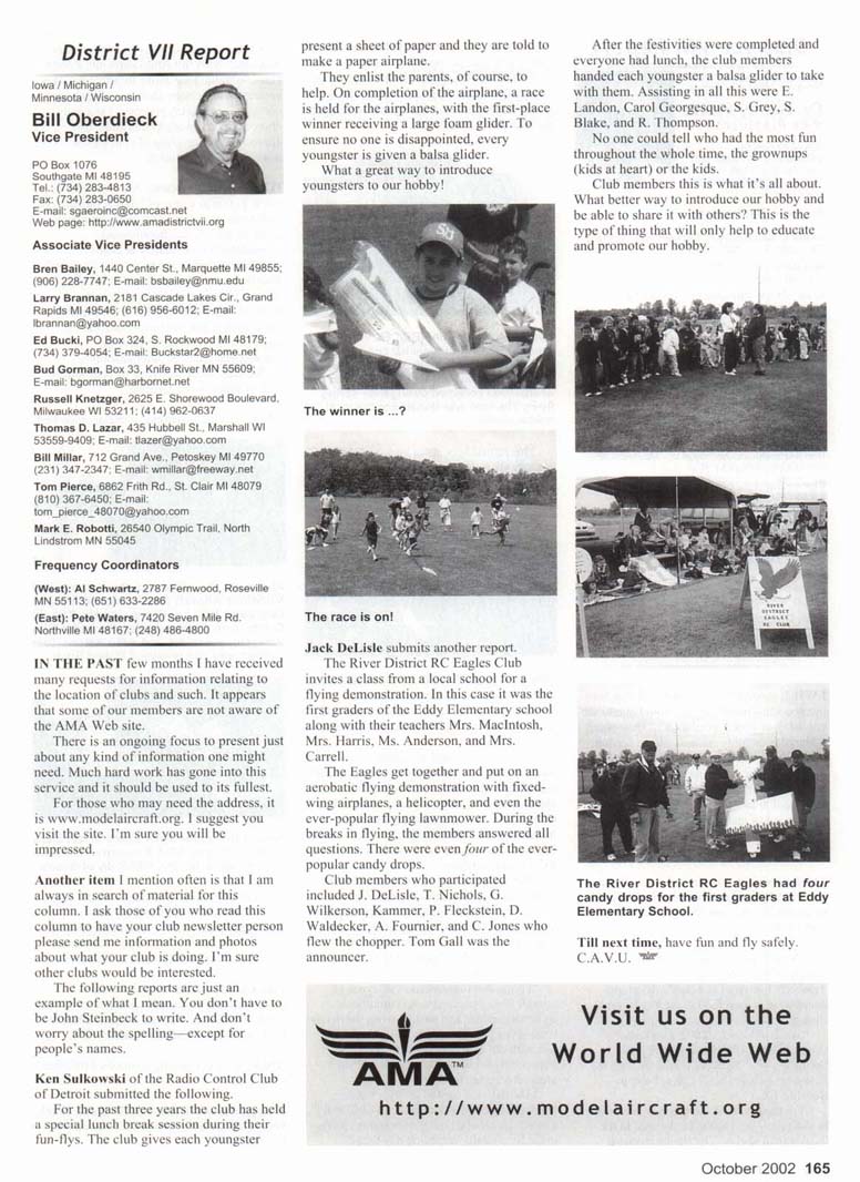 IN THE PAST few months 1 have received many requests for information relating to the location of clubs and such. It appears that some of our members are not aware of the AMA Web site. There is an ongoing focus to present just about any kind of information one might need. Much hard work has gone into this service and it should be used to its fullest. For those who may need the address, it is www.modelaircraft.org. I suggest you visit the site. I'm sure you will be impressed. Another item I mention often is that I am always in search of material for this column. 1 ask those of you who read this column to have your club newsletter person please send me information and photos about what your club is doing. I'm sure other clubs would be interested. The following reports are just an example of what I mean. You don't have to be John Steinbeck to write. And don't worry about the spelling—except for people's names. Ken Sulkowski of the Radio Control Club of Detroit submitted the following. For the past three years the club has held a special lunch break session during their fun-flys. The club gives each youngster present a sheet of paper and they are told to make a paper airplane. They enlist the parents, of course, to help. On completion of the airplane, a race is held for the airplanes, with the first-place winner receiving a large foam glider. To ensure no one is disappointed, every youngster is given a balsa glider. What a great way to introduce youngsters to our hobby! After the festivities were completed and everyone had lunch, the club members handed each youngster a balsa glider to take with them. Assisting in all this were E. Landon, Carol Georgesquc, S. Grey, S. Blake, and R. Thompson. No one could tell who had the most fun throughout the whole time, the grownups (kids at heart) or the kids. Club members this is what it's all about. What better way to introduce our hobby and be able to share it with others? This is the type of thing that will only help to educate and promote our hobby. The race is on! Jack DeLisle submits another report. The River District RC Eagles Club invites a class from a local school for a flying demonstration. In this case it was the first graders of the Eddy Elementary school along with their teachers Mrs. Macintosh, Mrs. Harris. Ms. Anderson, and Mrs. Carrell. The Eagles get together and put on an aerobatic flying demonstration with fixed-wing airplanes, a helicopter, and even the ever-popular flying lawnmower. During the breaks in flying, the members answered all questions. There were even four of the ever-popular candy drops. .. " •••; Club members who participated included J. DeLisle, T. Nichols, G. Wilkerson, Kammer, P. Fleckstein, D. Waldecker. A. Fournier, and C. Jones who flew the chopper. Tom Gall was the announcer.