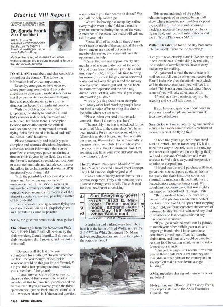 Dr. Sandy Frank Vice President 105 N. Brazos St., Weatherford TX 76086-3207 TelVFax: (817)599-7131 E-mail: sfrank69@airmail.net www.AMA-Dist-8.org Notice: For listing of all district volunteer workers consult the previous magazine issue or the above Web address. TO ALL AMA members and chartered clubs throughout the country: The following information is of critical importance. Recently, emergencies have occurred where providing complete and accurate directions to emergency medical services so that they can locate a model aircraft flying field and provide assistance in a critical situation has become a significant concern. With the proliferation of cellular telephones, the ability to contact 911 and EMS services is definitely increased and welcomed, but when there is incomplete location information available, critical minutes can be lost. Many model aircraft flying fields are located in isolated and "off-the-beaten-path" locations. Please permanently and indelibly post complete and accurate directions, locations, addresses, and/or information that can be provided to emergency personnel during a time of crisis at your flying field. Use either the formally accepted street address locations or accurate longitude and latitude coordinates that allow for global positional system (GPS) location of your flying field. With the possibility of accidental physical injury and the increasing incidence of emergency medical situations (such as an unexpected coronary condition), the above request to post accurate information is of the utmost importance, and yes, possibly a matter of life or death! Please consider posting accurate flying site location information as a high-priority item and institute it as soon as possible. AMA, the glue that bonds modelers together! The following is from the Henderson Field News, North Little Rock AR. written by the club president, Gerald Martika. (I do read all club newsletters that I receive, and this got my attention!) "Do you recall the last time you volunteered for anything? Do you remember the last time you thought, 'Gee, 1 wish someone would do things a little differently'?' Do you think just 'paying the dues' makes you a member of the group? "If your answer to any of these was no, then you should find a way to be a better member of that big bunch of people called the human race. If you answered yes to the third question, well just sit back and let 'them' do it all—whoever 'them' is. If the second question was a definite yes, then 'come on down!' We need all the help we can get. "We will be having a cleanup day before every major event at the field, and routine yard maintenance during the rest of the year. A member of the executive board will call and ask for your help. "Please, if all of us pitch in, these chores won't take up much of the day, and if the calls for volunteers are spaced out over the membership roster, everyone will have the opportunity to help. "Currently, we have approximately five members who seem to do most of the work. One of them, Steve Coffman (who has a full time regular job), always finds time to bring his mower, his truck, his gas, and a borrowed trailer out and keep the grass and the runway looking great. I also might add, he has been the bulldozer operator and the bush hog driver. For all of this, what would you charge after working all day? "1 am only using Steve as an example here. Many other hard-working people have put forth a major effort to bring this club to the point where we are now. "Please, when you read this, just ask yourself, 'Have I done my part here?' "The monthly meeting is scheduled for the seventh of May, at the same place. We have been meeting for a snack and some old-time fellowship at about 6 p.m., and then on with the meeting. We want you to be there with us, because this is your club. This is where you have your say in the club business. Don't let someone else have your vote and your say in how things are done." The Ft. Worth Planesmen Model Airplane Club (MAC) presented a novel event concept. They held a model airplane yard sale! It was a sale of hobby-related items, not a normal swap meet. Only club members were allowed to bring items to sell. The club paid for local newspaper advertising. Sun Everything goes! 76108 - 8123 E. Melrose: Radio control model airplane yard sale May 18th 9a-1p White Settlement Admission and parking were free. They held it at the home of Fred Wolfe, tel.: (817) 246-6777, in White Settlement TX. Many active modeling enthusiasts from throughout the region attended. This event had much of the public-relations aspects of an aeromodeling mall show where interested nonmodclcrs stopped by, sought information about becoming modelers, received directions to the club's flying field, and received information about the Ft. Worth Planesmen MAC. Willem Dykstra, editor of the Bay Port Aero Club newsletter, sent me the following: "Get your newsletter by E-mail! We are trying to reduce the cost of publishing by reducing the number of newsletters we have to copy and stamp for mailing. "All you need to read the newsletter is E-mail access. All you do when you receive the E-mail is double-click the attachment (which will be the newsletter) and you will see it in color! This is not a complicated thing. I hope many of you will take advantage of this. "If you have any questions, come to the meeting and we will talk about it." If you have any questions about how this program is working please contact him at: tacomawd@aol.com. Sam Grice sent me an interesting and creative solution to a model aircraft club's problem of storage space at the flying field. "About two years ago, we at Fort Bend Radio Control Club in Rosenberg TX had a need for a way to securely store our mowing and other club equipment [at the flying field]. We had our share of vandalism and were anxious to find a fast, easy, and inexpensive solution to our problem. "I found that we could purchase a 20-foot, galvanized steel shipping container fro