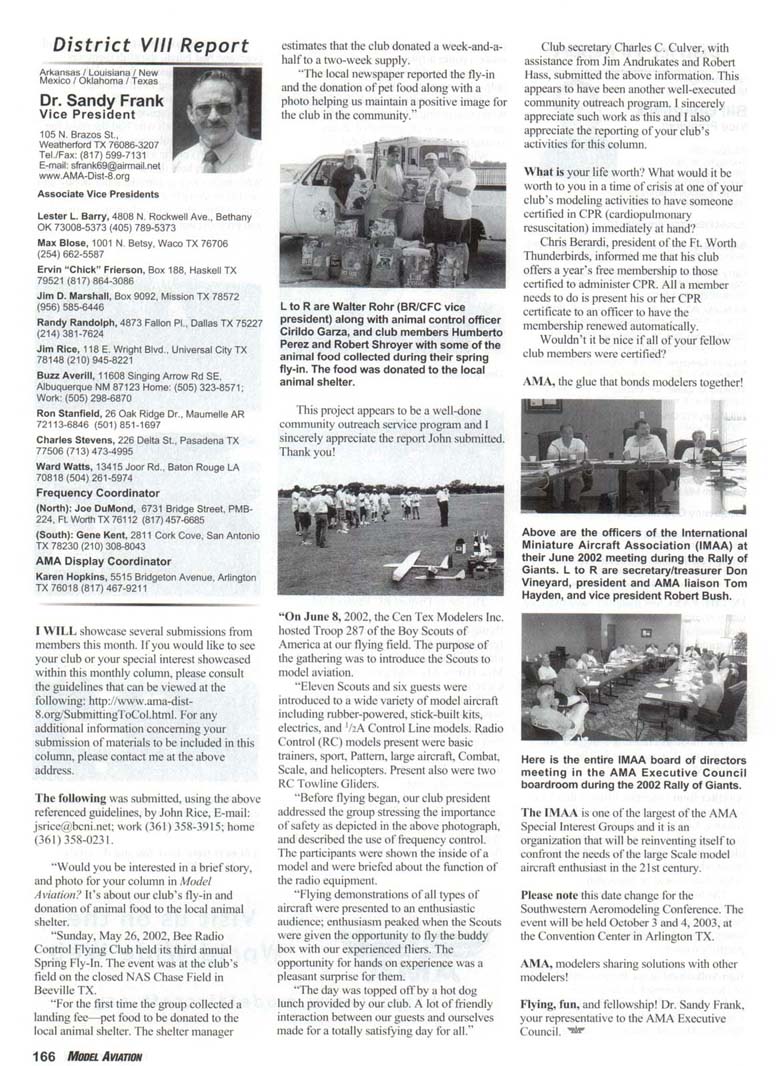 I WILL showcase several submissions from members this month. If you would like to sec your club or your special interest showcased within this monthly column, please consult the guidelines that can be viewed at the following: http://www.ama-dist-S.org/SubmittingToCol.html. For any additional information concerning your submission of materials to be included in this column, please contact me at the above address. The following was submitted, using the above referenced guidelines, by John Rice, E-mail: jsrice@bcni.net; work (361) 358-3915; home (361)358-0231. "Would you be interested in a brief story, and photo for your column in Model Aviation? It's about our club's fly-in and donation of animal food to the local animal shelter. "Sunday, May 26, 2002, Bee Radio Control Flying Club held its third annual Spring Fly-in. The event was at the club's field on the closed NAS Chase Field in Beeville TX. "For the first time the group collected a landing fee—pet food to be donated to the local animal shelter. The shelter manager estimates that the club donated a week-and-a-half to a two-week supply. "The local newspaper reported the fly-in and the donation of pet food along with a photo helping us maintain a positive image for the club in the community." L to R are Walter Rohr (BR/CFC vice president) along with animal control officer Cirildo Garza, and club members Humberto Perez and Robert Shroyer with some of the animal food collected during their spring fly-in. The food was donated to the local animal shelter. This project appears to be a well-done community outreach service program and I sincerely appreciate the report John submitted. Thank you! "On June 8,2002, the Cen Tex Modelers Inc. hosted Troop 287 of the Boy Scouts of America at our flying field. The purpose of the gathering was to introduce the Scouts to model aviation. "Eleven Scouts and six guests were introduced to a wide variety of model aircraft including rubber-powered, stick-built kits, electrics, and '/:A Control Line models. Radio Control (RC) models present were basic trainers, sport. Pattern, large aircraft. Combat, Scale, and helicopters. Present also were two RC Towline Gliders. "Before flying began, our club president addressed the group stressing the importance of safety as depicted in the above photograph, and described the use of frequency control. The participants were shown the inside of a model and were briefed about the function of the radio equipment. "Flying demonstrations of all types of aircraft were presented to an enthusiastic audience; enthusiasm peaked when the Scouts were given the opportunity to fly the buddy box with our experienced fliers. The opportunity for hands on experience was a pleasant surprise for them. "The day was topped off by a hot dog lunch provided by our club. A lot of friendly interaction between our guests and ourselves made for a totally satisfying day for all." Club secretary Charles C. Culver, with assistance from Jim Andrukates and Robert Mass, submitted the above information. This appears to have been another well-executed community outreach program. I sincerely appreciate such work as this and I also appreciate the reporting of your club's activities for this column. What is your life worth? What would it be worth to you in a time of crisis at one of your club's modeling activities to have someone certified in CPR (cardiopulmonary resuscitation) immediately at hand? Chris Berardi, president of the Ft. Worth Thunderbirds, informed me that his club offers a year's free membership to those certified to administer CPR. All a member needs to do is present his or her CPR certificate to an officer to have the '•'' "'•'''• '-' membership renewed automatically. Wouldn't it be nice if all of your fellow club members were certified? AMA, the glue that bonds modelers together! Above are the officers of the International Miniature Aircraft Association (IMAA) at their June 2002 meeting during the Rally of Giants. L to R are secretary/treasurer Don Vineyard, president and AMA liaison Tom Hayden, and vice president Robert Bush. Here is the entire IMAA board of directors meeting in the AMA Executive Council boardroom during the 2002 Rally of Giants. The IMAA is one of the largest of the AMA Special Interest Groups and it is an organization that will be reinventing itself to confront the needs of the large Scale model aircraft enthusiast in the 21st century. Please note this date change for the Southwestern Aeromodeling Conference. The event will be held October 3 and 4, 2003, at the Convention Center in Arlington TX. AMA, modelers sharing solutions with other modelers! >••• • " •• • *• "•" • •••> Flying, fun, and fellowship! Dr. Sandy Frank, your representative to the AMA Executive Council.