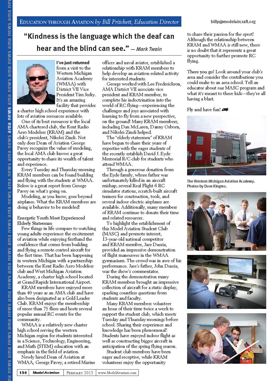 ama news ama news ama news ama news ama news ama news ama news ama news ama news ama news ama news ama news ama news ama news154Model Aviation February 2013www.ModelAviation.comI’ve just returned from a visit to the Western Michigan Aviation Academy (WMAA) with District VII Vice President Tim Jesky. It’s an amazing facility that provides a charter high school experience with lots of aviation resources available. One of its best resources is the local AMA chartered club, the Kent Radio Aero Modelers (KRAM) and the club’s president, Nikolei Zinsli. Not only does Dean of Aviation George Pavey recognize the value of modeling, the local AMA club knows a great opportunity to share its wealth of talent and experience. Every Tuesday and Thursday morning KRAM members can be found building and flying with the students at WMAA. Below is a great report from George Pavey on what’s going on.Modeling, as you know, goes beyond airplanes. What the KRAM members are doing is behavior to be modeled!Energetic Youth Meet Experienced Elderly StatesmanFew things in life compare to watching young adults experience the excitement of aviation while enjoying firsthand the confidence that comes from building and flying a remote control aircraft for the first time. That has been happening in western Michigan with a partnership between the Kent Radio Aero Modelers club and West Michigan Aviation Academy, a charter high school located at Grand Rapids International Airport. KRAM members have enjoyed more than 40 years as an AMA club and have also been designated as a Gold Leader Club. KRAM enjoys the membership of more than 75 fliers and hosts several popular annual RC events for the community. WMAA is a relatively new charter high school serving the western Michigan region for students interested in a Science, Technology, Engineering, and Math (STEM) education with an emphasis in the field of aviation. Newly hired Dean of Aviation at WMAA, George Pavey, a retired Marine officer and naval aviator, established a relationship with KRAM members to help develop an aviation-related activity for interested students. George worked with Lee Frederickson, AMA District VII associate vice president and KRAM member, to complete his indoctrination into the world of RC flying—experiencing the challenges and joys associated with learning to fly from a new perspective, on the ground! Many KRAM members, including Dan McLaren, Danny Osborn, and Nikolei Zinsli helped. The “elderly statesmen” of KRAM have begun to share their years of expertise with the eager students of the recently establish David J. Eyde Memorial R/C club for students who attend WMAA. Through a generous donation from the Eyde family, whose father was unfortunately killed in an aircraft mishap, several Real Flight 6 RC simulator stations, scratch-built aircraft trainers for construction, tools, and several indoor electric airplanes are available. Additionally, many members of KRAM continue to donate their time and related resources. To highlight the establishment of this Model Aviation Student Club (MASC) and promote interest, 13-year-old national competitor and KRAM member, Jase Dussia, provided an impressive demonstration of flight maneuvers in the WMAA gymnasium. The crowd was in awe of his performance. Jase’s father, John Dussia, was the show’s commentator. During the demonstration many KRAM members brought an impressive collection of aircraft for a static display, sparking countless questions from students and faculty.Many KRAM members volunteer an hour of their time twice a week to support the student club, which meets Tuesday and Thursday mornings before school. Sharing their experience and knowledge has been phenomenal! Students have enjoyed indoor flight as well as constructing bigger aircraft in anticipation of the spring flying season. Student club members have been eager and receptive, while KRAM volunteers enjoy the opportunity to share their passion for the sport! Although the relationship between KRAM and WMAA is still new, there is no doubt that it represents a great opportunity to further promote RC flying.There you go! Look around your club’s area and consider the contributions you could make to an area school. Tell an educator about our MASC program and what it’s meant to these kids—they’re all having a blast.Fly and have fun! Education through aviation by Bill Pritchett, Education Director“Kindness is the language which the deaf can hear and the blind can see.” — Mark Twainbillp@modelaircraft.orgThe Western Michigan Aviation Academy. Photos by Dave Kingma.