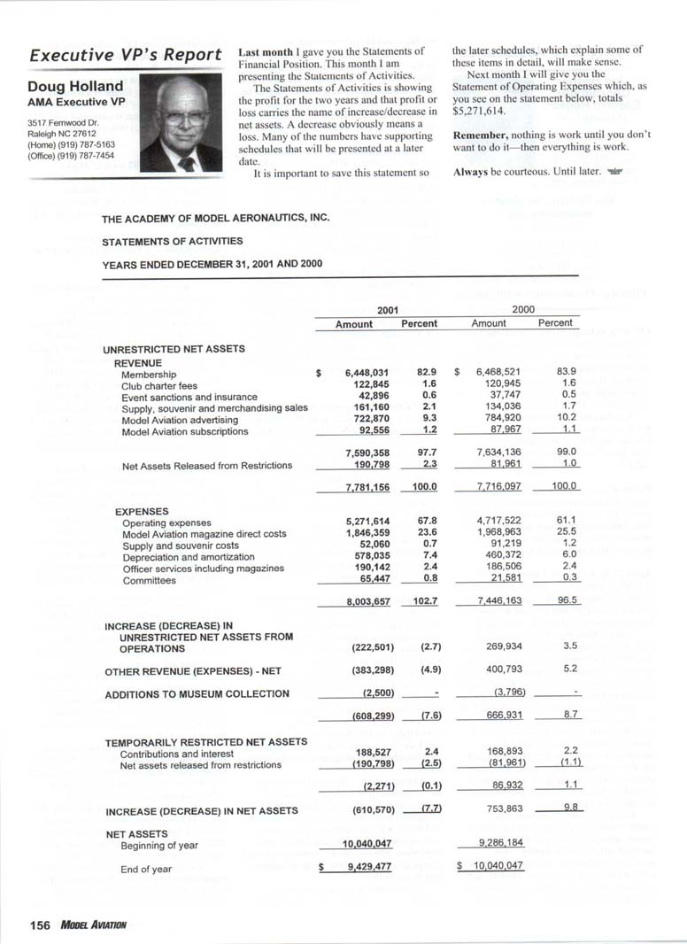 Doug Holland AMA Executive VP 3517 Femwood Dr. Raleigh NC 27612 (Home) (919) 787-5163 (Office) (919) 787-7454 Last month I gave you the Statements of Financial Position. This month 1 am presenting the Statements of Activities. The Statements of Activities is showing the profit for the two years and that profit or loss carries the name of increase/decrease in net assets. A decrease obviously means a loss. Many of the numbers have supporting schedules that will be presented at a later date. It is important to save this statement so the later schedules, which explain some of these items in detail, will make sense. Next month I will give you the Statement of Operating Expenses which, as you see on the statement below, totals $5,271,614. Remember, nothing is work until you don't want to do it—then everything is work. Always be courteous. Until later. THE ACADEMY OF MODEL AERONAUTICS, INC. STATEMENTS OF ACTIVITIES YEARS ENDED DECEMBER 31, 2001 AND 2000 2001 2000 Amount Percent Amount Percent UNRESTRICTED NET ASSETS REVENUE Membership Club charter fees Event sanctions and insurance Supply, souvenir and merchandising sales Model Aviation advertising Model Aviation subscriptions Net Assets Released from Restrictions EXPENSES Operating expenses Model Aviation magazine direct costs Supply and souvenir costs Depreciation and amortization Officer services including magazines Committees INCREASE (DECREASE) IN UNRESTRICTED NET ASSETS FROM OPERATIONS OTHER REVENUE (EXPENSES) - NET ADDITIONS TO MUSEUM COLLECTION TEMPORARILY RESTRICTED NET ASSETS Contributions and interest Net assets released from restrictions INCREASE (DECREASE) IN NET ASSETS NET ASSETS Beginning of year End of year $ 6,448,031 122,845 42,896 161,160 722,870 92,556 82.9 1.6 0.6 2.1 9.3 1.2 7,590,358 190,798 97.7 2.3 7,781,156 100.0 5,271,614 1,846,359 52,060 578,035 190,142 65,447 67.8 23.6 0.7 7.4 2.4 0.8 8,003,657 102.7 (222,501) (383,298) (2,500) (2.7) (4.9) (608.299) (7.6) 2.4 (2.5) (0.1) (7.7) 188,527 (190,798) (2.271) (610,570) 10.040,047 $ 9,429,477 $ 6,468,521 120,945 37,747 134,036 784,920 87.967 83.9 1.6 0.5 1.7 10.2 1.1 7,634,136 81.961 99.0 1.0 7.716.097 100.0 4,717,522 1,968,963 91,219 460,372 186,506 21,581 61.1 25.5 1.2 6.0 2.4 0.3 7.446.163 96.5 269,934 400,793 (3,796) 3.5 5.2 666,931 8.7 168,893 (81,961) 2.2 (1.1) 86.932 1.1 753,863 _ 9.8 9,286,184 $ 10,040,047