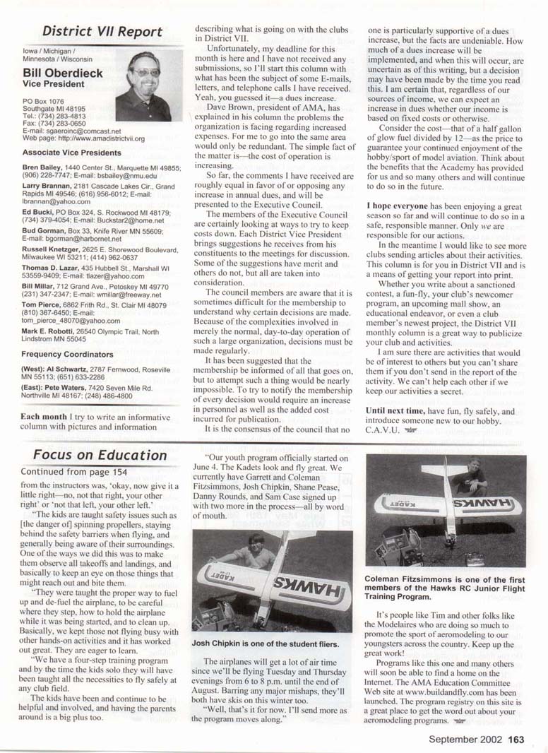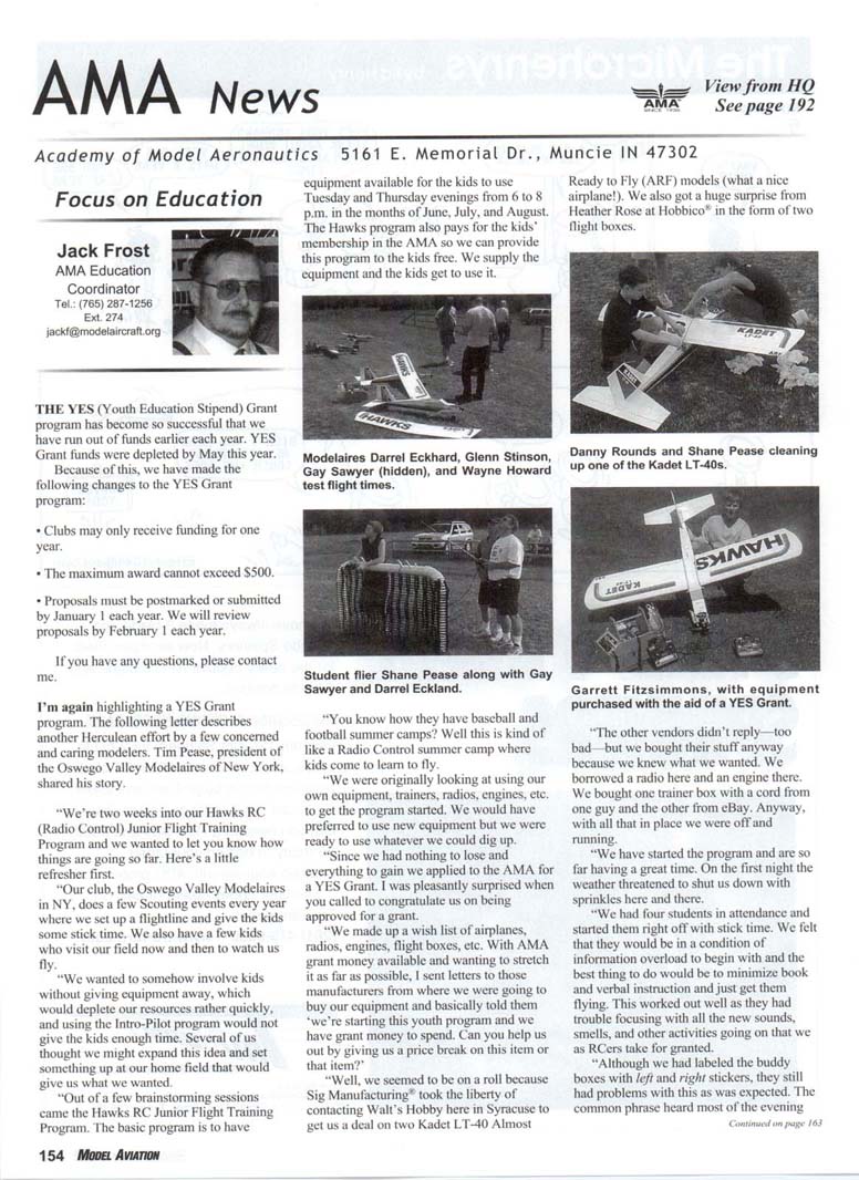 THE YES (Youth Education Stipend) Grant program has become so successful that we have run out of funds earlier each year. YES Grant funds were depleted by May this year. Because of this, we have made the following changes to the YES Grant program: • Clubs may only receive funding for one year. • The maximum award cannot exceed $500. • Proposals must be postmarked or submitted by January 1 each year. We will review proposals by February 1 each year. If you have any questions, please contact me. I'm again highlighting a YES Grant program. The following letter describes another Herculean effort by a few concerned and caring modelers. Tim Pease, president of the Oswego Valley Modelaires of New York, shared his story. "We're two weeks into our Hawks RC (Radio Control) Junior Flight Training Program and we wanted to let you know how things are going so far. Here's a little refresher first. "Our club, the Oswego Valley Modelaires in NY, does a few Scouting events every year where we set up a flightline and give the kids some stick time. We also have a few kids who visit our field now and then to watch us fly. "We wanted to somehow involve kids without giving equipment away, which would deplete our resources rather quickly, and using the Intro-Pilot program would not give the kids enough time. Several of us thought we might expand this idea and set something up at our home field that would give us what we wanted. "Out of a few brainstorming sessions came the Hawks RC Junior Flight Training Program. The basic program is to have equipment available for the kids to use Tuesday and Thursday evenings from 6 to 8 p.m. in the months of June, July, and August. The Hawks program also pays for the kids' membership in the AMA so we can provide this program to the kids free. We supply the equipment and the kids get to use it. Ready to Fly (ARF) models (what a nice airplane!). We also got a huge surprise from Heather Rose at Hobbico* in the form of two flight boxes. Modelaires Darrel Eckhard, Glenn Stinson, Gay Sawyer (hidden), and Wayne Howard test flight times. Danny Rounds and Shane Pease cleaning up one of the Kadet LT-40s. Student flier Shane Pease along with Gay Sawyer and Darrel Eckland. "You know how they have baseball and football summer camps? Well this is kind of like a Radio Control summer camp where kids come to learn to fly. "We were originally looking at using our own equipment, trainers, radios, engines, etc. to get the program started. We would have preferred to use new equipment but we were ready to use whatever we could dig up. "Since we had nothing to lose and everything to gain we applied to the AMA for a YES Grant. I was pleasantly surprised when you called to congratulate us on being approved for a grant. "We made up a wish list of airplanes, radios, engines, flight boxes, etc. With AMA grant money available and wanting to stretch it as far as possible, 1 sent letters to those manufacturers from where we were going to buy our equipment and basically told them 'we're starting this youth program and we have grant money to spend. Can you help us out by giving us a price break on this item or that item?' "Well, we seemed to be on a roll because Sig Manufacturing" took the liberty of contacting Walt's Hobby here in Syracuse to get us a deal on two Kadet LT-40 Almost Garrett Fitzsimmons, with equipment purchased with the aid of a YES Grant. "The other vendors didn't reply—too bad—but we bought their stuff anyway because we knew what we wanted. We borrowed a radio here and an engine there. We bought one trainer box with a cord from one guy and the other from eBay. Anyway, with all that in place we were off and running. "We have started the program and are so far having a great time. On the first night the weather threatened to shut us down with sprinkles here and there. "We had four students in attendance and started them right off with stick time. We felt that they would be in a condition of information overload to begin with and the best thing to do would be to minimize book and verbal instruction and just get them flying. This worked out well as they had trouble focusing with all the new sounds, smells, and other activities going on that we as RCers take for granted. "Although we had labeled the buddy boxes with left and right stickers, they still had problems with this as was expected. The common phrase heard most of the evening from the instructors was, 'okay, now give it a little right—no, not that right, your other right' or 'not that left, your other left.' "The kids arc taught safety issues such as [the danger of] spinning propellers, staying behind the safety barriers when flying, and generally being aware of their surroundings. One of the ways we did this was to make them observe all takeoffs and landings, and basically to keep an eye on those things that might reach out and bite them. "They were taught the proper way to fuel up and de-fuel the airplane, to be careful where they step, how to hold the airplane while it was being started, and to clean up. Basically, we kept those not flying busy with other hands-on activities and it has worked out great. They are eager to learn. "We have a four-step training program and by the time the kids solo they will have been taught all the necessities to fly safely at any club field. The kids have been and continue to be helpful and involved, and having the parents around is a big plus too. "Our youth program officially started on June 4. The Kadets look and fly great. We currently have Garrett and Coleman Fitzsimmons, Josh Chipkin, Shane Pease, Danny Rounds, and Sam Case signed up with two more in the process—all by word of mouth. Josh Chipkin is one of the student fliers. The airplanes will get a lot of air time since we'll be flying Tuesday and Thursday evenings from 6 to 8 p.m. until the end of August. Barring any major mishaps, they'll both have skis on this winter too. "Well, that's it for now. I'll send more as the program
