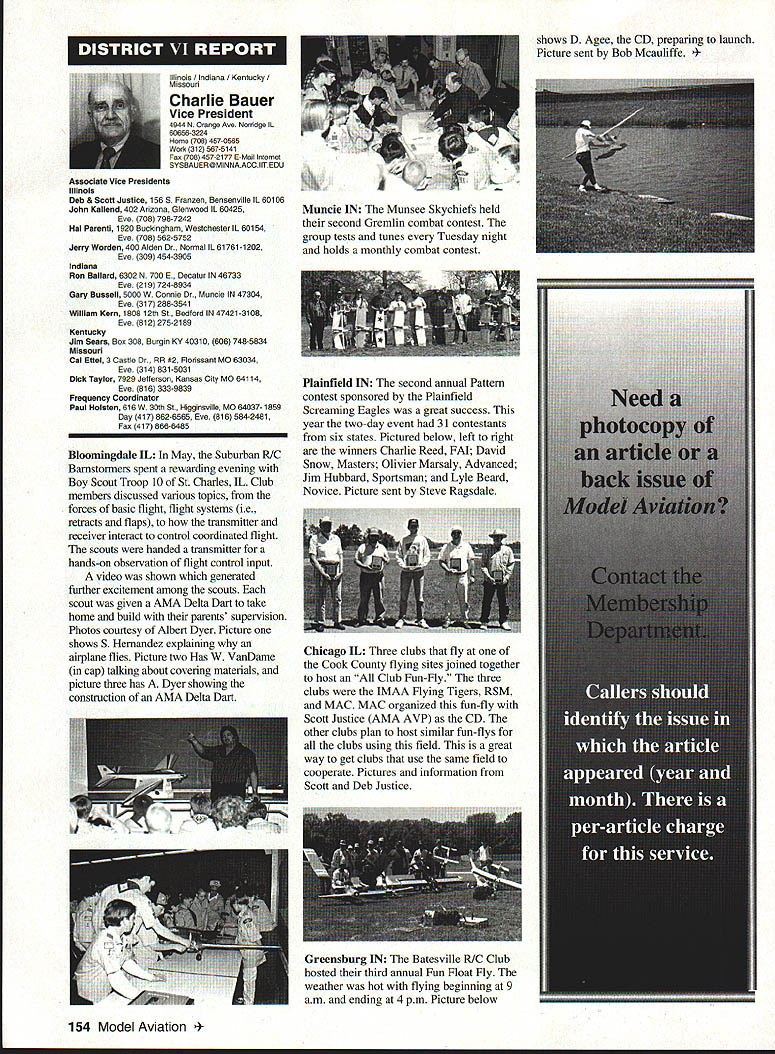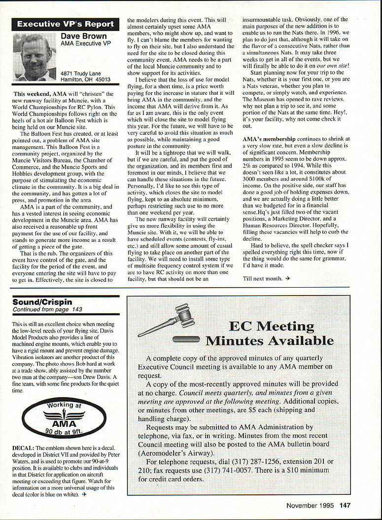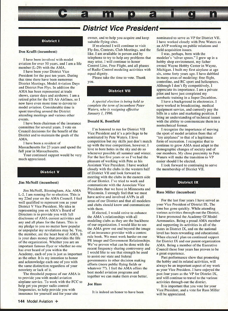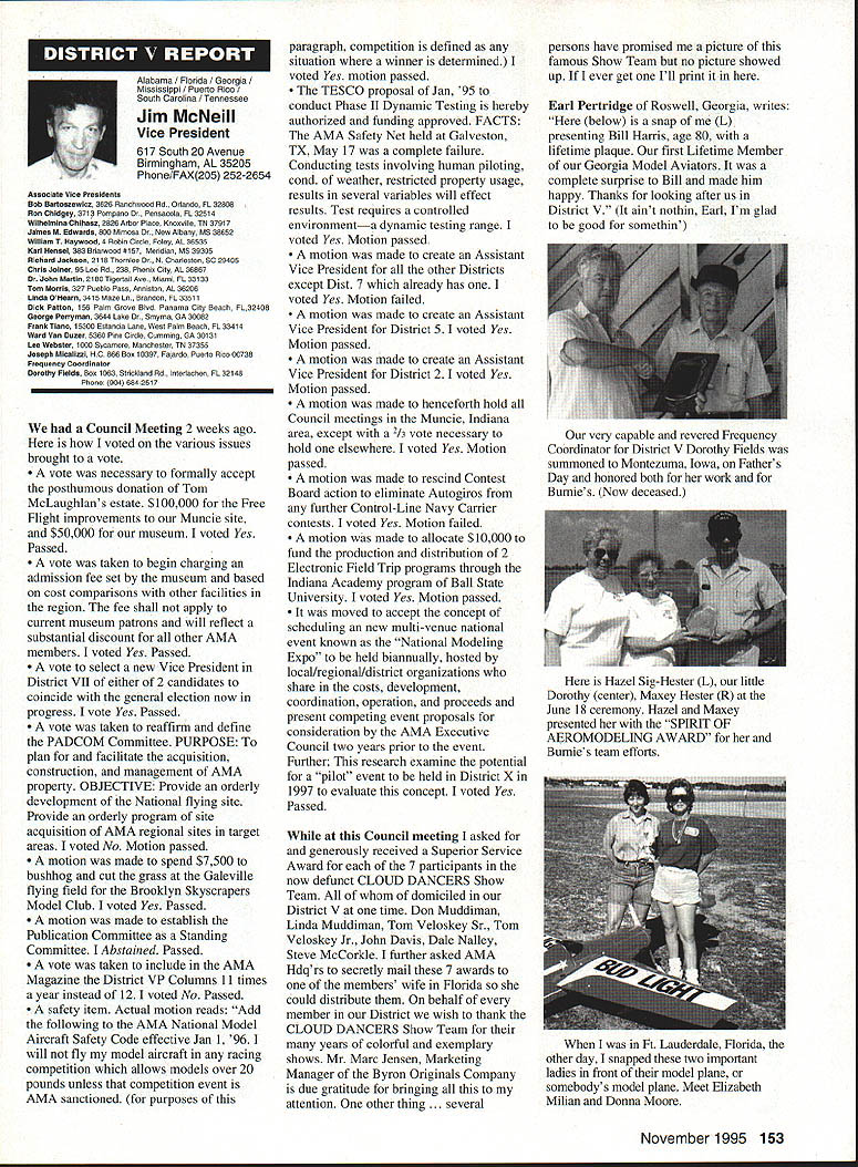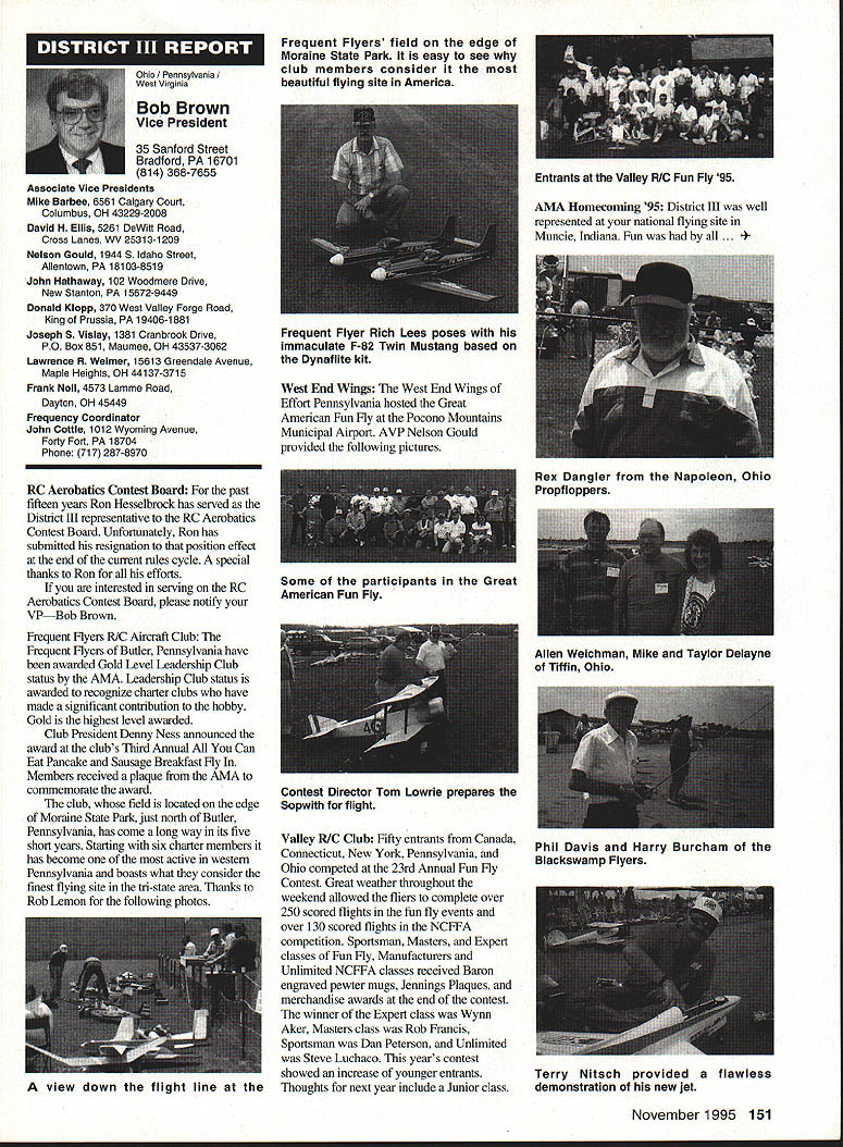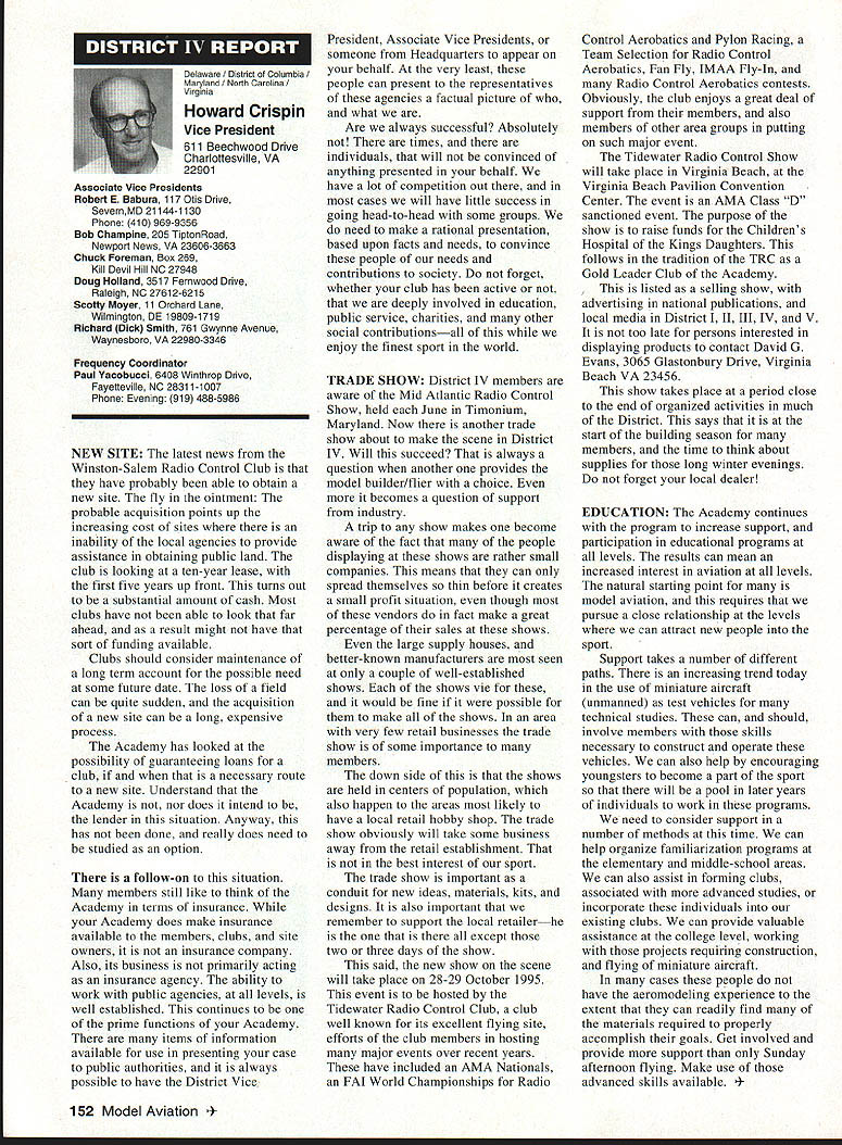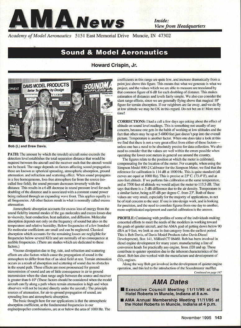 Inside View Headquarters Academy Model Aeronautics 5151 East Memorial Drive Muncie IN 47302 PATH amount model aircraft noise exceeds detection level establishes total separation distance would required between aircraft receiver such aircraft would heard range depends factors affecting sound propagation known spherical spreading atmospheric absorption ground attenuation refraction scattering effect sound propagates frec homogeneous loss-free atmosphere far source called free field sound pressure decreases inversely distance results 6 dB decrease sound pressure level doubling distance associated constant sound power being radiated through expanding wave front applies equally frequencies other factors result what normally called excess attenuation Atmospheric absorption accounts excess loss energy sound field internal modes gas molecules excess losses due viscosity heat conduction heat radiation diffusion Molecular absorption depends oaly frequency sound also temperature relative humidity Below frequencies few hundred Hz molecular coefficients small can neglected Classical absorption accounts remaining losses negligible frequencies below several KHz normally no consequence audible frequencies studies dedicated factors Viscous dissipation due fog rain refraction scattering effects also factors cause propagation sound atmosphere differ ideal field rest Terrain attenuation occurs result absorption scattering sound due obstacles sound path effects pronounced ground transmission sound little consequence air ground transmission slant range angle between source receiver greater 6l00 factors should considered model aircraft can fly along path terrain attenuation high observers will located directly under aircraft principle sources attenuation air-to-ground propagation sound spreading loss atmospheric absorption basic thought applications atmospheric absorption coefficient fundamental frequencies engine/propeller combinations below area 1000 Hz coefficients range quite low increase dramatically point just above figure means what generate what project values able measure translated common figure 6 dB doubling distance makes estimation distances levels fairly simple also can consider slant range effects since generally flying above magical 100 figure terrain absorption neighbors far away fly low altitude may OK regard bet next time CORRECTIONS call few days ago asking about effect altitude sound level readings something usually concern because gets habit working low altitudes fact others may up 5-6000 feet just doesnt pop overall picture Temperature another factor does take look find very great effect either factors unless has need absolutely precise data collection also need consider values well within errors possible operating lower cost meters general use around country figures relate position meter calibrated compensating location meter example using Simpson Model 890-2 Calibrator Simpson Meter find reference calibration 114 dB 1000 Hz quite standard curves equal 1000 Hz precise 230 C 7340 F zero feet altitude perform calibration same temperature 7500 feet altitude would adjust meter 1135 dB says 5 dB difference due air density Temperature similar factor being 05 dB per degree C 230 Both values very small especially majority applications real concern user design work looking precision need correlate figures day another sophisticated equipment careful calibration answer PROFILE Continuing profiles some individuals making concerted efforts meet needs modelers working toward goals quieter aircraft AMA goal getting down below 90 dBA 9 feet look category earliest period Bob Davis Davis Model Products also Davis Diesel Development Box 141 Milford CT 06460 Bob has involved diesel engine development years manufacturing line conversion heads practically engine 020 up contribute quieter operation due inherent characteristics diesel Bob has also worked manufacture development CO2 engines Along way Bob got involved development quieter engine operation led introduction Soundmaster muffler November 1995 143 Howard Crispin Jr Bob L Drew Davis Continued page 147 District Vice President have involved model aviation over 50 years am life member L-29 AMA have District Vice President past ten years During time have numerous District Meetings Model Aviation Days District Fun Flys addition AMA has represented trade shows career days airshows am retired pilot US Air Airlines now have time devote model aviation Considerable time spent traveling around District attending meetings various other events have chairman insurance committee several years vote Council decisions benefit District maintain goals AMA have resident Massachusetts fur 23 years spend full year Massachusetts continued support would very much appreciated Jim MeNeill Birmingham Ala AMA L-2 am running re-election 22nd year AMA Council feel well qualified represent District V Vice President idea representing AMAs Board Directors provide full disclosure AMA current activities plans future pledge no matter popular unpopular revelations may member heart beat AMA dues money provides life organization Whether important famous flyer whether no has ever heard within Academy just important other intention honor acknowledge same distinction regardless notoriety lack threshold purpose AMA provide model aviation airplane service work FCC help get proper radio control frequencies help provide insurance yourself site owner help acquire keep suitable flying sites re-elected will continue visit Fly-Ins Contests Club Meetings like am available person telephone try help problems may arise will continue honor Control Line Free Flight phases Radio Control modeling activities equal dignity Please take time vote Thank special election being held complete term incumbent Peter Waters resigning effective January 1 1996 Donald K Bentfield Im honored run District VII Vice President its privilege nominated Pete Waters love competition skills just dont match up true competition however 