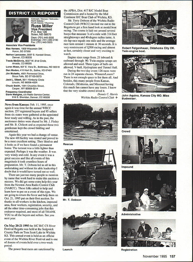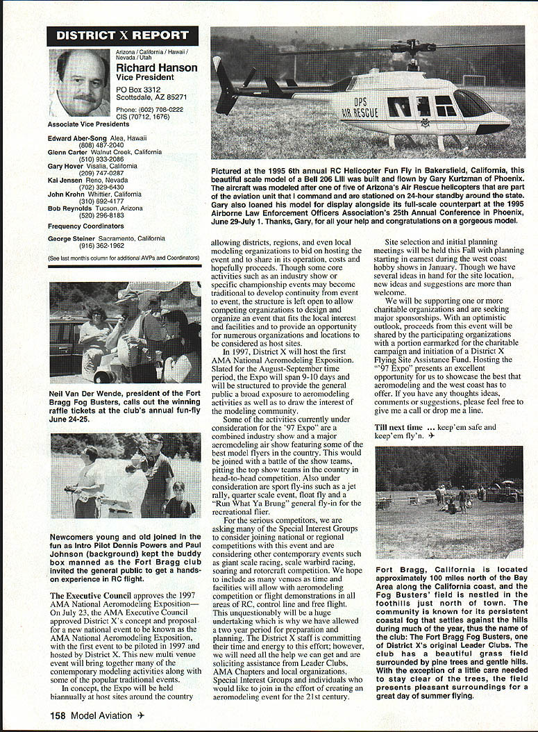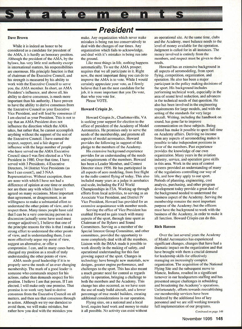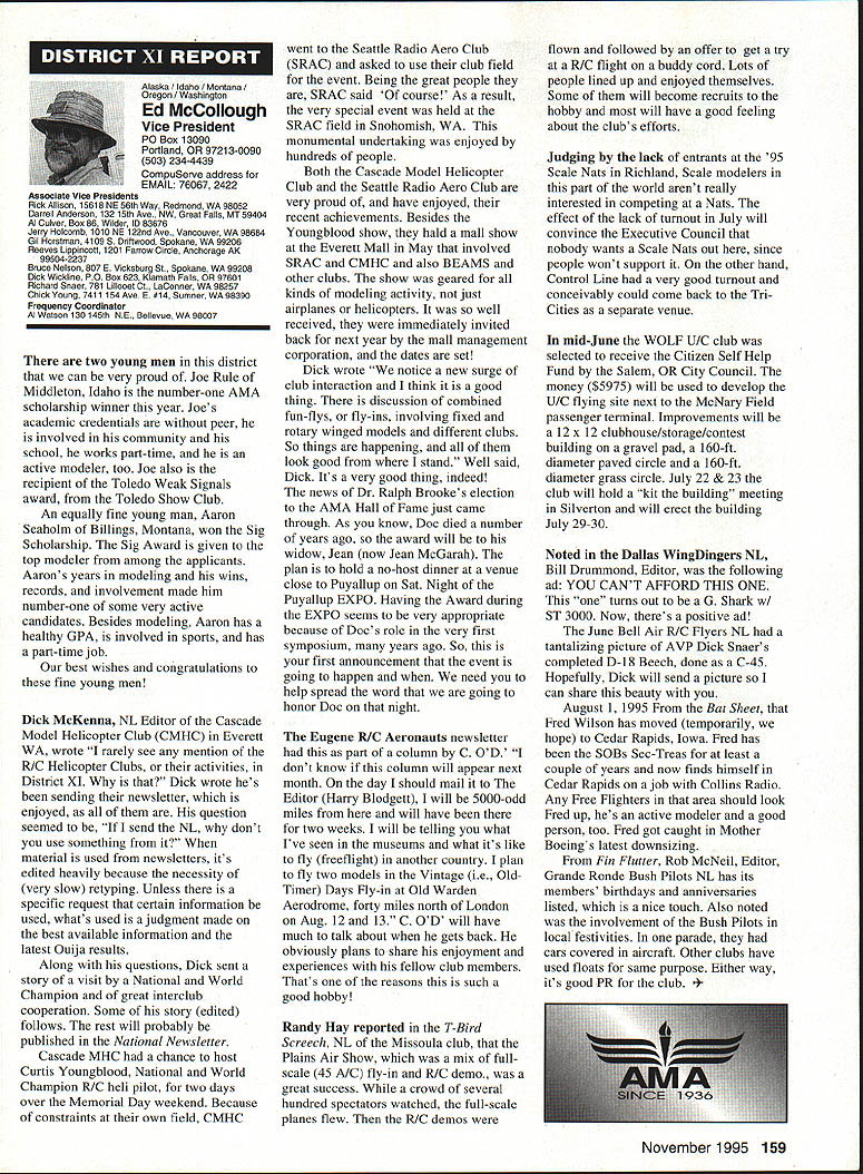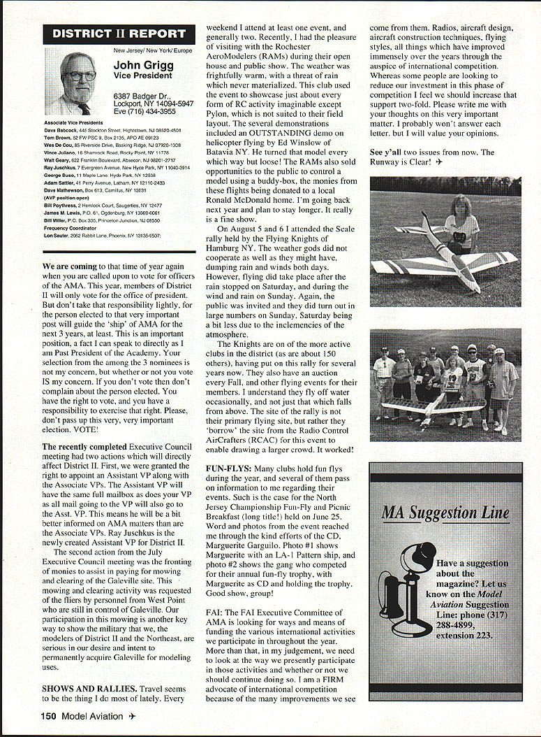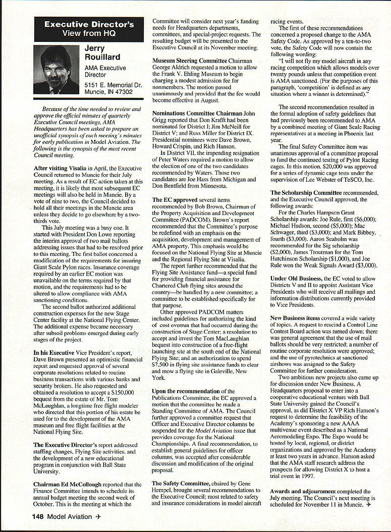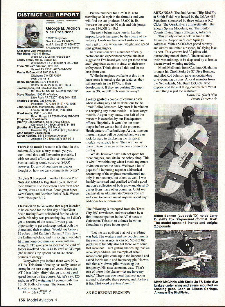 Inside View Headquarters Academy Model Aeronautics 5151 East Memorial Drive Muncie IN 47302 PATH amount model aircraft noise exceeds detection level establishes total separation distance would required between aircraft receiver such aircraft would heard range depends factors affecting sound propagation known spherical spreading atmospheric absorption ground attenuation refraction scattering effect sound propagates frec homogeneous loss-free atmosphere far source called free field sound pressure decreases inversely distance results 6 dB decrease sound pressure level doubling distance associated constant sound power being radiated through expanding wave front applies equally frequencies other factors result what normally called excess attenuation Atmospheric absorption accounts excess loss energy sound field internal modes gas molecules excess losses due viscosity heat conduction heat radiation diffusion Molecular absorption depends oaly frequency sound also temperature relative humidity Below frequencies few hundred Hz molecular coefficients small can neglected Classical absorption accounts remaining losses negligible frequencies below several KHz normally no consequence audible frequencies studies dedicated factors Viscous dissipation due fog rain refraction scattering effects also factors cause propagation sound atmosphere differ ideal field rest Terrain attenuation occurs result absorption scattering sound due obstacles sound path effects pronounced ground transmission sound little consequence air ground transmission slant range angle between source receiver greater 6l00 factors should considered model aircraft can fly along path terrain attenuation high observers will located directly under aircraft principle sources attenuation air-to-ground propagation sound spreading loss atmospheric absorption basic thought applications atmospheric absorption coefficient fundamental frequencies engine/propeller combinations below area 1000 Hz coefficients range quite low increase dramatically point just above figure means what generate what project values able measure translated common figure 6 dB doubling distance makes estimation distances levels fairly simple also can consider slant range effects since generally flying above magical 100 figure terrain absorption neighbors far away fly low altitude may OK regard bet next time CORRECTIONS call few days ago asking about effect altitude sound level readings something usually concern because gets habit working low altitudes fact others may up 5-6000 feet just doesnt pop overall picture Temperature another factor does take look find very great effect either factors unless has need absolutely precise data collection also need consider values well within errors possible operating lower cost meters general use around country figures relate position meter calibrated compensating location meter example using Simpson Model 890-2 Calibrator Simpson Meter find reference calibration 114 dB 1000 Hz quite standard curves equal 1000 Hz precise 230 C 7340 F zero feet altitude perform calibration same temperature 7500 feet altitude would adjust meter 1135 dB says 5 dB difference due air density Temperature similar factor being 05 dB per degree C 230 Both values very small especially majority applications real concern user design work looking precision need correlate figures day another sophisticated equipment careful calibration answer PROFILE Continuing profiles some individuals making concerted efforts meet needs modelers working toward goals quieter aircraft AMA goal getting down below 90 dBA 9 feet look category earliest period Bob Davis Davis Model Products also Davis Diesel Development Box 141 Milford CT 06460 Bob has involved diesel engine development years manufacturing line conversion heads practically engine 020 up contribute quieter operation due inherent characteristics diesel Bob has also worked manufacture development CO2 engines Along way Bob got involved development quieter engine operation led introduction Soundmaster muffler November 1995 143 Howard Crispin Jr Bob L Drew Davis Continued page 147 District Vice President have involved model aviation over 50 years am life member L-29 AMA have District Vice President past ten years During time have numerous District Meetings Model Aviation Days District Fun Flys addition AMA has represented trade shows career days airshows am retired pilot US Air Airlines now have time devote model aviation Considerable time spent traveling around District attending meetings various other events have chairman insurance committee several years vote Council decisions benefit District maintain goals AMA have resident Massachusetts fur 23 years spend full year Massachusetts continued support would very much appreciated Jim MeNeill Birmingham Ala AMA L-2 am running re-election 22nd year AMA Council feel well qualified represent District V Vice President idea representing AMAs Board Directors provide full disclosure AMA current activities plans future pledge no matter popular unpopular revelations may member heart beat AMA dues money provides life organization Whether important famous flyer whether no has ever heard within Academy just important other intention honor acknowledge same distinction regardless notoriety lack threshold purpose AMA provide model aviation airplane service work FCC help get proper radio control frequencies help provide insurance yourself site owner help acquire keep suitable flying sites re-elected will continue visit Fly-Ins Contests Club Meetings like am available person telephone try help problems may arise will continue honor Control Line Free Flight phases Radio Control modeling activities equal dignity Please take time vote Thank special election being held complete term incumbent Peter Waters resigning effective January 1 1996 Donald K Bentfield Im honored run District VII Vice President its privilege nominated Pete Waters love competition skills just dont match up true competition however 