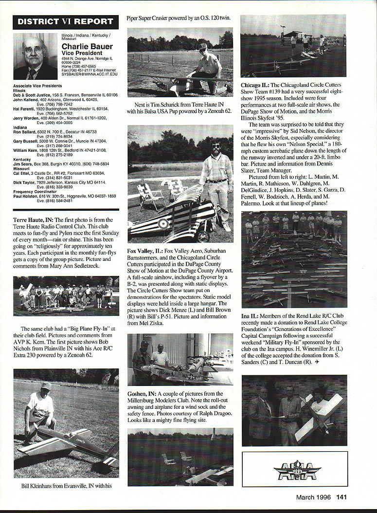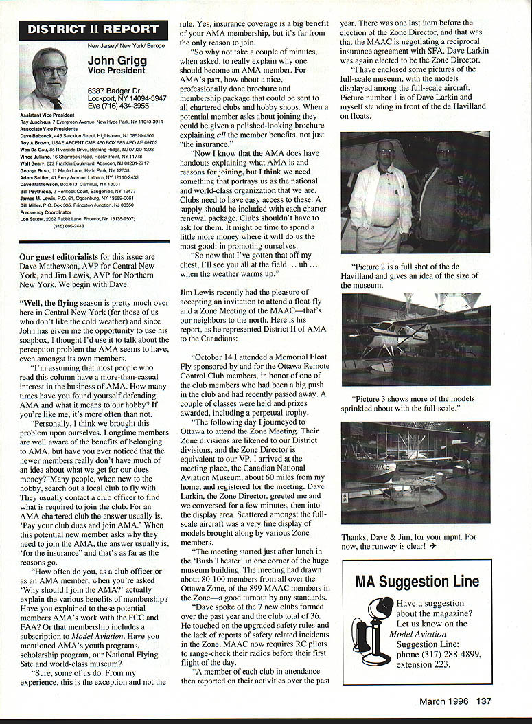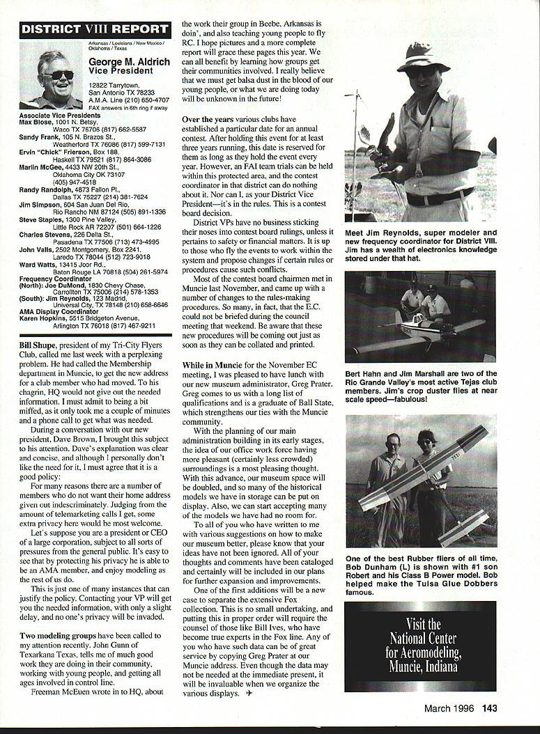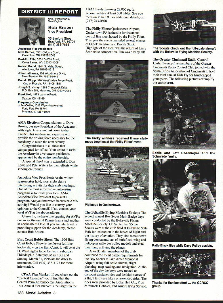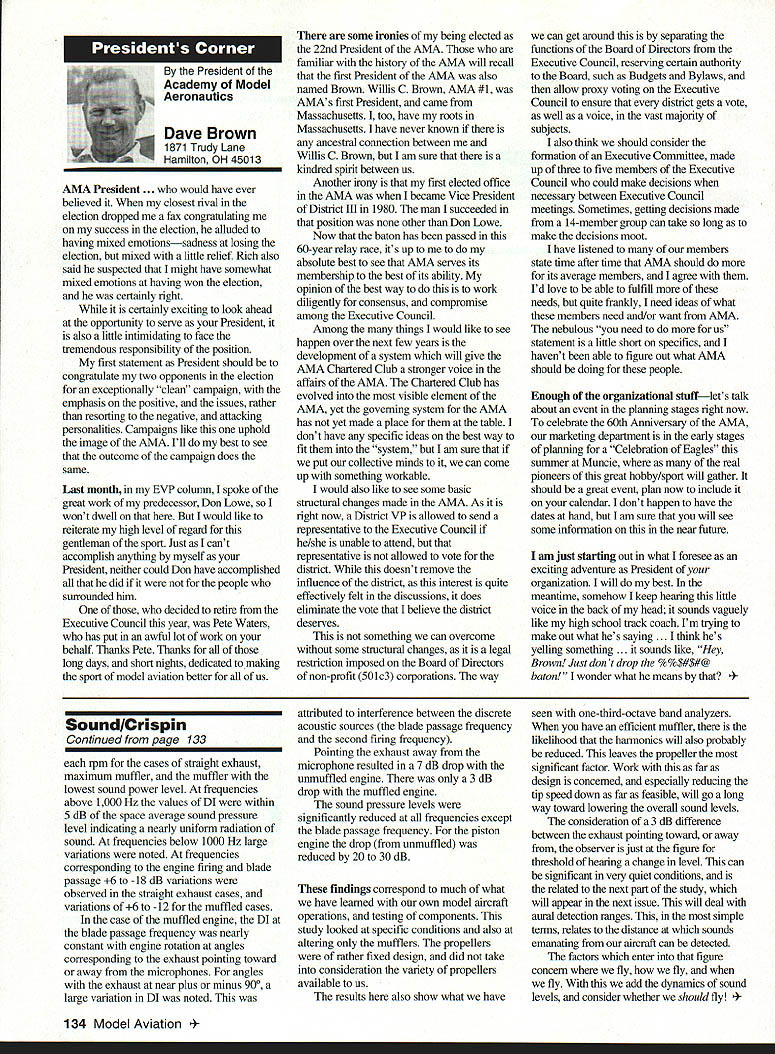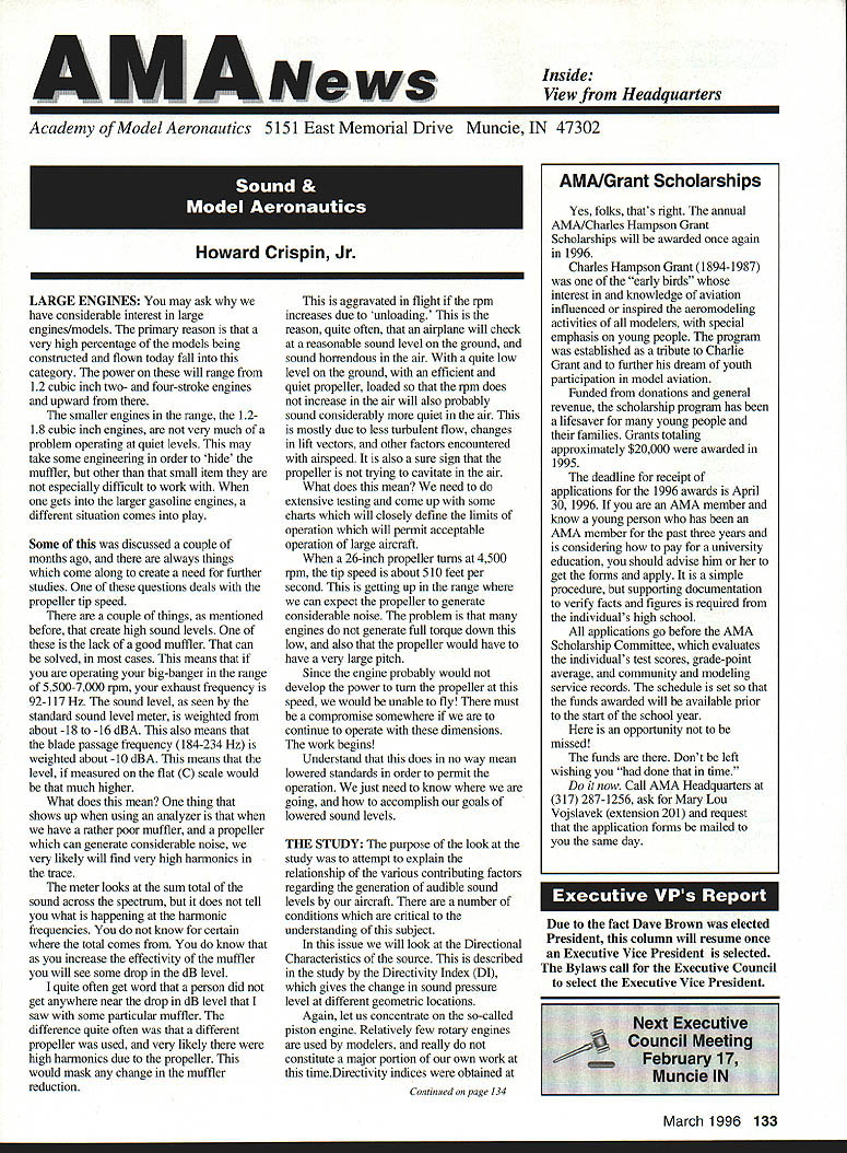 Inside View Headquarters Academy Model Aeronautics 5151 East Memorial Drive Muncie IN 47302 LARGE ENGINES may ask have considerable interest large engines/models primary reason very high percentage models being constructed flown today fall category power will range 12 cubic inch two- four-stroke engines upward smaller engines range 1218 cubic inch engines very much problem operating quiet levels may take some engineering order hide muffler other small item especially difficult work gets larger gasoline engines different situation comes play Some discussed couple months ago always things come along create need further studies questions deals propeller tip speed couple things mentioned before create high sound levels lack good muffler can solved cases means operating big-banger range 5500-7000 rpm exhaust frequency 92-117 Hz sound level seen standard sound level meter weighted about -18 -16 dBA also means blade passage frequency 184-234 Hz weighted about -10 dBA means level measured flat C scale would much higher What does mean thing shows up using analyzer have rather poor muffler propeller can generate considerable noise very likely will find very high harmonics trace meter looks sum total sound across spectrum does tell what happening harmonic frequencies know certain total comes know increase effectivity muffler will see some drop dB level quite often get word person did get anywhere near drop dB level saw some particular muffler difference quite often different propeller used very likely high harmonics due propeller would mask change muffler reduction aggravated flight rpm increases due unloading reason quite often airplane will check reasonable sound level ground sound horrendous air quite low level ground efficient quiet propeller loaded rpm does increase air will also probably sound considerably quiet alr mostly due less turbulent flow changes lift vectors other factors encountered airspeed also sure sign propeller trying cavitate air What does mean need extensive testing come up some charts will closely define limits operation will permit acceptable operation large aircraft 26-inch propeller turns 4500 rpm tip speed about 510 feet per second getting up range can expect propeller generate considerable noise problem engines generate full torque down low also propeller would have have very large pitch Since engine probably would develop power turn propeller speed would unable fly must compromise somewhere continue operate dimensions work begins Understand does no way mean lowered standards order permit operation just need know going accomplish goals lowered sound levels TIlE STUDY purpose look study attempt explain relationship various contributing factors regarding generation audible sound levels aircraft number conditions critical understanding subject issue will look Directional Characteristics source described study Directivity Index DI gives change sound pressure level different geometric locations Again let us concentrate so-called piston engine Relatively few rotary engines used modelers really constitute major portion own work timeDirectivity indices obtained Continued page 134 -91411 g LL-UA u i sisi Due fact Dave Brown elected President column will resume once Executive Vice President selected Bylaws call Executive Council select Executive Vice President March 1996 133 Howard Crispin Jr AMA/Grant Scholarships Yes folks thats right annual AMA/Charles Hampson Grant Scholarships will awarded once agaln 1996 Charles Hampson Grant 1894-1987 early birds interest knowledge aviation influenced inspired aeromodeling activities modelers special emphasis young people program established tribute Charlie Grant further dream youth participation model aviation Funded donations general revenue scholarship program has lifesaver young people families Grants totaling approximately $20000 awarded 1995 deadline receipt applications 1996 awards April 30 1996 AMA member know young person has AMA member past three years considering pay university education should advise him get forms apply simple procedure supporting documentation verify facts figures required individuals high school applications go before AMA Scholarship Committee evaluates individuals test scores grade-point average community modeling service records schedule set funds awarded will available prior start school year opportunity missed funds Dont left wishing done time now Call AMA Headquarters 317 287-1256 ask Mary Lou Vojslavek extension 201 request application forms mailed same day AMA President would have ever believed closest rival election dropped fax congratulating success election alluded having mixed emotionssadness losing election mixed little relief Rich also said suspected might have somewhat mixed emotions having won election certainly right certainly exciting look ahead opportunity serve President also little intimidating face tremendous responsibility position first statement President should congratulate two opponents election exceptionally clean campaign emphasis positive issues rather resorting negative attacking personalities Campaigns like uphold image AMA Ill best see outcome campaign does same Last month EVP column spoke great work predecessor Don Lowe wont dwell would like reiterate high level regard gentleman sport Just cant accomplish anything myself President neither could Don have accomplished did people surrounded him decided retire Executive Council year Pete Waters has put awful lot work behalf Thanks Pete Thanks long days short nights dedicated making sport model aviation better us some ironies being elected 22nd President AMA familiar histoiy AMA will recall first President AMA also named Brown Willis C Brown AIVIA #1 AMAs first President came Massachusetts too have roots Massachusetts have never known ancestral connection between Willis C Brown am sure kindred spirit between us Another irony first elected office AMA became Vice President District III 1980 man succeeded position other Don Lowe Now b