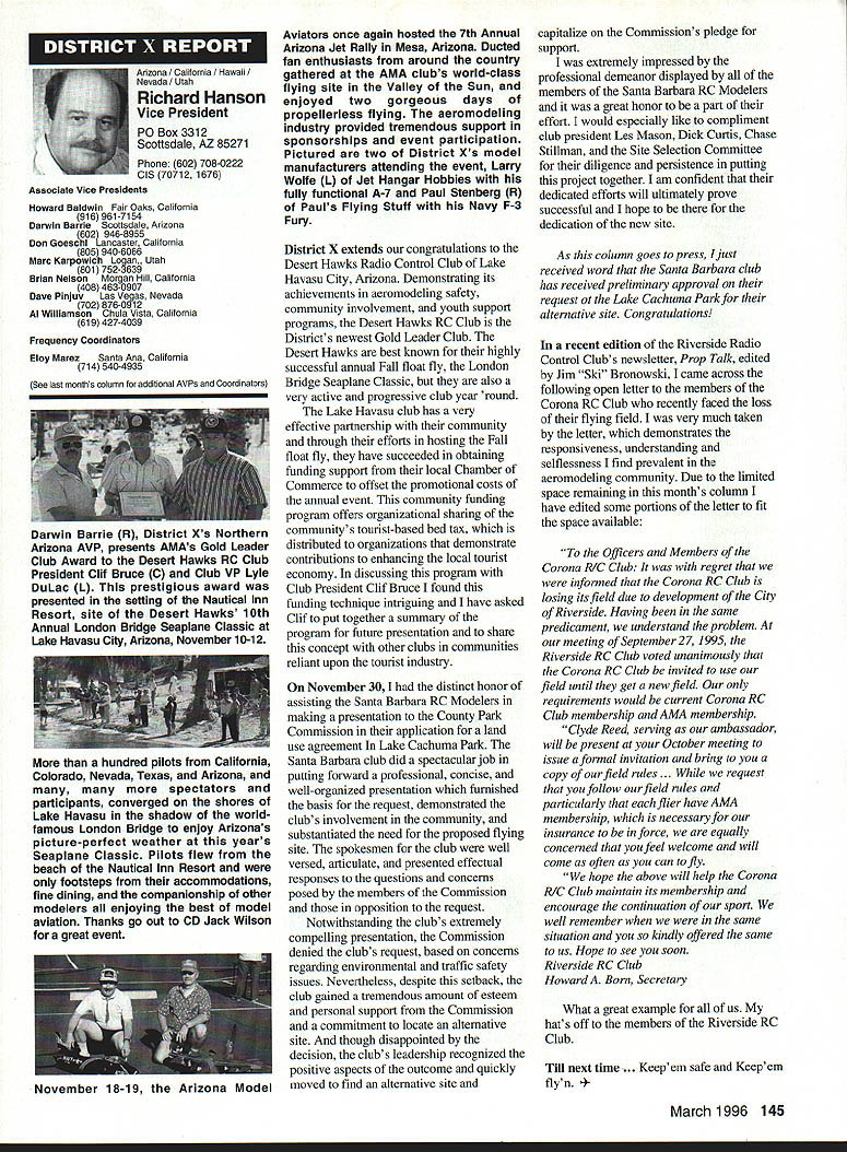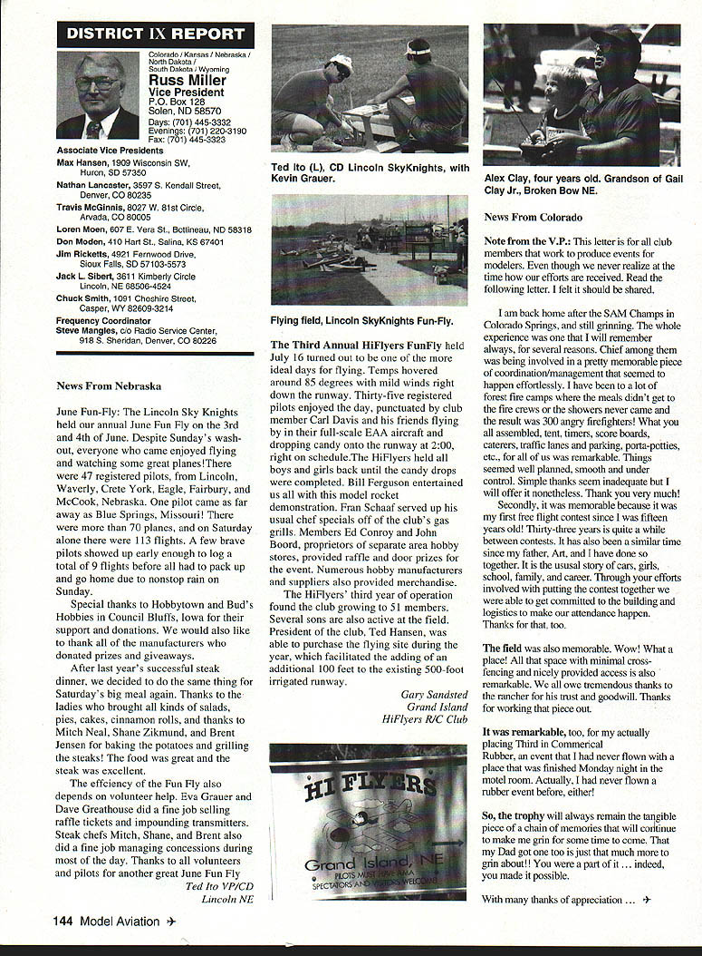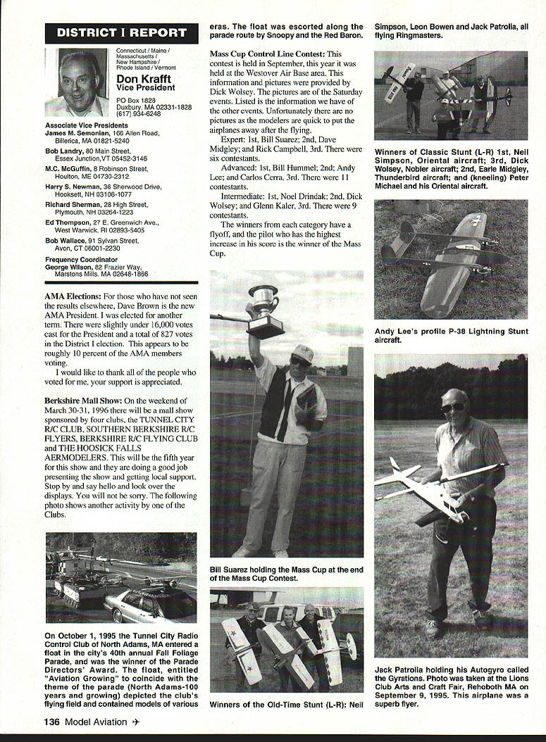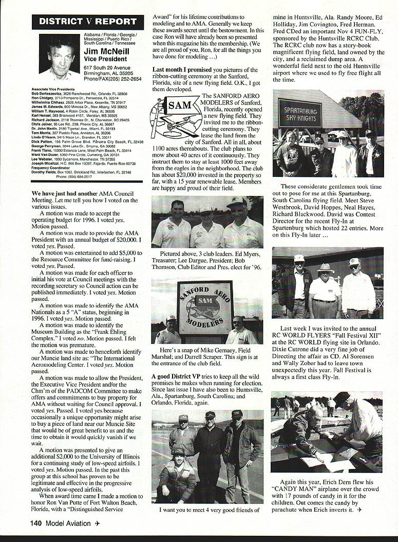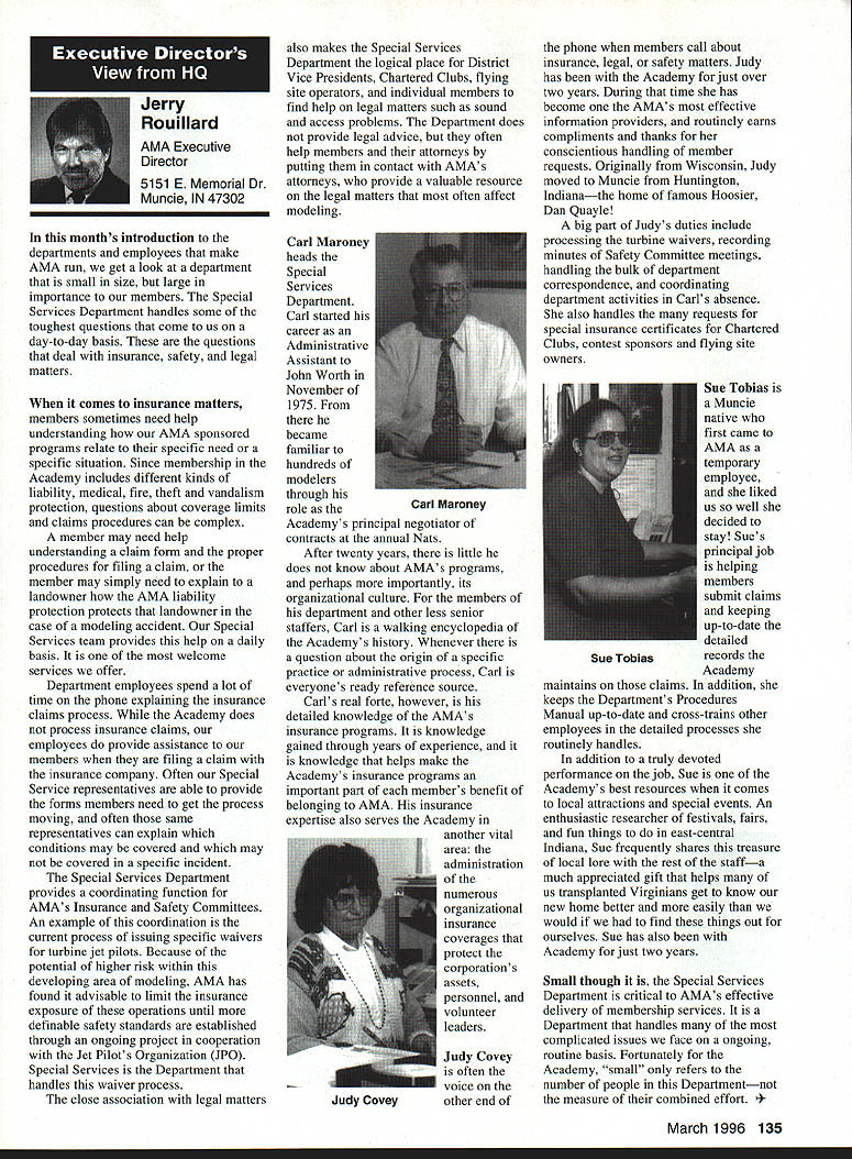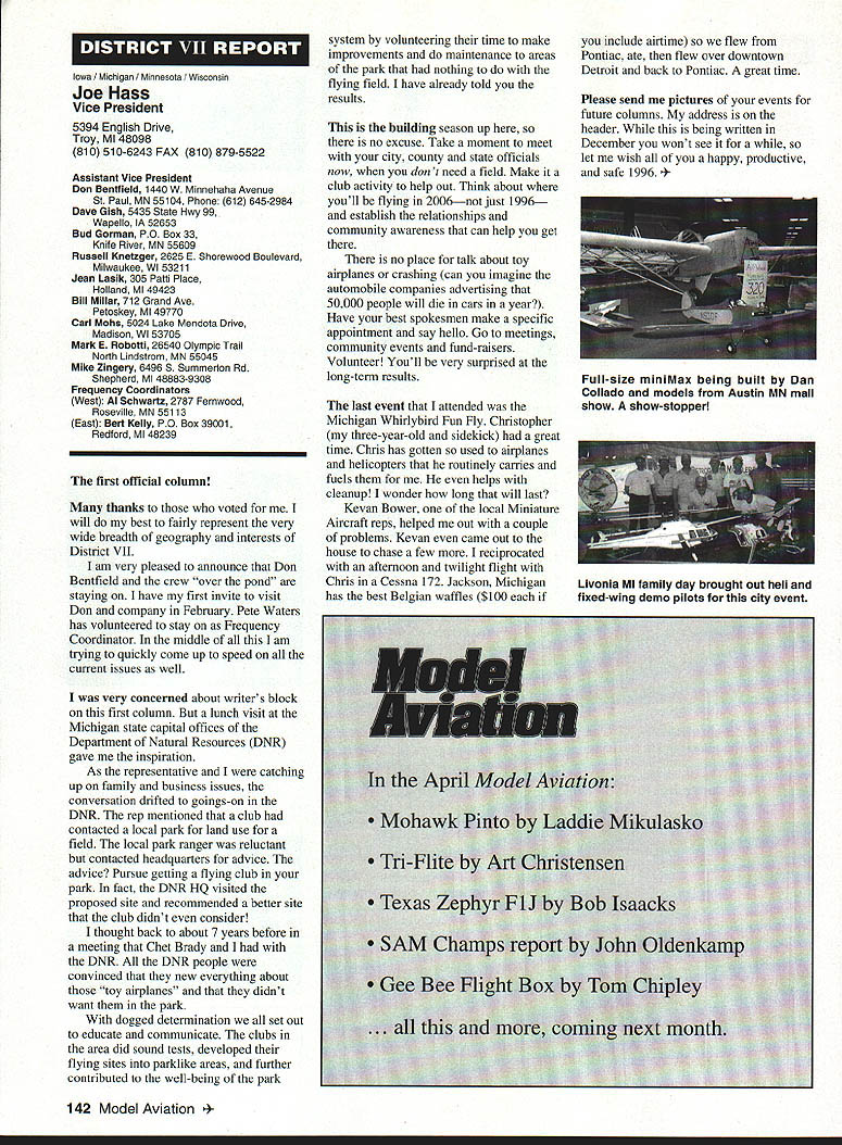 Inside View Headquarters Academy Model Aeronautics 5151 East Memorial Drive Muncie IN 47302 LARGE ENGINES may ask have considerable interest large engines/models primary reason very high percentage models being constructed flown today fall category power will range 12 cubic inch two- four-stroke engines upward smaller engines range 1218 cubic inch engines very much problem operating quiet levels may take some engineering order hide muffler other small item especially difficult work gets larger gasoline engines different situation comes play Some discussed couple months ago always things come along create need further studies questions deals propeller tip speed couple things mentioned before create high sound levels lack good muffler can solved cases means operating big-banger range 5500-7000 rpm exhaust frequency 92-117 Hz sound level seen standard sound level meter weighted about -18 -16 dBA also means blade passage frequency 184-234 Hz weighted about -10 dBA means level measured flat C scale would much higher What does mean thing shows up using analyzer have rather poor muffler propeller can generate considerable noise very likely will find very high harmonics trace meter looks sum total sound across spectrum does tell what happening harmonic frequencies know certain total comes know increase effectivity muffler will see some drop dB level quite often get word person did get anywhere near drop dB level saw some particular muffler difference quite often different propeller used very likely high harmonics due propeller would mask change muffler reduction aggravated flight rpm increases due unloading reason quite often airplane will check reasonable sound level ground sound horrendous air quite low level ground efficient quiet propeller loaded rpm does increase air will also probably sound considerably quiet alr mostly due less turbulent flow changes lift vectors other factors encountered airspeed also sure sign propeller trying cavitate air What does mean need extensive testing come up some charts will closely define limits operation will permit acceptable operation large aircraft 26-inch propeller turns 4500 rpm tip speed about 510 feet per second getting up range can expect propeller generate considerable noise problem engines generate full torque down low also propeller would have have very large pitch Since engine probably would develop power turn propeller speed would unable fly must compromise somewhere continue operate dimensions work begins Understand does no way mean lowered standards order permit operation just need know going accomplish goals lowered sound levels TIlE STUDY purpose look study attempt explain relationship various contributing factors regarding generation audible sound levels aircraft number conditions critical understanding subject issue will look Directional Characteristics source described study Directivity Index DI gives change sound pressure level different geometric locations Again let us concentrate so-called piston engine Relatively few rotary engines used modelers really constitute major portion own work timeDirectivity indices obtained Continued page 134 -91411 g LL-UA u i sisi Due fact Dave Brown elected President column will resume once Executive Vice President selected Bylaws call Executive Council select Executive Vice President March 1996 133 Howard Crispin Jr AMA/Grant Scholarships Yes folks thats right annual AMA/Charles Hampson Grant Scholarships will awarded once agaln 1996 Charles Hampson Grant 1894-1987 early birds interest knowledge aviation influenced inspired aeromodeling activities modelers special emphasis young people program established tribute Charlie Grant further dream youth participation model aviation Funded donations general revenue scholarship program has lifesaver young people families Grants totaling approximately $20000 awarded 1995 deadline receipt applications 1996 awards April 30 1996 AMA member know young person has AMA member past three years considering pay university education should advise him get forms apply simple procedure supporting documentation verify facts figures required individuals high school applications go before AMA Scholarship Committee evaluates individuals test scores grade-point average community modeling service records schedule set funds awarded will available prior start school year opportunity missed funds Dont left wishing done time now Call AMA Headquarters 317 287-1256 ask Mary Lou Vojslavek extension 201 request application forms mailed same day AMA President would have ever believed closest rival election dropped fax congratulating success election alluded having mixed emotionssadness losing election mixed little relief Rich also said suspected might have somewhat mixed emotions having won election certainly right certainly exciting look ahead opportunity serve President also little intimidating face tremendous responsibility position first statement President should congratulate two opponents election exceptionally clean campaign emphasis positive issues rather resorting negative attacking personalities Campaigns like uphold image AMA Ill best see outcome campaign does same Last month EVP column spoke great work predecessor Don Lowe wont dwell would like reiterate high level regard gentleman sport Just cant accomplish anything myself President neither could Don have accomplished did people surrounded him decided retire Executive Council year Pete Waters has put awful lot work behalf Thanks Pete Thanks long days short nights dedicated making sport model aviation better us some ironies being elected 22nd President AMA familiar histoiy AMA will recall first President AMA also named Brown Willis C Brown AIVIA #1 AMAs first President came Massachusetts too have roots Massachusetts have never known ancestral connection between Willis C Brown am sure kindred spirit between us Another irony first elected office AMA became Vice President District III 1980 man succeeded position other Don Lowe Now b