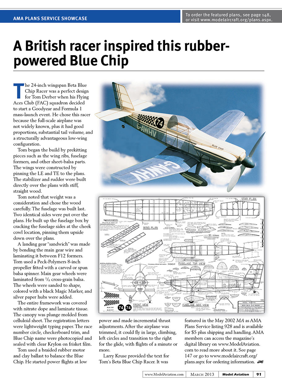 Larry Kruse provided the text for Tom’s Beta Blue Chip Racer. It was featured in the May 2002 MA as AMA Plans Service listing 928 and is available for $5 plus shipping and handling. AMA members can access the magazine’s digital library on the AMA’s website to read more about it. See page ___ or go to www.modelaircraft.org/plans.aspx for ordering information.