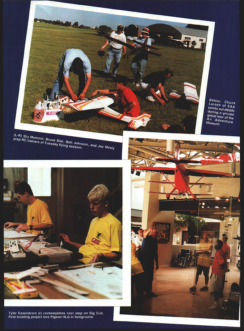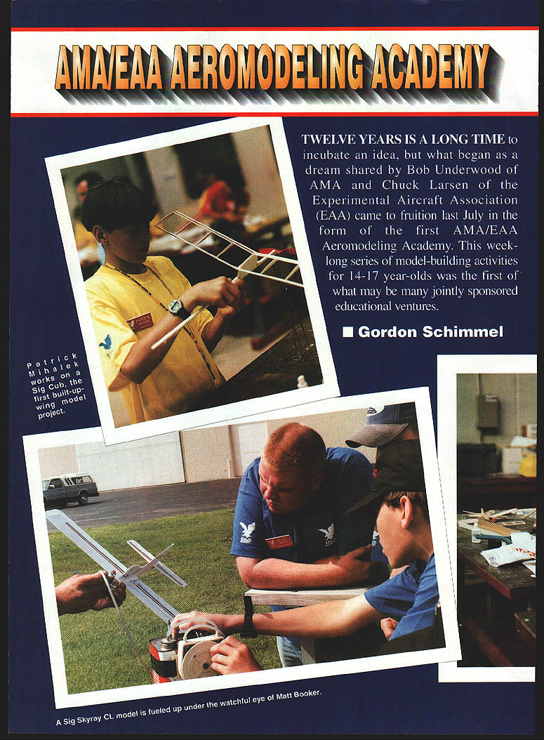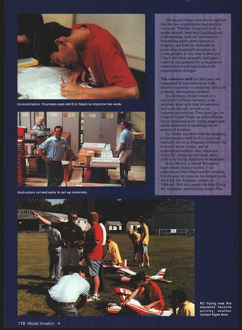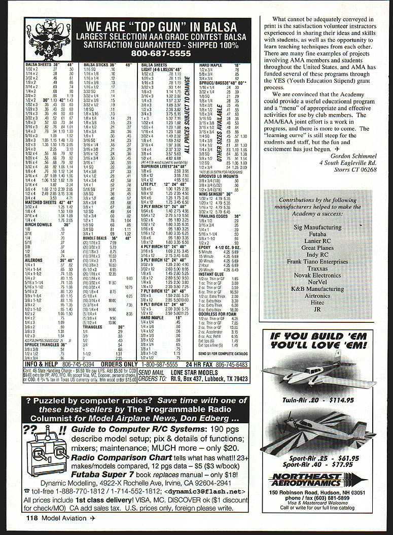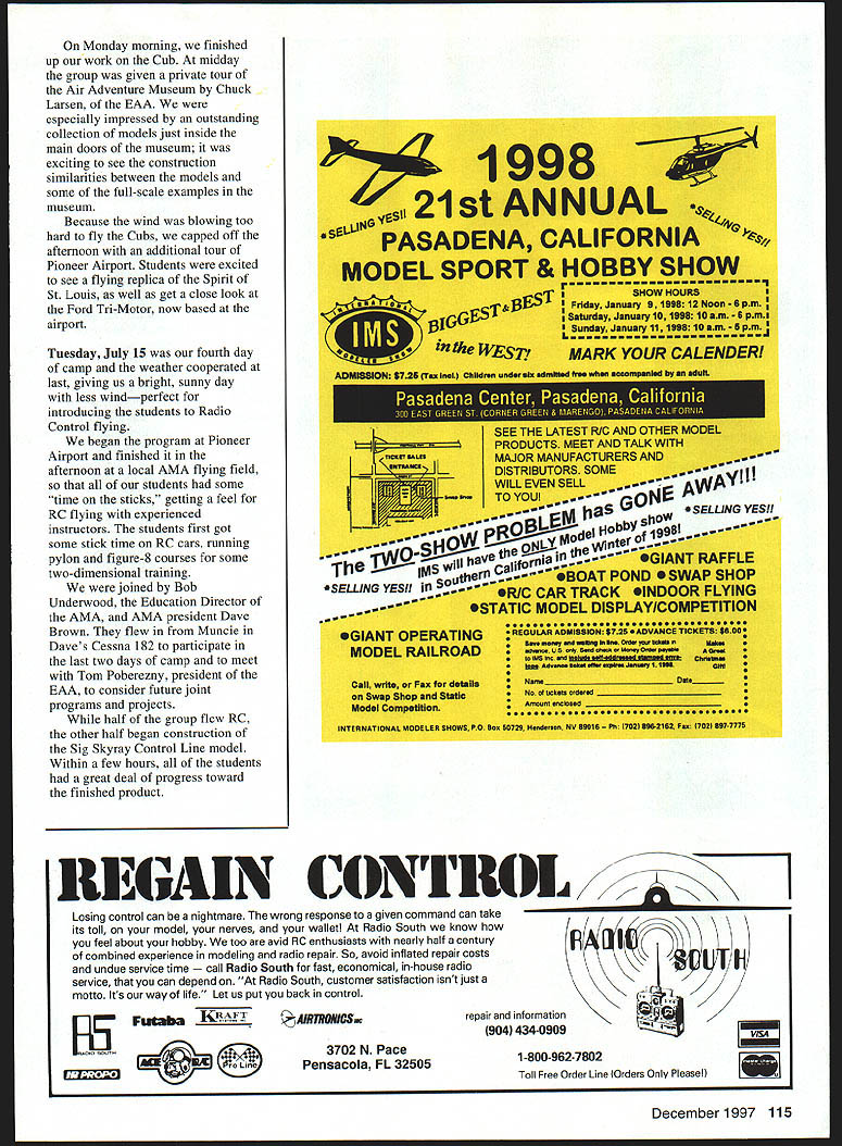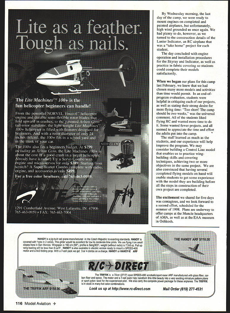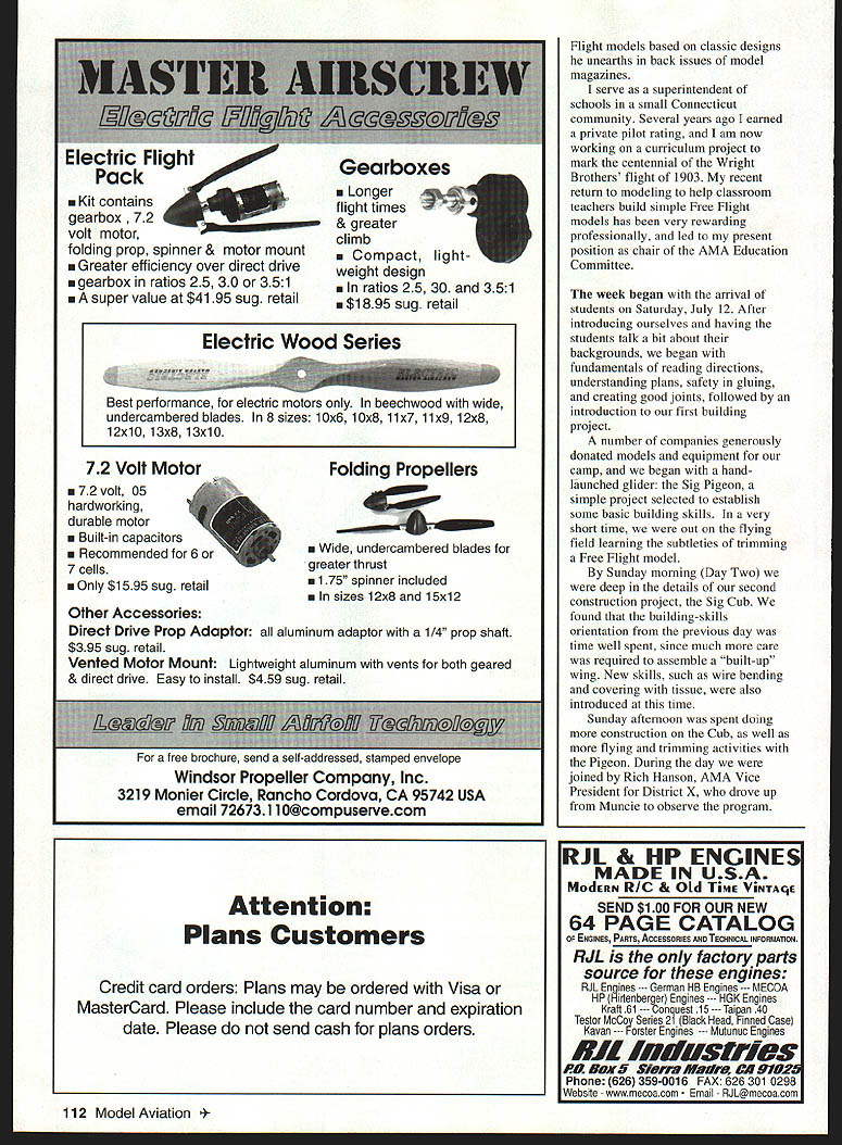 NO OCR TEXT NO OCR TEXT NO OCR TEXT 72 Volt Motor 72 volt 05 hardworking durable motor Built-in capacitors Recommended 6 7 cells mOnly $1595 sug retail Folding Propellers Wide undercambered blades greater thrust 175 spinner included sizes 12x8 15x12 Other Accessories Direct Drive Prop Adaptor aluminum adaptor 1/4 prop shaft $395 sug retail Vented Motor Mount Lightweight aluminum vents both geared & direct drive Easy install $459 sug retail Flight models based classic designs unearths back issues model magazines serve superintendent schools small Connecticut community Several years ago earned private pilot rating am now working curriculum project mark centennial Wright Brothers flight 1903 recent return modeling help classroom teachers build simple Free Flight models has very rewarding professionally led present position chair AMA Education Committee week began arrival students Saturday July 12 After introducing ourselves having students talk bit about backgrounds began fundamentals reading directions understanding plans safety gluing creating good joints followed introduction first building project number companies generously donated models equipment camp began handlaunched glider Sig Pigeon simple project selected establish some basic building skills very short time out flying field learning subtleties trimming Free Flight model Sunday morning Day Two deep details second construction project Sig Cub found building-skills orientation previous day time well spent since much care required assemble built-up wing New skills such wire bending covering tissue also introduced time Sunday afternoon spent doing construction Cub well flying trimming activities Pigeon During day joined Rich Hanson AMA Vice President District X drove up Muncie observe program 112 Model Aviation er Kit containsflight times gearbox 72______& greater volt motorclimb folding prop spinner & motor mount Compact light Greater efficiency over directdriveweight design gearbox ratios 25 30 351 ratios 25 30 351 mA super value $4195 sugretailm $1895 sug retail Electric Wood Series Best performance electric motors beechwood wide undercambered blades 8 sizes 10x6 10x8 11x7 11x9 12x8 12x10 13x8 13x10 I-or tree orocnure sena seir-aaaressea stampea enveiope Windsor Propeller Company Inc 3219 Monier Circle Rancho Cordova CA 95742 USA email 7267311 O@compuservecom Attention Plans Customers Credit card orders Plans may ordered Visa MasterCard Please include card number expiration date Please send cash plans orders Ru & HP ENGINES MADE IN USA MOdERN RIC & Old TiME ViNTAqE SEND $100 FOR OUR NEW 64 PAGE CATALOG OF ENGINES PARTS ACCESSORIES AND TECHNICAL INFORMATION RJL factory parts source engines RJL Engines German HB Engines MECCA HP Hirlenberger Engines . HGK Engines Krafl 61 --- ConueSl 15 ---Taipan 40 Teslor MCCOy Series 2 BlaCk Head Finned Case Kavan Forster Engines Mutunuc Engines SR IrnItistrios 11 5ax5 SluM AYaIlra Cl 1D2 Phone 626 359-0016 FAX 626 301 0298 Websile wwwmeoOaCOm Email mecoacom Monday morning finished up work Cub midday group given private tour Air Adventure Museum Chuck Larsen EAA especially impressed outstanding collection models just inside main doors museum exciting see construction similarities between models some full-scale examples museum Because wind blowing too hard fly Cubs capped off afternoon additional tour Pioneer Airport Students excited see flying replica Spirit St Louis well get close look Ford Tn-Motor now based airport Tuesday July 15 fourth day camp weather cooperated last giving us bright sunny day less windperfect introducing students Radio Control flying began program Pioneer Airport finished afternoon local AMA flying field students some time sticks getting feel RC flying experienced instructors students first got some stick time RC cars running pylon figure-8 courses some two-dimensional training joined Bob Underwood Education Director AMA AMA president Dave Brown flew Muncie Daves Cessna 182 participate last two days camp meet Tom Poberezny president BAA consider future joint programs projects half group flew RC other half began construction Sig Skyray Control Line model Within few hours students great deal progress toward finished product LLGANNUAL 1998 PASADENA CALIFORNIA MODEL SPORT & HOBBY SHOW SHOWNO January 512 NO.t pm] Saturday#a*L 4 PJWJ Sunday Lrnae MARK YOUR CALEAIDERI SEE THE LATEST MJ ANLJ U II PRODUCTS MEET AND TALK MAJOR MANUFACTURERS AND LDgSTRIBUTORS SOME,. WILLEVENSELLA uJE$ ELLING YES! hay0e SELLING YES!Model Habbs 5t--GIANT RAFFLE II uth0~aa eBOAT POND @SWAP SKOP CAR TRACK ItIDOOR FLYING - --OSTATIC MODEL DISPLAYICOMPETITION 0000 oooo 0000 00 ow 0000 0 00*4 04 0040 REGULAR AOUISUIOW $725 oADVAMCRTWKSS 40 BewuuWy u0 h ho O0SamS AWWAIS U* S4iuohUIhinYPAio4 bOOS 4 4ia ~ir No 4ttUs *ed ___________________ AIIOfl0000040* SO 4040040 0.. INTERNATIO#4AL UCOELER SNOWS PO leo 50726 No0mg, NV 66016 Ph 1UUS62162 w 70ZI 3677771 OGIANT OPERATING MODEL RAILROAD Call writs Paz tsr detail Swap Siop Static modal Cmnpltlon REGAIN CONTROL Losing control can nightmare wrong response given command can take its toll model nerves wallet Radio South know feel about hobby too avid RC enthusiasts nearly half century combined experience modeling radio repair So avoid inflated repair costs undue service time Radio South fast economical in-house radio service can depend Radio South customer satisfaction isnt just motto Its way life Let us put back control I15 Futaba ne jAIRThONICSm 3702 N Pace Pensacola FL 32505 repair information 904 434-0909 1-800-962-7802 Toll Free Order Line lOrders Only Pleasel December1997 115 Wednesday morning last day camp ready mount engines completed painted airplanes unfortunately high wind grounded us once again plenty however turned construction details Lanier Indicator RC airplane take home project student day concluded engine operation installation procedures Skyray Indicator well practice fabric covering students could complete models satisfactorily began plans camp la