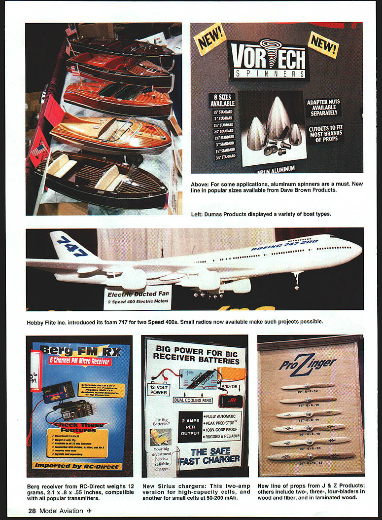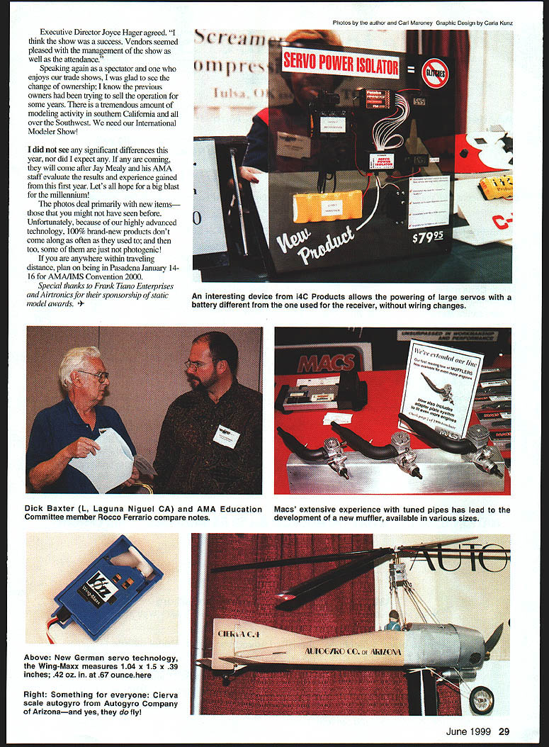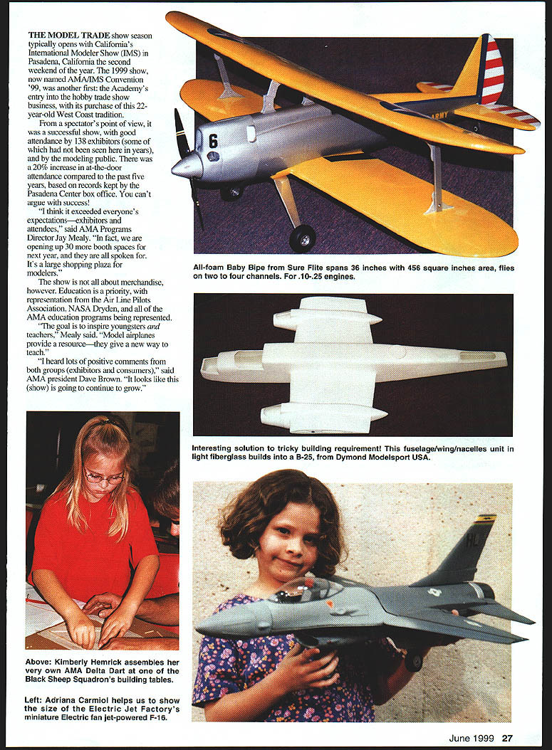 Hobby Shacks Electric all-foam B-2 intended uninitiated Weighs less five ounces should practically indestructible 26 Model Aviation ODEL AERONAUTIC Dave Brown ALPA reps Chip Mull Dave Hall RCHTA president Ralph Warner AMAIRCHTA donation Aviation Field Day THE MODEL TRADE show season typically opens Californias International Modeler Show IMS Pasadena California second weekend year 1999 show now named AMA/IN/IS Convention 99 another first Academys entry hobby trade show business its purchase 22year-old West Coast tradition spectators point view successful show good attendance 138 exhibitors some seen years modeling public 20% increase at-the-door attendance compared past five years based records kept Pasadena Center box office cant argue success think exceeded everyones expectationsexhibitors attendees said AMA Programs Director Jay Mealy fact opening up 30 booth spaces next year spoken Its large shopping plaza modelers show about merchandise however Education priority representation Air Line Pilots Association NASA Dryden AMA education programs being represented goal inspire youngsters teachers Mealy said Model airplanes provide resourcethey give new way teach heard lots positive comments both groups exhibitors consumers said AMA president Dave Brown looks like show going continue grow Left Adriana Carmiol helps us show size Electric Jet Factorys miniature Electric fan jet-powered F-16 June1999 27 All-foam Baby Bipe Sure Flite spans 36 inches 456 square inches area flies two four channels 1O-25 engines Interesting solution tricky building requirement fuselagelwinglnacelles unit light fiberglass builds B-25 Dymond Modelsport USA Above Kimberly Hemrick assembles very own AMA Delta Dart Black Sheep Squadrons building tables / - Fan 2 Speed 400 Electric MOtOrS Hobby Flite Inc introduced its foam 747 two Speed 400s Small radios now available make such projects possible Berg receiver RC-Direct weighs 12 New Sirius chargers two-amp New line props J & Z Products grams 21 x 8 x 55 inches compatible version high-capacity cells others include two- three- four-bladers popular transmitters another small cells 50-200 mAh wood fiber laminated wood 28 Model Aviation e For some applications aluminum spinners must New line popular sizes available Dave Brown Products Leff Dumas Products displayed variety boat types S S S S SSSSS 5555 S U BIG POWER BIG RECEIVER BATTERI II Executive Director Joyce Hager agreed think show success Vendors seemed pleased management show well attendance Speaking again spectator enjoys trade shows glad see change ownership know previous owners trying sell operation some years tremendous amount modeling activity southern California over Southwest need International Modeler Show did see significant differences year nor did expect coming will come after Jay Mealy AIVIA staff evaluate results experience gained first year Lets hope big blast millennium photos deal primarily new items might have seen before Unfortunately because highly advanced technology 100% brand-new products dont come along often used too some just photogenic anywhere within traveling distance plan being Pasadena January 1416 AMA/IMS Convention 2000 Special thanks Frank Tiano Enterprises Airtronics sponsorship static model awards t Something everyone Cierva scale autogyro Autogyro Company Arizonaand yes fly Photos author Carl Maroney Graphic Design Carla Kunz June1999 29 An interesting device i4C Products allows powering large servos battery different used receiver wiring changes Dick Baxter L Laguna Niguel CA AMA Education Committee member Rocco Ferrario compare notes Macs extensive experience tuned pipes has lead development new muffler available various sizes Above New German servo technology Wing-Maxx measures 104 x 15 x 39 inches 42 oz 67 ouncehere