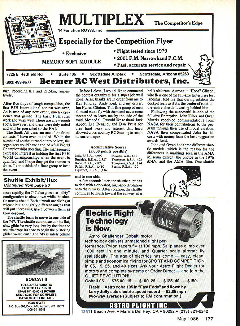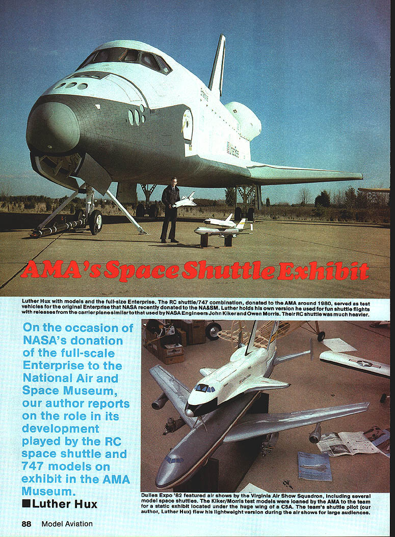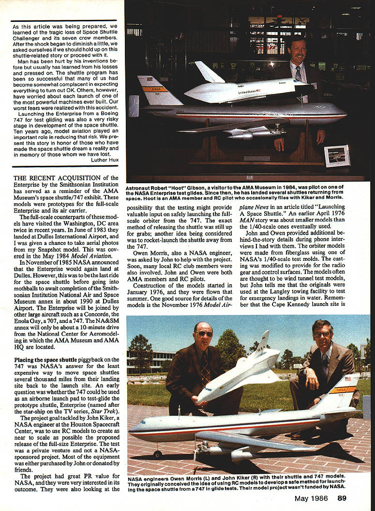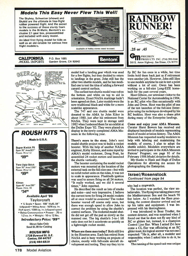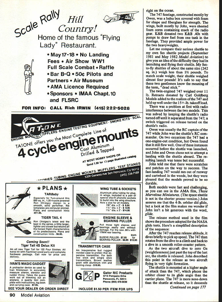 Luther l1UA Wrin mguUIU UNU lAD TUII-SIZO enTerprIse Tfl tle/747 combination donated AMA around 1980 served test vehicles forth original Enterprise NASA recently donated NA&SM Luther holds own version used forfun shuttle flights releases carrier plane simliartothat used NASA EngineersJohn Kikerand Owen Morris RC shuffle much heavier 3fl th casion NASA cratior t th Natioa Ai pac Muse rn ho epos ro n kprnent played b RC space uttIe 747 ~s r tv ELuther Hux 88 Model Aviation CI U tFC iiiThe Kikurorris te~ mugs. moanna Dy TAD AMA TO ream fo otatic 5AruIuIl uated under die huge wing C5A teams shuttle pliot author Luther Hux flew lightweight version during air shows large audiences As article being prepared learned tragic loss Space Shuttle Challenger its seven crew members After shock began diminish little asked ourselves should hold up shuttle-related story proceed Man has hurt inventions fore usually has learned losses pressed shuttle program has successful us become somewhat complacent expecting everything turn out OK Others however have worried about launch powerful machines ever built worst fears realized accident Launching Enterprise Boeing 747 test gliding also very risky stage development space shuttle Ten years ago model aviation played important role reducing risk pre sent story honor have made space shuttle dream reality memory have lost Luther Hux THE RECENT ACQUISITION Enterprise Smithsonian Institution has served reminder AMA Museums space shuttle/747 exhibit models prototypes full-scale Enterprise its air carrier full-scale counterparts mod els have visited Washington DC area twice recent years June 1983 landed Dulles International Airport given chance take aerial photos Snapshot model cov ered May 1984 Model Aviation November 1985 NASA announced Enterprise would again land Dulles However last ride space shuttle before going mothballs await completion Smith sonian Institution National Air Space Museum annex about 1990 Dulles Airport Enterprise will joined other large aircraft such Concorde EnolaGay a707 anda747 TheNA&SM annex will about 10-minute drive National Center Aeromodel ing AMA Museum AMA HQ located Placing space shuttle piggyback 747 NASAs answer least expensive way move space shuttles several thousand miles landing site back launch site An early question whether 747 could used airborne launch pad test-glide prototype shuttle Enterprise named after star-ship TV series Star Trek project goal tackled John Kiker NASA engineer Houston Spacecraft Center use RC models create near scale possible proposed release full-size Enterprise test private venture NASAsponsored project Most equipment either purchased John donated friends project great PR value NASA very interested its outcome also lcoking possibility testing might provide valuable input safely launching fullscale orbiter 747 exact method releasing shuttle still up grabs another idea being considered rocket-launch shuttle away 747 Owen Morris also NASA engineer asked John help project Scon local RC club members also involved John Owen both AMA members RC pilots Construction models started January 1976 flown summer good source details models November 1976 Model Airplane News article titled Launching Space Shuttle An earlier April 1976 MAN story about smaller models 1/40-scale ones eventually used John Owen provided additional hind-the-story details during phone inter views orbiter models made fiberglass using NASAs 1/40-scale test molds cast ing modified provide radio gear control surfaces models often thought wind tunnel test models John tells originals used Langley towing facility test emergency landings water Remem ber Cape Kennedy launch site May1986 89 Astronaut Robert Hoot Gibson visitor AMA Museum 1984 pilot NASA Enterprise test glides Since has landed several shuttles returning space Hoot AMA member RC pilot occasionaily flies Kiker Morris IIMOII uruu.uwrS Owen Morris CL Jo 5iUUU unu uu originally conceived Idea using RC models aeveiop safe method Ing space shuttle 747 glide tests model project wasnt funded NASA *PLANS* TARBaby Especially Turn-around YPI 850 sq 1204 cycle powered / Ron Chidgey design smooth solid performer Rib templates computer plotted ans construction hints -$1195 TIGER TAIL 4 Ron Chidgeys latest best series little larger lighter slower retains honest flight characteristics Its predecessors Plans construction hints $995 Coming Soon! Tiger Tail 45 Delux Kit An new Tiger Tail 120 Four Strokes balsa kit machined wood parts complete hardware package Call now price delivery IVANS MAGIC GADGET protractor device used Ivan Kristensen accurately measure aileron elevator rudder throw Takes guess work out trimming Out airplane quality tool com plete instructions log book carrying case -$795 SEE YOUR DEALER OR ORDER DIRECT WING TUBE & SOCKETS Aluminum alloy tubing plugin wings Included pair special slip-fit phenolic sockets build wing structure Now size models 718 dla 2 $ 885 1 diax 2-S 995 1/ dia x3- $1495 ENGINE SLEEVE & BEARING PULLER 0r -- sleeves and tne new 60s iearing Both - 0ULLER -$795 PULLER $895 $1395 TRANSMITTER CASE An Inexpensive rugged molded case protect ex pensive transmitter both two stick single stick transmitters Brown leather grain aluminum trim locking clasp -$1895 P Gator RIC Products 3713 Pompano Drive Pensacola FL 32514 Phone 904 478-8839 INCLUDE S150 PER ITEM FOR UPS 90 Model Aviation right ocean 747 fuselage constructed mostly Owen balsa box covered foam shape fiberglass strength wings built mostly John sheeted foam cores containing much radio gear K&R donated two K&B 40s pumps draw fuel tank fuselage provided ample power two heavyweights Let compare serious shuttle own fun shuffle projects September 1981 May 1982 Model Aviation give idea difficulty launching flying shuttle funto-fly shuttles about same size 242 sq weigh less 1 pounds match scale weight shuttle weighed almost four pounds Its safe say two gentlemen know meaning term dead stick twin-engined 747 weighed over 11 lb Ret