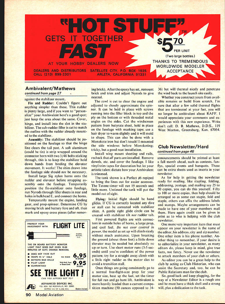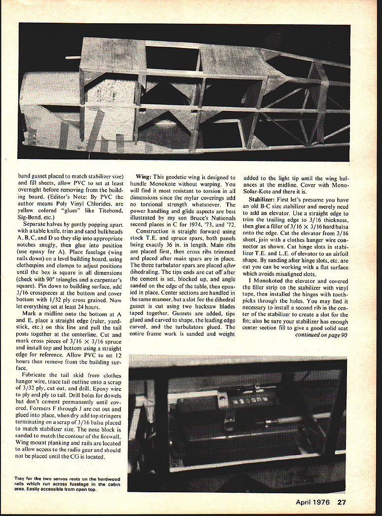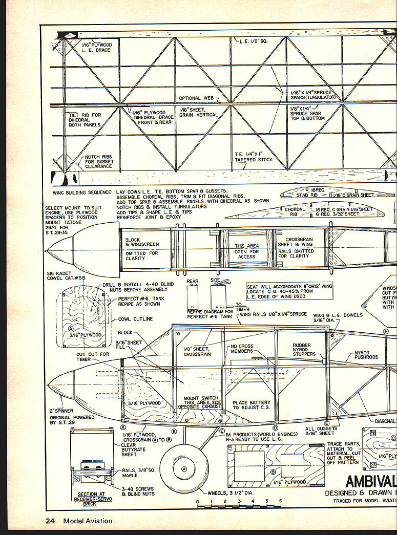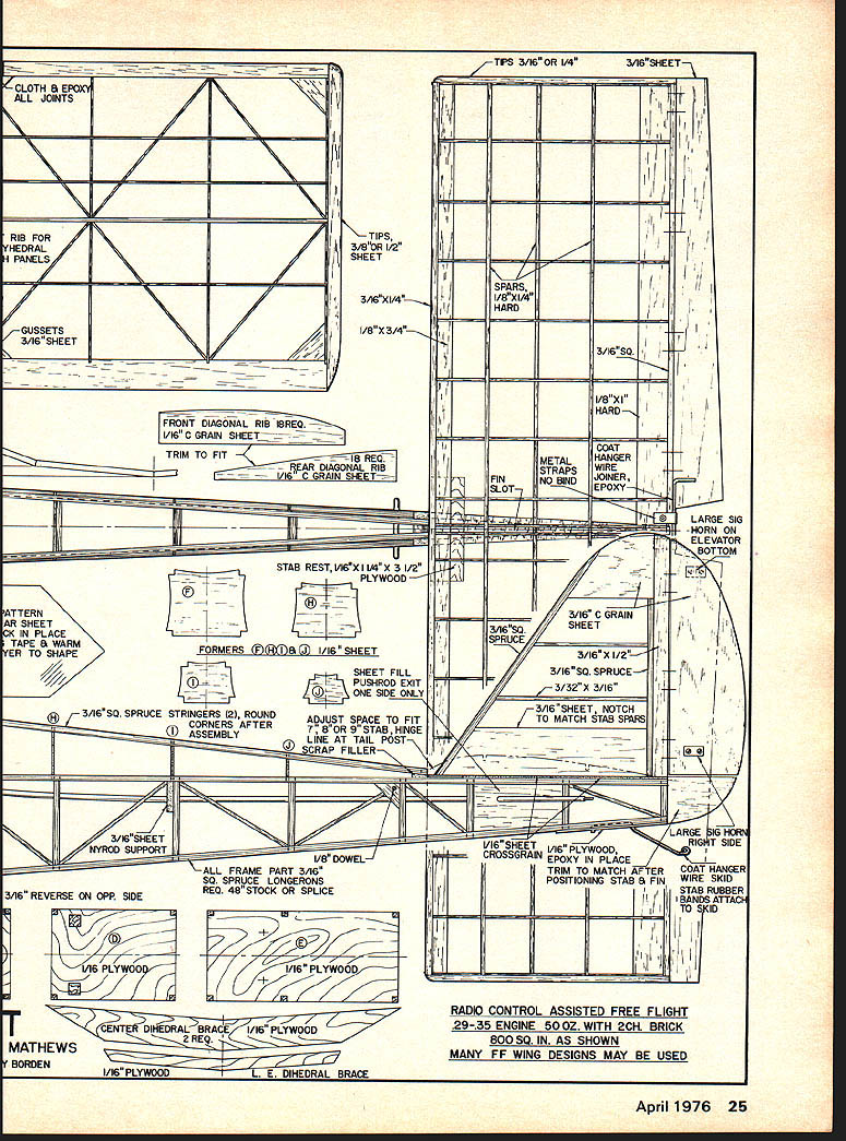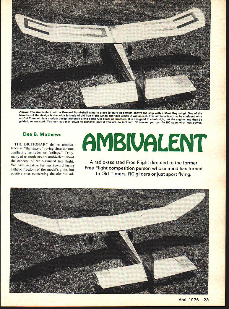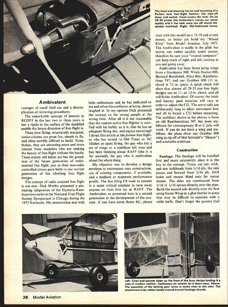 Dee B Mathews THE DICTIONARY defines ambiva lence state having simultaneous conflicting attitudes feelings Truly us modelers ambivalent about concept radio-assisted free flight have negative feelings toward losing esthetic freedom models glide positive ones concerning obvious adAMBIVALENT radio-assisted Free Flight directed former Free Flight competition person mind has turned Old-Timers RC gliders just sport flying April 1976 23 Above The Ambivalent Buzzard Bombshell wing place picture bottom shows ship Mexi Boy wing beauties design wide latitude old free-flight wings tails will accept airplane confused Old Timerit modern design although along some Old Timer parameters designed climb high cut engine guided assisted can cut down retrieval inclined course can fly RC sport less power 1/16 PLYWOODL EI/2 SQLEBRACE III 1/16 X 1/4 SPRUCE OPTIONAL WEB SPARS TURBULATOR TILT RIB FOR1/16 PLYWOODI/16SHEET DIHEDRALDIHEDRAL BRACEGRAIN VERTICALSPRUCE SPAR TOP & BOTTOM BOTH PANELS FRONT B REAR NOTCH RIBSTE I/4XI FOR GUSSETTAPERED STOCK CLEARANCE -WING BUILDING SEQUENCE LAY DOWN LE TE BOTTOM SPAR B GUSSETS ASSEMBLE CHORDAL RIBS TRIM B FIT DIAGONAL RIBS ADD TOP SPAR 8 ASSEMBLE PANELS WITH DIHEDRAL AS SHOWN SELECT MOUNT TO SUITNOTCH RIBS & INSTALL TURBULATORS ENGINE USE PLYWOODADD TIPS B SHAPE LE B TIPS SPACERS TO POSITIONREINFORCE JOINT & EPOXY MOUNT TATONE 29/4 FOR________ ST 2935mr -___ __I]I ______ __ K11111 COWELDRILL B INSTALL 4-40 BLINDL N_______________ IItI SIG KADET NUTS BEFORE ASSEMBLY -PERFECT#6 TANK AS SHOWN I/ - j COWL OUTLINE -I 3/16 PLYWOOD[0 K CUT OUT FOR TIMER - -----__ ------42 SPINNER ORIGINAL POWERED BY ST 29 SECTION AT RECEIVER-SERVO STAB RIB CHORDAL 16 REQ C GRAIN I/ISEE -RIB -j 6 REQ 3/32SHEET n ----- CROSSGRAINJ BLOCKTHIS AREASHEET B WING B WINDSCREEN -__ CLARITY ACCESSFOR CLARITY OMITTED FOROPEN FORRAILS OMITTED U REA SEAT WILL ACCOMODATE II0R12 WINGWINDS FROMCUT F L E EDGE OF WING USED/BUTYF WITH REPIPE DIAGRAM FOR TIMERWITH PRUCE WING B LG DOWEL 3/16 DIA cT #6 TANK WING RAILS 1/8 X 1/ RUBBER NYROD STOPPERSNYROD PUSHRODS BLOCK 3/16 SHEET NO CROSS FILL/8 SHEETMEMBERS CROSSGRAIN 7 3/16PLYWOODTHIS AREASIDEPLACE BATTERY -PPOSITE EXHAUSTTO ADJUST C G ALL GUSSETS 1/16 PLYWOODIM PRODUCTS WORLD ENGINES 3/16 SHEET CROSSGRAIN TO H-3 READY TO USE L GC TRACE PARTS BUTYRATEATTACH TO K RIAL CUT OUT B PEELV16 PL _____OFF PATTERN RAILS 3/8SQ MAPLE 1/16 PLYWOODAMBIVAL 3-48SCREWS WHEELS 3 I/2DIADESIGNED S DRAWN 02346TRACED FOR MODEL AVIATI 24 Model Aviation CLOTH & E~2 JOINTSI N t1IIII RIBFORTIPS HEDRALIi 3/8OR 1/2 PANELSSHEET GUSSETS 3/16SHEET i -- - -- --- _____TFS 3/16 OR 1/43/16SHEET 1 j11 tiII 3/16XI/4 SPARS HARDKK K I/8X3/4 3/16SQ FRONT DIAGONAL RIB I8REQ 1/16 C GRAIN SHEET~ II TRIM TO FIT 1/16 C GRAIN -18 REQ7JjjFINMETALHANGER IRIB NO BIND JOINER ________@LARGE SIG - ELEVATOR IrL BOTTOM STAB RESTV6X 1A4X 31/2 __PLYWOODb1h/_ ATTERN 4---ii HEET- -- C GRAIN CK IN PLACE--- 3A6SQSHEET ER TO SHAPESPRUCE ___ [ TAPE & WARM MERS ia cZi 1/16 SHEET 3/16X 1/2 /IIIi SHEET FILL 3/16SQ SPRUCE ONE SIDE ONLY' X 3/16 /@---ff-ii-\ PUSHROD EXIT 3/16 SHEET NOTCH 3/16SQ SPRUCE STRINGERS 2 ROUNDADJUST SPACE TO FITTO MATCH STAB SPARS __CORNERS AFTER __-- ____ASSEMBLYT BOR 9 STAB HINGE LINEAT TAIL POSTCRAP FILLERI ---- II ---LARGE 16 3/161/16 SHEETRIG T SIDE NYROD SUPPORT--I CROSSGRV16 PLYWOOD I/B DOWELAIN EPOXY IN PLACE ALL FRAME PART 3/16TRIM TO MATCH AFTER COAT HANGER SQ SPRUCE LONGERONSPOSITIONING STAB S FIN WIRE SKID 3/16 REVERSE ON OPP SIDEREQ 48 STOCK OR SPLICEISTAB BBER PLYWOOD RADIO CONTROL ASSISTED FREE FLIGHT CENT DIHEDRAL BRACE1/16 PLYWOOD29-35 ENGINE 50 OZ WITH 2CH BRICK 800 SQ IN AS SHOWN MATHEWS REQ MANY FF WING DESIGNS MAY BE USED BORDEN1/16 PLY VOOL E DIHEDRAL BRACE April 1976 25 Ambivalent vantages small field use decom plication retrieving procedures remarkable upsurge interest RCOFF last two three years ripple surface muddled puddle future direction free flight slow flying structurally marginal senior citizens great fun simple fly often terribly difficult build None theless attracting more interest modelers seeking beauty free flight hassle stately old ladies grand mas future generation radioassisted free flight just non-radio controlled sisters gave birth current generation hot climbing free flight designs concept radio assisted free flight new Dick Mathis presented pio neering adaptation Hysteria-Ram bunctious series National Free Flight Society Symposium Chicago during 1972 Nationals presentation met little enthusiasm has indicated others confusion being almost laughed opinion Dick presented concept wrong people wrong time After reasonable contest-active free fighter satis fied hobby has adequate flying site enjoys retrieving direct article former free flight er has turned Old Timer RC Gliders sport flying guy has set wings stabilizer left over has thinking about RAFF assisted guy ambivalent about whole thing objective develop design envelope encompass easy construction use existing components available medium moderate performance profile last thing Id want present super critical airplane turn away anyone first try RAFF Ambivalent presented second generation development con cept have never flown RC please front end showing on-end mounting Perfect tank free-flight fashion shut-off timer switch Cowl covers tank its 29-35 power Ambivalent moves out rather rapidly tank run off would dis appear overhead Right Old-fashioned frame start model 15-19 tank mount better yet build Kloud King Model Aviation July 1975 Ambivalent stable glide moves out rather quickly under power therefore sure cranial computer can keep track right left coming going away Ambivalent has flown using wings Starduster 900 Witch Doctor 800 Buzzard Bombshell Mexi Boy Rambunc tious 747 Grabber 800 II chord x 72 span quick check will show almost 29-35 size free flight designs use II- 12-in chord will fit Ambivalent course brick battery pack location will vary order adjust CG servo rails deliberately long allow movement fore aft loc