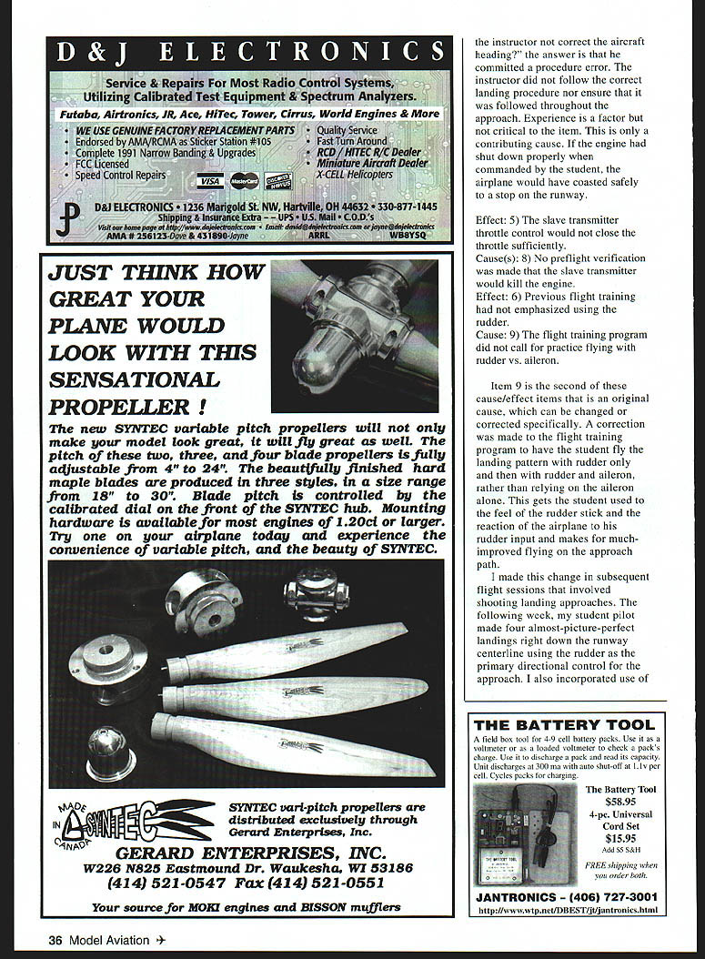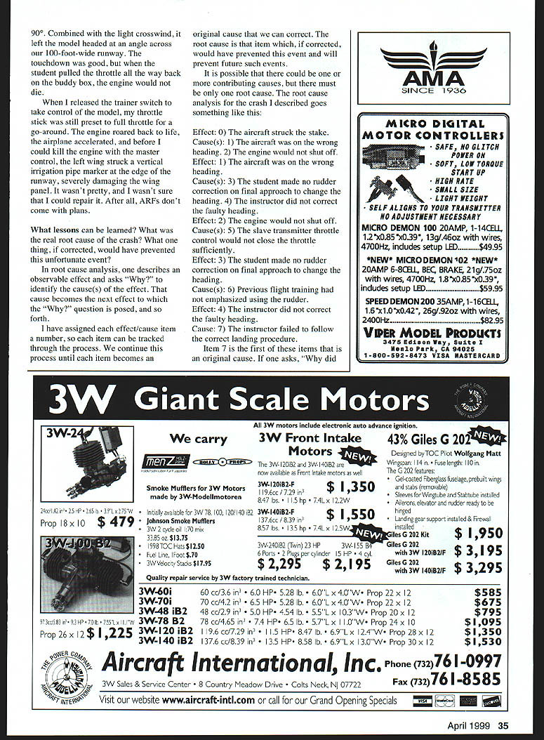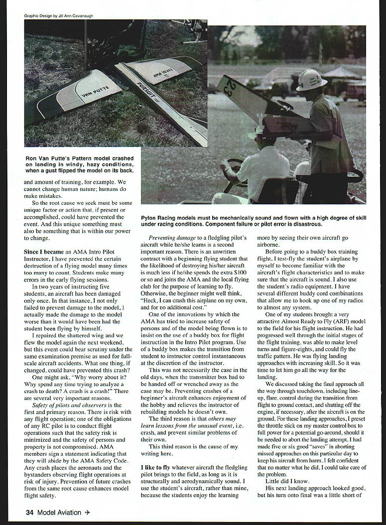 FOR EVERY unusual unexpected eventflight accident willthere root cause simple statement has basic premise investigation full-scale aircraft disasters National Transportation Safety Board objective investigation board sh identify . cause crash learning able prevent future crashes might spring same cause According August 1987 Nuclear News article failure analysis root causes fall three categories equipment failure procedural error personnel error Equipment failure could caused design deficiency maintenance deficiency manufacturing defect premature accelerated wearout procedure could incomplete incorrect Personnel error could include following procedure training deficiency lack attention communication deficiency root cause analysis productive cause must something can change affect process leads undesired event can affect experience level kind April 1999 33 U Don Brooks amount training example cannot change human nature humans make mistakes So root cause seek must some unique factor action present accomplished could have prevented event unique something must also something within power change Since became AMA Intro Pilot Instructor have prevented certain destruction flying model times too count Students make errors early flying sessions two years instructing five students aircraft has damaged once instance failed prevent damage model actually made damage model worse would have student flying himself repaired shattered wing flew model again next weekend event could bear scrutiny under same examination premise used fullscale aircraft accidents What thing changed could have prevented crash might ask worry about spend time trying analyze crash death crash crash several very important reasons Safety pilots observers first primary reason risk flight operation obligations RC pilot conduct flight operations such safety risk minimized safety persons property compromised AMA members sign statement indicating will abide AMA Safety Code Any crash places aeronauts bystanders observing flight operations risk injury Prevention future crashes same root cause enhances model flight safety Preventing damage fledgling pilots aircraft he/she learns second important reason unwritten contract beginning flying student likelihood destroying his/her aircraft much less he/she spends extra $100 joins AMA local flying club purpose learning fly Otherwise beginner might well think Heck can crash airplane own no additional cost innovations AMA has tried increase safety persons model being flown insist use buddy box flight instruction Intro Pilot program Use buddy box makes transition student instructor control instantaneous discretion instructor necessarily case old days transmitter box handed off wrenched away case may Preventing crashes beginners aircraft enhances enjoyment hobby relieves instructor rebuilding models doesnt own third reason others may learn lessons unusual event ie crash prevent similar problems own third reason cause writing like fly whatever aircraft fledgling pilot brings field long structurally aerodynamically sound use students aircraft rather because students enjoy learning seeing own aircraft go airborne Before going buddy box training flight test-fly students airplane myself become familiar aircrafts flight characteristics make sure aircraft sound also use students radio equipment have several different buddy cord combinations allow hook up radios almost system students brought very attractive Almost Ready Fly ARF model field flight instruction progressed well through initial stages flight training able make level turns figure-eights could fly traffic pattern flying landing approaches increasing skill So time let him go way landing discussed taking final approach way through touchdown including line up flare control during transition flight ground contact shutting off engine necessary after aircraft ground landing approaches preset throttle stick master control box full power potential go-around should needed abort landing attempt made five six good saves aborting missed approaches particular day keep aircraft harm felt confident no matter what did could take care problem Little did know next landing approach looked good turn onto final little short 34 Model Aviation Van Puttes Pattern model crashed landing windy hazy conditions gust flipped model its back Pylon Racing models must mechanically sound flown high degree skill under racing conditions Component failure pilot error disastrous 900 Combined light crosswind left model headed angle across 100-foot-wide runway touchdown good student pulled throttle way back buddy box engine would die released trainer switch take control model throttle stick still preset full throttle go-around engine roared back life airplane accelerated before could kill engine master control left wing struck vertical irrigation pipe marker edge runway severely damaging wing panel wasnt pretty wasnt sure could repair After ARFs dont come plans What lessons can learned What real root cause crash What thing corrected would have prevented unfortunate event root cause analysis describes observable effect asks identify causes effect cause becomes next effect question posed forth have assigned effect/cause item number item can tracked through process continue process until item becomes 24W 42 H 25 HP 205 lb 39 Lx275 W Prop 18x 10 $ 479 original cause can correct root cause item corrected would have prevented event will prevent future such events possible could contributing causes must root cause root cause analysis crash described goes something like Effect 0 aircraft struck stake Causes 1 aircraft wrong heading 2 engine would shut off Effect 1 aircraft wrong heading Causes 3 student made no rudder correction final approach change heading 4 instructor did correct faulty heading Effect 2 engine would shut off Causes 5 slave transmitter throttle control would close throttle sufficiently Effect 3 student made no rudder correction final approach change heading Causes 6 Previous flig