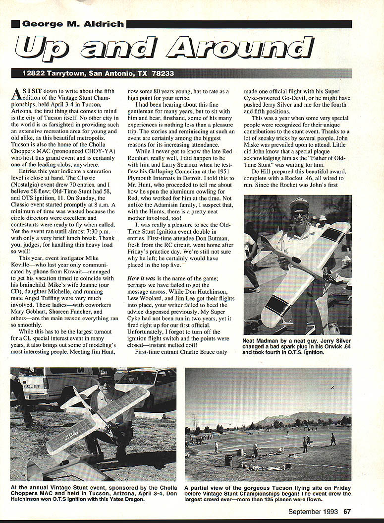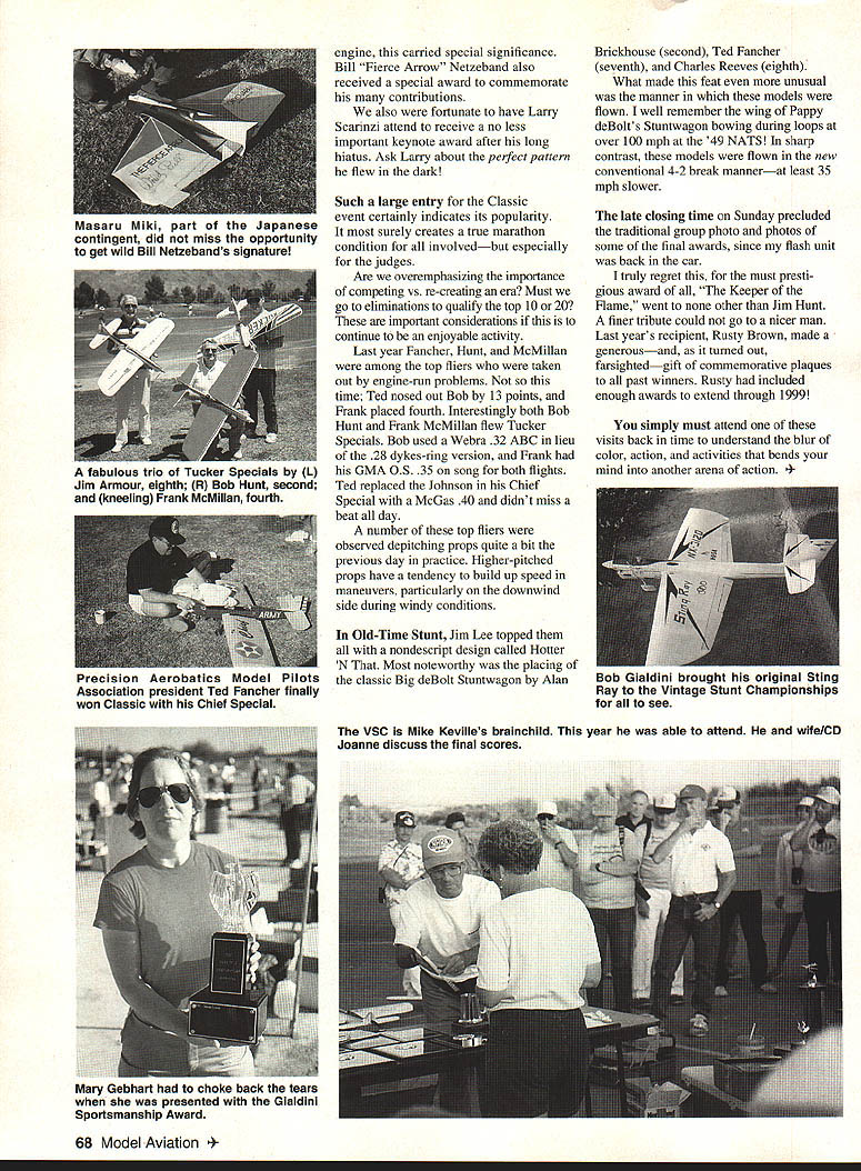 George M Aldrich uzicJ uxiioix1 SISIT down write about fifth 14 edition Vintage Stunt Cham pionships held April 3-4 Tucson Arizona first thing comes mind city Tucson itself No other city world farsighted providing such extensive recreation area young old alike beautiful metropolis Tucson also home Cholla Choppers MAC pronounced CHOY-YA host grand event certainly leading clubs anywhere Entries year indicate saturation level close hand Classic Nostalgia event drew 70 entries believe 68 flew Old-Time Stunt 58 OTS ignition 11 Sunday Classic event started promptly 8 am minimum time wasted because circle directors excellent contestants ready fly called Yet event ran until almost 730 pm very brief lunch break Thank judges handling heavy load well year event instigator Mike Kevillewho last year communi cated phone Kuwaitmanaged get vacation timed coincide brainchild Mikes wife Joanne CD daughter Michelle running mate Angel Tuffing very much involved ladieswith coworkers Mary Gebhart Shareen Fancher othersare main reason everything ran smoothly has largest turnout CL special interest event years also brings out some modelings interesting people Meeting Jim Hunt now some 80 years young has rate high point scribe hearing about fine gentleman years sit him hear firsthand some experiences nothing less pleasure trip stories reminiscing such event certainly among biggest reasons its increasing attendance never got know late Red Reinhart really well did happen him Larry Scarinzi testflew Galloping Comedian 1951 Plymouth Internats Detroit told Mr Hunt proceeded tell about spun aluminum cowling Red worked him time unlike Adamisin family suspect Hunts pretty neat mother involved too really pleasure see OldTime Stunt Ignition event double entries First-time attendee Don Butman fresh RC circuit went home after Fridays practice day still sure left certainly would have placed top five name game perhaps have failed get message across Don Hutchinson Lew Woolard Jim Lee got flights place writer failed heed advice dispensed previously Super Cyke run two years yet fired right up first official Unfortunately forgot turn off ignition flight switch points closedinstant melted coil First-time entrant Charlie Bruce made official flight Super Cyke-powered Go-Devil might have pushed Jerry Silver fourth fifth positions year some very special people recognized unique contributions stunt event Thanks lot sneaky tricks several people John Miske prevailed upon attend Little did John know special plaque acknowledging him Father OldTime Stunt waiting him De Hill prepared beautiful award complete Rocket 46 wired run Since Rocket Johns first September 1993 67 Neat Madman neat guy Jerry Silver changed bad spark plug Orwick 64 took fourth OTS ignition annual Vintage Stunt event sponsored Cholla Choppers MAC held Tucson Arizona April 3-4 Don Hutchinson won OTS Ignition Yates Dragon partial view gorgeous Tucson flying site Friday before Vintage Stunt Championships began event drew largest crowd evermore 125 planes flown engine carried special significance Bill Fierce Arrow Netzeband also received special award commemorate contributions also fortunate have Larry Scarinzi attend receive no less important keynote award after long hiatus Ask Larry about perfect pattern flew dark Such large entry Classic event certainly indicates its popularity surely creates true marathon condition involvedbut especially judges Are overemphasizing importance competing vs re-creating era Must go eliminations qualify top 10 20 important considerations continue enjoyable activity Last year Fancher Hunt McMillan among top fliers taken out engine-run problems time Ted nosed out Bob 13 points Frank placed fourth Interestingly both Bob Hunt Frank McMillan flew Tucker Specials Bob used Webra 32 ABC lieu 28 dykes-ring version Frank GMA 05 35 song both flights Ted replaced Johnson Chief Special McGas 40 didnt miss beat day number top fliers observed depitching props quite bit previous day practice Higher-pitched props have tendency build up speed maneuvers particularly downwind side during windy conditions Old-Time Stunt Jim Lee topped nondescript design called Hotter N Most noteworthy placing classic Big deBolt Stuntwagon Alan Brickhouse second Ted Fancher seventh Charles Reeves eighth What made feat unusual manner models flown well remember wing Pappy deBolts Stuntwagon bowing during loops over 100 mph 49 NATS sharp contrast models flown new conventional 4-2 break mannerat least 35 mph slower late closing time Sunday precluded traditional group photo photos some final awards since flash unit back car truly regret must presti gious award Keeper Flame went other Jim Hunt finer tribute could go nicer man Last years recipient Rusty Brown made generousand turned out farsightedgift commemorative plaques past winners Rusty included enough awards extend through 1999 simply must attend visits back time understand blur color action activities bends mind another arena action odel Aviation ru MIKI part tfle Japanese contingent did miss opportunity get wild Bill Netzebands signature TaDUIOUS trio tucker Specials Dy L Jim Armour eighth R Bob Hunt second kneeling Frank McMillan fourth rrecision AeroDatics oaei rliots Association president Ted Fancher finally won Classic Chief Special ob ialdini brougflt nis original Sting Ray Vintage Stunt Championships see VSC Mike Kevilles brainchild year able attend wife/CD Joanne discuss final scores Mary Gebhart choke back tears presented Gialdini Sportsmanship Award