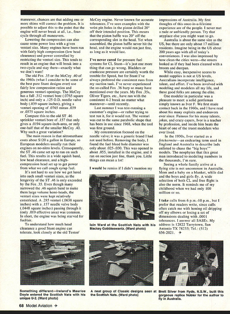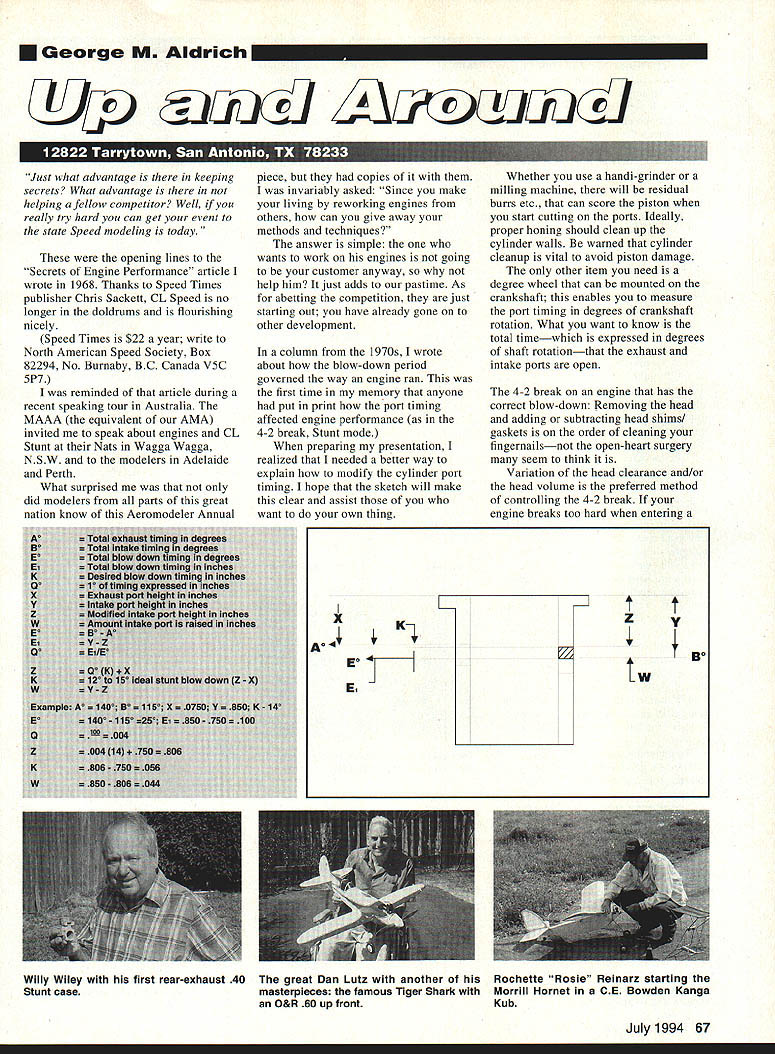 U George M Aldrich L1KT1 UX315iX1 Just what advantage keeping secrets What advantage helping fellow competitor Well really try hard can get event state Speed modeling today opening lines Secrets Engine Performance article wrote 1968 Thanks Speed Times puhlisher Chris Sackett CL Speed no longer doldrums flourishing nicely Speed Times $22 year write North American Speed Society Box 82294 No Burnaby BC Canada V5C 5P7 reminded article during recent speaking tour Australia MAAA equivalent AMA invited speak about engines CL Stunt Nats Wagga Wagga NSW modelers Adelaide Perth What surprised did modelers parts great nation know Aeromodeler Annual piece copies invariably asked Since make living reworking engines others can give away methods techniques answer simple wants work engines going customer anyway help him just adds pastime As abetting competition just starting out have already gone other development column 1970s wrote about blow-down period governed way engine ran first time memory anyone put print port timing affected engine performance 4-2 break Stunt mode preparing presentation realized needed better way explain modify cylinder port timing hope sketch will make clear assist want own thing Whether use handi-grinder milling machine will residual burrs etc can score piston start cutting ports Ideally proper honing should clean up cylinder walls warned cylinder cleanup vital avoid piston damage other item need degree wheel can mounted crankshaft enables measure port timing degrees crankshaft rotation What want know total timewhich expressed degrees shaft rotationthat exhaust intake ports open 4-2 break engine has correct blow-down Removing head adding subtracting head shims gaskets order cleaning fingernailsnot open-heart surgery seem think Variation head clearance and/or head volume preferred method controlling 4-2 break engine breaks too hard entering -j 1 Kt B0 E07 E1 July1994 67 Willy Wiley first rear-exhaust 40The great Dan Lutz another hisRochette Rosie Reinarz starting Stunt casemasterpieces famous Tiger Shark withMorrill Hornet CE Bowden Kanga O&R 60 up frontKub maneuver chances adding shims will correct problem possible adjust point engine will never break ie fourcycle through maneuvers Lowering compression can also cause some power loss given venturi size engines have run fairly high compression low head clearance power controlled restricting venturi size tends result engine will break two-cycle stay thereexactly what dont want old Fox 35 McCoy 40 1960s what consider some best pure Stunt designs ever use fairly low compression ratios generous venturi openings McCoy has full 312 venturi bore 0765 square inch 125 GD needle valve body 039 square inches giving venturi opening 0765 minus 039 0375 square inches Compare old ST 46 sprinkler venturi bore 157 gives 0 194 square-inch-area one-half smaller McCoy 40 such great variation main reason nitromethane costs about $120 gallon Europe European modelers usually run engines no-nitro levels Consequently ST 46 came set up run such fuel results wide squish band low head clearance highcompression head set up get power what call cough syrup fuel Its hard see got lured such small venturi sizes longevity ST 46 exceeded Fox 35 though narrowed 46 squish band make large volume hemi-heads venturi sizes kept relatively constricted 285 venturi 0638 square inches 157 needle valve body 0448 square inches passing through 019 effective area wascommon short engine being starved fuel/air understand much head clearance good Stunt engine can tolerate look closely old Testor McCoy engine Never known accurate tolerances Ive seen examples wrist pin holes piston drilled 200 off intended position means piston baffle 200 off corresponding slot head Yet assembled piston baffle never hit head engine would run just fine long would last Ive never cared pressure fuel systems CL Stuntits just thing can go wrong Bladders crankcase pressure certainly worth trouble Speed Stunt Ive always preferred consistent runs suction tank Ive never experienced so-called Fox 36 burp have mentioned over years Fox 35s Oliver Tigers etc have run consistent 4-2 break no matter what maneuveruntil recently Last summer test-running customers engineor rather trying test run it would venturi cut same parabolic shape has use since 1968 tool first ground concentration focused needle valve generic brand used before Removing body found fuel bleed hole diameter about 025-030 opened about 055 installed engine ran suction just fine thank Little things can mean lot would remiss didnt mention impressions Australia first thoughts once-in-a-lifetime experience people never met rude unfriendly person Try anyplace else might want go Australia about same size US about 17 million residents Imagine being US about 200 years ago todays conveniences also impressed clean cities werethe streets looked cleaned broom dustpan easy inexpensive access model supplies US levels Australians incorporate intelligence talent effort Ive involved modeling modelers life good folks among elite modeler particular pleasure meet solid gentleman simply known Ivor F first made contact back 1960s have read about exploits endeavors ever since Famous talents jokes crazy capers Ivor teacher profession inside him beats heart truest modelers ever lived 1930s Ivor started fetchermitean endearing term used England Australia describe lads enlisted chase big boys models neophytes great man introduced modeling numbers thousands Im sure Seeing whole family arrive flying site uncommon Australia Mom baby blanket white dad boys girls fly wide selection both CL free flight also norm reminds childhood 100 million take calls 6 pm-10 pm prefer readers write since calls often catch honing oil dripping off elbows losing set dimensions dealing 0001 tolerances answer SASEs address 12822 Tarrytown San Antonio TX 78233 Tel 512 656-2021 group Classic designs seen Brett Silver Ryde NSW built Scottish Nats Ward photogorgeous replica Nobler author fly Australia 68