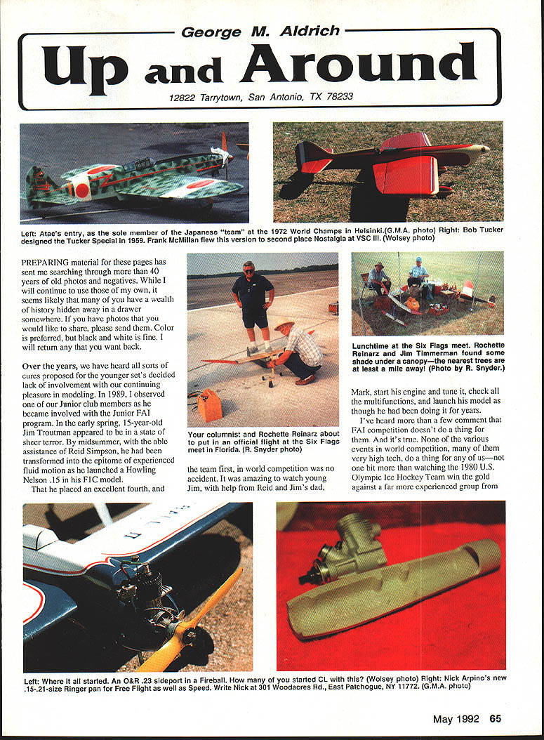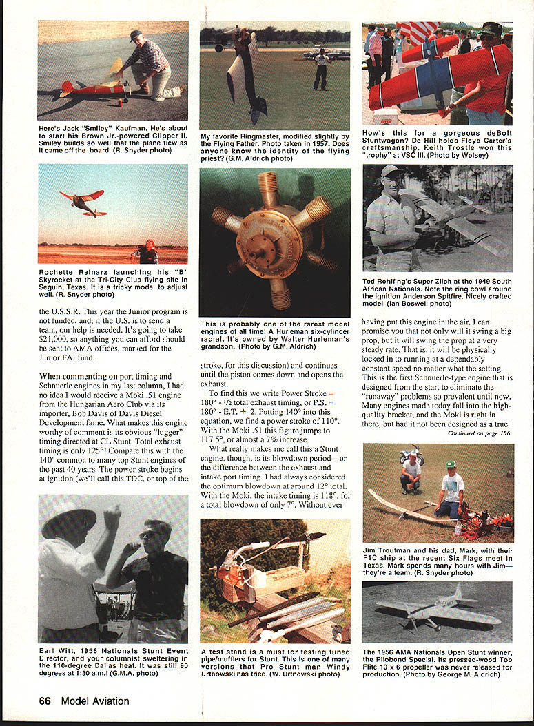 Left Ataes entry sole member Japanese team 1972 World Champs HelsinkiGMA photo Right Bob Tucker designed Tucker Special 1959 Frank McMillan flew version second place Nostalgia VSC Ill Wolsey photo George M Aldrich Up Around 12822 Tarrytown San Antonio TX 78233 PREPARING material pages has sent searching through 40 years old photos negatives will continue use own seems likely have wealth history hidden away drawer somewhere have photos would like share please send Color preferred black white fine will return want back Over years have heard sorts cures proposed younger sets decided lack involvement continuing pleasure modeling 1989 observed Junior club members became involved Junior FAT program early spring 15-year-old Jim Troutman appeared state sheer terror midsummer able assistance Reid Simpson transformed epitome experienced fluid motion launched Howling Nelson 15 FlC model placed excellent fourth Mark start engine tune check multifunctions launch model though doing years Ive heard few comment columnist Rochette Reinarz about PAl competition doesnt thing put official flight Six Flags its true None various meet Florida R Snyder photo events world competition very high tech thing usnot bit watching 1980 Us Olympic Ice Hockey Team win gold against far experienced group team first world competition no accident amazing watch young Jim help Reid Jims dad Left started An O&R 23 sideport Fireball started CL Wolsey photo Right Nick Arpinos new 15-21-size Ringer pan Free Flight well Speed Write Nick 301 Woodacres Rd East Patchogue NY 11772 GMA photo May 1992 65 Lunchtime Six Flags meet Rochette Reinarz Jim Timmerman found some shade under canopythe nearest trees least mile awayl Photo R Snyder USSR year Junior program funded US send team help needed Its going take $21000 anything can afford should sent AMA offices marked Junior PAl fund commenting port timing Schnuerle engines last column no ideal would receive Mold 51 engine Hungarian Aero Club via its importer Bob Davis Davis Diesel Development fame What makes engine worthy comment its obvious lugger timing directed CL Stunt Total exhaust timing 1250 Compare 1400 common top Stunt engines past 40 years power stroke begins ignition well call TDC top probably rarest model engines time Hurleman six-cylinder radial Its owned Walter Hurlemans grandson Photo GM Aldrich stroke discussion continues until piston comes down opens exhaust find write Power Stroke 1/2 total exhaust timing PS ET tting 1400 equation find power stroke 1100 Mold 51 figure jumps 11750 or almost 7% increase What really makes call Stunt engine though its blowdown periodor difference between exhaust intake port timing always considered optimum blowdown around 120 total Moki intake timing 1180 total blowdown 70 Without ever Ted Rohlfings Super Zilch 1949 South African Nationals Note ring cowl around ignition Anderson Spitfire Nicely crafted model Ian Boswell photo having put engine air can promise will swing big prop will swing prop very steady rate will physically locked running dependably constant speed no matter what setting first Schnuerle-type engine designed start eliminate runaway problems prevalent until now engines made today fall highquality bracket Moki right designed true Con jinued page 156 66 Model Aviation Heres Jack Smiley Kaufman Hes about start Brown Jr-powered Clipper IIMy favorite Ringmaster modified slightly Smiley builds well plane flew asthe Flying Father Photo taken 1957 Does came off board R Snyder photoanyone know identity flying priest GM Aldrich photo Hows gorgeous deBolt Stuntwagon De Hill holds Floyd Carters craftsmanship Keith Trostle won trophy VSC Ill Photo Wolsey Rochette Reinarz launching B Skyrocket Tn-City Club flying site Seguin Texas tricky model adjust well R Snyder photo Jim Troutman dad Mark FiC ship recent Six Flags meet Texas Mark spends hours Jim theyre team R Snyder photo Earl Witt 1956 Nationals Stunt Event Director columnist sweltering 110-degree Dallas heat still 90 degrees 130 am GMA photo test stand must testing tuned pipe/mufflers Stunt versions Pro Stunt man Windy Urtnowski has tried W Urtnowski photo 1956 AMA Nationals Open Stunt winner Pliobond Special Its pressed-wood Top Flite 10 x 6 propeller never released production Photo George M Aldrich Hobbypoxy clear choice more hobbyists Thats because can depend Hobbypoxy hold up under difficult conditions Formulas 1 2 3 4 fast acting rapid curing super holding epoxy glues provide incredible bonding power can used filling nicks cracks gaping joints Formula 3 gel-like consistency keeps put Formulas 2 4 come convenient 4 ounce squeeze bottles Whatever needs formulas just right whatever youre gluing flown old Playboy Cabin day before asked him flown recently approved six-foot Brooklyn Dodger seems wiped out wing AMA Nationals clincher really shows Sals years experience came next new wing finished did try fly dope hadnt aged long enough didnt ask Sal used nitrate butyrate remember nitrate takes about 30 days settle down butyrate takes up 90 days Trim model before dope has cured have asked get TCP plasticizer Ive mentioned best source know Flexall Dave Brown Products experience castor oil works nitrate put butyrate its likely turn white TCP much safer mix 1 oz per quart straight dope good starting point 19511 worked part-time old ABC Hobby Shop Houston going school well remember first Ringmaster kits came shop price $295 next six months saw profusion kit its 40th year flew Combat sans landing gear almost immediately Im sure its all-time best-seller Stunt trainer Ringmaster remember best flown priest 1957 Nationals believe father would start doing loops gradually tighten up until model maneuvered absolute stall found old photo Ringmaster standing its tail hope reproduces well Unusual kind performance engine set up lot offset could made hang still someone could catch easily write want reply please enclose SASE done will always answer will accept phone calls please dont call writing will suffi