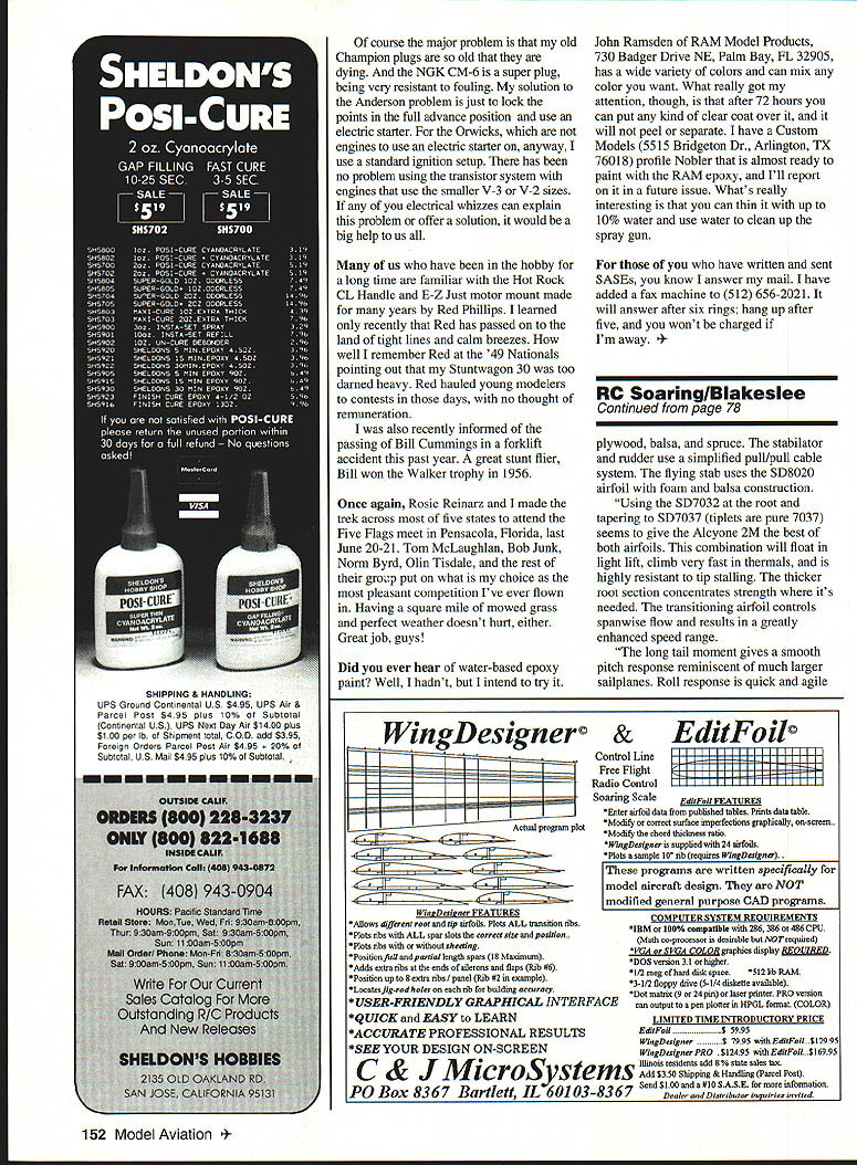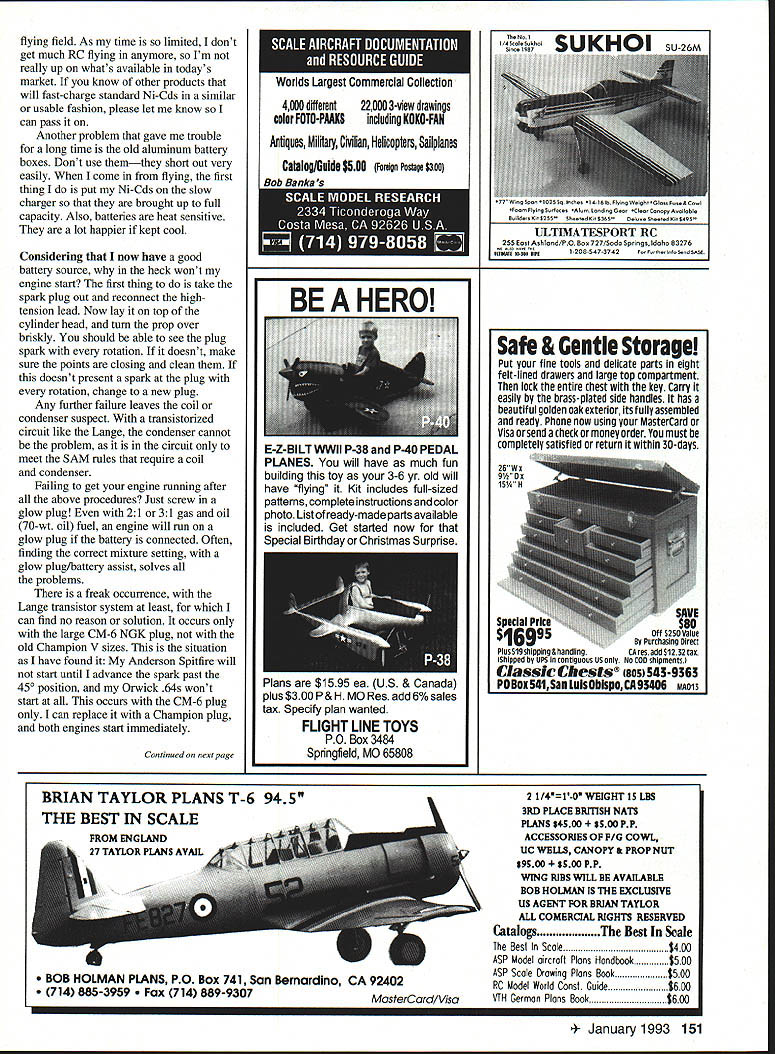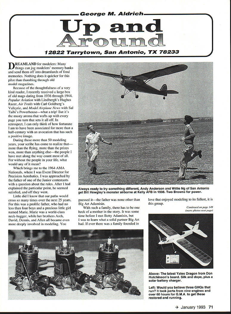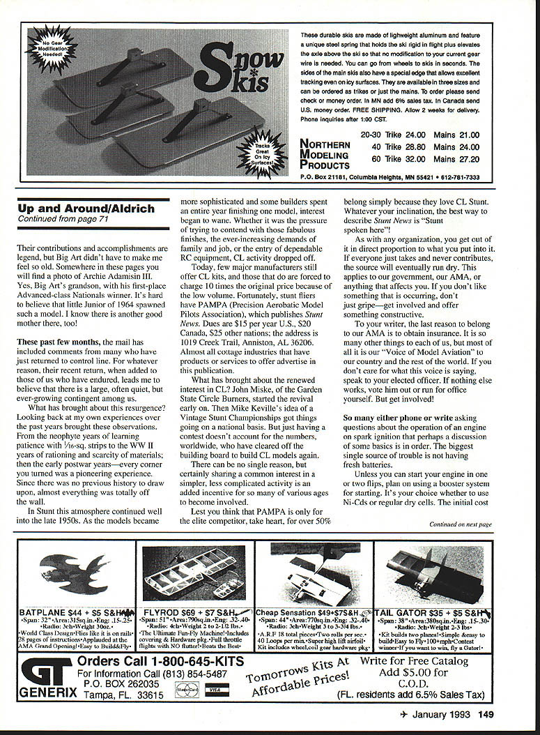 D REAMLANDfor modelers things can jog modelers memory banks send off dreamlands fond memories Nothing does quicker pilot thumbing through old model magazines Because thoughtfulness very kind reader recently received large box old mags dating 1936 through 1944 Popular Aviation Lindberghs Hughes Racer Air Trails Carl Goldbergs Valkyrie Model Airplane News Sal Taibis Powerhousewhat trip its musty aroma wafts up page turn sets off retrospect can think fortunate am have associated half-century avocation has such positive image During 50 modeling years scribe has come realize flying prizes won anything elsethe people have met along way count people life what would mean Which brings 1964 AMA Nationals Event Director Precision Aerobatics approached father Junior contestants question about rules After explained particular point seemed satisfied off went Little did know paths would cross times over next 25 years prolific father no less four boys precious little girl named Marie Marie world-class neck-hugger brothers Arch David Dennis Allen became deeply involved modeling love enjoyed modeling its fullest group January1993 71 George hi Aldrich rnd d 12822 Tarrytown San Antonio TX 78233 Always ready try something different Andy Anderson Willie Ng San Antonio get Bill Hewgleys monster airborne Kelly AFB 1938 Two Browns power guessed itthe father other Big Art Adamisin such family has one Continued page 149 heck mother story some photos next page time before met Betty Adamisin learn what solid partner Big Art ever family founded Above latest Yates Dragon Don Hutchinsons board Silk dope plus solar battery charger Left Would believe three GHOs run took parts nine engines over 60 hours GMA get restored running contributions accomplishments legend Big Art didnt have make feel old Somewhere pages will find photo Archie Adamisin III Yes Big Arts grandson first-place Advanced-class Nationals winner Its hard believe little Junior 1964 spawned such model know another good mother too past few months mail has included comments have just returned control line whatever reason recent return added us have endured leads believe large often quiet ever-growing contingent among us What has brought about resurgence Looking back own experiences over past years brought observations neophyte years learning patience 1A6-sq strips WW II years rationing scarcity materials early postwar yearsevery corner turned pioneering experience Since no previous history draw upon almost everything totally off wall Stunt atmosphere continued well late 1950s As models became sophisticated some builders spent entire year finishing model interest began wane Whether pressure trying contend fabulous finishes ever-increasing demands family job entry dependable RC equipment CL activity dropped off Today few major manufacturers still offer CL kits forced charge 10 times original price because low volume Fortunately stunt fliers have PAMPA Precision Aerobatic Model Pilots Association publishes Stunt News Dues $15 per year US $20 Canada $25 other nations address 1019 Creek Trail Anniston AL 36206 Almost cottage industries have products services offer advertise publication What has brought about renewed interest CL John Miske Garden State Circle Burners started revival early Mike Kevilles idea Vintage Stunt Championships got things going national basis just having contest doesnt account numbers worldwide have cleared off building board build CL models again can no single reason certainly sharing common interest simpler less complicated activity added incentive various ages become involved Lest think PAMPA elite competitor take heart over 50% belong simply because love CL Stunt Whatever inclination best way describe Stunt News Stunt spoken As organization get out direct proportion what put everyone just takes never contributes source will eventually run dry applies government AMA anything affects you dont like something occurring dont just gripeget involved offer something constructive writer last reason belong AMA obtain insurance other things us Voice Model Aviation country rest world dont care what voice saying speak elected officer nothing else works vote him out run office yourself get involved So either phone write asking questions about operation engine spark ignition perhaps discussion some basics order biggest single source trouble having fresh batteries Unless can start engine two flips plan using booster system starting Its choice whether use Ni-Cds regular dry cells initial cost Continued next page BATPLANE $44 $5 s& FLYROD $69 heap Sensation $49$7S&H AlL GATOR $35 &H% Span 32Area315sqm.Eng 152 Span 5tArm790sqin.Eng 32-40 Span 44Arest770sqin.Eng 32-40 Span 38Arest380sqin.Eng 15-30 Radio 3eb-Weght 3Ooz-Radio 4ch-Weight 2 2-112 IbsRadto 3chWeight 3 3-314 Ibsltadio 3ehWeight 2-3 lbs -World Class Design-Flies like nsils Ultimate Fun-Fly Machine lncludes ARF 18 Ipieces-Twomlls per Sec- -Kit builds two planesSimple &easy 8 pages instructions-Applauded coveting & Hardware pkg-Full thmttle 40 Loops per min-Super high lift aisfoilbulid-Easy Fly-100nipb-Contest MA Grand OpeningEasy Build&FIy- flights NO fluflerl-Beats Best- Kit includes wheelcoil gear hardware pkg- winner-If wantto win fly aGator Orders Call 1-800-645-KITSpt Write Free Catalog EE Information Call 813 854-5487Add $500 EPO BOX 262035 MVISAbxe V$CCOD GENERIX Tampa FL 33615FL residents add 65% Sales Tax January1993 149 durable skis made lighweight aluminum feature unique steel spring holds ski rigid flight plus elevates axle above ski no modification current gear wire needed can go wheels skis seconds sides main skis also have special edge allows excellent tracking icy surfaces available three sizes can ordered trikes just mains order please send check money ordet MN add 6% sales tax Canada send US money order FREE SHIPPING Allow 2 weeks delivery Phone inquiries after 100 CST 20-30 Trike 2400Mains2100 NORTHERN40 Trike 2880Mains2400 MODELING60 Trike 3200Mains2720 PRODUCTS PO Box 21181 Col