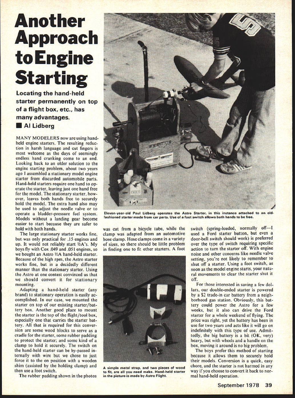 Another Approach Engine Starting Locating hand-held starter permanently top flight box etc has advantages U Al Lidberg MANY MODELERS now using handheld engine starters resulting reduc tion harsh language cut fingers wdcome days seemingly endless hand cranking come end Looking back older solution engine starting problem about two years ago assembled stationary model engine starter discarded automobile parts Hand-held starters require hand op erate starter leaving just hand free model stationary starter ever leaves both hands free securely hold model extra hand also may used adjust needle valve operate bladder-pressure fuel system Models landing gear become easier start because safer hold both hands large stationary starter works fine practical 15 engines up would reliably start As boys fly Cox 049 051 engines bought Astro hand-held starter Because high rpm Astro starter works fine decidedly different manner stationary starter Using Astro contest convinced us should convert stationary mounting Adapting hand-held starter brand stationary operation easily ac complished case mounted starter top existing starter/bat tery box Another good place mount starter top flight/tool box especially carries starter bat tery required conver sion some wood blocks serve cradle starter some rubber padding protect starter some kind clamp hold securely switch hand-held starter can by-passed ternally wire chose just force position wooden shim assisted holding clamp use foot switch rubber padding shown photos cut bicycle tube clamp adapted automotive hose clamp Hose clamps come variety sizes should little problem finding fit other starters foot switch spring-loaded normally offI used Ford starter button door-bell switch should work preferred over type switch requiring specific action turn starter off engine noise other concerns like needle valve setting youre likely remember shut off starter Using foot switch soon model engine starts natu ral movements clear starter shut off interested saving few dol lars double-ended starter powered $2 trade-in car battery neigh borhood gas station Obviously bat tery could power Astro few weeks also can drive Ford starter whole weekend flying price right yet battery has use two years acts like will go indefinitely type use Admit tedly big battery bit OK very heavy wheels handle box moving around no big problem boys prefer method starting because allows securely hold models Conversion quick easy chore starter harmed way choose convert back nor mal hand-held operation September 1978 39 Elevenyearold Paul Lidberg operates Astro Starter instance attached old fashioned starter made car parts Use foot switch allows both hands free simple metal strap two pieces wood fit need make Hand-held starter picture made Astro Flight
