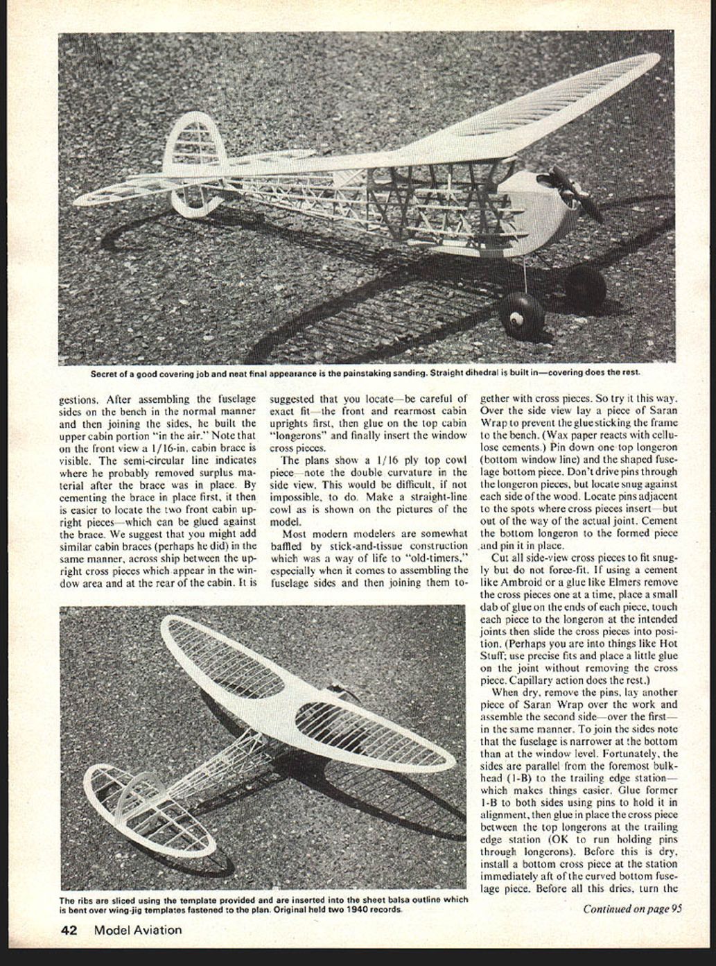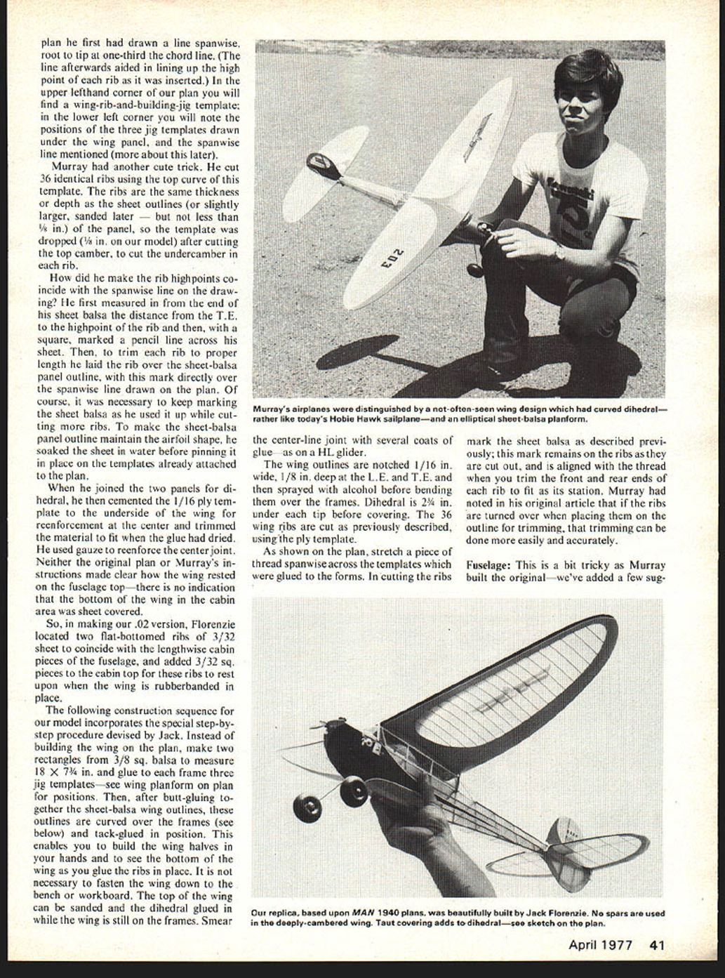 iHE BY THE LATE 1930s Gordon Scotty Murray become well-known eastern free-flight competition series fine flying designs masterpiecefor old timers remember himwas Answer also known Topper latter being kit Answer published Model Airplane News August 1940 Murray distinguished use cleverly designed wing unusual both its method construction aerody namic features thin-sectioned heavily under-cambered elliptical dihedral planform Structurally consisted sheet-balsa outline frame fastened assembly templates attached work surface Its unusual aspect after incor porating certain amount straight di hedral Murray relied shrinkage covering bend panels progressively up towards tips works very well unique ship did have superior per formanceone resaons re vived used up 19 engines Class models 20 30 Class B its first outing won major meet established 1940 record several times done over 5 minutes Class C version Dennymite set another record 836 Murray wrote ship combined high lift efficiency Say what will has proved satisfaction critical build ers wing really has stuff model scaled 02 power inas much good ships Replica Old Timer classification much demand pleasant size build fly wish RC Assist has flown Ace equipment including singleended Baby actuator control system loosely described pulse rudder Al though rudder wiggles back forth response transmitted pulses its average position determined posi tion transmitter stick can use lightweight multi-channel systemsuch Cannonif wish additional controls Since airplane undoubtedly will built have requisite ex perience have attempted prepare ~now glue this' type articlewhich such builders probably ignore anyway course Scotty being us have no author fitting leave way order present plans pictures Jack Florenzie undertook con struction sample goes saying did competent job wing course requires com mentary some other points may obvious offhand Wing Because wing distinctive feature shipand built differently anything average free fighters experiencewe shall tackle first shall describe first method detailed Murray original MAN article improved procedure followed Jack Florenzie making 02 version MA Both methods basically same can build either way Jacks method allows building wing hand pinning down makes easier butt panels together dihedral Basically first step cut wing outline pieces V8 X 3 sheet balsa model shown plan Florenzie foundthat wing quite strong therefore very soft sheet can used wing outline pieces butt-glued together shown wing planform pinning pieces down drawing form camber wing panel Murray first fastened down plan three jig templates shown wing 40 Model Aviation Scotty Murrays famous 1940 design makes ideal 02-powered Replica Old-Timerfly either free flight RC Assist plan first drawn line spanwise root tip one-third chord line line afterwards aided lining up high point rib inserted upper lefthand corner plan will find wing-rib-and-building-jig template lower left corner will note positions three jig templates drawn under wing panel spanwise line mentioned about later Murray another cute trick cut 36 identical ribs using top curve template ribs same thickness depth sheet outlines slightly larger sanded later 1/8 panel template dropped 1/8 model after cutting top camber cut undercamber rib did make rib highpoints co incide spanwise line draw ing first measured end sheet balsa distance TE highpoint rib square marked pencil line across sheet trim rib proper length laid rib over sheet-balsa panel outline mark directly over spanwise line drawn plan course necessary keep marking sheet balsa used up cut ting ribs make sheet-balsa panel outline maintain airfoil shape soaked sheet water before pinning place templates already attached plan joined two panels di hedral cemented 1/16 ply tem plate underside wing reenforcement center trimmed material fit glue dried used gauze reenforce center joint Neither original plan Murrays structions made clear wing rested fuselage topthere no indication bottom wing cabin area sheet covered So making 02 version Florenzie located two flat-bottomed ribs 3/32 sheet coincide lengthwise cabin pieces fuselage added 3/32 sq pieces cabin top ribs rest upon wing rubberbanded place following construction sequence model incorporates special step-by step procedure devised Jack Instead building wing plan make two rectangles 3/8 sq balsa measure 18 X 7 glue frame three jig templatessee wing planform plan positions after butt-gluing gether sheet-balsa wing outlines outlines curved over frames see below tack-glued position enables build wing halves hands see bottom wing glue ribs place necessary fasten wing down bench workboard top wing can sanded dihedral glued wing still frames Smear center-line joint several coats glue HL glider wing outlines notched 1/16 wide 1/8 deep LE IE sprayed alcohol before bending over frames Dihedral 2/4 under tip before covering 36 wing ribs cut previously described usingthe ply template As shown plan stretch piece thread spanwise across templates glued forms cutting ribs mark sheet balsa described previ ously mark remains ribs cut out aligned thread trim front rear ends rib fit its station Murray noted original article ribs turned over placing outline trimming trimming can done easily accurately Fuselage bit tricky Murray built originalweve added few sug April 197741 Murrays airplanes distinguished not-often-seen wing design curved dihedral rather like todays Hobie Hawk sailplaneand elliptical sheet-balsa planform replica based upon MAN 1940 plans beautifully built Jack Florenzie No spars used deeply-cambered wing Taut covering adds todihedralsee sketch plan gestions After assembling fuselage sides bench normal manner joining sides built upper cabin portion air Note front view 1/16-in cabin brace visible semi-circular line indicates probably removed surplus ma terial after brace place cementing brace place first easier locate two front cabin up right pieceswhich can glued against brace suggest might add similar cabin br