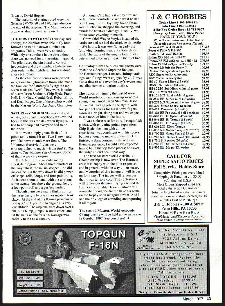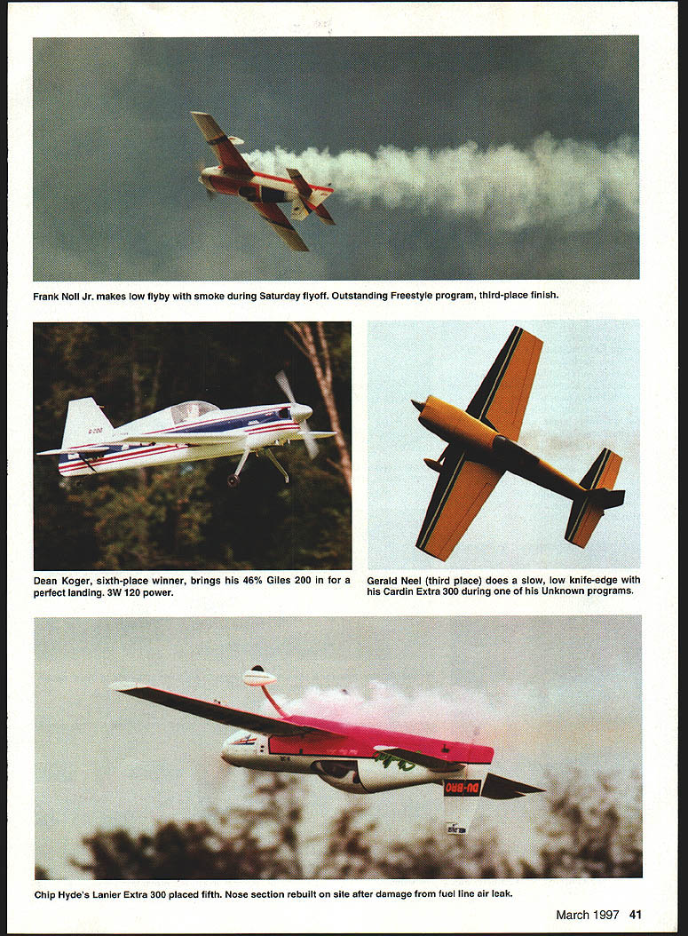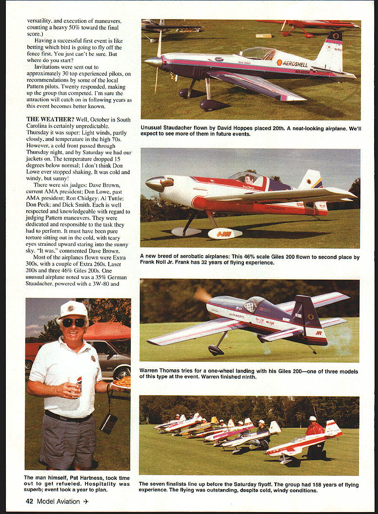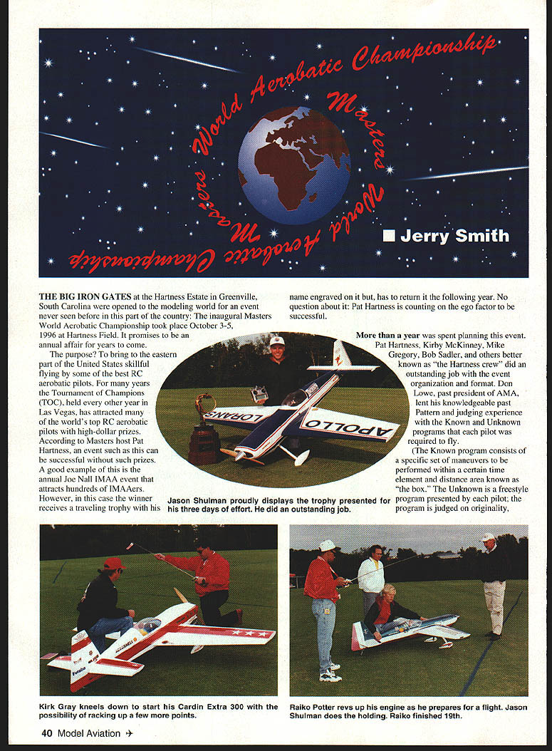THE BIG IRON GATES Hartness Estate Greenville South Carolina opened modeling world event never seen before part country inaugural Masters World Aerobatic Championship took place October 3-5 1996 Hartness Field promises annual affair years come purpose bring eastern part United States skillful flying some best RC aerobatic pilots years Tournament Champions TOC held other year Las Vegas has attracted worlds top RC aerobatic pilots high-dollar prizes According Masters host Pat Hartness event such can successful such prizes good example annual Joe Nail IMAA event attracts hundreds IMAAers However case winner Jason Shulman proudly displays trophy presented receives traveling trophy his three days effort did outstanding job year spent planning event Pat Hartness Kirby McKinney Mike Gregory Bob Sadler others better known Hartness crew did outstanding job event organization format Don Lowe past president AMA lent knowledgeable past Pattern judging experience Known Unknown programs pilot required fly Known program consists specific set maneuvers performed within certain time element distance area known box Unknown freestyle program presented pilot program judged originality 40 Model Aviation engraved has return following year No question about Pat Hartness counting ego factor successful Kirk Gray kneels down start Cardin Extra 300 Raiko Potter revs up engine prepares flight Jason possibility racking up few points Shulman does holding Raiko finished 19th Gerald Neel third place does slow low knife-edge Cardin Extra 300 during Unknown programs March 1997 41 Frank Noll Jr makes low flyby smoke during Saturday flyoff Outstanding Freestyle program third-place finish Dean Koger sixth-place winner brings 46% Giles 200 perfect landing 3W 120 power Chip Hydes Lanier Extra 300 placed fifth Nose section rebuilt site after damage fuel line air leak versatility execution maneuvers counting heavy 50% toward final score Having successful first event like betting bird going fly off fence first just cant sure stan Invitations sent out approximately 30 top experienced pilots recommendations some local Pattern pilots Twenty responded making up group competed Im sure attraction will catch following years event becomes better known THE WEATHER Well October South Carolina certainly unpredictable Thursday super Light winds partly cloudy temperature high 70s However cold front passed through Thursday night Saturday jackets temperature dropped 15 degrees below normal dont think Don Lowe ever stopped shaking cold windy sunny six judges Dave Brown current AMA president Don Lowe past AMA president Ron Chidgey Al Tuttle Don Peck Dick Smith well respected knowledgeable regard judging Pattern maneuvers dedicated responsible task perform must have pure torture sitting out cold teary eyes strained upward staring sunny sky commented Dave Brown Most airplanes flown Extra 300s couple Extra 260s Laser 200s three 46% Giles 200s unusual airplane noted 35% German Staudacher powered 3W-80 42 Model Aviation * Unusual Staudacher flown David Hoppes placed 20th neat-looking airplane Well expect see future events new breed aerobatic airplanes 46% scale Giles 200 flown second place Frank Noll Jr Frank has 32 years flying experience Warren Thomas tries one-wheel landing Giles 200one three models type event Warren finished ninth man himself Pat Hartness took time out get refueled Hospitality superb event took year plan seven finalists line up before Saturday flyoff group 158 years flying experience flying outstanding despite cold windy conditions flown David Hoppes majority engines used German 3W-70 80 120 depending size airplane Menz wooden prop almost universally used THE FIRST TWO DAYS Thursday Friday 20 pilots able fly four Known two Unknown elimination programs went very smoothly airplane air a time no need transmitter impound pilots used pin board control frequencies drew numbers determine order flightline done after round As elimination scores posted got first glimpse made final cut Saturdays flying top seven made flyoff order place Jason Shulman Chip Hyde Frank Noll Kirk Gray Gerald Neel Robert Elliot Dean Koger pilots would Masters World Aerobatic Champion SATURDAY MORNING cold windy sunny Everybody excited because day flying skills sharp everyone best went simply great pilots really turned Two Known two Unknown rounds flown Unknown freestyle flights choreographed musicfrom Bad Bone William Tell Overture Some very original Frank Noll Jr did outstanding freestyle program About three-quarters way music stoppedso did engine way down did poweroff snaps rolls loops four-point rolls As about land airplane some twenty feet above ground did four-point roll perfect landing Though flights during three days minor incident took place end Known program Friday Chip Hyde lost engine very low altitude airplane went down over hill hit bump jumped small creek hit bank far side Damage entirely nose section Although Chip standby airplane felt comfortable what flying Steve Hoyt friend Dean pitched stripped covering rebuilt front-end damage Luckily found some covering match Crew chief Wayne Voyles installed hardware airplane airworthy 31/2 hours test-flown early following morning ready Saturdays final cause engine failure determined air leak fuel line Friday night pilots guests treated Seafood Supreme Banquet Hartness hanger Lobster shrimp crab legs fixings enjoyed also time talk over days events socialize next roaring bonfire honor winning first Masters World Aerobatic championship went young man named Jason Shulman Jason did outstanding job flyoff two perfect scores Known flights Jason bright rising star expect see him future close race third through fifth places nine points separation Chip Hyde man experience consistent scores enough make top finished disappointing fifth flying experience would have expected him top three places however judges didnt see way first Masters World Aerobatic Championship now over Hartness crew happy pilot response general way