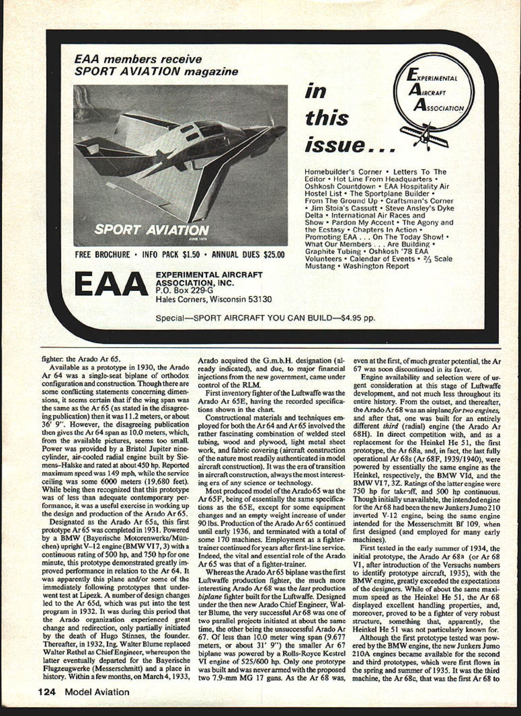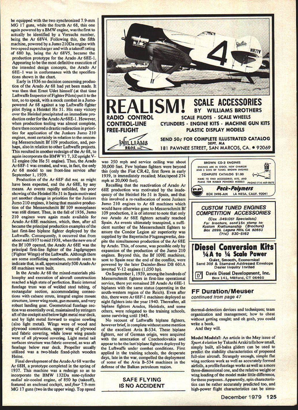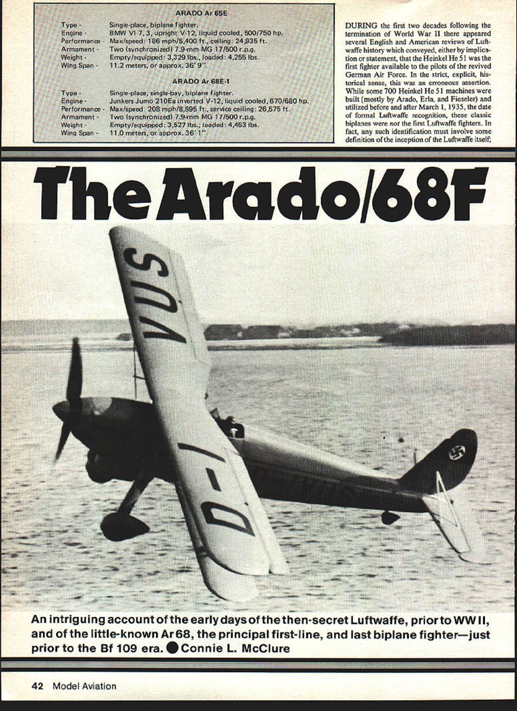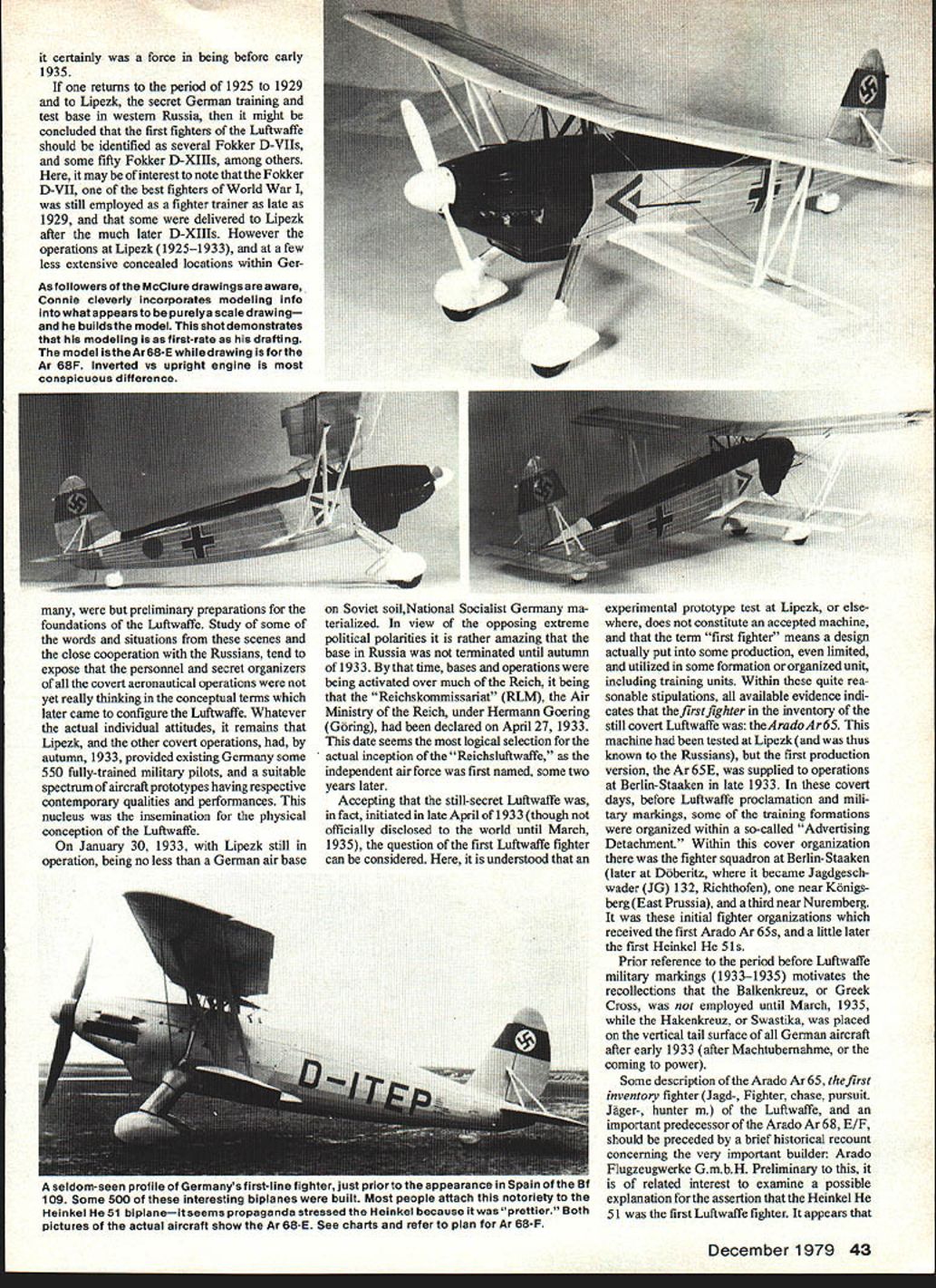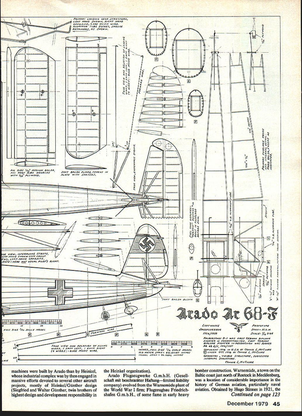 DURING first two decades following termination World War II appeared several English American reviews Luft waffe history conveyed either implica tion statement Heinkel 51 first fighter available pilots revived German Air Force strict explicit torical sense erroneous assertion some 700 Heinkel 51 machines built mostly Arado Erla Fieseler utilized before after March 11935 date formal Luftwaffe recognition classic biplanes first Luftwaffe fighters fact such identification must involve some definition inception Luftwaffe itself Arcido/68F An intriguing account earlydays then-secret LuftwarTe priorto WW II little-known Ar 68 principal first-line last biplane fighterjust prior Bf 109 era S Connie L McClure 42 Model Aviation 5001 935 tt certainly force being before early 1935 returns period 1925 1929 Lipezk secret German training test base western Russia might concluded first fighters Luftwaffe should identified several Fokker D-VIIs some fifty Fokker I-XIIIs among others may interest note Fokker D-VII best fighters World War still employed fighter trainer late 1929 some delivered Lipezk after much later D-XIIIs However operations Lipezk 19251933 few less extensive concealed locations within Ger Asfollowers McClure drawings aware Connie cleverly incorporates modeling info what appearsto purelya scale drawing builds model shot demonstrates modeling first-rate drafting model lstheAr68-E drawing forthe Ar 68F Inverted vs upright engine conspicuous difference preliminary preparations foundations Luftwaffe Study some words situations scenes close cooperation Russians tend expose personnel secret organizers covert aeronautical operations yet really thinking conceptual terms later came configure Luftwaffe Whatever actual individual attitudes remains Lipezk other covert operations autumn 1933 provided existing Germany some 550 fully-trained military pilots suitable spectrum aircraft prototypes having respective contemporary qualities performances nucleus insemination physical conception Luftwaffe January 30 1933 Lipezk still operation being no less German air base Soviet soilNational Socialist Germany ma terialized view opposing extreme political polarities rather amazing base Russia terminated until autumn 1933 time bases operations being activated over much Reich being Reichskomrnissariat RLM Air Ministry Reich under Hermann Goering Goring declared April 27 1933 date seems logical selection actual inception Reichsluftwaffe independent air force first named some two years later Accepting still-secret Luftwaffe fact initiated late April 1933 though officially disclosed world until March 1935 question first Luftwaffe fighter can considered understood experimental prototype test Lipezk else does constitute accepted machine term first fighter means design actually put some production limited utilized some formation organized unit including training units Within quite rea sonable stipulations available evidence indi cates first fighter inventory still covert Luftwaffe theAradoAr65 machine tested Lipezk thus known Russians first production version Ar 65E supplied operations Berlin-Staaken late 1933 covert days before Luftwaffe proclamation mili tary markings some training formations organized within so-called Advertising Detachment Within cover organization fighter squadron Berlin- Staaken later Doberitz became Jagdgesch wader JG 132 Richthofen near Konigs berg East Prussia third near Nuremberg initial fighter organizations received first Arado Ar 65s little later first Heinkel Sis Prior reference period before Luftwaffe military markings 19331935 motivates recollections Balkenkreuz Greek Cross employed until March 1935 Hakenkreuz Swastika placed vertical tail surface German aircraft after early 1933 after Machtubernahme coming power Some description Arado Ar 65 first inventory fighter Jagd- Fighter chase pursuit Jager- hunter Luftwaffe important predecessor Arado Ar 68 E/F should preceded brief historical recount concerning very important builder Arado Flugzeugwerke GmbH Preliminary related interest examine possible explanation assertion Heinkel 51 first Luftwaffe fighter appears December 1979 43 seldom-seen profile Germanys tirst-Iine tighter just prior sne appearance opein ot tue log Some 500 interesting biplanes built Most people attach notoriety tne Heinkel 51 biplaneit seems propaganda stressed Heinkel because prettier Both pictures actual aircraft show Ar 68-E See charts refer plan Ar 68-F Rq Sne norur M4RD SAeSA + -K m 28S R1882 CROfltVtr flP CA4 fNW4flr* AASA APMAEIII\77JII o s atno jX woos2 --1 cncNs-osn*o-rs ncss BSARERS 4 4 SAR05 CRC, 110wv frALC PAOPELn-R S____ 4-MESS- O PLYWOOD APPAOXhoAnCfl St S 77 Sorr BALSA00 MOSVC WLRE 0//RNOpoonc OCAhECT/enS UtitmO 2rcoSrrneaoor a-r Ann rotr 60/JR PAWELSECMY Sr/JOEfl/ZERO/n- tiPIEMEnrES ST/JO CACAOS tj 00 sorso an-woos __ti fl/deS rySouoo CENrE PAnELS /OisR~A- COWx NC SEPARA OSS /nAAqO SAL/A 4SPAAAT/oe VLEWtCOvaCwnsCL-______--9A /5/ C REtOONEC AA AAOCLLVVT PRA Cr/CC K -- n - ___ r~ : COttdL/tO/E//N/LE AJSE4SLY -SE/JENCE-aor COwOALLO SEt r/O/9-E/oC/CE-rq ooT SECrOn CELL, WorE A/V COwL/n Fmonsoot STAT/ON C -flosS nor nrc PLATE 0/REEL 0 S/CO flLorE 239STAT/On C 7 MAC/I/A/C OR FLOE CR0/f 7R 5/ACOw/LOG SAoASAF/ ALC/5/JMROOSsy004/-ror/_____________STEOROF/LE ,r 38 DR/Oh 0/0/S s/AVEAL/OC AdOrE e LorE//c/no TO JA erroneous conclusion years after fact partially due graphic structure German propaganda 51 impressive looking airplane partially due vigor Heinkel public relations However latter part possible explanation no way intended impugn fundamental signifi cance Ernst Heinkel either entire evolution aviation essential contribu tions rather amaxing creation unprecedented expansion Luftwaffe deed candor ardent National Socialist would compelled admit Ernst Heinkel perhaps others working foundations facilitated inception Luftwaffe years before January 30 1933 Meanwhile parallel interest realixe Heinkel 51 44 Model Aviation ID 3D 3D r t-4 \Pnhn4nr A0~C CiSA SPA CrEJA