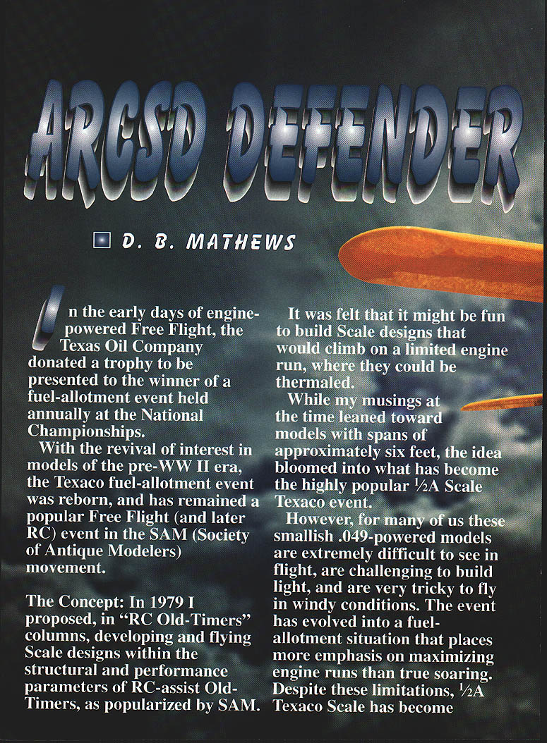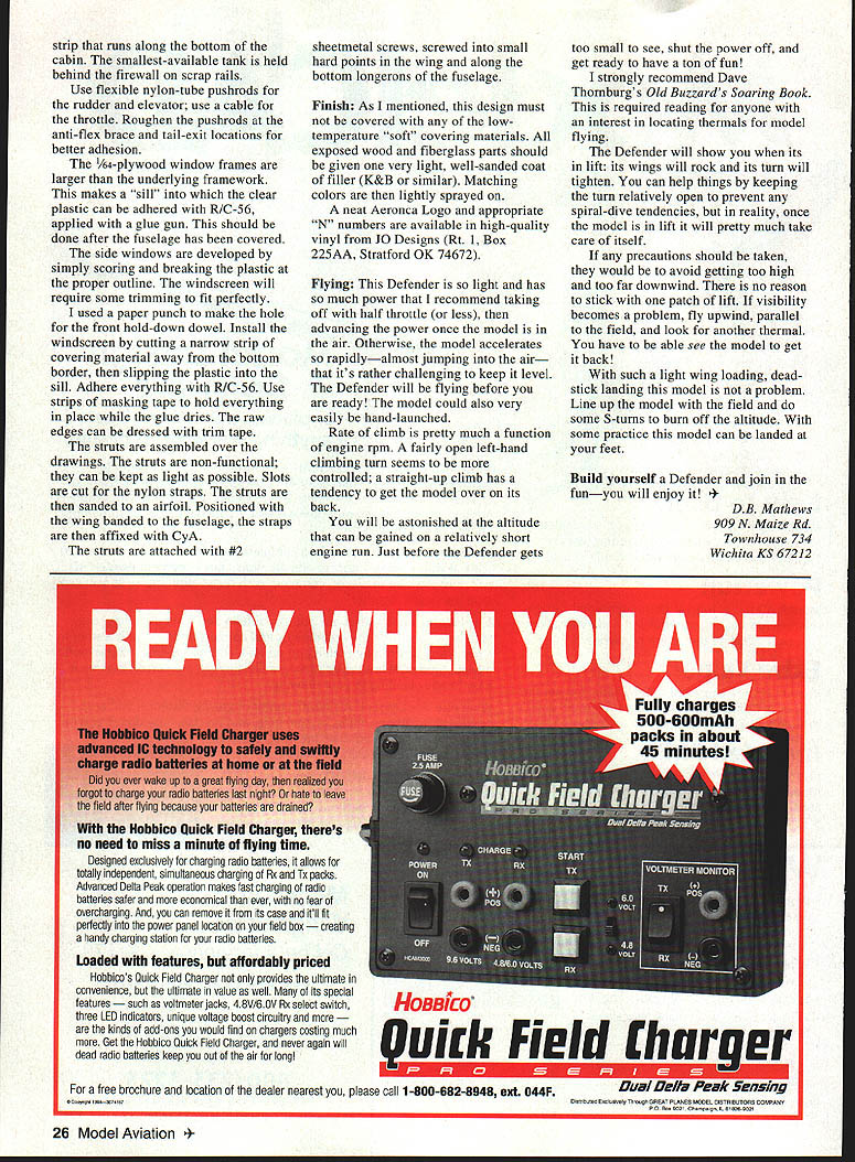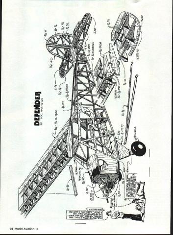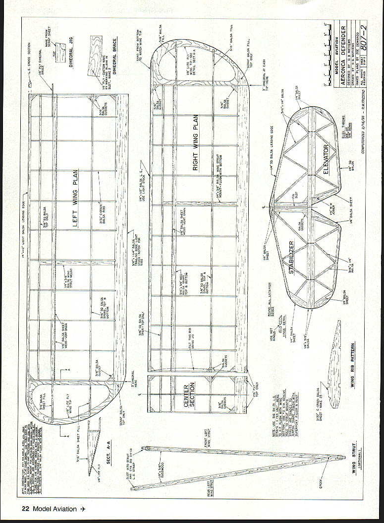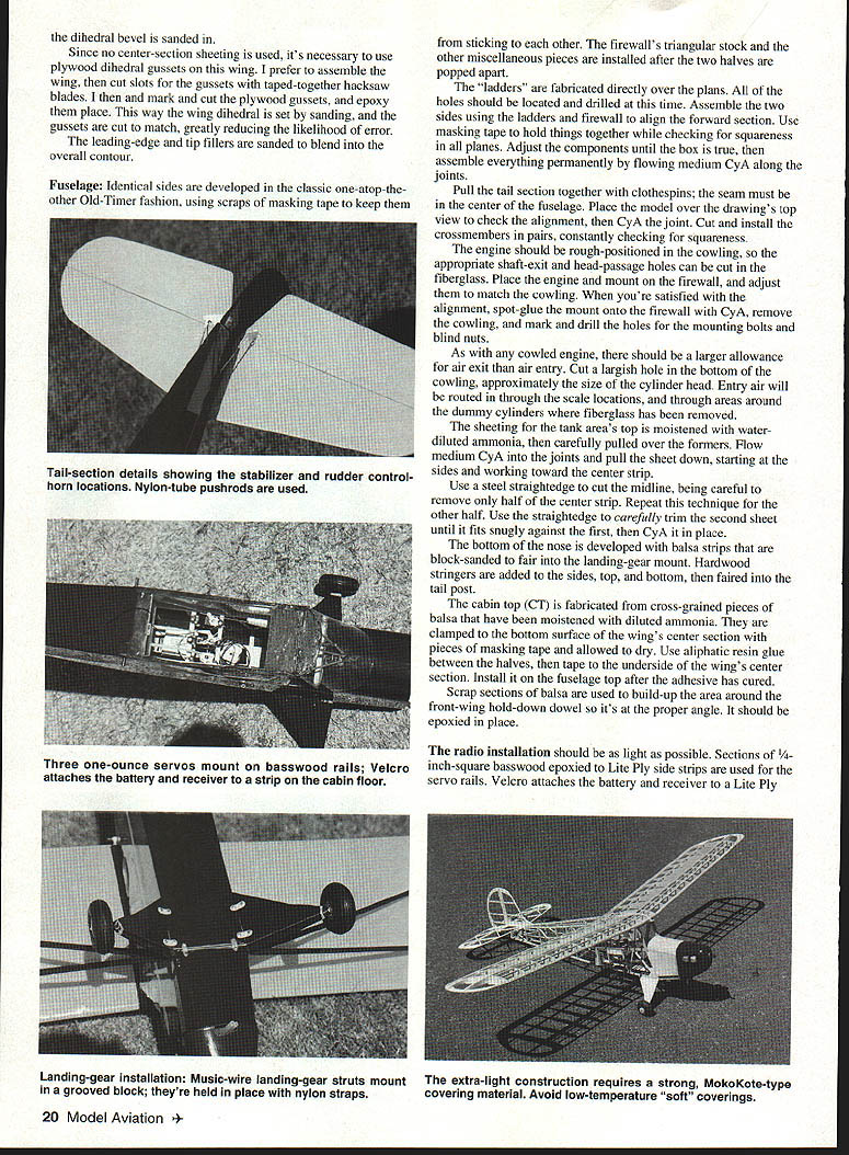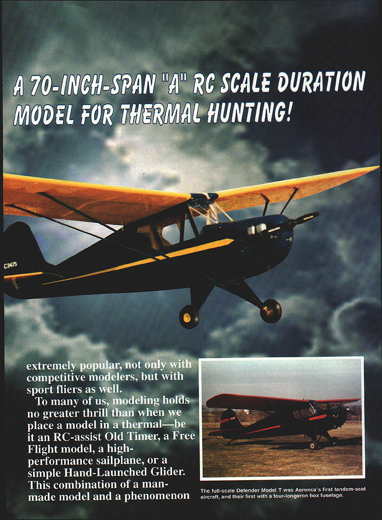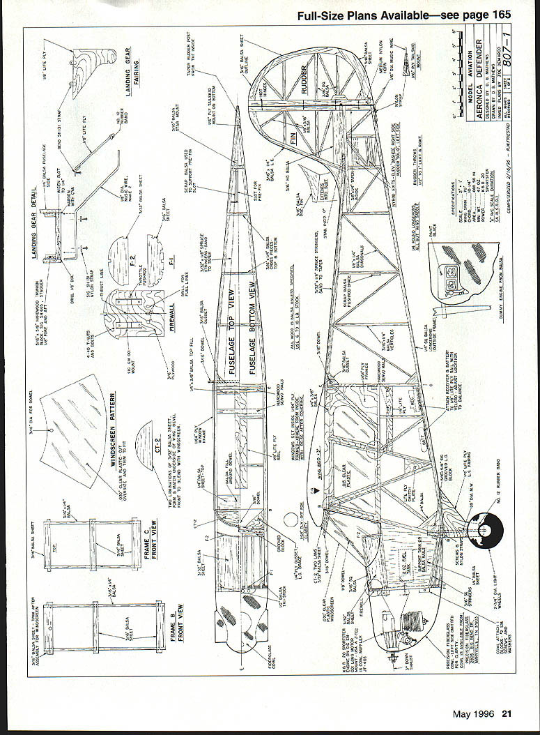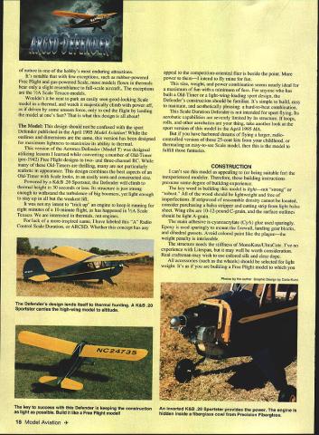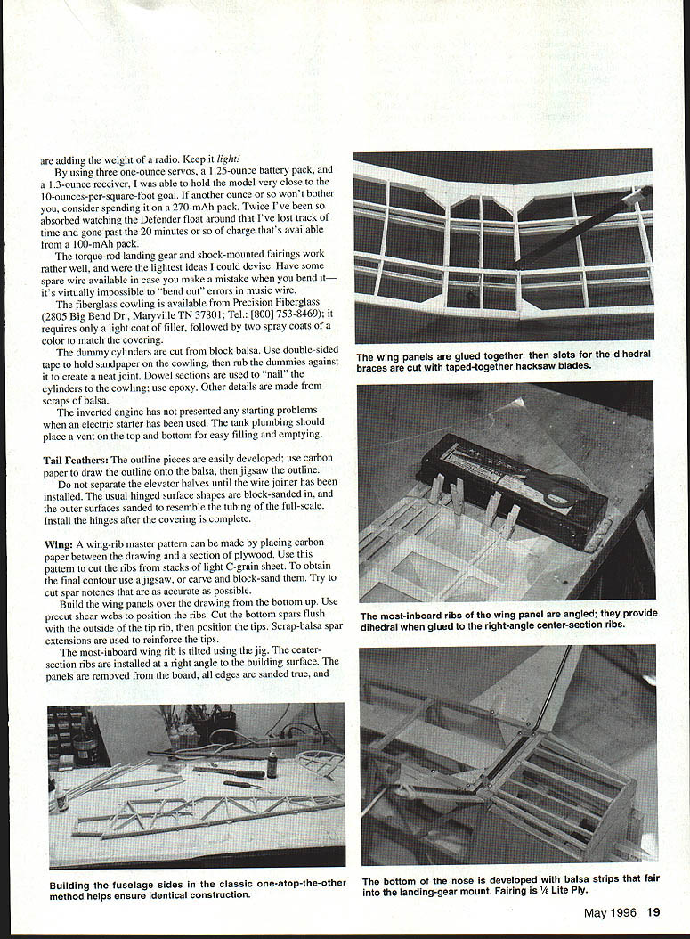 NO OCR TEXT NO OCR TEXT nature hobbys enduring attractions Its notable few exceptions such rubber-powered Free Flight gas-powered Scale models flown thermals bear slight resemblance full-scale aircraft exceptions Scale Texaco models Wouldnt neat park easily seen good-looking Scale model thermal watch majestically climb power off driven some unseen force end flight landing model ones feet what design about Model design should confused sport Defender published April 1995 Model Aviation outlines dimensions same version has designed maximum lightness maximize its ability thermal version Aeronca Defender Model T designed utilizing lessons learned converting number Old-Timer pre-1942 Free Flight designs two- three-channel RC Old-Timers thrilling particularly realistic appearance design combines best aspects Old-Timer Scale looks easily seen constructed size Powered K&B 20 Sportster Defender will climb thermal height 30 seconds less Its structure just strong enough withstand turbulence big boomers yet light enough stay up weakest lift intent trick up engine keep running eight minutes 10-minute flight has happened Scale Texaco interested thermals engines lack more-inspired name have labeled Radio Control Scale Duration ARCSD Whether concept has appeal competition-oriented flier beside point power themI intend fly fun size weight power combination seems nearly ideal maximum fun minimum fuss anyone has built Old-Timer light-wing-loading sport design Defenders construction should familiar Its simple build easy maintain aesthetically pleasing hard-to-beat combination Scale Duration Defender intended sport flying Its aerobatic capabilities severely limited its structure loops rolls other aerobatics thing take another look sport version model April 1995 MA have harbored dreams flying larger radiocontrolled version 25-cent kits childhood thermaling easy-to-see Scale model model fulfill fantasies CONSTRUCTION cant see model appealing being suitable inexperienced modeler Therefore building instructions presume some degree building experience key word building model lightnot strong robust wood should lightweight free imperfections stripwood reasonable density cannot located consider purchasing balsa stripper cutting strip light balsa sheet Wing ribs 10-12-pound C-grain surface outlines should light A-grain main adhesive cyanoacrylate CyA glue used sparingly Epoxy used sparingly mount firewall landing gear blocks dihedral gussets Avoid colored paint like plaguethe weight penalty intolerable structure needs stiffness MonoKote/UltraCote Ive no experience Litespan may well worth consideration Real craftsman may wish use colored silk clear dope accessories such wheels should selected light weight Its building Free Flight model key success Defender keeping construction An inverted K&B 20 Sportster provides power engine light possible Build likes Free Flight model hidden inside fiberglass cowl Precision Fiberglass 18 Model Aviation nders design lends itself thermal hunting K&B 20 Sportster carries high-wing model altitude Photos author Graphic Design Carla Kunz adding weight radio Keep light using three one-ounce servos 125-ounce battery pack 13-ounce receiver able hold model very close 10-ounces-per-square-foot goal another ounce wont bother consider spending 270-mAh pack Twice Ive absorbed watching Defender float around Ive lost track time gone past 20 minutes charge thats available 100-mAh pack torque-rod landing gear shock-mounted fairings work rather well lightest ideas could devise Have some spare wire available case make mistake bend its virtually impossible bend out errors music wire fiberglass cowling available Precision Fiberglass 2805 Big Bend Dr Maryville TN 37801 Tel [800] 753-8469 requires light coat filler followed two spray coats color match covering dummy cylinders cut block balsa Use double-sided tape hold sandpaper cowling rub dummies against create neat joint Dowel sections used nail cylinders cowling use epoxy Other details made scraps balsa inverted engine has presented starting problems electric starter has used tank plumbing should place vent top bottom easy filling emptying Tail Feathers outline pieces easily developed use carbon paper draw outline onto balsa jigsaw outline separate elevator halves until wire joiner has installed usual hinged surface shapes block-sanded outer surfaces sanded resemble tubing full-scale Install hinges after covering complete Wing A wing-rib master pattern can made placing carbon paper between drawing section plywood Use pattern cut ribs stacks light C-grain sheet obtain final contour use jigsaw carve block-sand Try cut spar notches accurate possible Build wing panels over drawing bottom up Use precut shear webs position ribs Cut bottom spars flush outside tip rib position tips Scrap-balsa spar extensions used reinforce tips most-inboard wing rib tilted using jig centersection ribs installed right angle building surface panels removed board edges sanded true Building fuselage sides classic one-atop-the-otherThe bottom nose developed balsa strips fair method helps ensure identical constructioninto landing-gear mount Fairing /e Lite Ply May1996 19 wing panels glued together slots dihedral braces cut taped-together hacksaw blades most-inboard ribs wing panel angled provide dihedral glued right-angle center-section ribs dihedral bevel sanded Since no center-section sheeting used its necessary use plywood dihedral gussets wing prefer assemble wing cut slots gussets taped-together hacksaw blades mark cut plywood gussets epoxy place way wing dihedral set sanding gussets cut match greatly reducing likelihood error leading-edge tip fillers sanded blend overall contour Fuselage Identical sides developed classic one-atop-theother Old-Timer fashion using scraps masking tape keep sticking other firewalls triangular stock other miscellaneous pieces installed after two halves popped apart ladders fabricated directly over plans holes should located drilled time Assemble tw