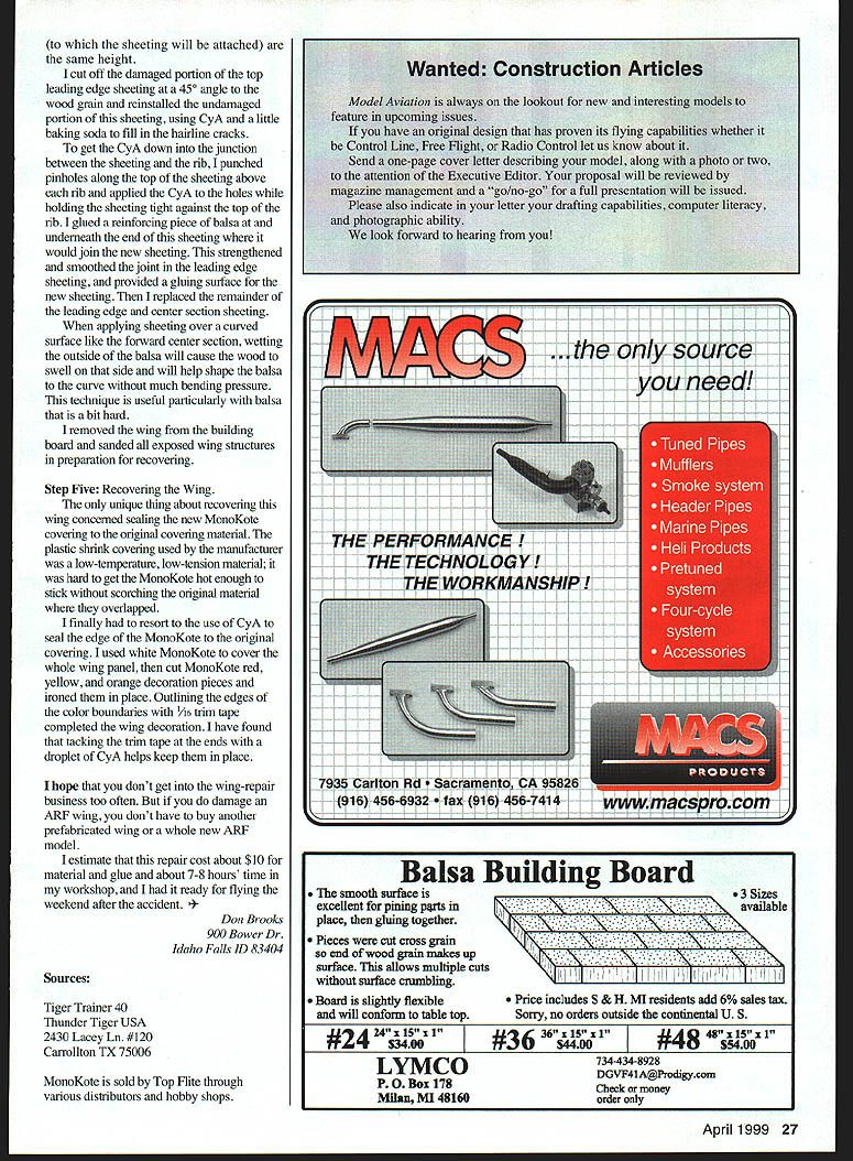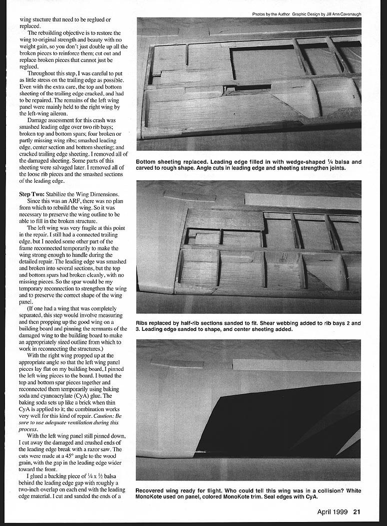 EPAIR U Don Brooks ONE OF THE skills serious RC pilot needs ability repair severely damaged wingeven Almost Ready Fly ARF model dont like build sooner later will still need know repair wing model No model flown frequently maintains its pristine newlybuilt beauty some attention modeler may very well experience event leaves model good wing wing thats shatteredas recently happened Heres repair tbat broken wing return Almost Ready Fly model its original beauty flyability procedure would also work kit-built wing Im AMA Introductory Pilot Instructor student future AMA member brought newly assembled Tiger Trainer 40 ARF field flight instruction See Analysis Crash page 33 process trying keep airplane running off runway took control bit late managed impale students airplane irrigation stake pretty sight left wing panel erupted shower balsa covering pieces airplane spun around ugly yellow stake sticking out top remains left wing quick survey showed damage included smashed broken leading edge broken top bottom spar members third rib bay out center wing trailing edge appeared undamaged So wing repair job damage often looks lot worse really So dont lose heart completed wing repair five easy steps Step Expose Damage first step remove plastic covering left wing also removed top side center-section balsa sheeting leading edge sheeting gain access damaged parts internal wing step essential expose cracked sheeting broken pieces 20 Model Aviation left wing spars survived crash reattached help stabilize wing shape allow further repair/replacement parts Making replacement rib pattern salvaged portions ribs damaged crash Ribs cut two easier replacement four ribs required wing stucture need reglued replaced rebuilding objective restore wing original strength beauty no weight gain dont just double up broken pieces reinforce cut out replace broken pieces cannot just reglued Throughout step careful put little stress trailing edge possible extra care top bottom sheeting trailing edge cracked repaired remains left wing panel mainly held right wing left-wing aileron Damage assessment crash smashed leading edge over two rib bays broken top bottom spars four broken partly missing wing ribs smashed leading edge center section bottom sheeting cracked trailing edge sheeting removed damaged sheeting Some parts sheeting salvaged later removed loose rib pieces smashed sections leading edge Step Two Stabilize Wing Dimensions Since ARF no plan rebuild wing So necessary preserve wing outline able fill broken structure left wing very fragile point repair still connected trailing edge needed some other part frame reconnected temporarily make wing strong enough handle during detailed repair leading edge smashed broken several sections top bottom spars broken cleanly no missing pieces So spar would temporary reconnection strengthen wing preserve correct shape wing panel wing completely separated step would involve measuring propping up good wing building board pinning remnants damaged wing building board make appropriately sized outline work reconnecting structures right wing propped up appropriate angle left wing panel pieces lay flat building board pinned left wing pieces board butted top bottom spar pieces together reconnected temporarily using baking soda cyanoacrylate CyA glue baking soda sets up like brick thin CyA applied combination works very well kind repair Caution sure use adequate ventilation during process left wing panel still pinned down cut away damaged crushed ends leading edge break razor saw cuts made 450 angle wood grain gap leading edge wider toward front glued backing piece balsa behind leading edge gap roughly two-inch overlap end leading edge material cut sanded ends April 1999 21 Bottom sheeting replaced Leading edge filled wedge-shaped balsa carved rough shape Angle cuts leading edge sheeting strengthen joints Ribs replaced half-rib sections sanded fit Shear webbing added rib bays 2 3 Leading edge sanded shape center sheeting added Recovered wing ready flight could tell wing collision White MonoKote used panel colored MonoKote trim Seal edges CyA wider piece a fit partially fill beveled gap leading edge glued place CyA filled small gaps baking soda CyA Step Three Rebuilding Wing Spar leading trailing edges now strong enough hold wing shape made permanent spar repair removed wing building board cut top bottom spars just outboard temporarily repaired break roughly 300 angleshallow enough generate long surface along splice cuts made crossing pattern splice top spar approximately 900 angle splice bottom spar important maximum strength carefully pried top bottom spar pieces free wing center joiner collision broken epoxy joints associated center joiner including tied top bottom spar members wing center joiner spar pieces come free easily would have used hot-air gun soften epoxy could work center pieces free Now could see wing center joiner constructed joiner consisted aluminum piece laminated between two pieces plywood metal piece drilled lightening holes collision delaminated pieces bent metal piece joiner backward None metal plywood pieces center joiner broken speaks well wing joiner design straightened metal seetion cut off damaged seetion inboard original top bottom spar pieees match angled cut made earlier using 30minute epoxy plenty working time relaminated wing center joiner glued top bottom spar splices together glued spar members wing center joiner clamped whole affair several small C-clamps vises set up overnight top bottom spars ended up about inch short center wing No problem plenty gluing surface along top wing center joiner Apples oranges. its like compar- enhancing dual ball bearings about ing Magnum other brands engines same price plain bearing engines Magnum offers much value Compare Magnums reliability model engineyoullperformance choice Compare .andchoosein air easyDual needle Comparevalve carbs Magnum sand precisionSchneurle CNC ma-porting give chine workyou high ef jewel-like finish other 