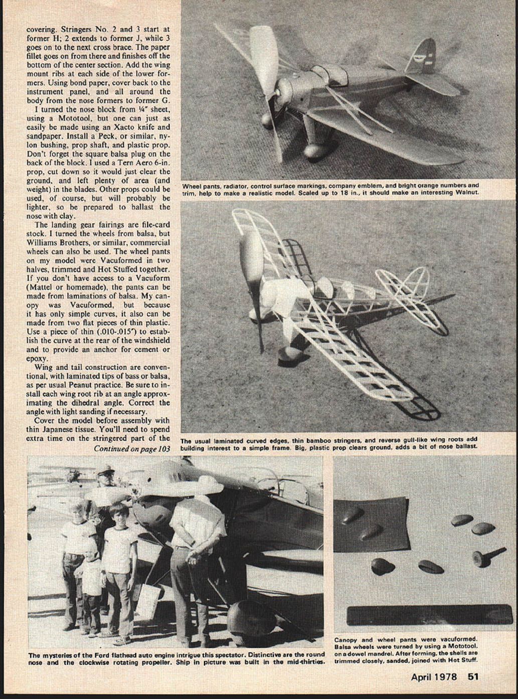 Powered Ford V-8 auto engine 1937 lightplane makes goodflying Peanut U Al Lidberg THE ARROW Sport V-8 airplane new ar now very nowered V-8 familiar ders Ford di choice mo icockpit N ckoit Lieu age owner concerned mai Ford engine c cost engines tected El Cen plane aed just 80 18018 set n 1 box tormers box take shape Bc r between epoxy Strir marked very ie minimun get ban grocery store just about can se splinters L5 stringers n some 1/32 wing fillet Th Lion pt dl nl flAdr gus No 2 tends fr next cross enter secti side paper foi e bi bu US it control surfa realistic mod ed edges t pIe frame top sleeve unwanted chrome remove flashing carbide tool fine stone realize full potential engine must make new head simply machine off center stock head leave hole new button head Make button head according drawing cut combustion chamber first drilling #3 hole tap running -in ball end mill up until touches #3 hole make chamber milling additional 090 Now reassemble rest engine dry leaving plug out now can replace stock head bolts metric Allen Screws OS Max 405R11 replace ment set screws works fine Spin engine again before should still no binds anywhere piston drags TDC either will have lap piston rehone cylinder carefully until absolutely no bind top check ultimate fit compression seal put few drops Marvel Mystery Oil engine flip engine over few times prop should snap very smartly hold compression TDC least five seconds Remember tight engine does necessarily mean has good seal entire exercise have gone through has designed eliminate possible friction Careful honing lapping will give perfect seal bind cylinder best fit will allow piston whistle right through yet seal perfectly Dont forget quirt some WD40 similar oil rear exhaust carb intake fully lubricate everything OK now fun part testing break-in Mix some fuel consisting 75% nitro 5% propelene oxide 20% Ucon 2270 Klotz sold SIG use cas tor oil under circumstances will gum up fine engine ruin fit use 75-5-20 time would advise forget about black magic fuel department Set up engine test stand K&B short plug bladder 6-7 Rev-Up tach prop Put four five 2-oz blad ders through engine fast four-cycle seat piston plug blows pull head clean out little beads element Now tach engine full rpm 10 15 seconds being sure let go too lean time should get some between 22500 23000 rpm will blow plug time better have few hand further check engine attach Rossi header pipe set II 3/s measured glowplug end pipe Still using 6-7 Rev-up tach should read around 26000rpm maybe little 6-8 Rev-up flying prop engine should capable 180mph Speed have questions call us Speed Racing Specialties 713 723RIC Model Spectacular exciting biggest Model Craft Show yet presenting panorama models planes helicopters cars boats Also U-control free-flight models Model demonstrations will again attract thousands indoors outdoors new Long Beach Convention Center has artificial outdoor lake boat demonstrations special indoor track will allow demonstration electric model cars giant MACS Hobby Contest open 6463 Houston Texas Gene Hempel Tom Upton 301 N Yale Garland TX 75042 Arrow Sport/Lidberg continued page 51 fuselage top wing fillets tip would use numerous small pie ces tissue cover fillet Make up wing struts bit longer shown plan youll able trim exact length leave off now As semble wing panels body 5-minute epoxy lightly tack glue tail surface place youll able change stabilizer angle major trim change needed Now ready dope color paint thin coat clear nitrate dope hobbyists will present 200 awards outstanding models crafts Hundreds entries will display throughout show Show hours during giant two-day-only show Saturday April 22 10am 8pm Sunday April23 11 am 6 pm Special dealer-only hours scheduled Sunday 9-11 am Long Beach Convention Center beautiful Long Beach CA Harbor MACS Model Crafts Shows Inc thats needed tissue no luck locating dark gray tissue match NC 1801s gun-metal gray sprayed very thin coat Gun Metal Gray Floquil model railroad paint over tissue Flo quil really covers wont take much plane has orange NC numbers trim arrow fuselage side narrow band wing panel covers balsa leading edge used Floquil too mask cut Zip-a-tone Med-tac Adhesive Film drafting art supply store stuff looks like sheet magic mending tape probably would work well spraying num bers trim NCs laid out tn high stroke width used l/16-in-high white stick-on letters/ numbers NCs rudder Use razor point marker outline control surfaces Make couple Xerox copies April 1978 103 8th Annual Model Craft Show April 22-23 Long Beach Convention Center MA Model Craft Shows Inc information call 714 986 8570 FULL-SIZE PLANS No218Fairchild Ranger 24$1000 RC Steve Saugers AMA Scale Sport Scale two bigsheets No 219Fokker Universal$500 FF Jumbo Scale rubber-powered model Bill Noonan No 220Bobcat$150 CL John Kilsdonks Stow Rat Racer latest state art No 221Insider$300 RC Indoors primarily electric power pulse rudder No 101Short Seamew 40-powered Class carrier model good prototype lends itself toinnovations$300 No 103Kloud King 15-19 RC Old-Timer Free Flight based upon 1938 record breaker FF$400 No104Wiley Post Biplane Pet tedurable scale designforeitherrubber tail wagger pulserudderl$225 No1125neat Sport AC glider simple job can flown orwithout engine$276 No 118GollyGeeWhiz Dan Rutherfords simple Half-A powered Combat job turns dime$150 No 121Gremlin Sturdy serobatic RC biplane flies well 35s up 60s$300 No 1234-Bits 40-powered AC 500 Club Racer has winning ways Good sport too$400 No 124Semi-Pro Contest-winning HL glider has pop-up tail dethermalizer$100 No125HaIf-Korda rubber John Oldenkamps 1/2-size all-balsa Old-Timer$176 No 131Gea Bee Model V 40-powered AC stand-off scale great old-time racers$500 No 134Callisto superb Standard Class RC sailplane also took Nets first$400 No 136Fieseler Storch AC scala model 23-45 5-channel has both slots flaps$400 No 141Blackburn Monoplane AC Scala rendition history-maker wheels floats 40engine No 148QuickSilver AC 1