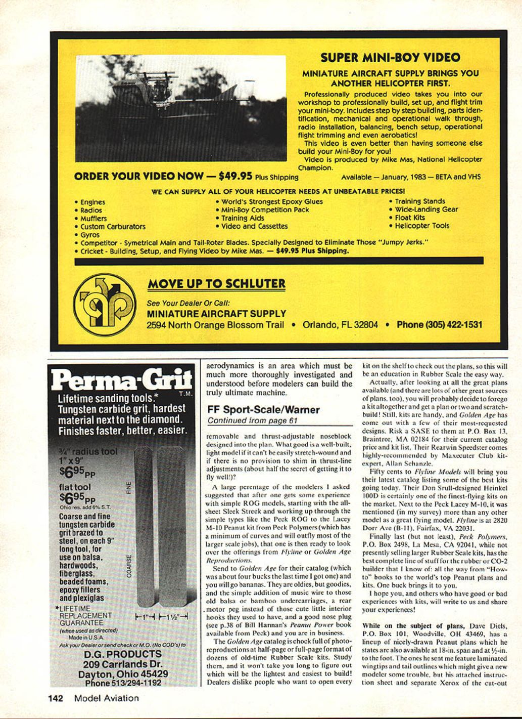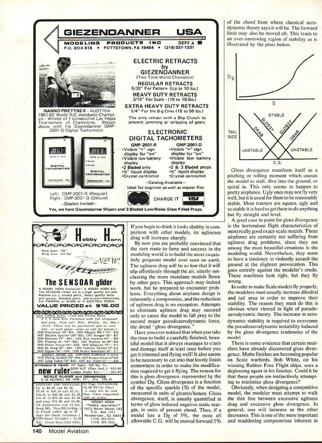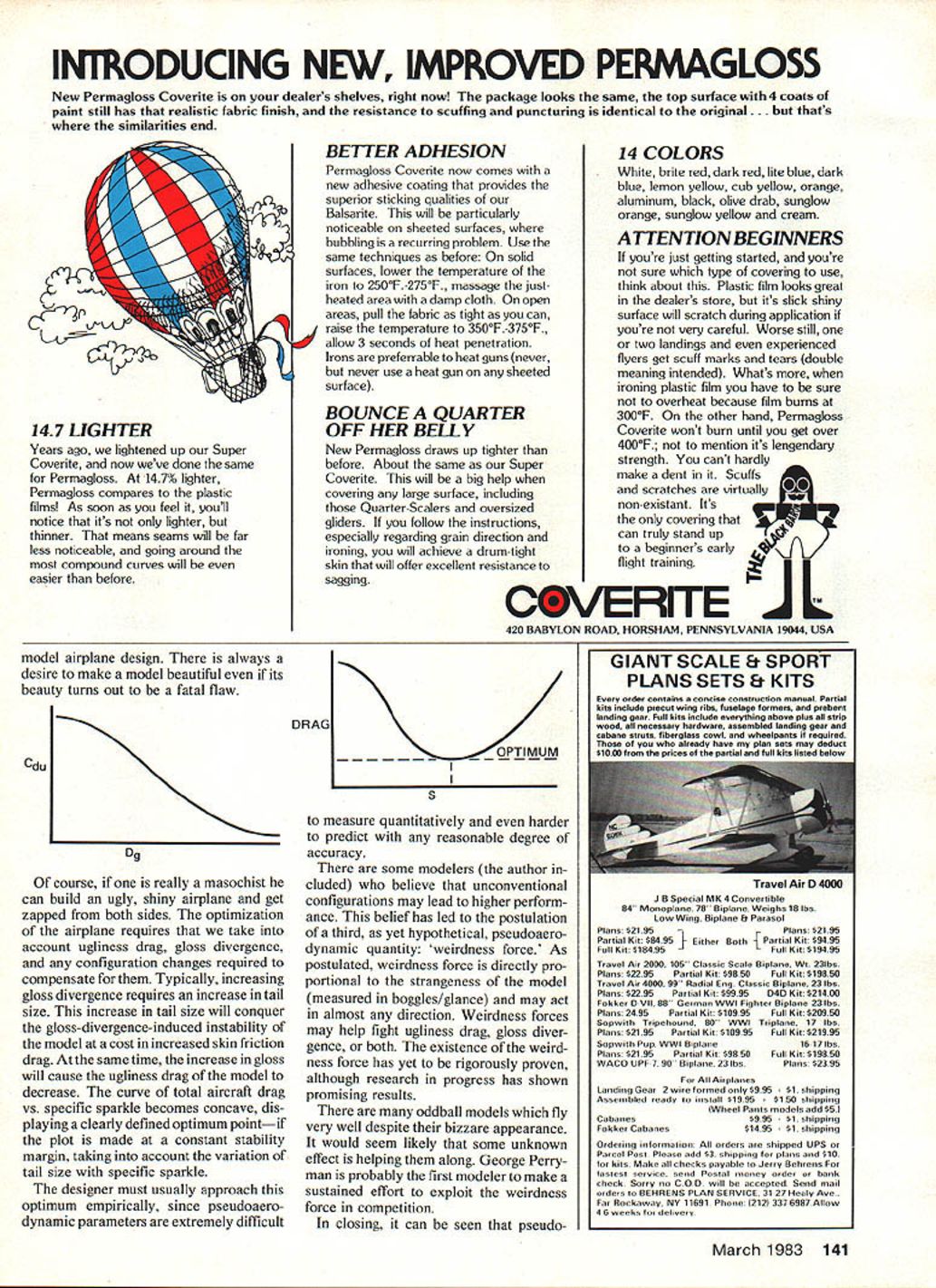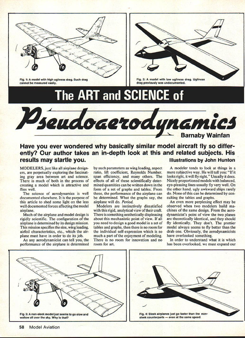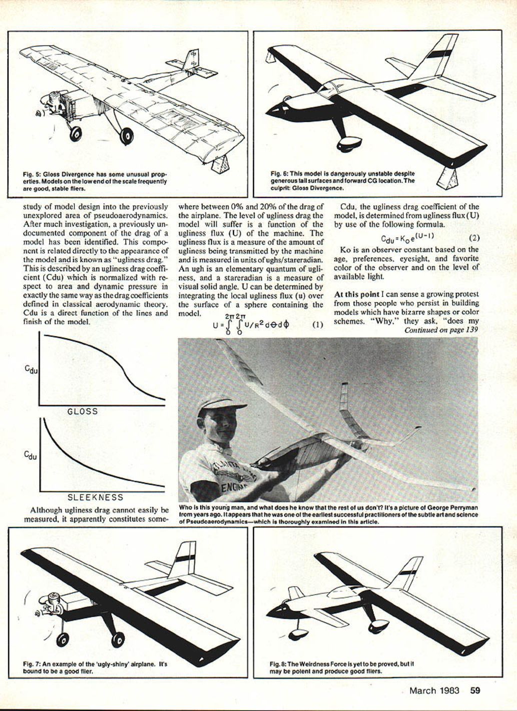 Fig 1 model high ugliness drag Such drag cannot measured easily -y Fig 2 model low ugliness drag Ugliness drag previously undocumented Barnaby Wainfan Have ever wondered basically similar model aircraft fly differ ently author takes in-depth look related subjects results may startle youIllustrations John Hunton MODELERS just like airplane design ers perpetually exploring fascinat ing gray area between art science much both process creating model attractive flies well science aerodynamics well documented elsewhere purpose article shed some light less well documented forces affecting model airplane Much airplane model design rigidly scientific configuration airplane determined its design mission mission specifies size wing loading airfoil characteristics etc air plane must have order its job As aerodynamicist can tell performance airplane determined such parameters wing loading aspect ratio lift coefficient Reynolds Number span efficiency others effects of scientifically deter mined quantities can written down form set graphs tables performance airplane can determined What graphs say airplane will Period Modelers instinctively dissatisfied rigid analytical view craft something aesthetically displeasing about mechanistic point view need design good model set tables graphs no room individual self-expression much part enjoyment modeling no room innovation no room art modeler tends look things subjective way will tell looks right itwillflyright Usuallyitdoes Nicely proportioned models balanced eye-pleasing lines usually fly very well other hand ugly awkward ships rarely None can determined con sulting tables graphs An perplexing effect may observed two modelers build ma chines same design nero dynamicists point view two planes theoretically identical should fly identically dont prettier model always seems fly better drab Obviously aerodynamicists have overlooked something order understand what has overlooked must expand 58 Model Aviation Fig 3 non-sleek model just seems go slow wallow over sky -y Fig 4 Sleek airplanes lust go Waster nonsleek counterparts speed study model design previously unexplored area pseudoaerodynamics After much investigation previously un documented component drag model has identified compo nent related directly appearance model known ugliness drag described ugliness drag coeffi cient Cdu normalized re spect area dynamic pressure exactly same way drag coefficients defined classical aerodynamic theory Cdu direct function lines finish model Cdu 0du GLOSS SLEEKNESS Although ugliness drag cannot easily measured apparently constitutes somewhere between 0% 20% drag airplane level ugliness drag model will suffer function ugliness flux U machine ugliness flux measure amount ugliness being transmitted machine measured units ughs/stareradian An ugh elementary quantum ugli ness stareradian measure visual solid angle U can determined integrating local ugliness flux u over surface sphere containing model2n2rr JU/R2d&d4 Cdu ugliness drag coefficient model determined ugliness flux U use following formula CduKoeUI2 Ko observer constant based age preferences eyesight favorite color observer level available light point can sense growing protest people persist building models have bizarre shapes color 1 schemes ask does Continued page 139 March 1983 59 N Fig 5 Gloss Divergence has some unusual prop erties Models low end scale frequently good stable fliers Fig 6 model dangerously unstable despite generous tail surfaces forward CG location culprit Gloss Divergence wruu Iruus young mini ano wnau uues ne KflOW war resi us gan ruts purure Ut teorge rerryman years ago appears earliest successful practitioners subtle art science Pseudoserodynamicswhlch thoroughly examined article 6 Fig 7 An example ugly-shiny airplane Its bound good flier Fig 8 Weirdness Force yet proved may potent produce good fliers BALSA SHEETS 36 1/16x2 1056290 3/32 2 10 p6398 1/8 2 10 ph385 3/16 2 10 skI435 1/4 2 10 pk499 1/163 10 pk 330 3/32 3 10 pk390 1/8 /3 10 pk480 3/16 3 5 pk275 1/4 3 5 phI325 5/16 3 5 pk350 3/8 3 5 pk395 5/2 3 5 pk495 3/4 32 pk280 1 s32p6350 1/18 4 10 pk520 3/32 4 5 ph315 1/9 a4 6 pk360 3/16n4 5561415 1/4 a4 5 skI495 LIGHT 4 6 LB 36 1/16s3lOpk430 3/32 310 pk490 1/8 s310 ph580 3/16 35 pk325 1/4 s39 pk375 3/8 35 pk495 1/2 n35 pk598 MATCHED SHEETS 42 3/32 44pk399 1/8 sd4pk429 3/16 445k459 1/4s44pk499 SALSASHEETS 46 1/16s310 ph440 3/32-5310 pk515 1/9 s310 pk635 3/16s35skI369 1/4 38pk425 3/8 35phI558 1/2 34ph960 1164lOphI680 3/32a 45pk419 1/6s45pk475 3/1645pk547 1/445ph600 T8AILING EDGE 36 14 xl6 pk200 6/1611/46pk250 3/S 1-1/2 6 ph 295 1/2 s2 4 ph299 BALSASHEETS 30 1/16 s310 pk275 3/32 310 pk325 1/8 s310 pk405 1/16x410 phI430 3/32 410 pk504 1/8s410 pk590 BALSA TRIANGLES 36 1/41/4 10 pk250 3/9 3/8 10 ph225 1/2 s 1/2 10 EkI 4 50 3/4a 3/4 5 pL209 1 15 ph275 BALSA STICKS 36 1/16s1/4170ph180 3/32 1/420 pk190 1/8 sq20 ph140 i/S sl/420 phI195 1/Sn1/220 pk315 3/16 sq20 pk215 1/4 sq20 ph315 1/4 sl/220 ph430 3/8 5910 pk275 3/8 s 1/210 pk315 1/2 sq10 ph360 48 STICKS ADO 25% PINESTICKS 36 1/8 sq10 pk125 1/8 si/A10 ph155 1/8 3/810 ph200 3/16 sq10 ph165 1/4 as110 014255 1/4 s3/8 10 pk295 3/8 sq10 pk320 48 STICKS ADD 25% BIRCH DOWELS 36~ 1/810pk85 3/1610pls109 1/410ph140 POPLAR LITE PLY 48 1/86 2 ph300 1/8s12 2 ph600 3ply 8IRCH PLYWOOD 48 1/32s12l ph425 1/16s121 ph435 1/8 s12 1 pk450 PLY BIRCH48 3/32s121ph520 1/8 a12 1 501585 3/16x121 pk585 1/4s12 1 pk600 FUN FLI 40STAR STIKLONE STARCOMING SOON raIner~vSTARRAT jSC Combat 51495 KWIKSTAR $2495 00 cke 500 51 SI/aS IS 40Eqoe151SSALE 51 Spas4DYsqoe48 Spos35 Enqos $1995Si 995$1895Fos Comoa54200 P55 25 9CS4895Fos 1 9858C5400 Kits feature foam wings balsa ply fuse Machine cut parts rugged VeryFos 4068RC5700 quick assembly outstanding value. Choice trike gear Bail dragger.Fox 45 668C5700 Fox Eagle III7500 Rdey Woolens UC Combat Shadom foam Cores-$t95 accept Visa Master Charge personal checks COD pay UpS 1/2Afoam Cores$495Handling charge -$300 add $200 COD 5% las TX US Carrency ac
