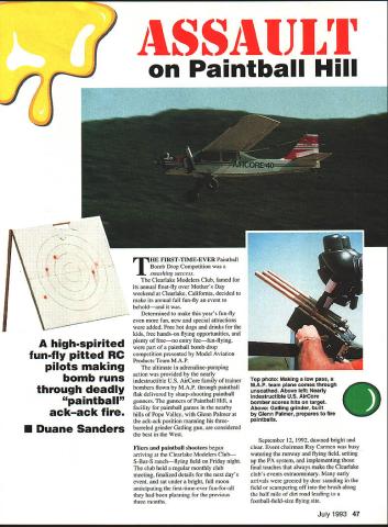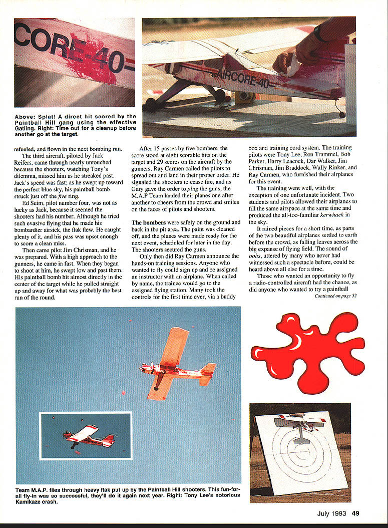 ASSAIJIl Paintball Hill N high-spirited fun-fly pitted RC pilots making bomb runs through deadly paintball ackack fire U Duane Sanders THE FIRST-TIME-EVER Paintball Bomb Drop Competition smashing success Clearlake Modelers Club famed its annual float-fly over Mothers Day weekend Clearlake California decided make its annual fall fun-fly event beholdand Determined make years fun-fly fun new special attractions added Free hot dogs drinks kids free hands-on flying opportunities plenty freeno entry feefun-flying part painthall bomb drop competition presented Model Aviation Products Team MAP ultimate adrenaline-pumping action provided nearly indestructible US AirCore family trainer bombers flown MAP through paintball flak delivered sharp-shooting paintball gunners gunners Paintball Hill facility paintball games nearby hills Pope Valley Glenn Palmer ack-ack position manning threebarreled grinder Gatling gun considered best West Fliers paintball shooters began arriving Clearlake Modelers Club S-Bar-S ranchflying field Friday night club held regular monthly club meeting finalized details next days event sat under bright full moon anticipating first-time-ever fun-for-all planning previous three months Top photo Making low pass MAP team plane comes through unscathed Above left Nearly indestructible US AirGore bomber scores hits target Above Gatling grinder built Glenn Palmer prepares fire paintballs September 12 1992 dawned bright clear Event chairman Ray Carmen busy watering runway flying field setting up PA system implementing final touches always make Clearlake clubs events extraorminary early arrivals greeted deer standing field scampering off brush along half mile dirt road leading football-field-size flying site July1993 47 Tables benches large sunscreen shade area plenty room comfortable pit space directly behind flight line fliers stations awaited participants After normal buzz pilots toting airplanes stuff pilots meeting called 9 am sharp prepare first fun-flying Meanwhile paintball shooters commanded Gary Bennett owner Paintball Hill making ready first bomb-drop event scheduled 10 am Glenn Palmer noted paintball world custom airguns equipment setting up heavy-hitting grinder Gatling gun first plane took air fun-flying began others followed flew hearts content until 10 o clock call clear field Ray Carmen explained crowd what going take place first Team MAP bomber pilots took off Airborne first Ron Trammel Tony Lee Jack Reifers Edwin Seim Jim Chrisman airborne few seconds apart Around came shooters flag up Ray Carmen reminded Gary Bennett let first five birds through practice run Ray announced Okay Gary theyre yours pilot Ron Trammel came fast low straight ahead direct line five-ringed target Get em yelled Gary sky lit up paintballs streaking multicolored arcs oncoming red white blue bomber Pop pop pop splat splat pop pop Past shooters plane roared lining up target bombardier releasing painthall bomb flick switch radio sent bright orange ball out bomb tube MAP bombdrop unit strapped side aircraft precision accuracy loud splat three ring target heard aircraft swooped up over target standing its flight path Next came 14-year-old Tony Lee youngest member Team MAP first pass Tony lined up perfect approach paint flew stayed straight headed directly target after taking heavy flak engine went dead critical moment Trying clear top eightfoot target Tony guided multisplattered airplane smashed directly four ring great whack hung like sleeping bat will forever known Kamikaze Lee Gary yelled Hes Glenn Palmer opened up grinder Gatling gun must have tracking Tony radar because barrage paint struck plane like hailstorm splats pop-pops second two Tonys US AirCore bomber plucked four ring vertical target 48 Model Aviation Bennett instructs lineup shooters Anyone wanted try using paintball gun opportunity participants hadnt seen paintballs action Team MAI pilOt 14-year-old Tony Lee gives Glenn Palmer paintball gunner some hands-on radio control training Above Plane bomb-run approach dodges paintballs air Note yellow bomb just released pass over target Left Team MAP members Jack Reifers Ron Trammel assisted Chick Thrasher ready bombers takeoff refueled flown next bombing run third aircraft piloted Jack Reifers came through nearly untouched because shooters watching Tonys dilemma missed him streaked past Jacks speed fast swept up toward perfect blue sky paintball bomb struck just off five ring Ed Seim pilot number four lucky Jack because seemed shooters number Although tried such evasive flying made bombardier airsick flak flew caught plenty pass upset enough score clean miss came pilot Jim Chrisman prepared high approach gunners came fast began shoot him swept low past paintball bomb hit almost directly center target pulled straight up away what probably best run round After 15 passes five bombers score stood eight scorable hits target 29 scores aircraft gunners Ray Carmen called pilots spread out land proper order signaled shooters cease fire Gary gave order plug guns MAP Team landed planes after another cheers crowd smiles faces pilots shooters bombers safely ground back pit area paint cleaned off planes made ready next event scheduled later day shooters secured guns Only did Ray Carmen announce hands-on training sessions Anyone wanted fly could sign up assigned instructor airplane called name trainee would go assigned flying station took controls first time ever via buddy box training cord system training pilots Tony Lee Ron Trammel Bob Parker Hany Leacock Dar Walker Jim Chrisman Jim Braddock Wally Rinker Ray Carmen furnished airplanes event training went well exception unfortunate incident Two students pilots allowed airplanes fill same airspace same time produced all-too-familiar kerwhack sky rained pieces short time parts two beautiful airplanes settled earth before crowd falling leaves across big expanse flying field sound oohs uttered never witnessed such spectacle before could heard above else time w