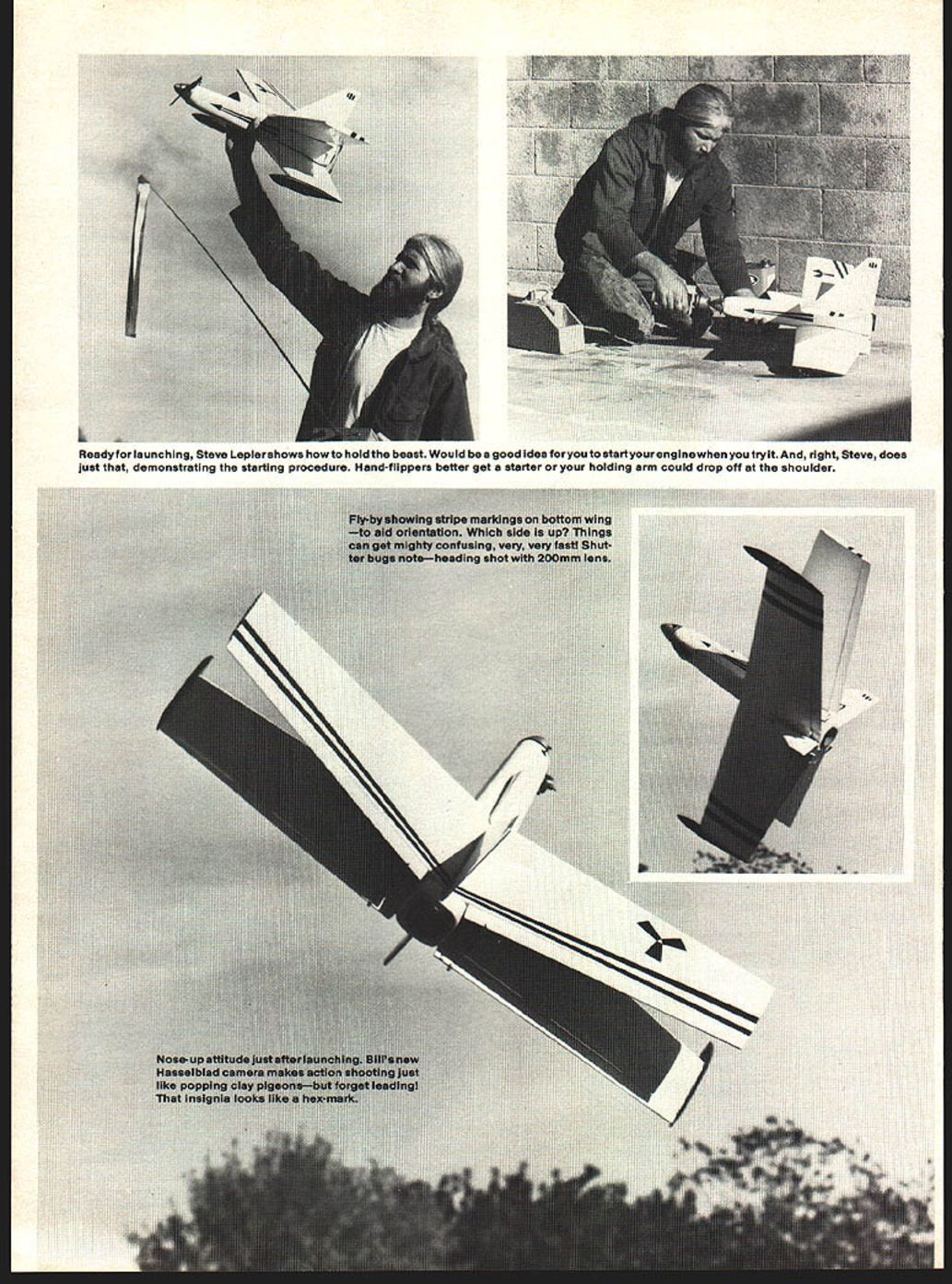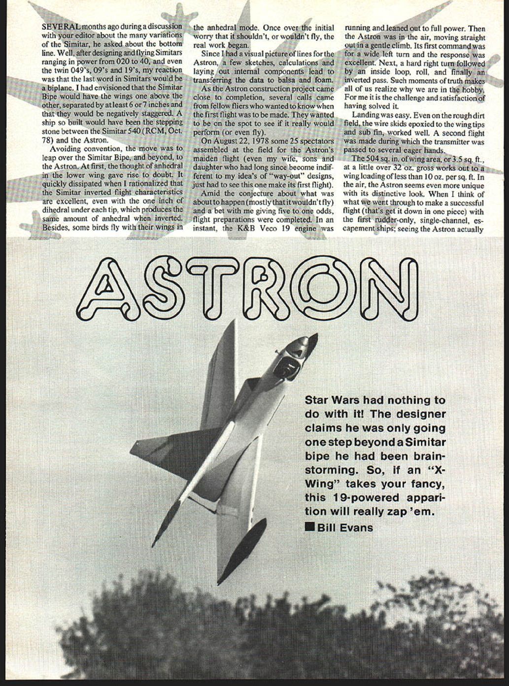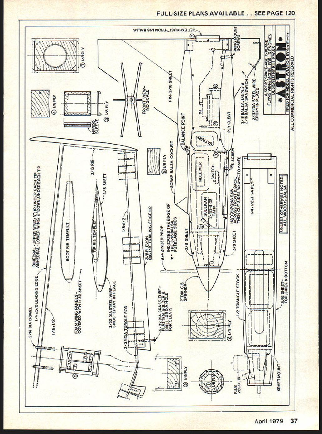 Wi line ranging lii twin 04 th nths ago during discusii about variatio bottom Simitars yen ship stone beV 78 and tfle Astron Avoiding conventi leap over th ral under tip amount anhedral me birds fly wi 4e anhedr Worry real Once oinitial 1ant orfly ines visual p sketch maic data constr wno w istobe sc ten fly 22 1978a fie iueas c o see tate conject ppenmos bet giving preparations cc ant K&B Veco 1 Ome indit designs rst flight hat ntfly odds running Jeaned 4ut full power air moving straight ide climb Its first comman left turn respons Next hard right ta inside loop roll ted pass Such moments tr us realize t] challenge satisiutiu having solved Landing easy rough dirt ire skids epoxied wing tips kd well second flight transmitter ata wing loading less U oz per sq ft air Astron seems unique its distinctive look think what wtit tbrough make successful flight tba et down piece first ddr-only single-channel es capement hips seeing Astron actually air gave feeling god flight has cheated would surely smash alien craft ground exciting perfectly normal aerobatic machine doesnt require toonuch balsa need 43/16 X 4 X36 1 364 1/32X63IAX3X 36 1 X 36 triangle 3/16 ply firewall Wing foam cores available $1600 plus $200 shipping 1/64 plywood wing sheeting $1400 plus $200 shipping Soaring Research 19216 Calvert St Reseda CA 91335 Editors Note may prefer order other sources also offer custom-cut foam reference given convenience event reader has no prior experience sending away cores Construction Glue pin a leading trailing edges foam cores making sure keep wing panels free bends warps Cut out fuselage sides top bottom formers firewall Pin fuselage botton down flat surface glue pin fuselage sides fuselage bottom Glue pin tnck thc inside corners whei e side meet bottom Glu Glue ngle stock ti fuselage edges fuselage top front 3/16 sheet ii pin rear former corner triaiij top bottom pin no blocks Trim top wing has 3 inches dihedral under tip bottom wing has 2 inches anhedral bottom wing joint best made sitting panels upside down surface blocking up tip 2 fuselage dry remove bench Sand front offuse square 1/16 ply nose ring Trim sa leading edgeson edge Cut ancshapt vertical stahtin oland final sandto shape Cover paw material usedwtnt ons winos ovement Film Mor install five-mi wermg Hinge ior free line gap used s shown tor five-minute epoxy attach vertical lower wing tip plates Note music wire epoxied bottom wing tip plates sub vertical stab Install engine tu*midradio balance per plans behind leading edge Install elevon oup1er per plans using 5/32 OD brass tubitig threaded rod snap links shown sure align four elevons Neutral position should set 3/32 inch above what would normally considered provide necessary required flying Flying Since th equipped dead-stic Due Astron ol landings no problem gear takeoffs ijo throw air proper hand launch merely run craft it As becomes airborne will hand its own contact cement such Sig double-sided sheeting transter t such Corefilm Join wing panels five-minute Personnaily cant concentrate enough k supposed show Weve seen good flying Greaea aims lowerwing L E butthis guy puts both wings tne Dae comas solder links bottom elevon should respona incidentally ians ract yc ship left theAstron sitting its wing skids Black Bait Oh Californians igine installation details photo AA bipes balancedweilforward n right showingthreaded links ontop ane flying wing April 1979 35 K / Readyfor launching Steve Lepler shows howto hold beast Would good idea foryou startyourenglnewhen try right Steve does just demonstrating starting procedure Hand-flippers better get starter holding arm could drop off shoulder 3/16 DIA DOWEL 5FOAM WING PANELS--- ____ ____ COVERED WITH 1/32 SHEET RIB 3/32 DIA STEEL WIRE 1/SKIDS-EPOXY IN PLACE IIf{32DIAJUEROD__ 5/32D1A BRASS TUBE FLATTEN SOLDER & DRILL ODIA HOLE FOR CLEVIS L1 1/8 PLY K I/4 FLY 1/2 TRIANGLE STOCK VECOI9 --1 KRAFT MOUNT 3/16 SHEETTOP SIDES & BOTTOM I/B PLY I0 NYROD III SLEEVE_ 1/8 PLY 1 K L 1/ PLY FRONT VIEWNO SCALE 9z4 FINGER PROP VTHE 3/IC IAk$SCRAP BALSA COCKPITFIN-3/16 SH T -____ r~ffFRECEIVER iIi I 2-TO-4O_____IIIriI 0TANK__141I I HATCHONA SAW6 SCRE 3/8 SHEET IE3/i6BALSAg/8pLy& 1 UNLESS vi twi NOTEDII IALL WOOD IS BALSAII J P IU PALLACL X-PLANE FLYING WING MODFI rnPioanw *ASTRON* ALL COMMERCIAL RIGHTS RESERVED 4 -J 4 0 N 0 L. 4 Id 0 CD CD 1 C cn N m -o z C, w m C, m m 0 m N3 0