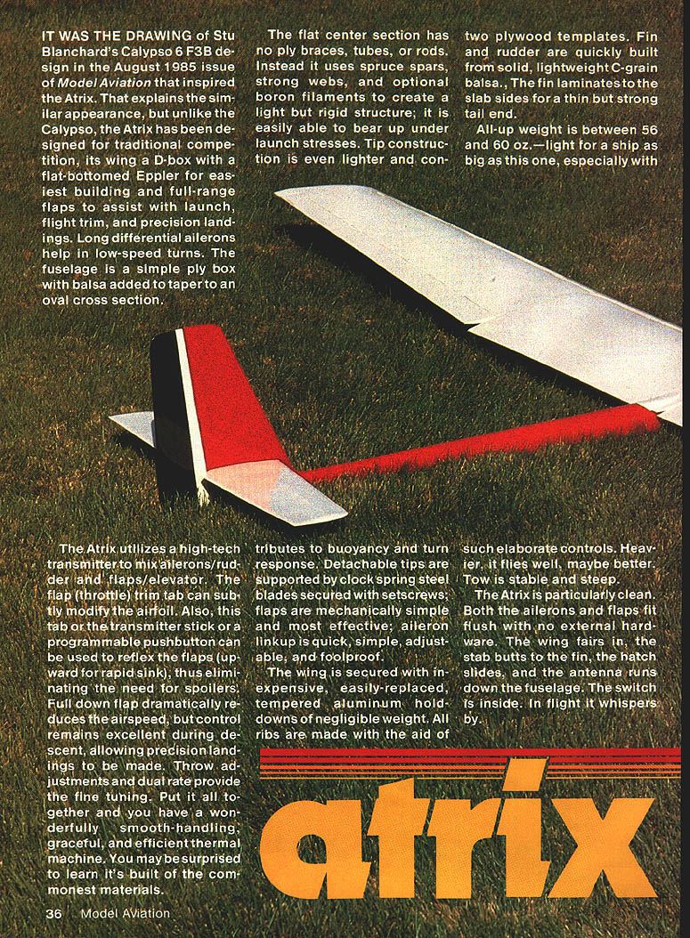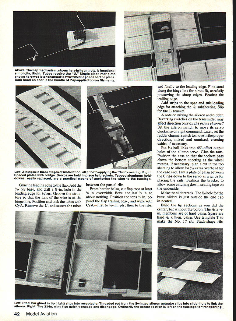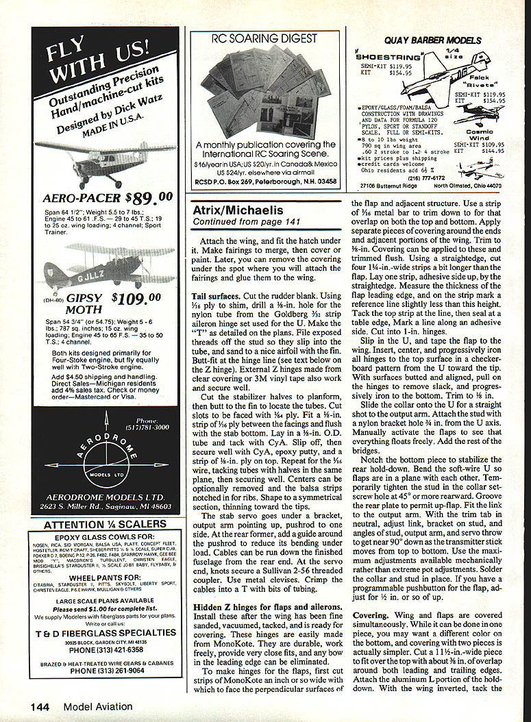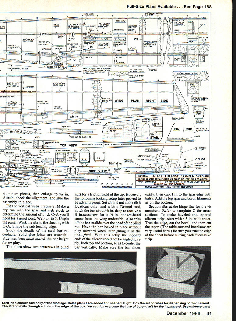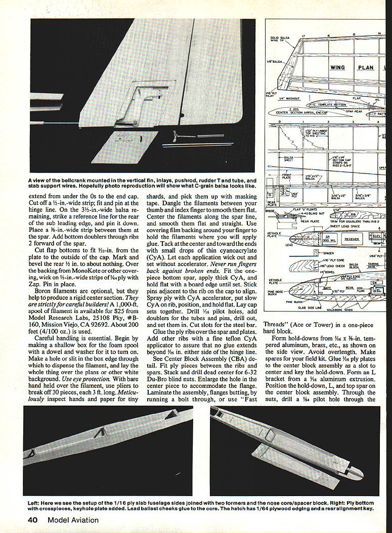 NO OCR TEXT NO OCR TEXT N Join plans center section Space Os aileron servo fits snug -in rails end Prepare po sition front rear plates shown Goldberg strip aileron hinge set wire Du-Bro 4-40 rod make U 3A2 collar slipped U axis floats flaps move Z hinges will detailed later File notches Os about -in deep li-in wide float about h-in wide /16 high allow clearance sockets couplers Attach piece /i6 x 3/4 x 1-in ply rear plate blind nut Other parts bridges go after hinging trued-up 4-in-wide 6-in harder balsa cut bottom leading edge sheets 38 Model Aviation Hidden Z hinges provide butt fit fiaps shown Same alierons Clean lines evident wing simple D-box construction Fuselage plywood balsa pine nose wont find much stickino outto create extra drag Pica author msmu ana iightweight tail surfaces sheet balsa fin laminates between fuse lage sides low stab position gives mini mum fuselage stress dork landing ange ps nave no external naraware wings nat center section aiiows simple Tllgnt-ready setup Text has details couple movement flaps stab Left wing secured tne nuseiage oy nternai tappea noia-aowns note tne comoinaiion law nuouvaun atthe front right picture Right Cables T fitting operate rudder Tail surfaces built -in sheet balsa optional cutouts ribs ATRIX THERMAL SOARER BALM PLY PINE BLOCK BY HARLEY MICHAELIS N N N NN K N N 16 BALSA LEAD i PLY PINE BLOCK ~N~ BALSA N N C-GRAIN NNbALSA N N N X 4LSA SPAR SWINGEE -4 BALSA RIBS N extend under Os end cap Cut off -in-wide strip fit pin hinge line 3-in-wide balsa re maining strike reference line rear sub leading edge pin down Place -in-wide strip between spar Add bottom doublers through ribs 2 forward spar Cut flap bottoms fit Y32-in plate outside cap Mark bevel rear t nothing Over backing MonoKote other cover ing wick -in-wide strips 4 ply Zap Pin place Boron filaments optional help produce rigid center section strictlyforcareful builders 1000-ft spool filament available $25 Model Research Labs 25108 Pky #B 160 Mission Viejo CA 92692 About 200 feet 4/100 oz used Careful handling essential Begin making shallow box foam spool dowel washer turn Make hole slit box edge through dispense filament lay whole thing over plans other white background Use eye protection bare hand held over filament use pliers break off 30 pieces 3 ft long Meticu lously inspect hands paper tiny shards pick up masking tape Dangle filaments between thumb index finger smooth flat Center filaments along spar line smooth flat straight Use covering film backing around finger hold filaments will apply glue Tack center andtowardthe ends small drops thin cyanoacrylate CyA Let application wick out set accelerator Never run fingers back against broken ends Fit onepiece bottom spar apply thick CyA hold flat board edge until set Stick pins adjacent rib cap align Spray ply CyA accelerator put slow CyA rib position hold flat Lay cap sets together Drill A6 pilot holes add doublers tubes pins drill out set Cut slots steel bar Glue ply ribs overthe spar plates Add other ribs fine teflon CyA applicator assure no glue extends beyond /I6 either side hinge line See Center Block Assembly CRA de tail Fit ply pieces between ribs spars Stack drill dead center 6-32 Du-Bro blind nuts Enlarge hole center piece accommodate flange Laminate assembly flanges butting running bolt through use Fast K 17IA SOLID BALSA WIAYSPYI/BBALSA/ ///WINGPLAN 9 VI6 PLY I4 WASRSJ1FLAP INLAYAlL C YSBBAAYE TYSANI ER SECTION AIBROIL EBIABRA REAR 4 1YA2PLY16II TOR 9IAETRBS I I 9 TORIBRI III IJJ BALSAVA TBATTEN CAP STRIPS SN RIBS 2-5917SPE TL16I2 PLATEBALSA 7L--- A64 II11 O/IA SST3/163/BII PLYBALSAII BALSA REAR z-- FLAP FlOATSV32 BAT REAR PLATEYR N FOR DOUBLERS TRIPS B B 2 EAD SPA EA RE HO E PLATE4I2AIlRECENEBI LEA BA4 PLY PLY CORE KEYHOLE PLATESW ANE NOSE32 PLYLIJNEL BlOCK 7 6 16001 SLAB ABE U SOIDBEHO BIDS Threads Ace Tower one-piece hard block Form hold-downs s x h-in tem pered aluminum brass etc shown side view Avoid overlength Make spares field kit Glue 6 ply plates center block assembly slot center key hold-down Form L bracket 6 aluminum extrusion Position hold-down L top spar center block assembly Through nuts drill %4 pilot hole through Left see setup 1/16 ply slab fuselage sides joined two farmers nose core/spacer block Right Ply bottom croaspleces keyhole plate added Lead ballast cheeks glue core hatch has 1/64 plywood edging rear alignment key 40 Model Aviation view belicrank mounted vertical fin inlays pushrod rudder T tube stab support wires Hopefully photo reproduction will show what C-grain balsa looks like Full-Size Plans Available. See Page 188 IDIIIS B RD SPARS I/LA PLY BRACE BALSA FILL SWE BAR IN TIP BLOCKED SPAT DIWEWAL OW PLY CAP NYLON TUBE RABRER{ SW NOEEIL OP SI WINGPLAN L E SHEET 00 /30 PLY N VIR BALSA OSEELERS28 PLY RIBS 2 TOO QW SN RT ON 3/32 GLADE PINBTUBE CAPS EORAIN WEBSV3U PLY C NOGAPZLW4 PLYIi lASSES SEE 3/lRVER11C---______ _______ TEST28SPRJVW% 22 SOLOER AIRHDLC1}KHiNOE OATSLIDES IL B OAT REAP _________ _____ 4SLOT AT DEFLECTNOTE IF STEEL SAP IS NOTCHES ___________ -0W4I/3tDEEPATOUTER I/H PLY RIBUR4 PLY BE OMITTEDI/lA PLY FRONT BSCREW ANTI -SOASE MAYIo-vBjJzc HjTIPS HAVE 3/30 -II12131415IA 7 4-40DL RU3/3t3RRDI B. WITH ALLENBALSA SPARSV PLATE V EAS SCREWSVB BALSA ETS WIDTH IS FUNCTION ______AP _________RIGHTSIDEOF SERVO CASE VIA BALSASLI-PB LANSHEET _______________ SHEET ONNYBSOAPTER BOTTOM zi OW 1/2 BALSAI WIDTH BUTT FIT BALSA BLOCK -OPTIONAL CATOSTWINO TIP AND RIBSSOS ALUM ANT-SOSSESTAR FILL VB4PLYBALSAITHINLTr IBRACHET 0lEND CAPAPEJKFINRUDBLSA ____--I1I/WID IIBATT BNOTCHTRIM BAR TO SLUE IN liP --BALSAAWSEATINS-____WIRE RAISE______________ ORArN 0TRI-STOCK TAPEVIEW—I/H4PLYSABOECKFIN IFSBuERS ATOP OBLES VB PLYVB PLYI/B___________ BL BRACKETI/IN PLY CROSOPIECES~7771VIJ1 CENTER BWCK-FITSkiVlrI PLY ITT BETWEEN S RII/YYIII B-BLI jAOSBLNSTSizzPROCTORVR PLY OAMLER COLLAP 4-40 BL EATTNO TAPEUN4PLOSWEL~= AP--SUB-RESIDE VIEW iCRIAA3/B TEMP ACOM HLDN N ALAWBAR E LSA DEER BLOCK DERITS BBS 372 440TRR ROD0I2345 BBASS