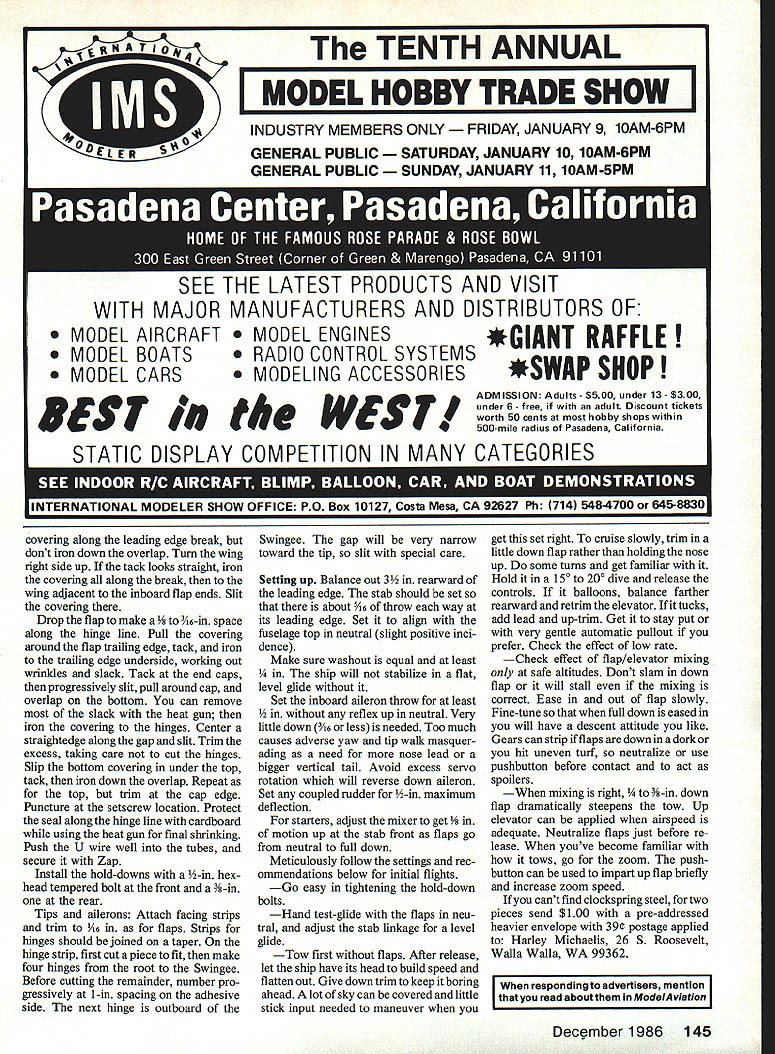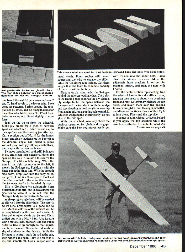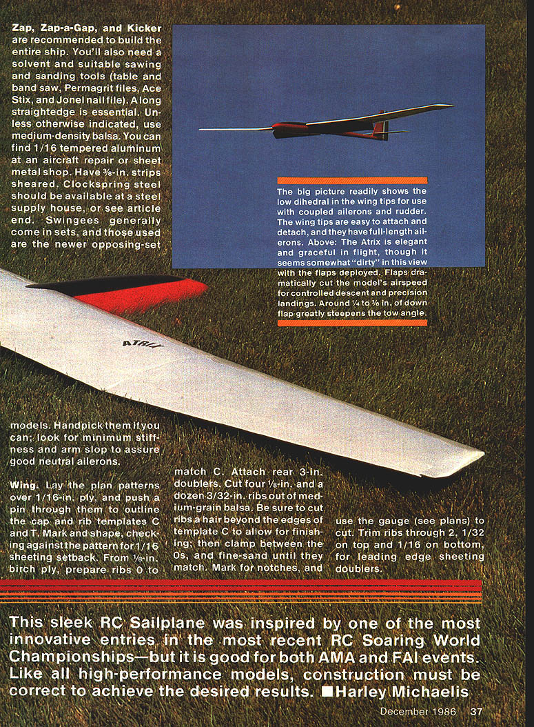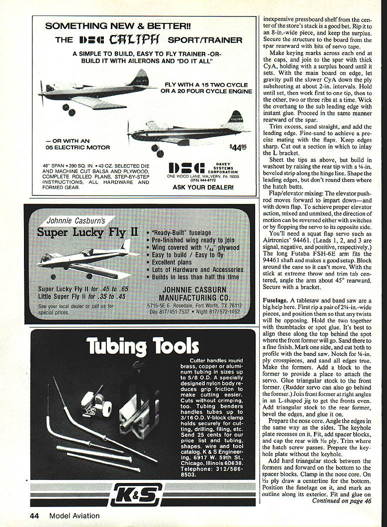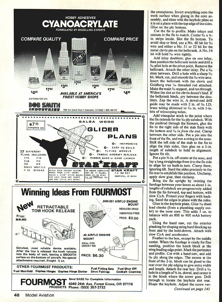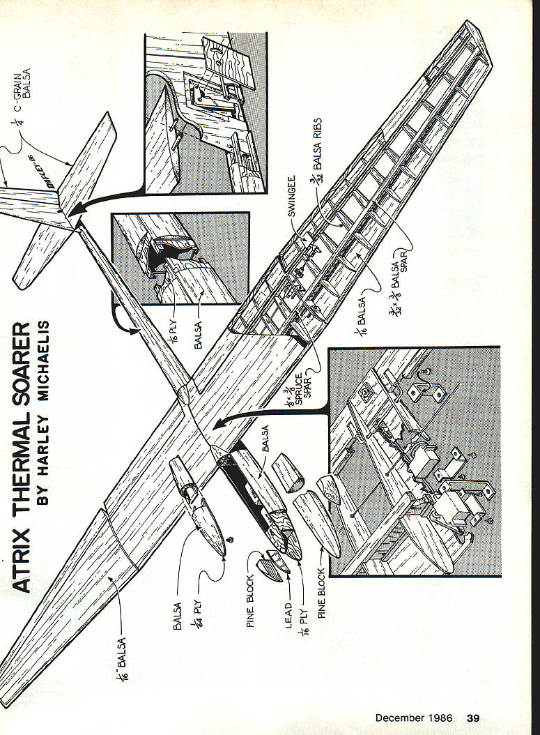 NO OCR TEXT NO OCR TEXT N Join plans center section Space Os aileron servo fits snug -in rails end Prepare po sition front rear plates shown Goldberg strip aileron hinge set wire Du-Bro 4-40 rod make U 3A2 collar slipped U axis floats flaps move Z hinges will detailed later File notches Os about -in deep li-in wide float about h-in wide /16 high allow clearance sockets couplers Attach piece /i6 x 3/4 x 1-in ply rear plate blind nut Other parts bridges go after hinging trued-up 4-in-wide 6-in harder balsa cut bottom leading edge sheets 38 Model Aviation Hidden Z hinges provide butt fit fiaps shown Same alierons Clean lines evident wing simple D-box construction Fuselage plywood balsa pine nose wont find much stickino outto create extra drag Pica author msmu ana iightweight tail surfaces sheet balsa fin laminates between fuse lage sides low stab position gives mini mum fuselage stress dork landing ange ps nave no external naraware wings nat center section aiiows simple Tllgnt-ready setup Text has details couple movement flaps stab Left wing secured tne nuseiage oy nternai tappea noia-aowns note tne comoinaiion law nuouvaun atthe front right picture Right Cables T fitting operate rudder Tail surfaces built -in sheet balsa optional cutouts ribs ATRIX THERMAL SOARER BALM PLY PINE BLOCK BY HARLEY MICHAELIS N N N NN K N N 16 BALSA LEAD i PLY PINE BLOCK ~N~ BALSA N N C-GRAIN NNbALSA N N N X 4LSA SPAR SWINGEE -4 BALSA RIBS N extend under Os end cap Cut off -in-wide strip fit pin hinge line 3-in-wide balsa re maining strike reference line rear sub leading edge pin down Place -in-wide strip between spar Add bottom doublers through ribs 2 forward spar Cut flap bottoms fit Y32-in plate outside cap Mark bevel rear t nothing Over backing MonoKote other cover ing wick -in-wide strips 4 ply Zap Pin place Boron filaments optional help produce rigid center section strictlyforcareful builders 1000-ft spool filament available $25 Model Research Labs 25108 Pky #B 160 Mission Viejo CA 92692 About 200 feet 4/100 oz used Careful handling essential Begin making shallow box foam spool dowel washer turn Make hole slit box edge through dispense filament lay whole thing over plans other white background Use eye protection bare hand held over filament use pliers break off 30 pieces 3 ft long Meticu lously inspect hands paper tiny shards pick up masking tape Dangle filaments between thumb index finger smooth flat Center filaments along spar line smooth flat straight Use covering film backing around finger hold filaments will apply glue Tack center andtowardthe ends small drops thin cyanoacrylate CyA Let application wick out set accelerator Never run fingers back against broken ends Fit onepiece bottom spar apply thick CyA hold flat board edge until set Stick pins adjacent rib cap align Spray ply CyA accelerator put slow CyA rib position hold flat Lay cap sets together Drill A6 pilot holes add doublers tubes pins drill out set Cut slots steel bar Glue ply ribs overthe spar plates Add other ribs fine teflon CyA applicator assure no glue extends beyond /I6 either side hinge line See Center Block Assembly CRA de tail Fit ply pieces between ribs spars Stack drill dead center 6-32 Du-Bro blind nuts Enlarge hole center piece accommodate flange Laminate assembly flanges butting running bolt through use Fast K 17IA SOLID BALSA WIAYSPYI/BBALSA/ ///WINGPLAN 9 VI6 PLY I4 WASRSJ1FLAP INLAYAlL C YSBBAAYE TYSANI ER SECTION AIBROIL EBIABRA REAR 4 1YA2PLY16II TOR 9IAETRBS I I 9 TORIBRI III IJJ BALSAVA TBATTEN CAP STRIPS SN RIBS 2-5917SPE TL16I2 PLATEBALSA 7L--- A64 II11 O/IA SST3/163/BII PLYBALSAII BALSA REAR z-- FLAP FlOATSV32 BAT REAR PLATEYR N FOR DOUBLERS TRIPS B B 2 EAD SPA EA RE HO E PLATE4I2AIlRECENEBI LEA BA4 PLY PLY CORE KEYHOLE PLATESW ANE NOSE32 PLYLIJNEL BlOCK 7 6 16001 SLAB ABE U SOIDBEHO BIDS Threads Ace Tower one-piece hard block Form hold-downs s x h-in tem pered aluminum brass etc shown side view Avoid overlength Make spares field kit Glue 6 ply plates center block assembly slot center key hold-down Form L bracket 6 aluminum extrusion Position hold-down L top spar center block assembly Through nuts drill %4 pilot hole through Left see setup 1/16 ply slab fuselage sides joined two farmers nose core/spacer block Right Ply bottom croaspleces keyhole plate added Lead ballast cheeks glue core hatch has 1/64 plywood edging rear alignment key 40 Model Aviation view belicrank mounted vertical fin inlays pushrod rudder T tube stab support wires Hopefully photo reproduction will show what C-grain balsa looks like Full-Size Plans Available. See Page 188 IDIIIS B RD SPARS I/LA PLY BRACE BALSA FILL SWE BAR IN TIP BLOCKED SPAT DIWEWAL OW PLY CAP NYLON TUBE RABRER{ SW NOEEIL OP SI WINGPLAN L E SHEET 00 /30 PLY N VIR BALSA OSEELERS28 PLY RIBS 2 TOO QW SN RT ON 3/32 GLADE PINBTUBE CAPS EORAIN WEBSV3U PLY C NOGAPZLW4 PLYIi lASSES SEE 3/lRVER11C---______ _______ TEST28SPRJVW% 22 SOLOER AIRHDLC1}KHiNOE OATSLIDES IL B OAT REAP _________ _____ 4SLOT AT DEFLECTNOTE IF STEEL SAP IS NOTCHES ___________ -0W4I/3tDEEPATOUTER I/H PLY RIBUR4 PLY BE OMITTEDI/lA PLY FRONT BSCREW ANTI -SOASE MAYIo-vBjJzc HjTIPS HAVE 3/30 -II12131415IA 7 4-40DL RU3/3t3RRDI B. WITH ALLENBALSA SPARSV PLATE V EAS SCREWSVB BALSA ETS WIDTH IS FUNCTION ______AP _________RIGHTSIDEOF SERVO CASE VIA BALSASLI-PB LANSHEET _______________ SHEET ONNYBSOAPTER BOTTOM zi OW 1/2 BALSAI WIDTH BUTT FIT BALSA BLOCK -OPTIONAL CATOSTWINO TIP AND RIBSSOS ALUM ANT-SOSSESTAR FILL VB4PLYBALSAITHINLTr IBRACHET 0lEND CAPAPEJKFINRUDBLSA ____--I1I/WID IIBATT BNOTCHTRIM BAR TO SLUE IN liP --BALSAAWSEATINS-____WIRE RAISE______________ ORArN 0TRI-STOCK TAPEVIEW—I/H4PLYSABOECKFIN IFSBuERS ATOP OBLES VB PLYVB PLYI/B___________ BL BRACKETI/IN PLY CROSOPIECES~7771VIJ1 CENTER BWCK-FITSkiVlrI PLY ITT BETWEEN S RII/YYIII B-BLI jAOSBLNSTSizzPROCTORVR PLY OAMLER COLLAP 4-40 BL EATTNO TAPEUN4PLOSWEL~= AP--SUB-RESIDE VIEW iCRIAA3/B TEMP ACOM HLDN N ALAWBAR E LSA DEER BLOCK DERITS BBS 372 440TRR ROD0I2345 BBASS