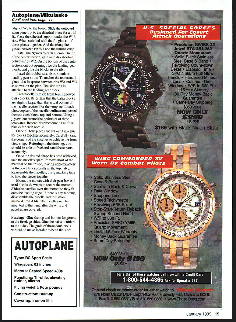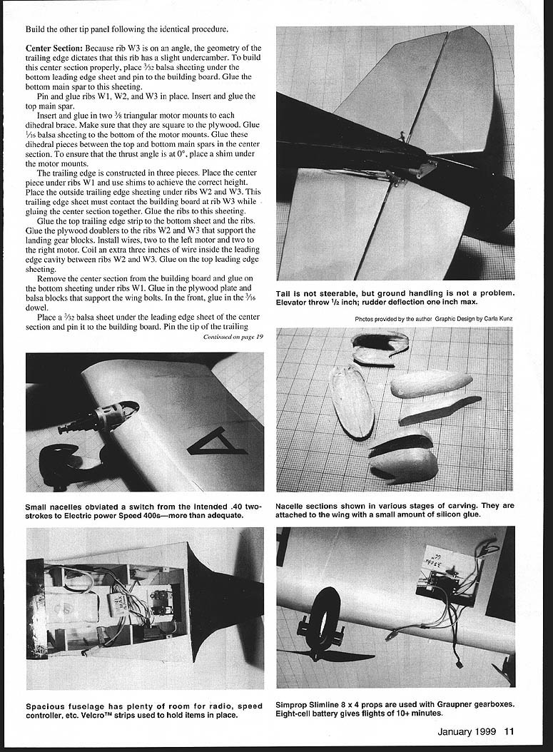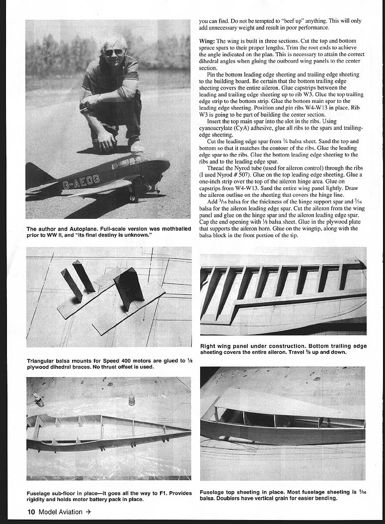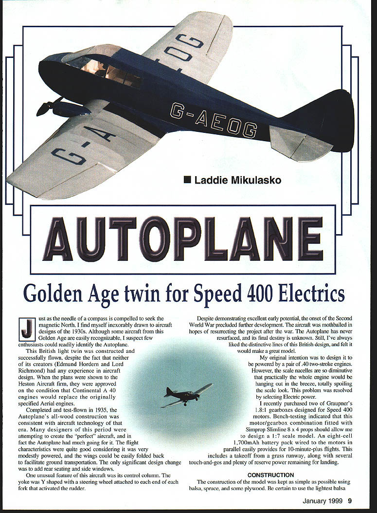 U Laddie Mikulasko 1 Golden Age twin Speed 400 Electrics ust needle compass compelled seek magnetic North find myself inexorably drawn aircraft designs 1930s Although some aircraft Golden Age easily recognizable suspect few enthusiasts could readily identify Autoplane British light twin constructed successfully flown despite fact neither its creators Edmund Hordern Lord Richmond experience aircraft design plans shown Heston Aircraft firm approved condition Continental 40 engines would replace originally specified Aerial engines Completed test-flown 1935 Autoplanes all-wood construction consistent aircraft technology era designers period attempting create perfect aircraft fact Autoplane much going flight characteristics quite good considering very modestly powered wings could easily folded back facilitate ground transportation significant design change add rear seating side windows unusual feature aircraft its control column yoke Y shaped steering wheel attached end fork activated rudder Despite demonstrating excellent early potential onset Second World War precluded further development aircraft mothballed hopes resurrecting project after war Autoplane has never resurfaced its final destiny unknown Still Ive always liked distinctive lines British design felt would make great model original intention design powered pair 40 two-stroke engines However scale nacelles diminutive practically whole engine would hanging out breeze totally spoiling scale look problem resolved selecting Electric power recently purchased two Graupners 181 gearboxes designed Speed 400 motors Bench-testing indicated motor/gearbox combination fitted Simprop Slimline 8 x 4 props should allow design 17 scale model An eight-cell 1700mAh battery pack wired motors parallel easily provides 10-minute-plus flights includes takeoff grass runway along several touch-and-gos plenty reserve power remaimng landing CONSTRUCTION construction model kept simple possible using balsa spruce some plywood certain use lightest balsa January1999 9 LLI AUTOPL E can find tempted beef up anything will add unnecessary weight result poor performance Wing The wing built three sections Cut top bottom spruce spars proper lengths Trim root ends achieve angle indicated plan necessary attain correct dihedral angles gluing outboard wing panels center section Pin bottom leading edge sheeting trailing edge sheeting building board certain tat bottom trailing edge sheeting covers entire aileron Glue capstrips between leading trailing edge sheeting up rib W3 Glue top trailing edge strip bottom strip Glue bottom main spar leading edge sheeting Position pin ribs W4-W 13 place Rib W3 going part building center section Insert top main spar slot ribs Using cyanoacrylate CyA adhesive glue ribs spars trailingedge sheeting Cut leading edge spar a sheet Sand top bottom matches contour ribs Glue leading edge spar ribs Glue bottom leading edge sheeting ribs leading edge spar Thread Nyrod tube used aileron control through ribs used Nyrod # 507 Glue top leading edge sheeting Glue one-inch strip over top aileron hinge area Glue capstrips W4-W13 Sand entire wing panel lightly Draw aileron outline sheeting covers hinge line Add 3/ balsa thickness hinge support spar /6 balsa aileron leading edge spar Cut aileron wing panel glue hinge spar aileron leading edge spar Cap end opening balsa sheet Glue plywood plate supports aileron horn Glue wingtip along balsa block front portion tip 10 Model Aviation or Autoplane Full-scale version mothballed prior WW II its final destiny unknown Triangular balsa mounts Speed 400 motors glued 1/8 plywood dihedral braces No thrust offset used Right wing panel under construction Bottom trailing edge sheeting covers entire aileron Travel /8 up down Fuselage sub-floor placeit goes way Fl Provides rigidity holds motor battery pack place Fuselage top sheeting place Most fuselage sheeting 1/16 balsa Doublers have vertical grain easier bending Build other tip panel following identical procedure Center Section Because rib W3 angle geometry trailing edge dictates rib has slight undercamber build center section properly place /32 balsa sheeting under bottom leading edge sheet pin building board Glue bottom main spar sheeting Pin glue ribs Wi W2 W3 place Insert glue top main spar Insert glue two 3/ triangular motor mounts dihedral brace Make sure square plywood Glue /t6 balsa sheeting bottom motor mounts Glue dihedral pieces between top bottom main spars center section ensure thrust angle 00 place shim under motor mounts trailing edge constructed three pieces Place center piece under ribs WI use shims achieve correct height Place outside trailing edge sheeting under ribs W2 W3 trailing edge sheet must contact building board rib W3 gluing center section together Glue ribs sheeting Glue top trailing edge strip bottom sheet ribs Glue plywood doublers ribs W2 W3 support landing gear blocks Install wires two left motor two right motor Coil extra three inches wire inside leading edge cavity between ribs W2 W3 Glue top leading edge sheeting Remove center section building board glue bottom sheeting under ribs W 1 Glue plywood plate balsa blocks support wing bolts front glue 3A6 dowel Place /32 balsa sheet under leading edge sheet center section pin building board Pin tip trailing Continued page 19 Photos provided author Graphic Design carla Kunz January1999 11 Tail steerable ground handling problem Elevator throw 112 inch rudder deflection inch max Small nacelles obviated switch intended 40 two- Nacelle sections shown various stages carving strokes Electric power Speed 400smore adequate attached wing small amount silicon glue Spacious fuselage has plenty room radio speed Simprop Slimline 8 x 4 props used Graupner gearboxes controller etc VelcroTM strips used hold items place Eight-cell battery gives flights 10 minutes Autoplane/Mikulasko Continued page 11 edge W3 board Slide outboard wing panels onto dihedral brace trial fit Place dihedral support under W13 ribs sa