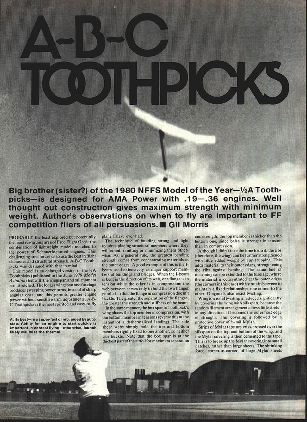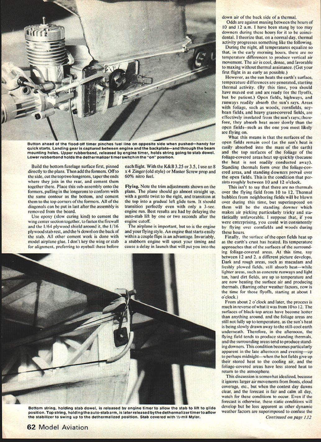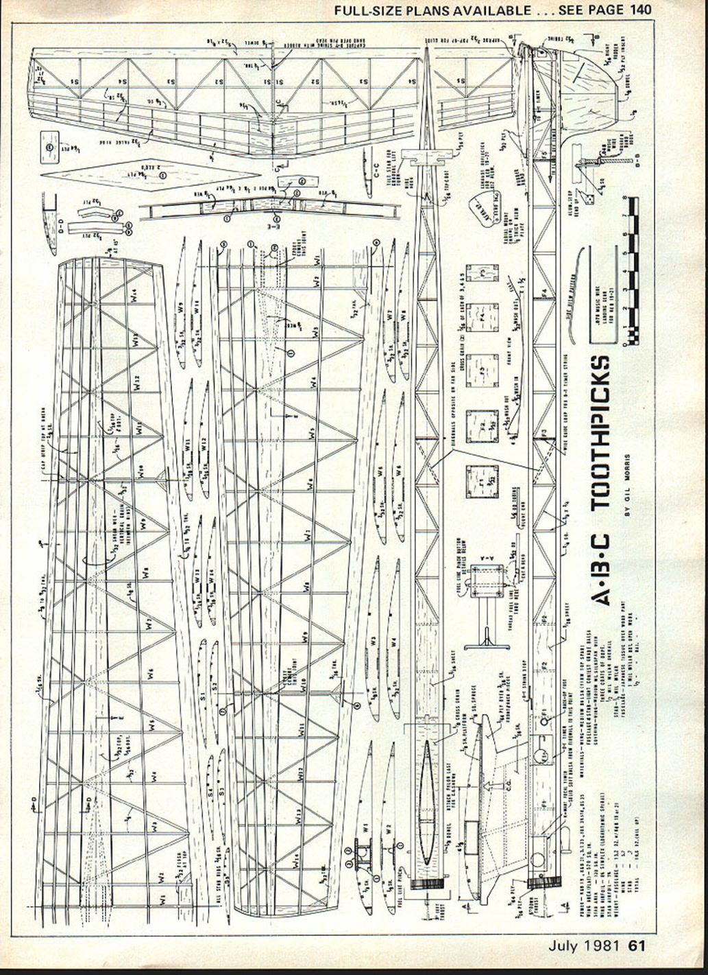 Model tne 19 Tooth would have much leverage cause warps small patches created same reason important cement Mylar applied fuselage stabilizer structural members comes contact formers diagonals ribs sparsrather just around edges torsional forces fuselage stab great enough warrant use silkspan its increased weight hazards building light possibility going too far building too weak lighter plane faster will climb under power Since lift drag proportional square velocity stress directly proportional lift drag stresses will increase square velocity Simply lighter plane stronger needs rewards successfully building light substantial example 20-ox plane accelerates upwards 50% faster same plane weighing 26 oz based 60-ox thrust mention slower rate glide descent recognize critical flight stresses wing vulnerable because planes lift drag forces acting Flexural torsional flutter singly com bination fixed divergence can occur flexural motion change dihedral resisted wing spars whereas torsional motion twisting action resisted geodetic ribs covering material trailing half airfoil inherently weaker leading half because thinner Therefore neutral bending axis generally parallel chord line downwardly inclined front somewhat wing flexes toward dihedral tends toward washout bends neutral axis will cause diving tendancy high speed wing flexes some degree stabilizer also flexes like amount effects neutralizes other constant angular difference maintained Therefore wing stab should have approximately match ing stresses Since forces stabilizer relatively low stab lift drag per square inch area less half wing stab construc tion should made very light compared wing light stab helps other ways too permits short nose moment engine pulled up under leading edge wing good stability under power Also light stab tail end general reduces planes moment inertia improve glide through responsive maintenance constant angle attack choppy air Construction wing built two halves top piece box spar turbulator spars left off inboard panels Also leave out five center ribs Note two halves joined two diamond-shaped 1/64 plywood pieces top other bottom Epoxy two halves together proper angle lower 1/64 plywood piece place After has set add five center ribs -in center webs upper 1/64 plywood piece Finally add top pieces box spar side webs complete box Cover wing medium-weight silkspan three coats dope best build washin washout like doesnt get done confess rig wing bent paper clips string tied workshop ceiling twist wing weights doping silkspan After dope has cured criss-cross top bottom wing -in Mylar tape following pattem geodetic ribs Now cover wing -mil Mylar Stick wing outline criss-crossed tape use Quik Stik brand contact cement made Coverite purpose sure overlap Mylar onto itself -in seams Put about dozen pin pricks top bottom wing relieve hot air shrinking Mylar Ive best results doing shrinking job steps using heat-sealing iron90% first day balance over two-week period Set warps go shrink Mylar Periodically thereafter check warps pull back should drift wing will take permanent set ages Spray front one-third top wing stab very very lightly fast-drying enamel give some turbulation roughness Mylar Spray several feet away spray particles partially dry before landing will give somewhat rough finish light slow-gliding plane top boundary layer may need energized bitas provided paint texture 60 Model Aviation Author peaks out engine prior launch Note tweaking being done climbing atti tude maximum rigidity wing covered silkspan A-mu Mylar TWO A-H-U Tootflplckstfle authorat Iett son jim right ne autnortooKTIrst iass U upen gg Nats first Class Open i980 Nats Article has valuable tips D4ASIEU1 ~ %OFHA CAP OF H IP NT H H EL B SO D-D II 2 SAWH nH /9 \ j C C-c CHABBOL LEFT FULL LINE PIHCEE1 FOAM ______________________________________WINE BLOB L7 I--— 3 LEFTIIi~TAN NSF TOPUHOT 1% BEWOLATTACH PUILA INST BR EL LABIABIABAHOLE OPPOELEL OH FLHElSE IO CHOSE CALEB E,5 SHEET THEL hAL P11CC HOETHACROSS CHAIN 2 4 UL EACH OF 34 AS4E P/FWE ALTALLS BELAW A/HEHPLLTLBBL I/0E0EPHOCEI------IPTfI7r EWEfl---ETF2F3IIF4--I%SEBIECLET HEFIECTER TNI.BIIII STLCH AB THET LIWEpS~jAj~EEC ALBA /L4 PLY BOLl 3/ 5~~iJR1Xr1EE0 LHINTBNCA PEECESTHALOB FOCI LIAL~2WASHFHBATLILH.ALEILL ABBAT2 PU BA FL AL BA L4 PITBA4 PIToELTHAC HEAL WALL EN 3WLSH OOT~H TOICO ELLABLABLO O-T ETNIAC STOPCOT B BLAB1BLLAT LAB EJAUI BBBHN TTINEB B C F FS-FFTF2 ____ df~F3F4Fl IT 0/OL SLEETS4 SB0 0/4WILE LOEBO LOAP TEN BT TEENEN ETNEAL DAMART FOCAl TIHEB-OT TIMELHNCBOP TOLL EChO LOFT BALSA FHCM LIHEANIL TB TLIS PHI NT POACH BOB TBABA EISLEEFBE EENEAOSEE HEAL BACH ELIOT SO EN ETCH AREA TEL LB IA HEAL NENFOEI BS SIAPIEB ILBEARITAMIC SPEALL LENA AENLBIETI REbUT FOSELOCESC EC/ALH IA HI CT HEAL TCH TOTAl L/OIL ELI NOTE NE HISHE NCBE BELA MN LEO TI RH TOP SPAB FOECLALEL STABLILUT COATTET CROAB BOLLO CEBERILLHIHLMLBIOM WI LELALPON WITH TANEE ECOTE LT HOPE F/C OIL AFLAL OHENALL ETANE NIL MYLAR FLSLLOE EAPAHESE TISSUE COLA WHOA PART MEL HYENA ACT OPEN WOBA HAL A13C TOOTHPICKS BY GAL ELNORRES 070 MELEE WIRE LANBIMO BEAN FOB BEN IASF 9F 2345678 / /7/ 4A BIGHT BEEBE PIT ALLOT Bj SB ALL RB 1 C m z C, w m C, m m m 0 0 Build bottom fuselage surface first pinned directly plans add formers Off side cut top two longerons taper ends join rear cement together Place sub-assembly onto formers pulling longerons conform same contour bottom cement top corners formers diagonals can put last after assembly removed board Use epoxy slow curing kind cement wing center section together fasten firewall 1/64 plywood shield around 1/16 plywood stab rest l back stab other cement work done model airplane glue dont key wing stab alignment preferring eyeball before flight K&B 325 35 use 8 x 4 Zinger old style Master Screw prop 60% nitro fueL Flying Note trim adjustments shown plans plane should go almost straight up gentle twist right transition top gradual left glide turn should transition perfectly 3-sec engine run Best results delaying auto-sta