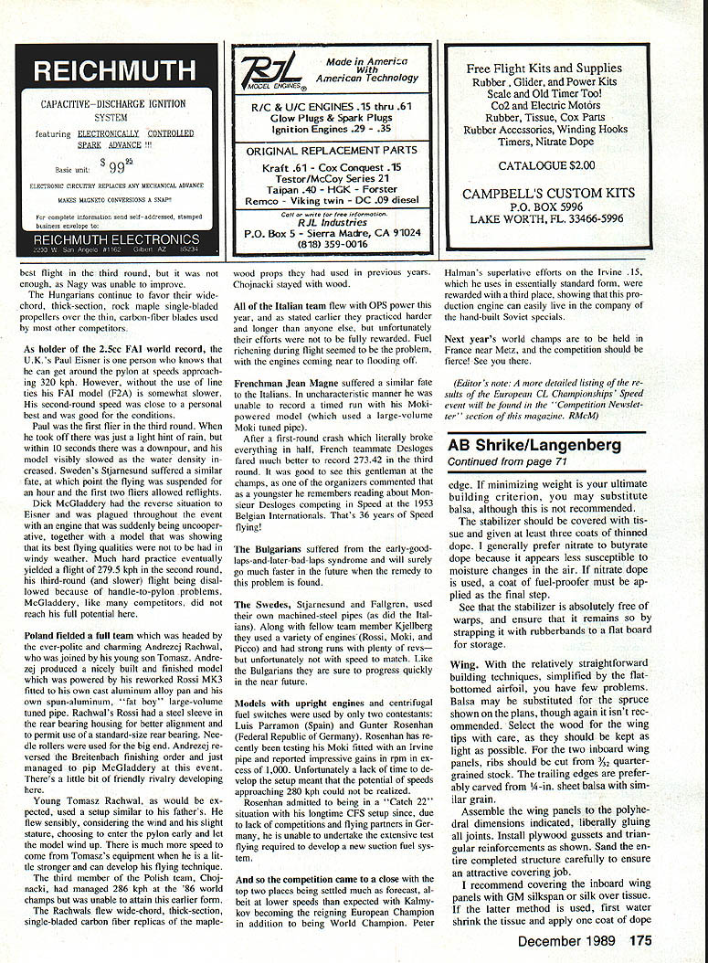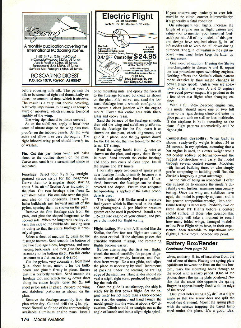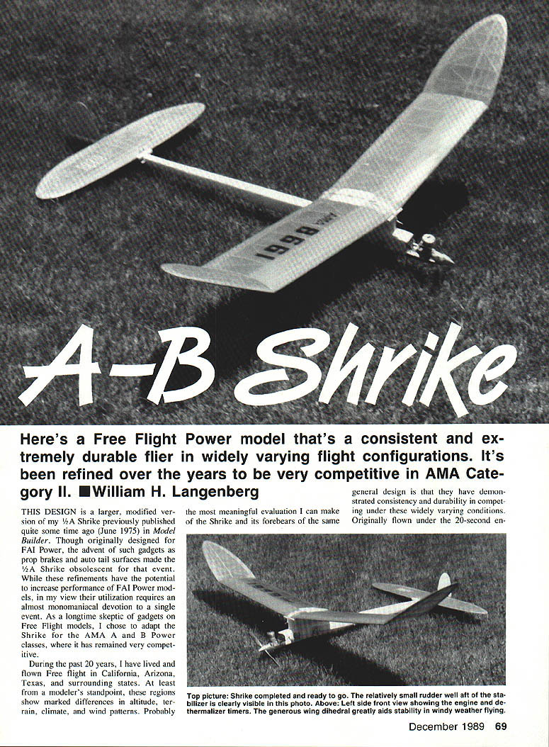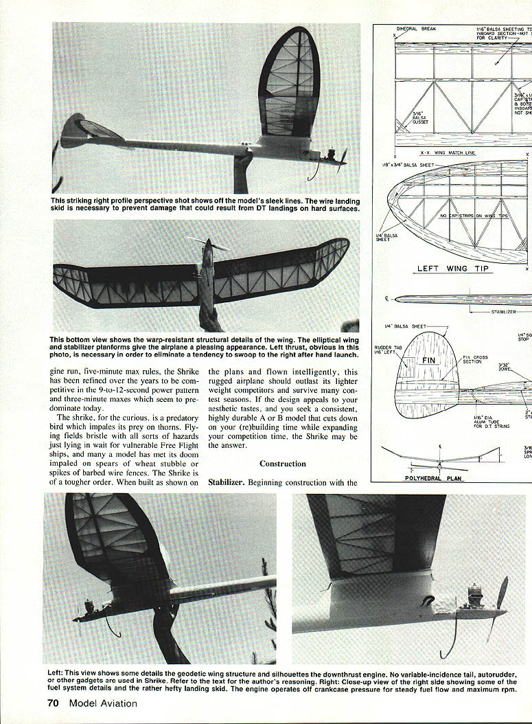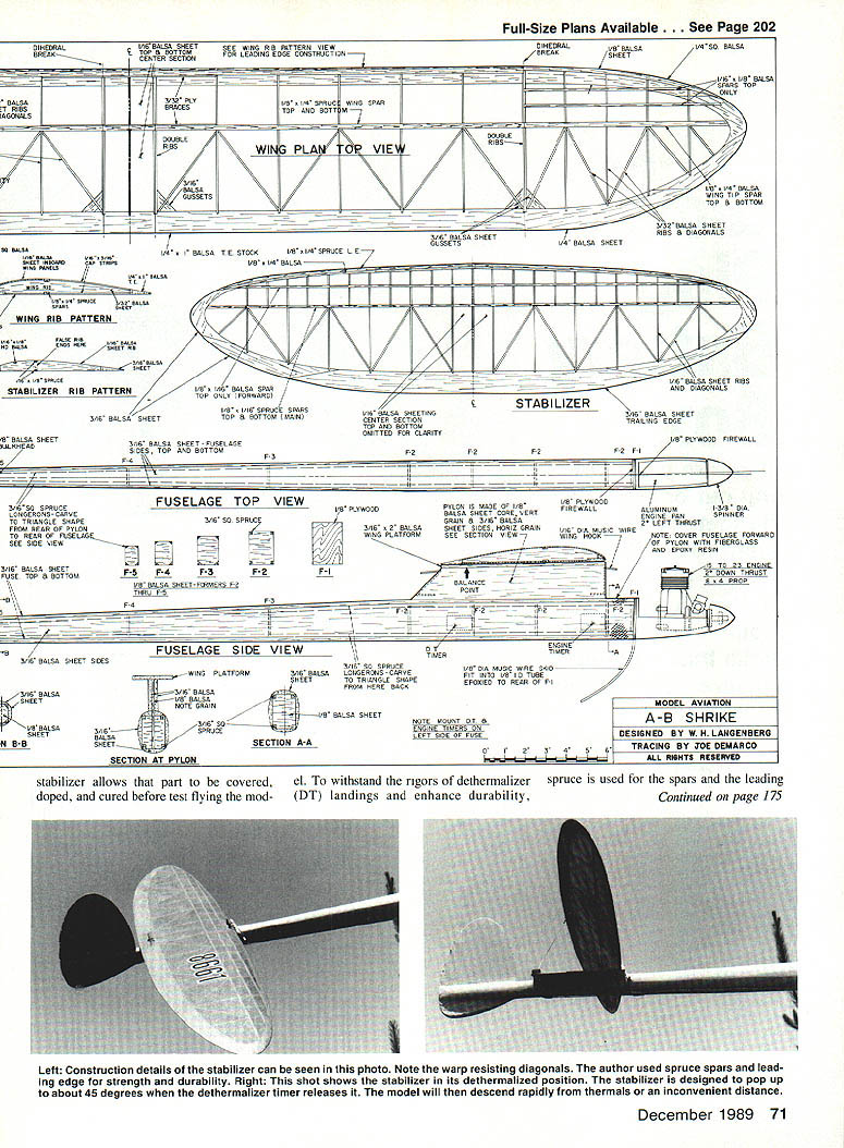 p Heres Free Flight Power model thats consistent ex tremely durable flier widely varying flight configurations Its refined over years very competitive AMA Cate gory II EWilliam H Langenberg THIS DESIGN larger modified ver sion Shrike previously published quite some time ago June 1975 Model Builder Though originally designed FAI Power advent such gadgets prop brakes auto tail surfaces made /2A Shrike obsolescent event refinements have potential increase performance FAI Power mod els view utilization requires almost monomaniacal devotion single event As longtime skeptic gadgets Free Flight models chose adapt Shrike AMA B Power classes has remained very compet itive During past 20 years have lived flown Free flight California Arizona Texas surrounding states least modelers standpoint regions show marked differences altitude ter rain climate wind patterns Probably meaningful evaluation can make Shrike its forebears same general design have demon strated consistency durability compet ing under widely varying conditions Originally flown under 20-second enDecember 1989 69 Top picture Shrike completed ready go relatively small rudder well aft sta bilizer clearly visible photo Above Left side front view showing engine de thermalizer timers generous wing dihedral greatly aids stability windy weather flying gine run five-minute max rules Shrike has refined over years com petitive 9-to-12-second power pattern three-minute maxes seem pre dominate today shrike curious predatory bird impales its prey thorns Fly ing fields bristle sorts hazards just lying wait vulnerable Free Flight ships model has met its doom impaled spears wheat stubble spikes barbed wire fences Shrike tougher order built shown plans flown intelligently rugged airplane should outlast its lighter weight competitors survive con test seasons design appeals aesthetic tastes seek consistent highly durable B model cuts down rebuilding time expanding competition time Shrike may answer Construction Stabilizer Beginning construction GIHEGRAL BREAK S S 1/16 BALSA SHEETING INBOARD SECTION NO FOR CLARITY7 ___ S/I CAP B 60 IN B GA 3/16NOT BALSA GUSSET S-S WINS MATCH LINE I/BS/4 BALSA I NO SF TRIPS SN WIS 1/4 BALSA SHEET LEFT WING TIP STABILIZER 1/4 BALSA SHEET 1/4 STOI RUGUER TA 1/16 LEFT FINFIN CR555 I_____ jSECTION 3/35 IGOWE I I/IA GIG ALUM TUBE FOR GT STRING K en VUCflCAI PLAN Left view shows some details geodetic wing structure silhouettes downthrust engine No variable-incidence tail autorudder other gadgets used Shrike Refer text authors reasoning Right Close-up view right side showing some fuel system details rather hefty landing skid engine operates off crankcase pressure steady fuel flow maximum rpm 70 Model Aviation striking right profile perspective shot shows off models sleek lines wire landing skid necessary prevent damage could result DT landings hard surfaces bottom view shows warp-resistant structural details wing elliptical wing stabilizer planforms give airplane pleasing appearance Left thrust obvious photo necessary order eliminate tendency swoop right after hand launch Full-Size Plans Available Page 202 1/ I/IA BALSAASS/IA RACKS SAHARACAP SABIPS RAINS PANELSI LBA SASACESA BALSA SPARSsNeER WING RIB PATTERN I/lA BALSA SHEET SEE WINS RIB BATTERN VIEW TOP B BDTTOM CENTER SECTION FOR LEADINS EDSE CONSTRSCTION1 II / 5/35 PLY BRACED DOUBLE/ / /16 #/BBLSA GUSSETS WIN I/B S I/H SPRU4 WINS SPDS TOP AND BSTTM-7 PLA VlE I/4I BALSA T K STOCKI/H 51/4 SPRUCE L K7 yR I/H BALSA 7 liii / HA BALSAESAS flEWPIE BALSA CIA IB SPRUCE STABILIZER PATTERNI/H 1/1K BALSA SPAR I/B 5 1/1K SPRUCE SPARS 3/IA BALSA ShEETTOP H BOTTOM MAIN 3/1K BALSA SHEET FUSELAGE SIDES TSP AND BOTTOM F-A F-S DOUBLE RIBS S/lK BALSA SHEET GUSSETS / 1/1K BALSA SHEETING CENTER SECTION TOP AND BOTTOM OMITTED FOR CLARITY F-SF-SF-S IIIII DIHEDRAL BALSAI/4SS BALSA BREAK/SHEET 2i75T11/1K B I/H BALSA ONLY _______SPARS TOP -I/HAl/B BALSA WINS TIP SPAR TOP B BOTTOM RIBS B DIAGONALS 1/4 BALSA SHEET STABILIZER 3/lB BALSA SHEET TRAILING EDGE 1/B PLYWOOD FIREWALL F-S F-I AII/ 42A4II [v32][b-1-10-1-10]] TOPVIEWI/H PLYWOOD/ S/IAGG SPRUCEFUSELAGEUB PLYWOODPYLON ID MADE OF FIREWALLALUMINUMIS/B DIA LONGERONG-CARUE/BALSA GREET CORE VESTENGINE FANDPINNER TO TRIANGLE SHAPE3/lA SD SPRUCEGRAIN B 3/IA BALSA5 LEFT THRUST FROM REAR OF PYLON/--j3/IA 5 BALSASHEET SIDED HORIZ GRAINI/IA DIA MUSIC WIRE TO REAR OF FUSELAG~///7lWINS PLATFORMGEE SECTIDNVIEWWING HOOKNOTE COVER FUSELAGE FORWARD SIDE VIEWpzvsLiV-//\OF PYLON WITH FIBERGLASS SEEAND EPOSY RESIN S/IA BALSA SHEETIS TO 23 ENGINE FUSE TOP B BOTTOMF-SF-4F3F 2 F-I 5 DOWN THRUST I/BBALSA SHEET-FORMERS FSLBALANCEBAA PROP THRUF-5A'- POINTI ES F-4 U-IJVFII -- -A-4-t --4--53/ TIMER FUSELAGE SIDE VIEW S/IA SO SPRUCE -WINS PLATFORM3/IA BALSALONGERSNS CARVE HEETTO TRIANGLE SHAPE FROM HERE BACK ~3/IA BALUA- 3/IA BALSA SHEET I/B BALSA -- NOTE GRAI BALSA SHEET 3/IA SD I-VBBALSA3/IA-SPRUCE SHEETBALSASECTION A-A N B-BSHEET SECTION AT PYLON ENGI NE TIMERLA I/H DIA MAGIC WIRE SKIS FIT INTO I/H U TUBE EPOSIES TO REAR OF F NOTE MOUNT DT B TIMERS ON LEFT SIDE OF FUSE MODEL AVIAT1ON A-B SHRIKE DESIGNED BY W H LANGENBERG 0 1 2 3 4 5 TRACING BY JOE DEMARCO -_____- ALL RIGHTS RESERVSD stabilizer allows part covered doped cured before test flying model withstand rigors dethermalizer DT landings enhance durability spruce used spars leading Continued page 175 Left Construction details stabilizer can seen photo Note warp resisting diagonals author used spruce spars lead ing edge strength durability Right shot shows stabilizer its dethermalized position stabilizer designed pop up about 45 degrees dethermalizer timer releases model will descend rapidly thermals inconvenient distance December 1989 71 DIHEDRAL BREAK BALSA T RIBS AG ORALS B BALSA SHEET IULKHEAD DY 3/IA BALSA SHEET SIDES tLtCTSS5IC CiRCUITRY REPLACES 555 URCHSSICAL ADVA5CR tar complete information send seltoddressed stamped best flight third round hut enough Nagy unable improve Hungarians continue favor widechord thick-sec