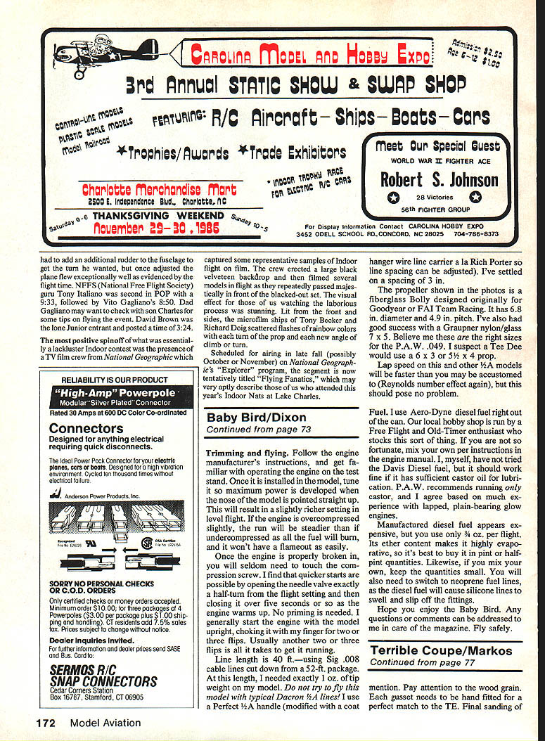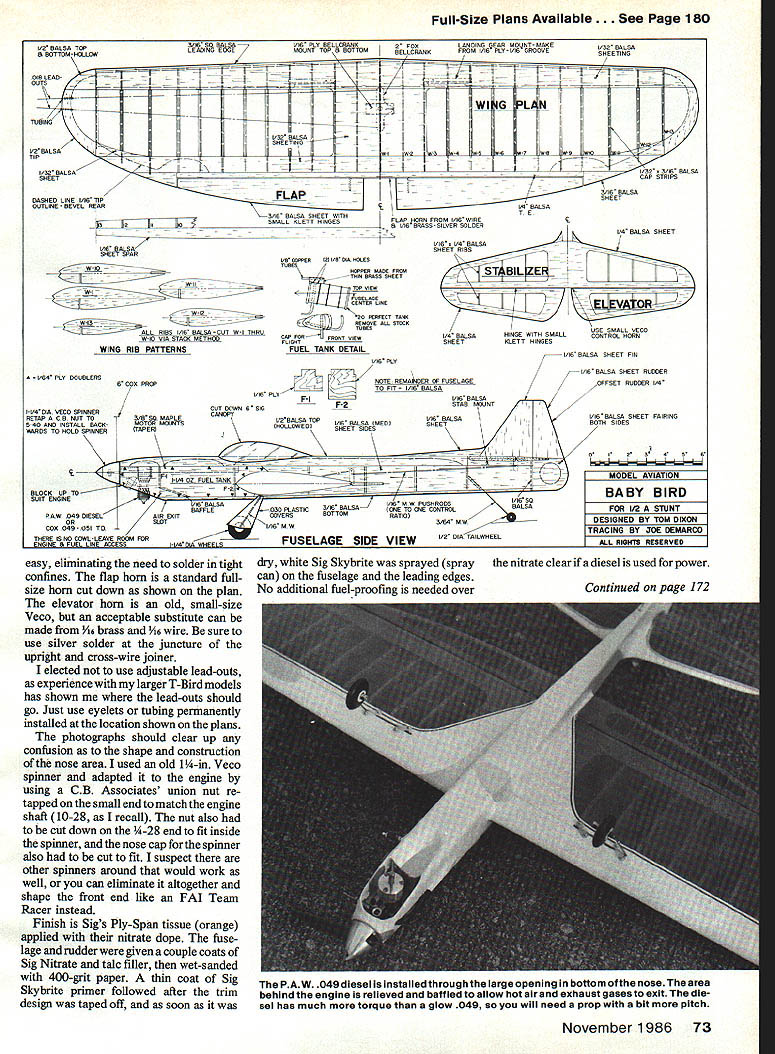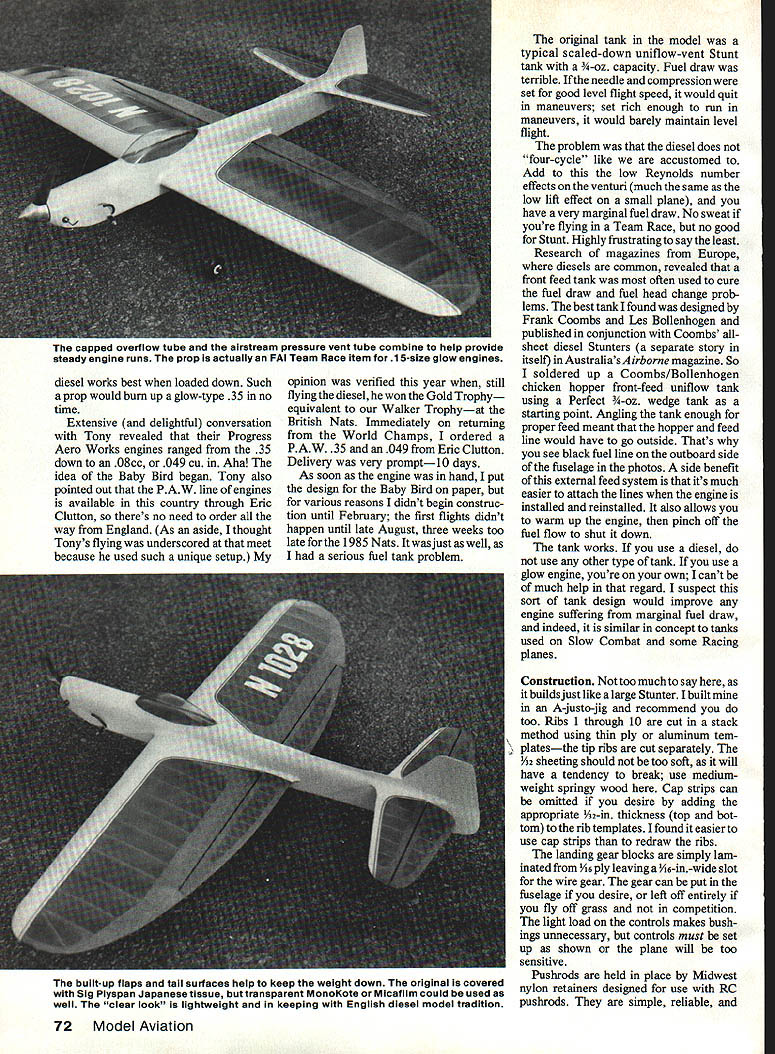As model already has presence 0 ulI-size Stunter addition cockpit detail wheel covers would help en hance aspect outside fuel line front chicken-hopper feed tank giveaway full-blown Stunter WHAT YOU SEE secret weapon Stunt recent Nats Alas work responsibilities care involvement new son meant building schedule went out window Now its finished working well Look out next time Some background order Baby Bird unusual some respects basic design six-tenths scale-down Phoenix published back February 1984 ModelAviation modem bubble canopy used simplify fuselage construction people seem favor style fuselage anyway no separate cowl again simplicity also allow ample airflow carry away ex haust gases want get fancy feel free sculpt cowl also opted go clear doped tissue Sig Ply-Span finish no ap pearance points given certainly much weight saved way Small models weight critical author takes different approach problem using 049 diesel source motivation larger Stunters due Reynolds num ber effect little bit helps unusual part model far power planta diesel Tee Dee 049/051 has standard attempts Stunt since Dick Mathis published Pinto back 1972 dabbled mixture cylinders cranks get Tee Dee work Gremlin published Model Builder 1975 experience told Tee Dee least bladder tank way go seemed no truly acceptable power plant Enter Tony Eifflander British F2B team 1984 Control Line World Championships Tony audacity flying PAW 35 diesels father manufacture engine runs different snarling 60s Schnuerle 45s appeal own extremely quiet What impressed Tonys run ning 11 x 7 prop 35 November 1986 71 oft Stunt flying obtaining proper run engine throughout abrupt maneuvers diesel works best loaded down Such prop would burn up glow-type 35 no time Extensive delightful conversation Tony revealed Progress Aero Works engines ranged 35 down 08cc 049 cu Aha idea Baby Bird began Tony also pointed out PAW line engines available country through Eric Glutton theres no need order way England As aside thought Tonys flying underscored meet because used such unique setup opinion verified year still flying diesel won Gold Trophy equivalent Walker Trophyat British Nats Immediately returning World Champs ordered PAW 35 049 Eric Glutton Delivery very prompt10 days As soon engine hand put design Baby Bird paper various reasons didnt begin construc tion until February first flights didnt happen until late August three weeks too late forthe 1985 Nats Itwasjustaswell serious fuel tank problem original tank model typical scaled-down uniflow-vent Stunt tank -az capacity Fuel draw terrible needle compression set good level flight speed would quit maneuvers set rich enough run maneuvers would barely maintain level flight problem diesel does four-cycle like accustomed Add low Reynolds number effects venturi much same low lift effect small plane have very marginal fuel draw No sweat youre flying Team Race no good Stunt Highly frustratingto say least Research magazines Europe diesels common revealed front feed tank often used cure fuel draw fuel head change prob lems best tank found designed Frank Coombs Les Bollenhogen published conjunction Coombs allsheet diesel Stunters separate story itself Australias Airborne magazine So soldered up Coombs/Bollenhogen chicken hopper front-feed uniflow tank using Perfect -az wedge tank starting point Angling tank enough proper feed meant hopper feed line would have go outside Thats see black fuel line outboard side fuselage photos side benefit external feed system its much easier attach lines engine installed reinstalled also allows warm up engine pinch off fuel flow shut down tank works use diesel use other type tank use glow engine youre own cant much help regard suspect sort tank design would improve engine suffering marginal fuel draw indeed similar ooncept tanks used Slow Combat some Racing planes Construction too much say builds just like large Stunter built A-justo-jig recommend too Ribs 1 through 10 cut stack method using thin ply aluminum tem platesthe tip ribs cut separately %2 sheeting should too soft will have tendency break use mediumweight springy wood Cap strips can omitted desire adding appropriate 1Az-in thickness top bot tom rib templates found easier use cap strips redraw ribs landing gear blocks simply lam inated 1/16 ply leaving /16-in-wide slot wire gear gear can put fuselage desire left off entirely fly off grass competition light load controls makes bush ings unnecessary controls must set up shown plane will too sensitive Pushrods held place Midwest nylon retainers designed use RC pushrods simple reliable 72 Model Aviation capped overflow tube airstream pressure vent tube combine help provide steady engine runs prop actually FAI Team Race item 15-size glow engines built-up flaps tail surfaces help keep weight down original covered Sig Plyspan Japanese tissue transparent MonoKote Micaflim could used well clear look lightweight keeping English diesel model tradition Full-Size Plans Available. See Page 180 3/16 SO BALSA /2 BALSA TOPLEADING EDGE B BOTTOM-HOLLOW SIB LEADOUTS- TUBING I I V32SALSUJ II I SHEETING -If L/2BALSA I\j 1/32 BALSANt1-II SHEET FLAP 3/16 BALSA SHEET WITH SMALL KLETT HINGES DASHED LINE I/IA liP DIJ1LINE BEVEL REAR 1/IA BALSA SIEET SPAR - WiO - WHI RIBS I/A BALSACUT 16-I ThRU W-IO VIA STACK METHOD WING RIB PATTERNS LA4 PLT DOUBLERS CDX PROP I-I/4DIA VECO SPINNERCUT DOWN SIG RETAP CA NUT TO3/B SO MAPLECANOPY 5-40 AND INSTALL BACK- MOTOR MOUNTS WARDS TO HOLO SPINNER TAPER --- --I/IA FLY BELLCRANK2 FOXLANSING GEAR MOyNT- MAKE MOUNT TOP~ BOTTOMBELLORANKFROM I/IA PLY-I/IA GROOVE II-VI I/3D BALSA SHEETING / E1 fl-II_ii_ IWlLGLL~J 4__ - I— I/32o 3/A BALSA CAP STRIPS 3/IA BALSA SHEET OR BALSA T E FLAP JIORN FROM I/IA WIRE B I/IA ABASS-SILVER SOLDER I/IA 1/4 BALSA SHEET RIBS ST BIL E I/B COFFER121 I/B 010 uyES lAPPER MADE FROM ORRB FUE DETA 1/16 PLY J NOTE REMAINDER OP FUSE LADE TO FIT I/IA BALSA I/IA PLYF-IF2 1/OBALSA TOPI/IA BALSA MEW HOLLOWEDSHEET SIDES 1/4 BALSA SHEET USE SMALL VECO